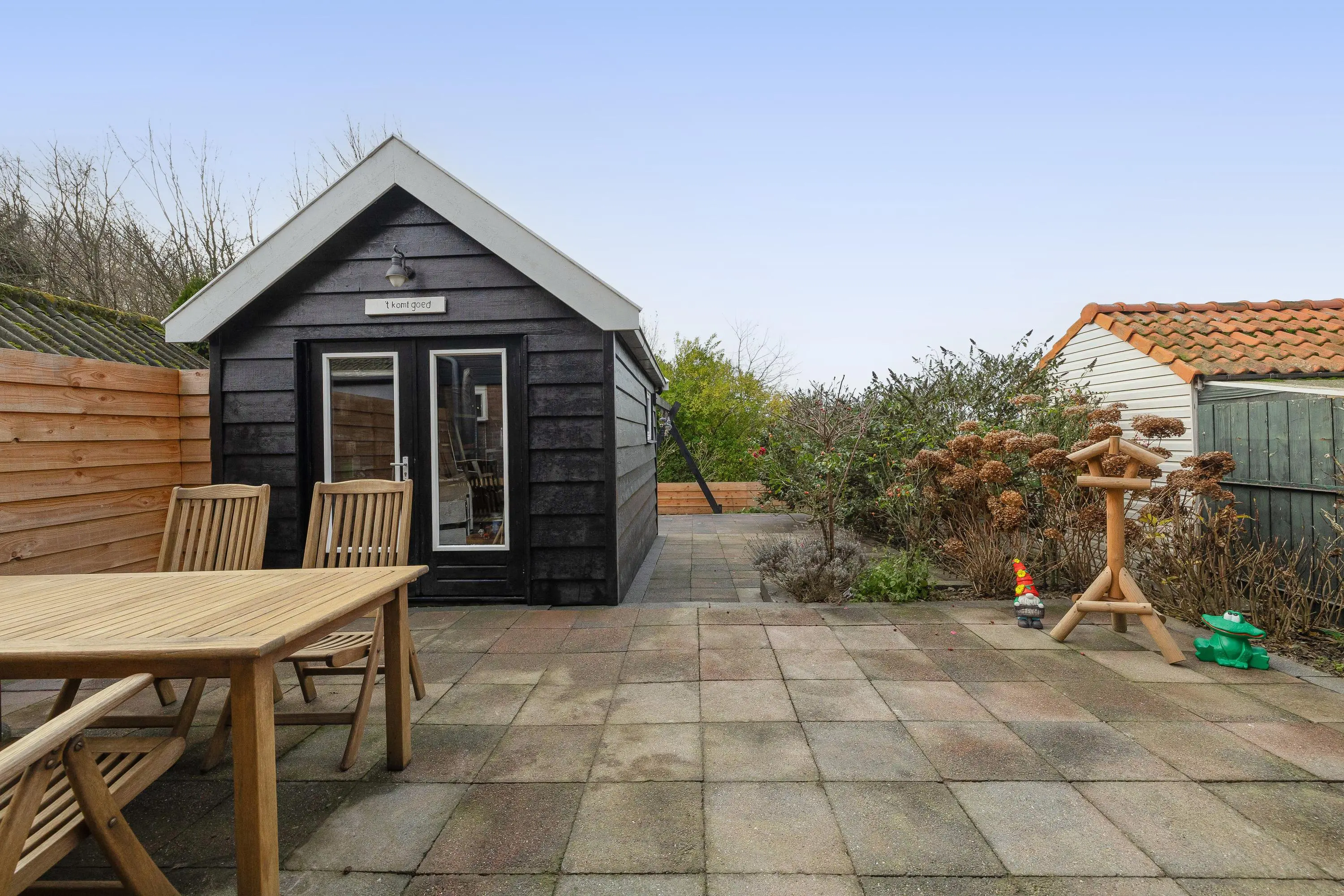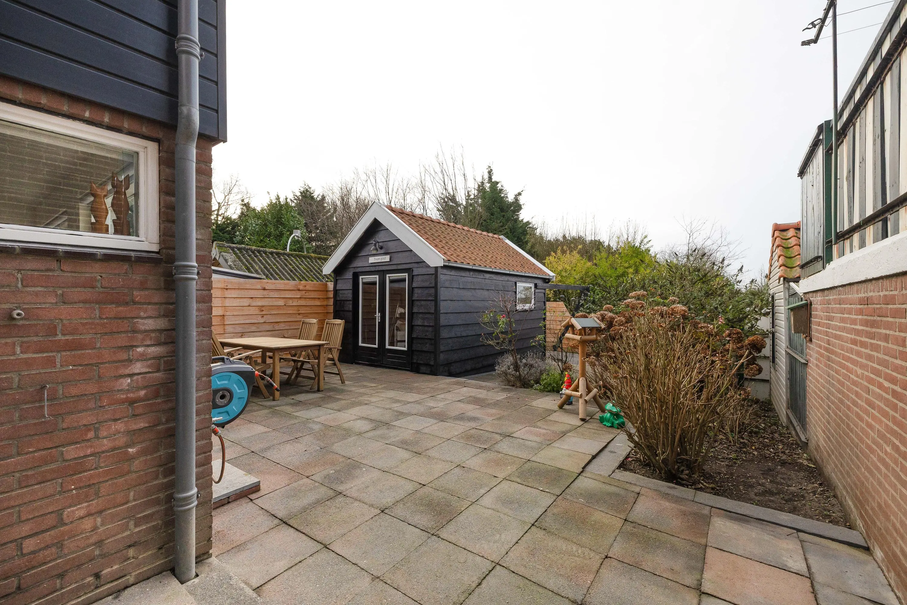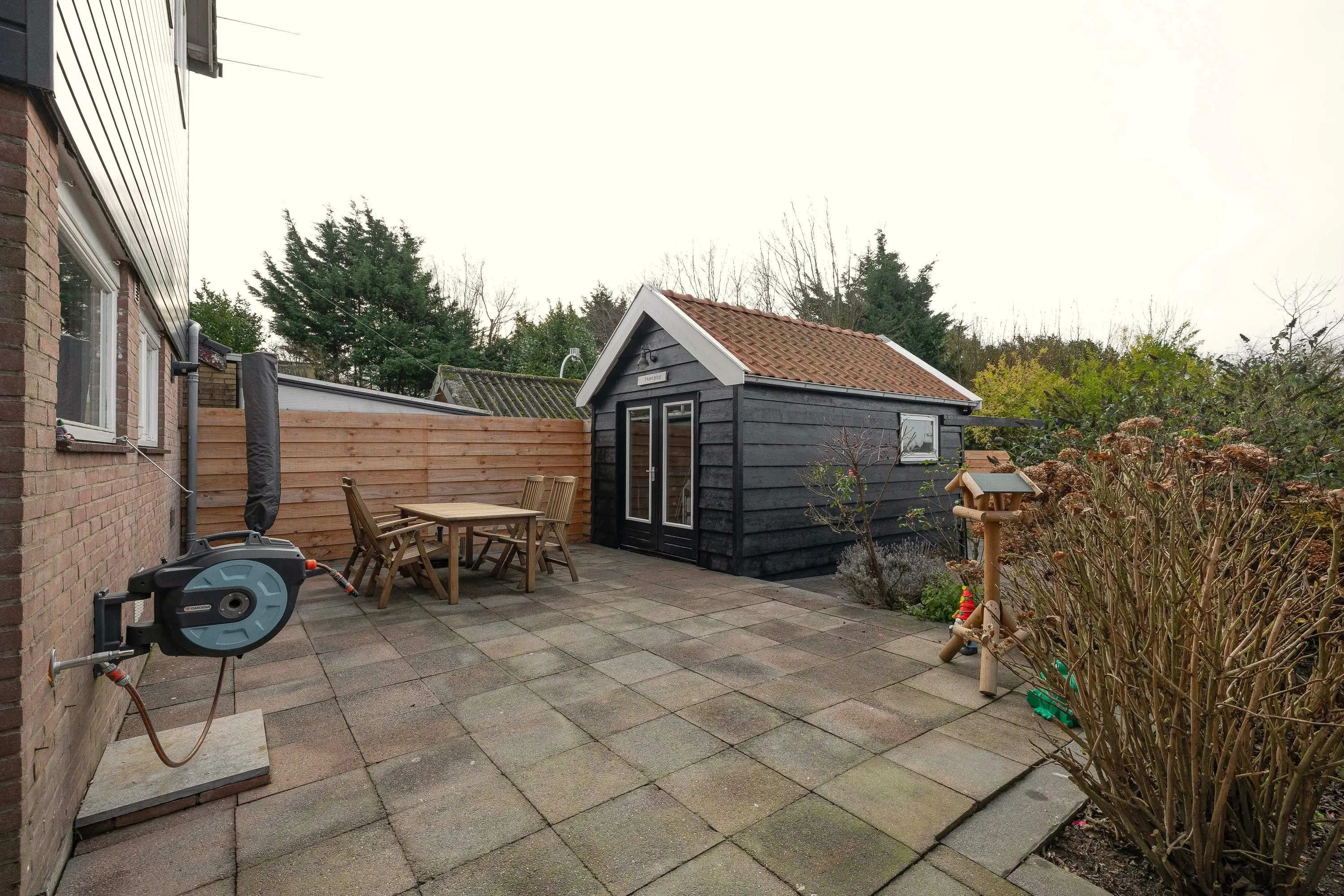 Vanaf dit niveau heeft u toegang tot de houten berging met een oppervlakte van circa 13,5m². Deze berging is voorzien van elektra en biedt volop mogelijkheden, bijvoorbeeld als opbergruimte of hobbyruimte. Bovendien blijft er voldoende ruimte over om de tuin geheel naar eigen wens in te richten.