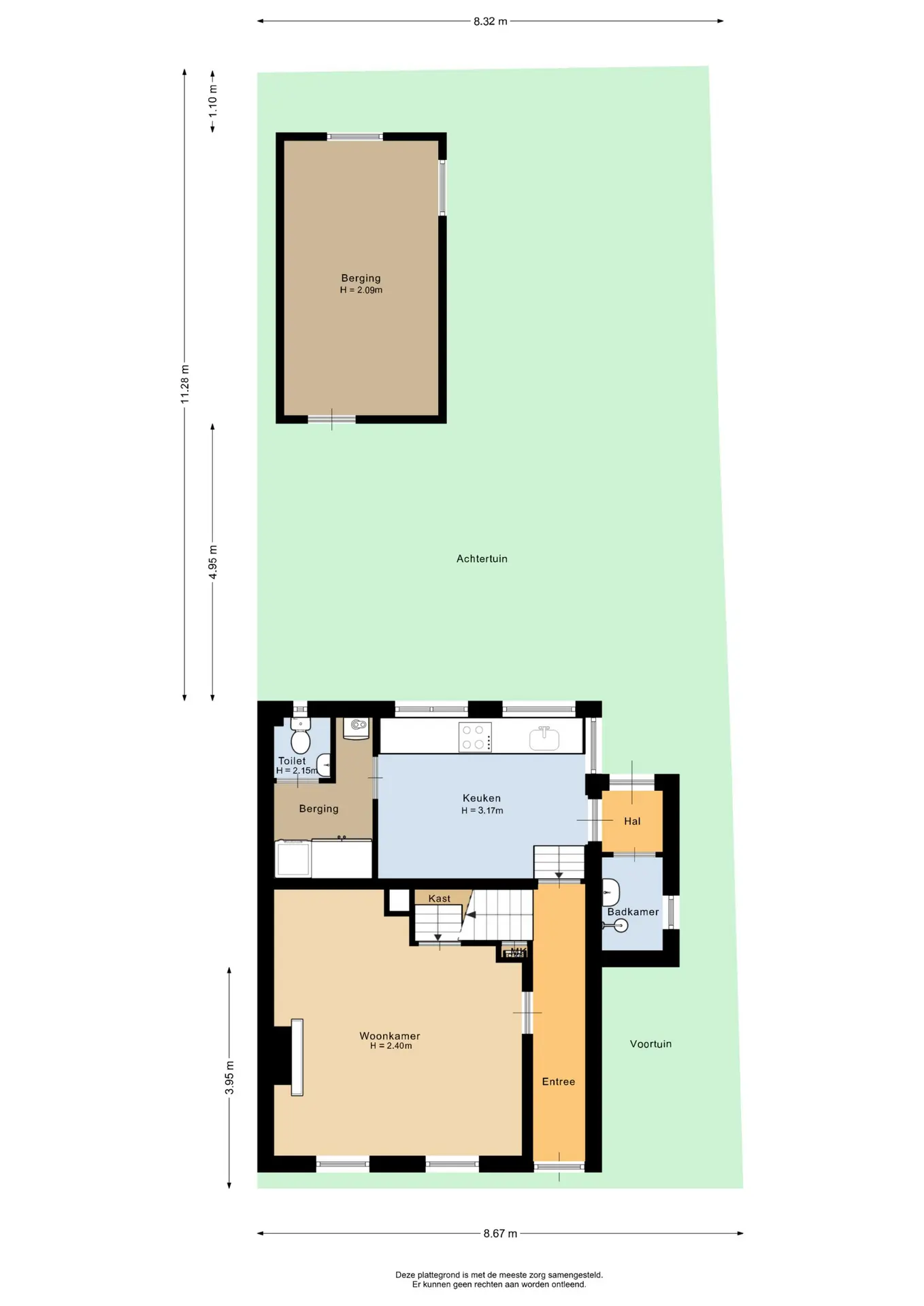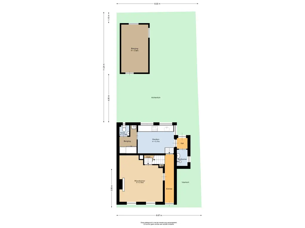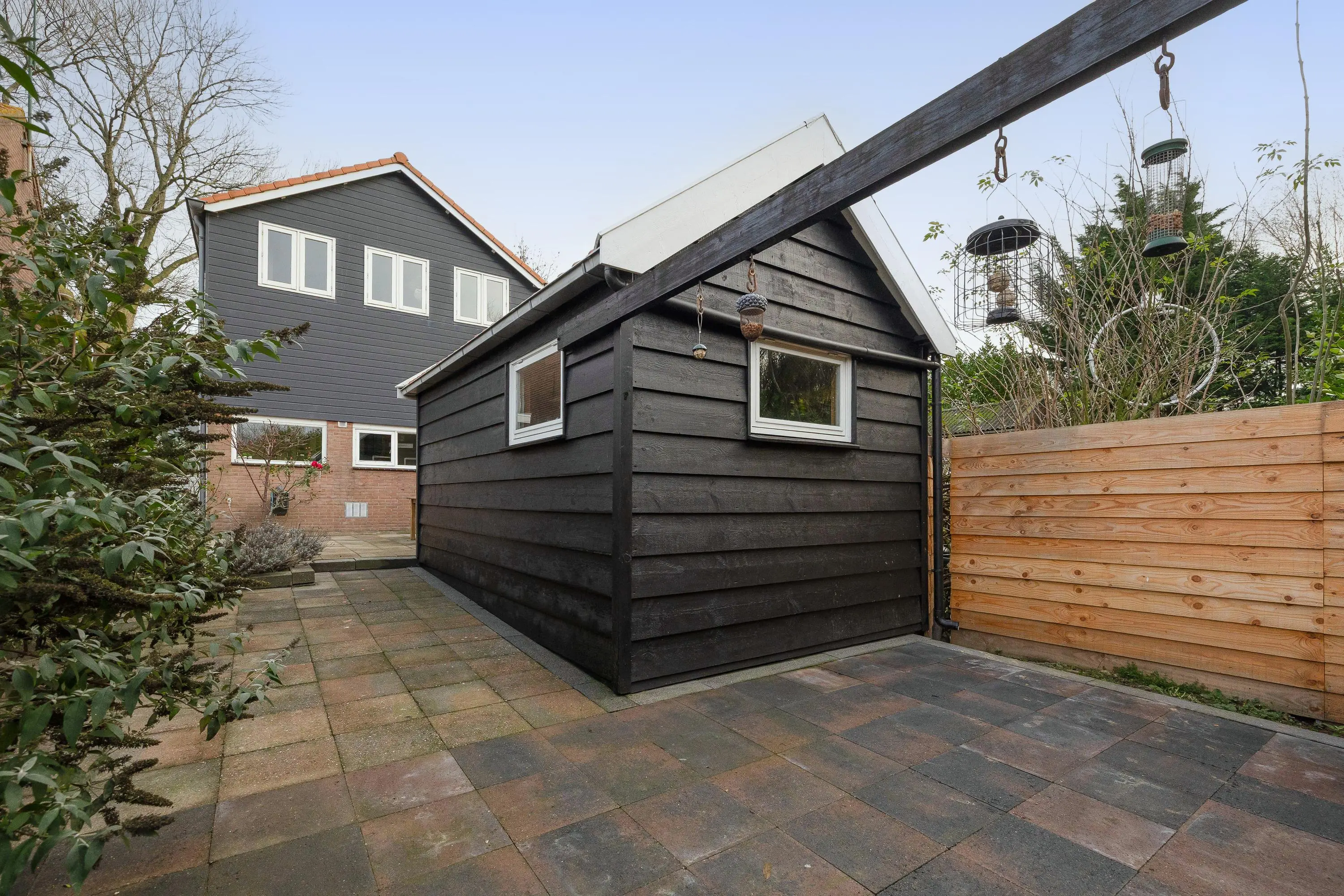 Vanaf dit niveau heeft u toegang tot de houten berging met een oppervlakte van circa 13,5m². Deze berging is voorzien van elektra en biedt volop mogelijkheden, bijvoorbeeld als opbergruimte of hobbyruimte. Bovendien blijft er voldoende ruimte over om de tuin geheel naar eigen wens in te richten.