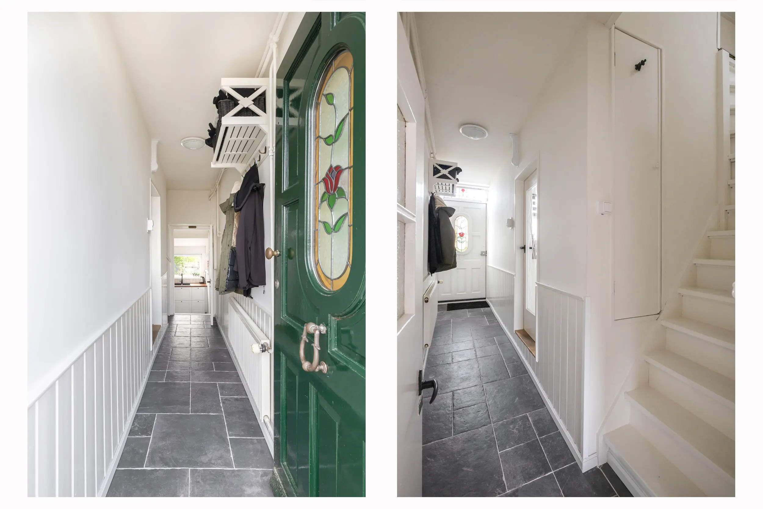 De entree/hal is voorzien van een plavuizenvloer die doorloopt over de gehele begane grond, met uitzondering van de woonkamer. Vanuit de hal heeft u toegang tot de living, de keuken en de trapopgang naar de eerste verdieping.