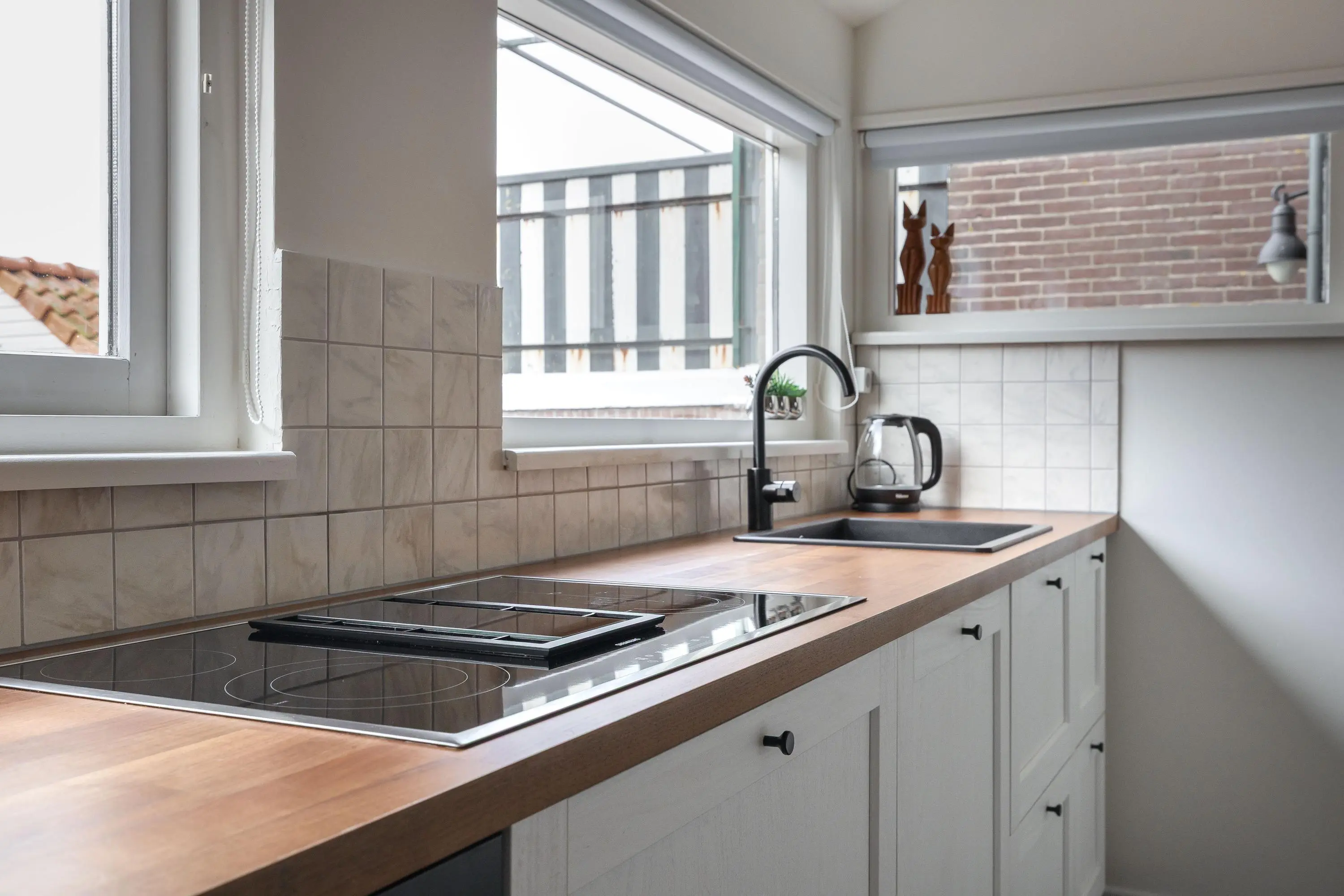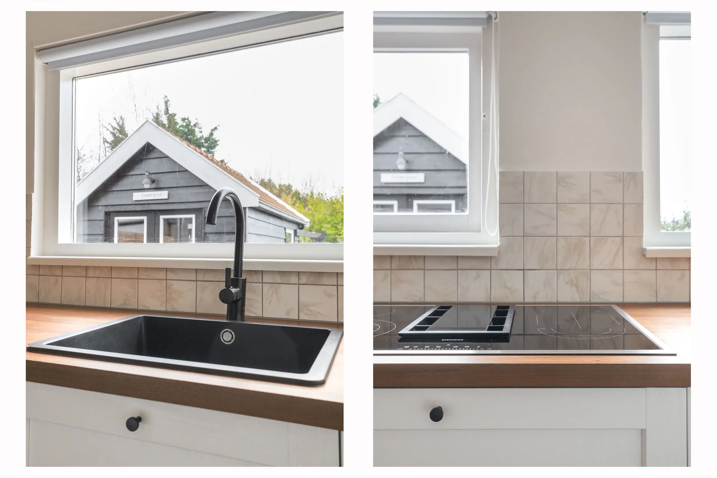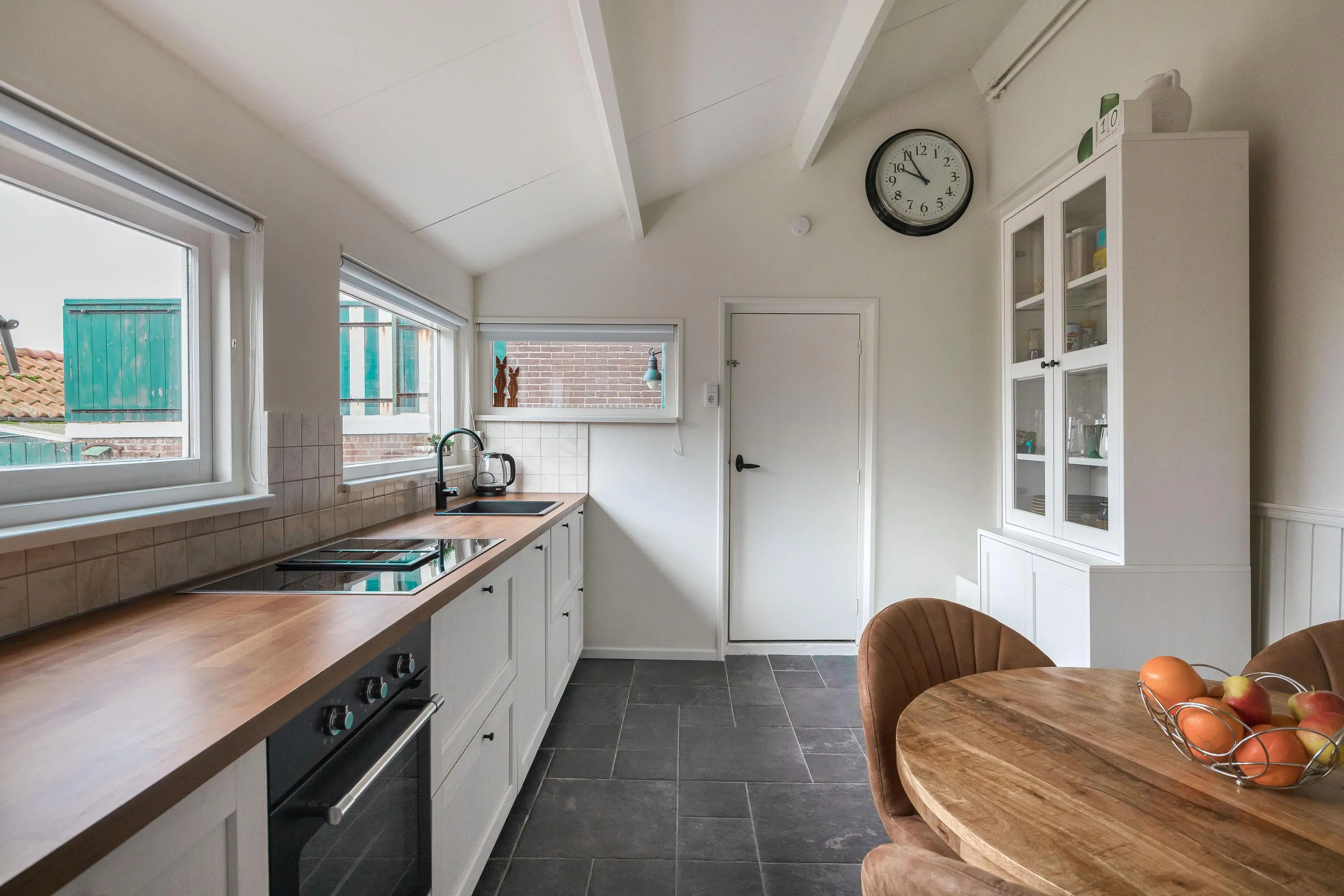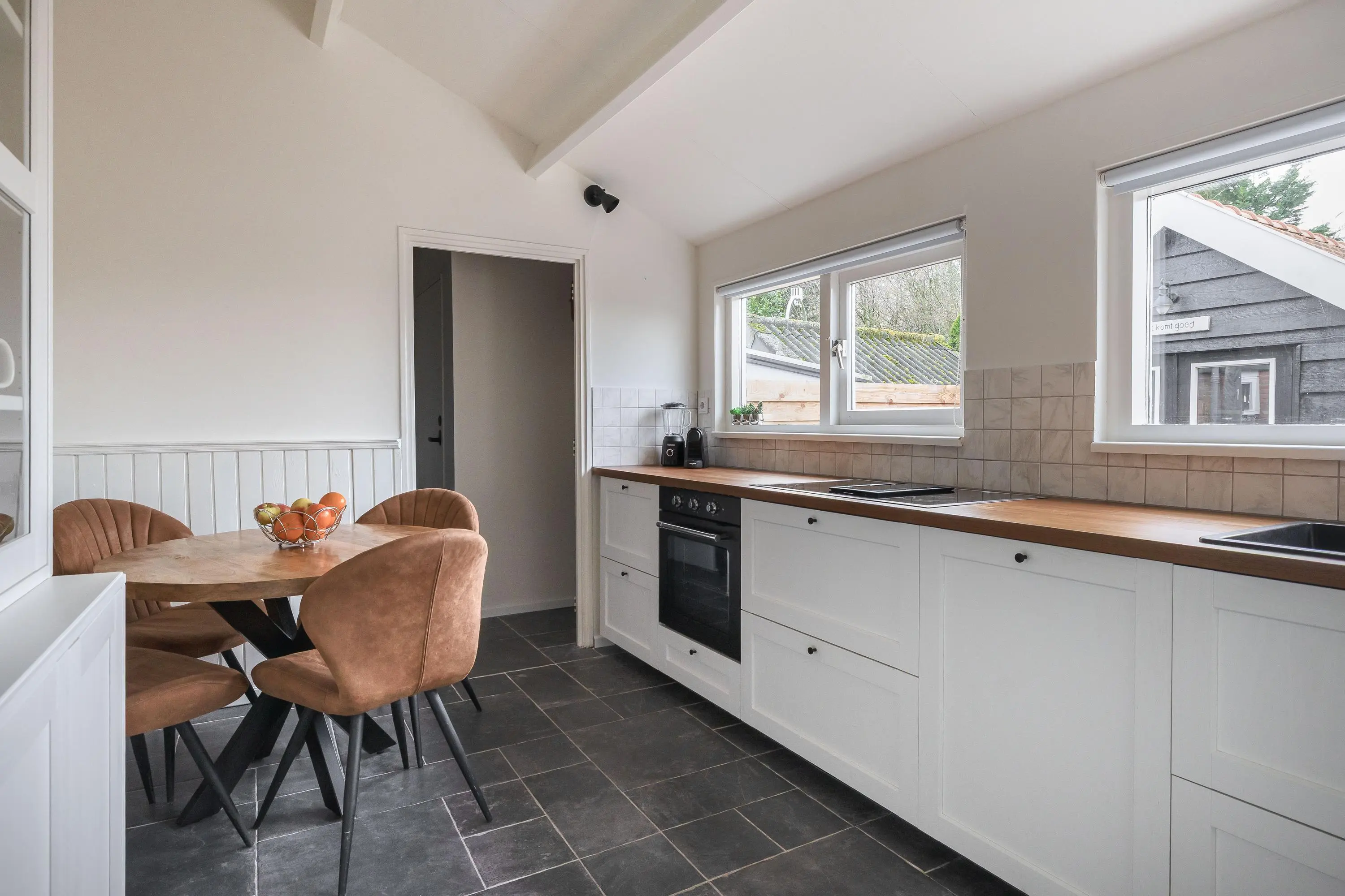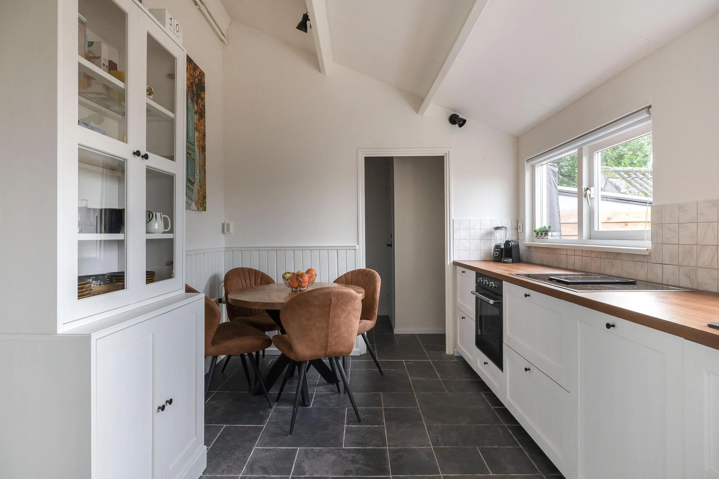 De dichte keuken ligt iets lager dan de hal en is via een traptrede bereikbaar. De keuken is in 2024 geplaatst en voorzien van moderne inbouwapparatuur, waaronder een inductiekookplaat met geïntegreerde afzuiging, een spoelbak, oven en vaatwasmachine. Vanuit de keuken is er toegang tot de berging en een tussenhal met toegang tot de badkamer en de achtertuin