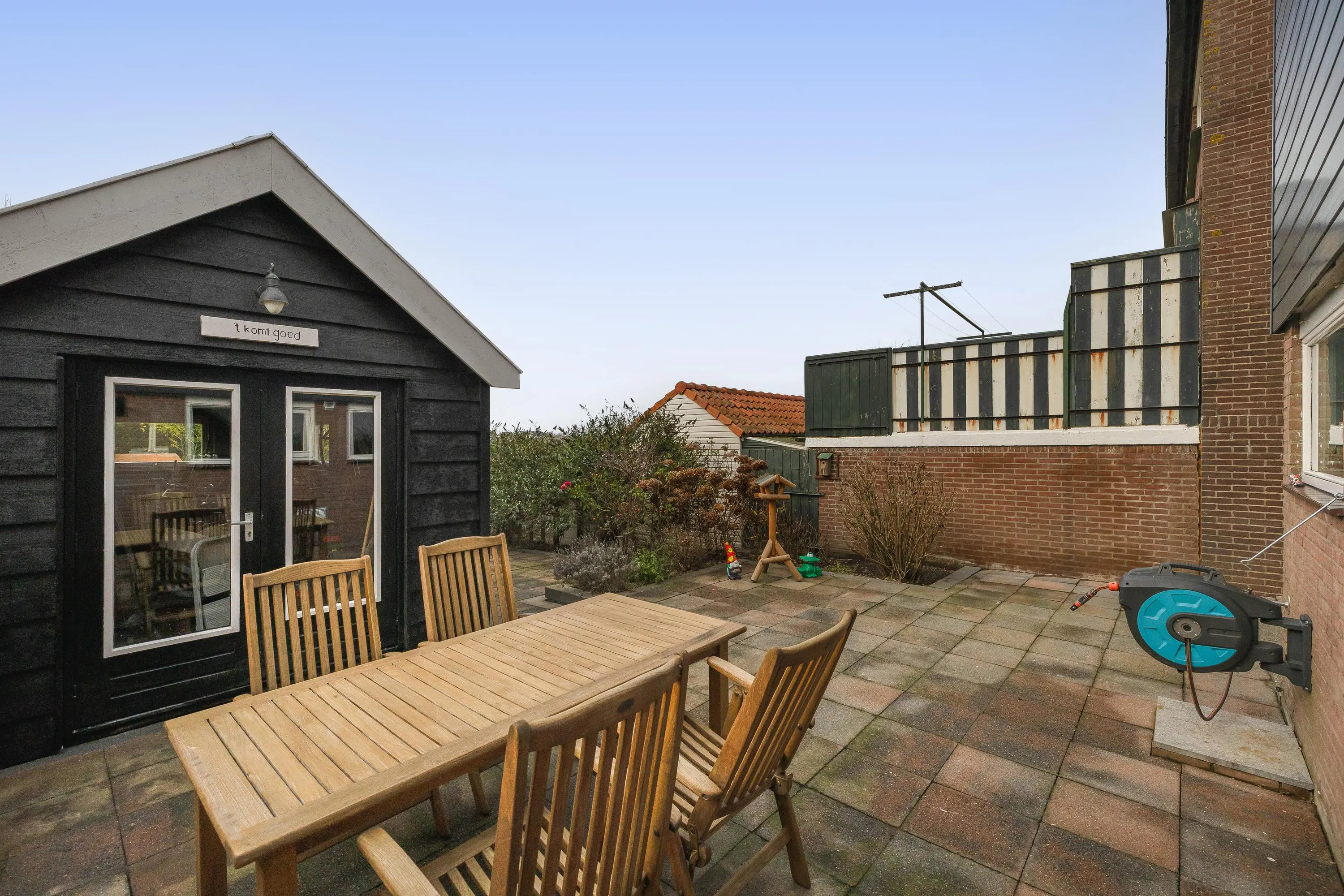 Via de bestrate zijtuin bereikt u de royale achtertuin, gelegen op het zuidwesten en daardoor genietend van veel zon in de middag en avond.