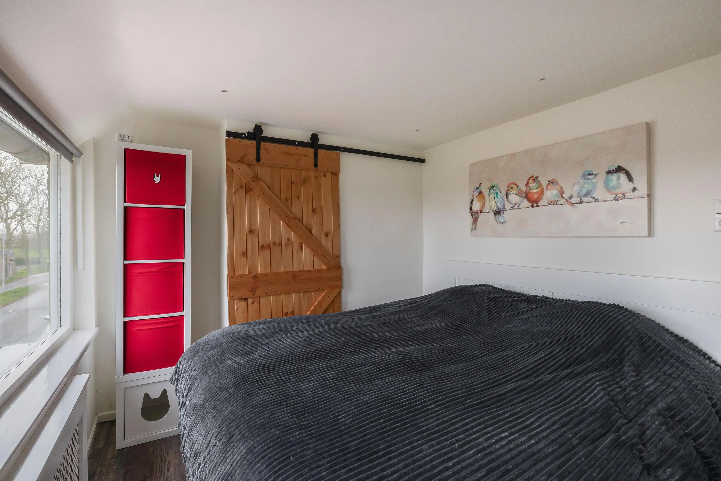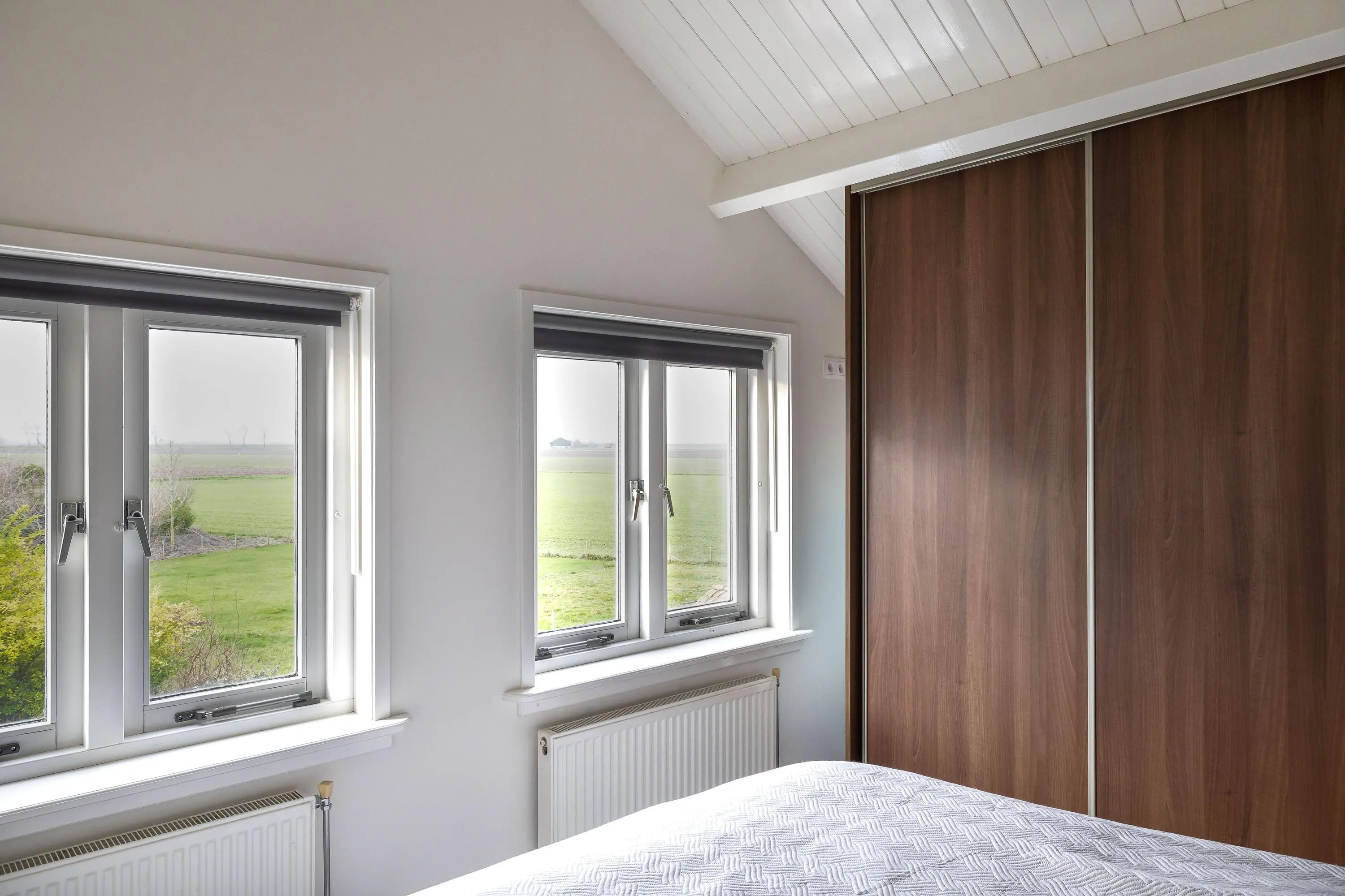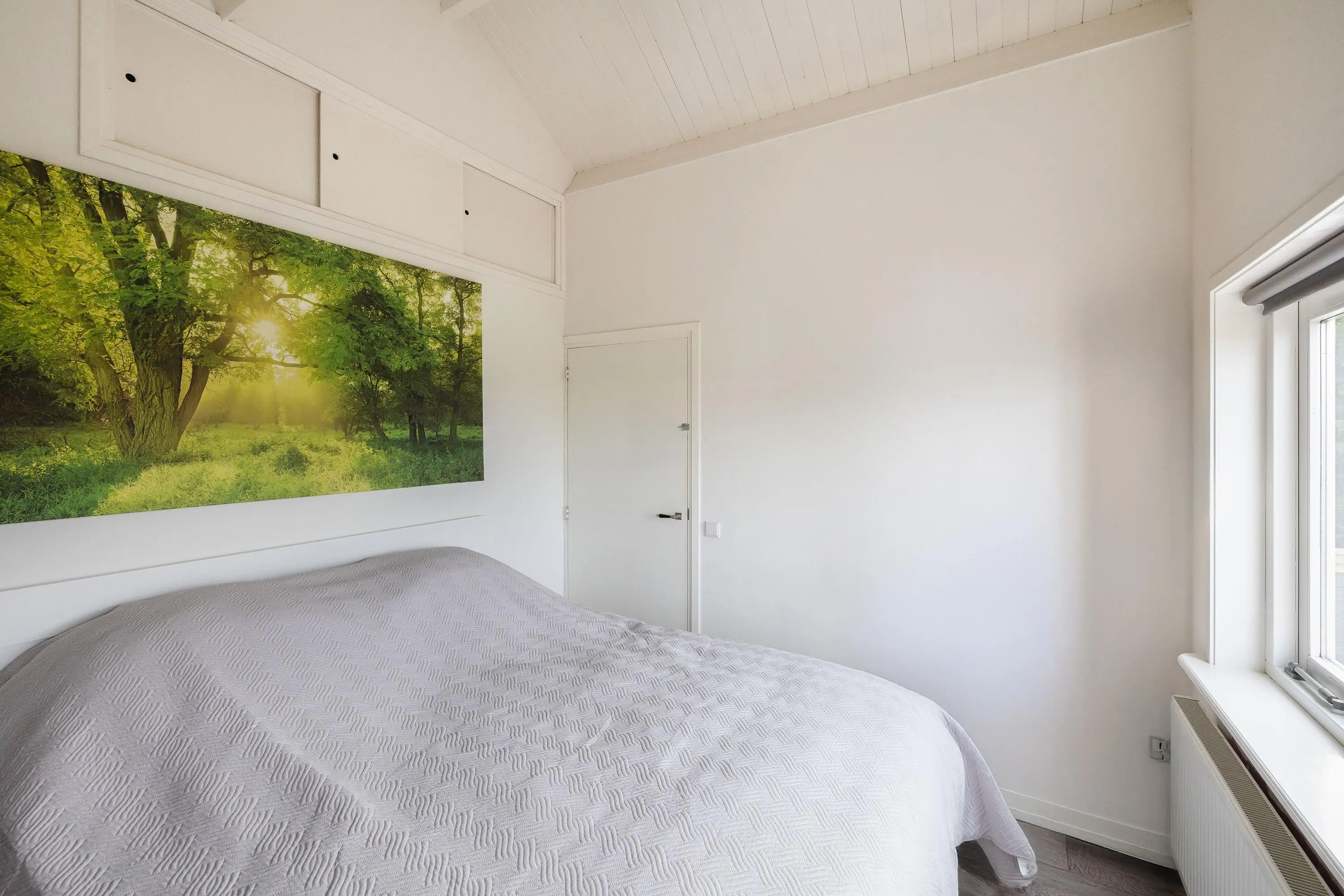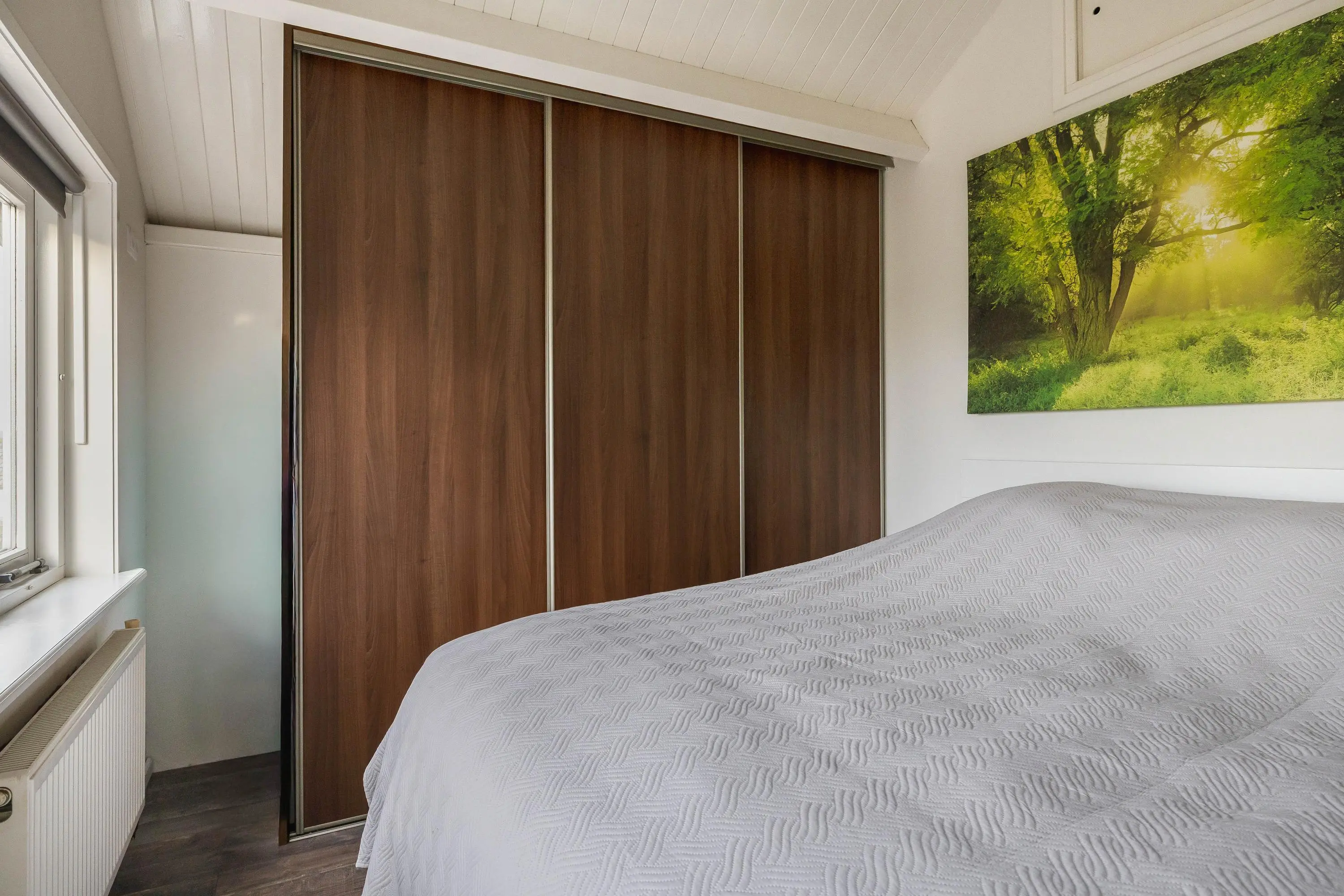 De hoofdslaapkamer is gelegen aan de achterzijde van de woning en heeft een oppervlakte van circa 10,5m². Deze kamer beschikt over een vaste kast met schuifdeuren en praktische bergluikjes in de wand. Vanuit de slaapkamer is er een fraai uitzicht over het groen.