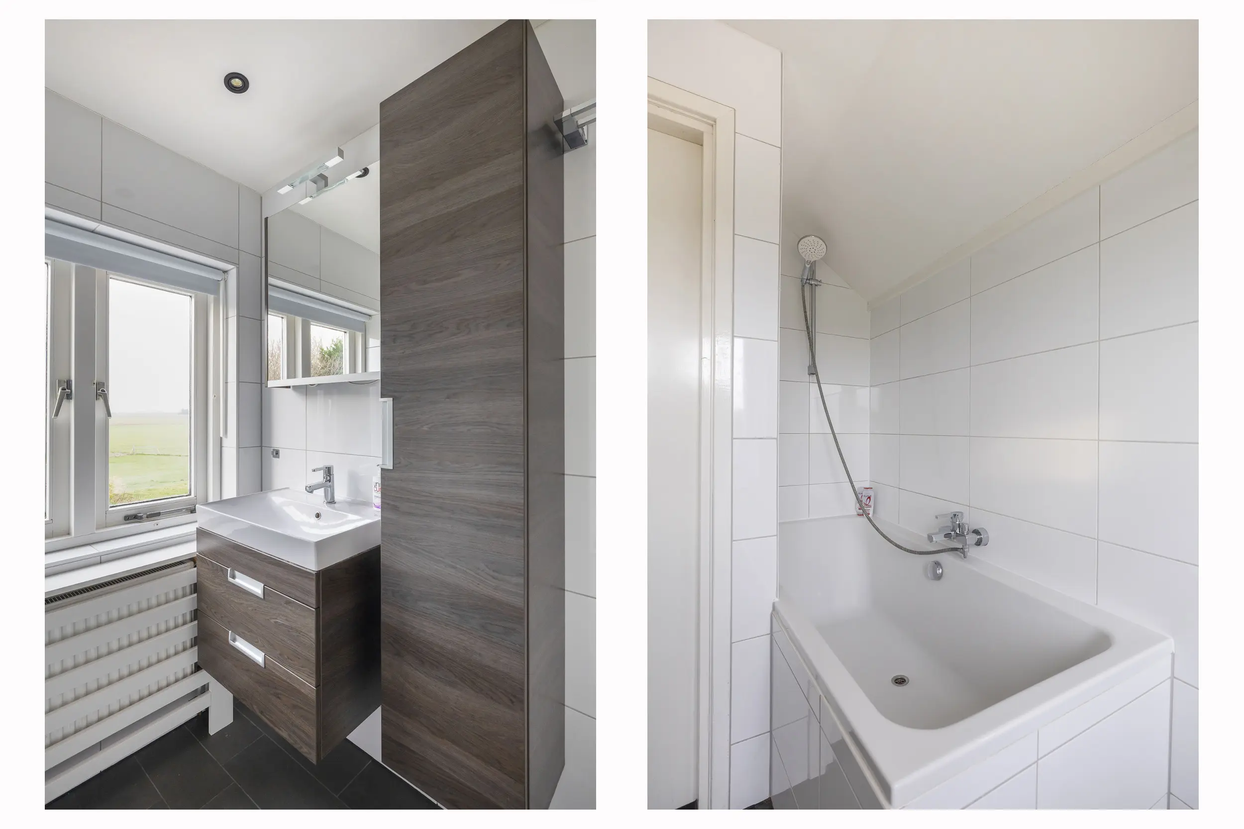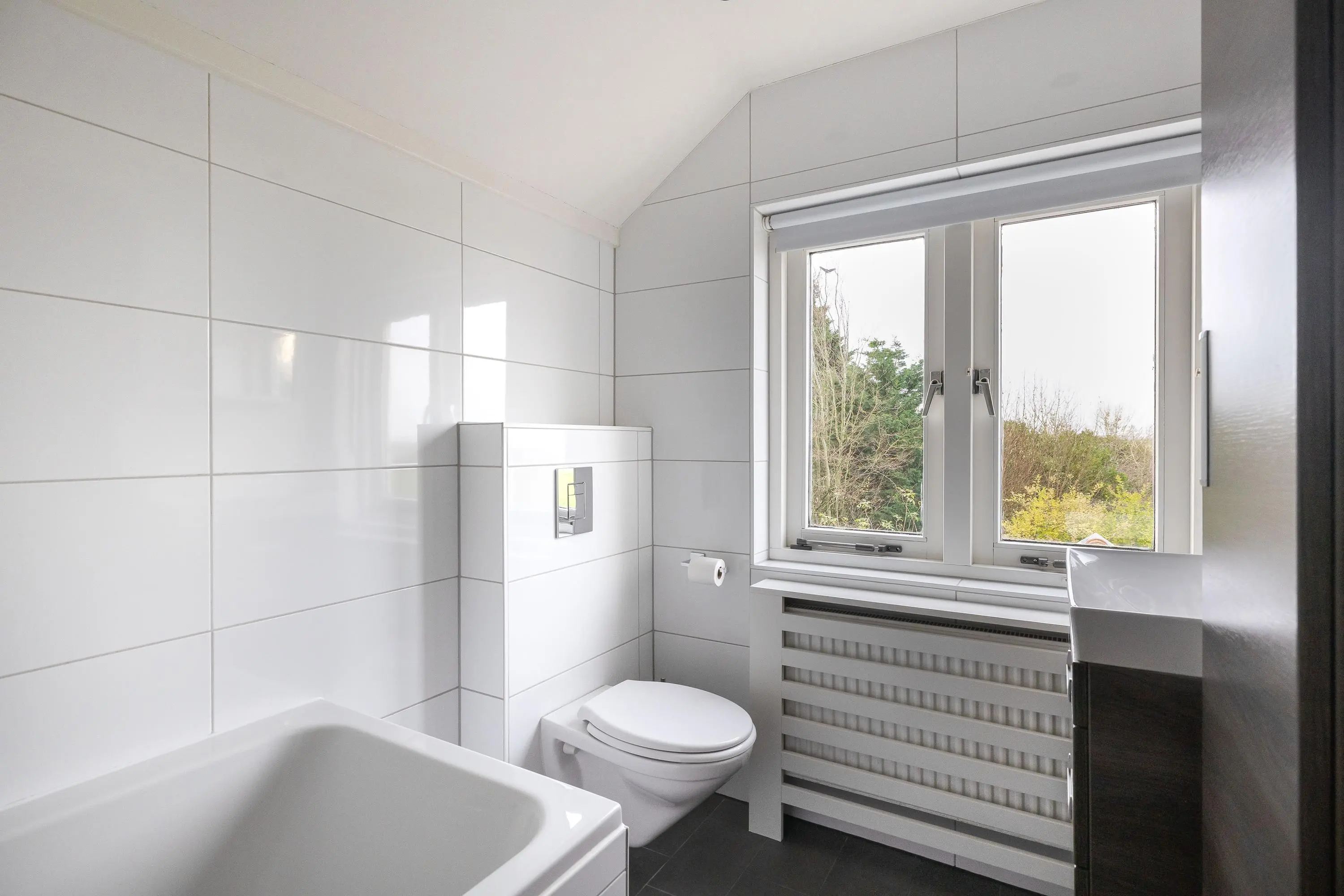 De goed onderhouden badkamer is voorzien van een ligbad, toilet en een wastafelmeubel met bijpassende wandkast.