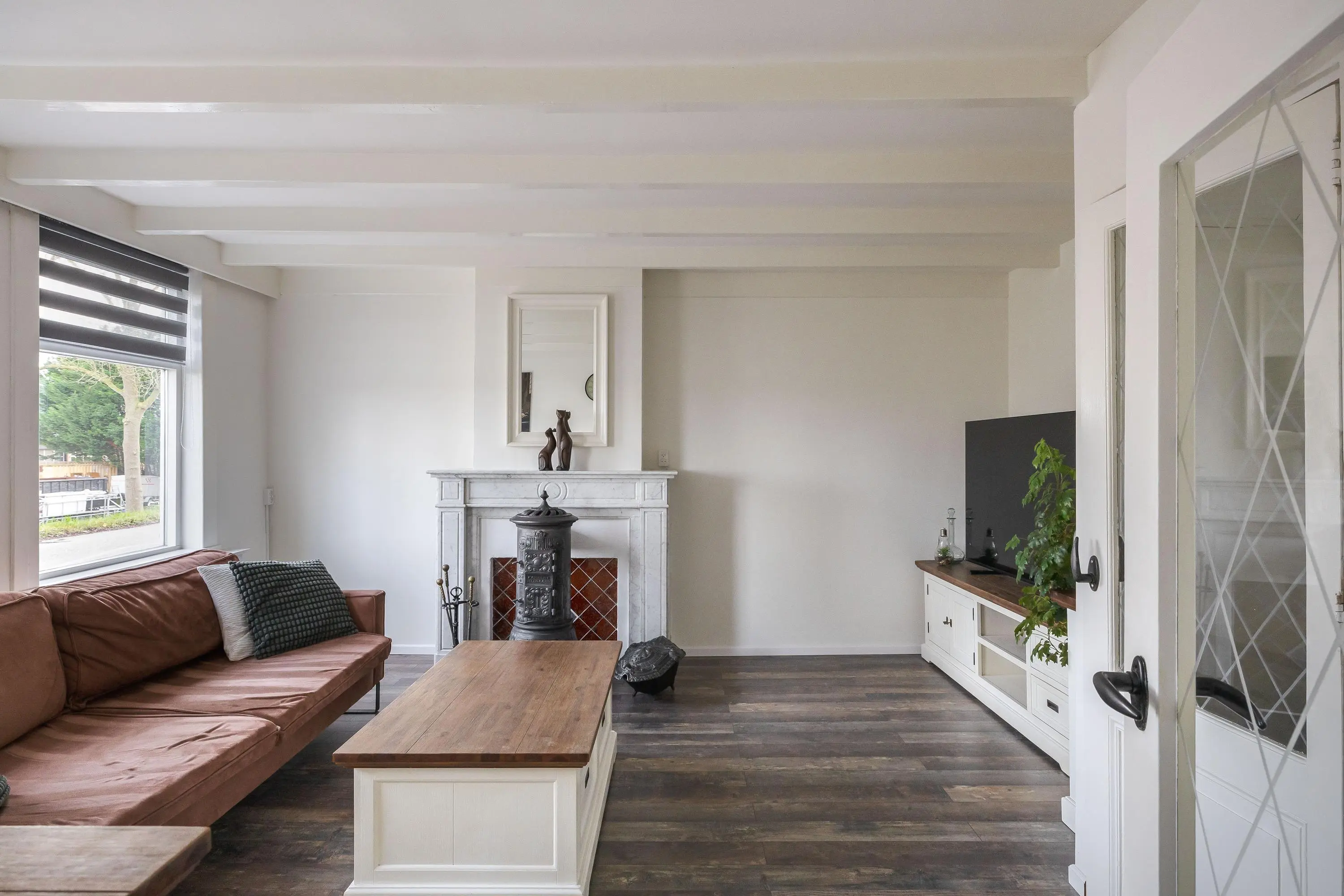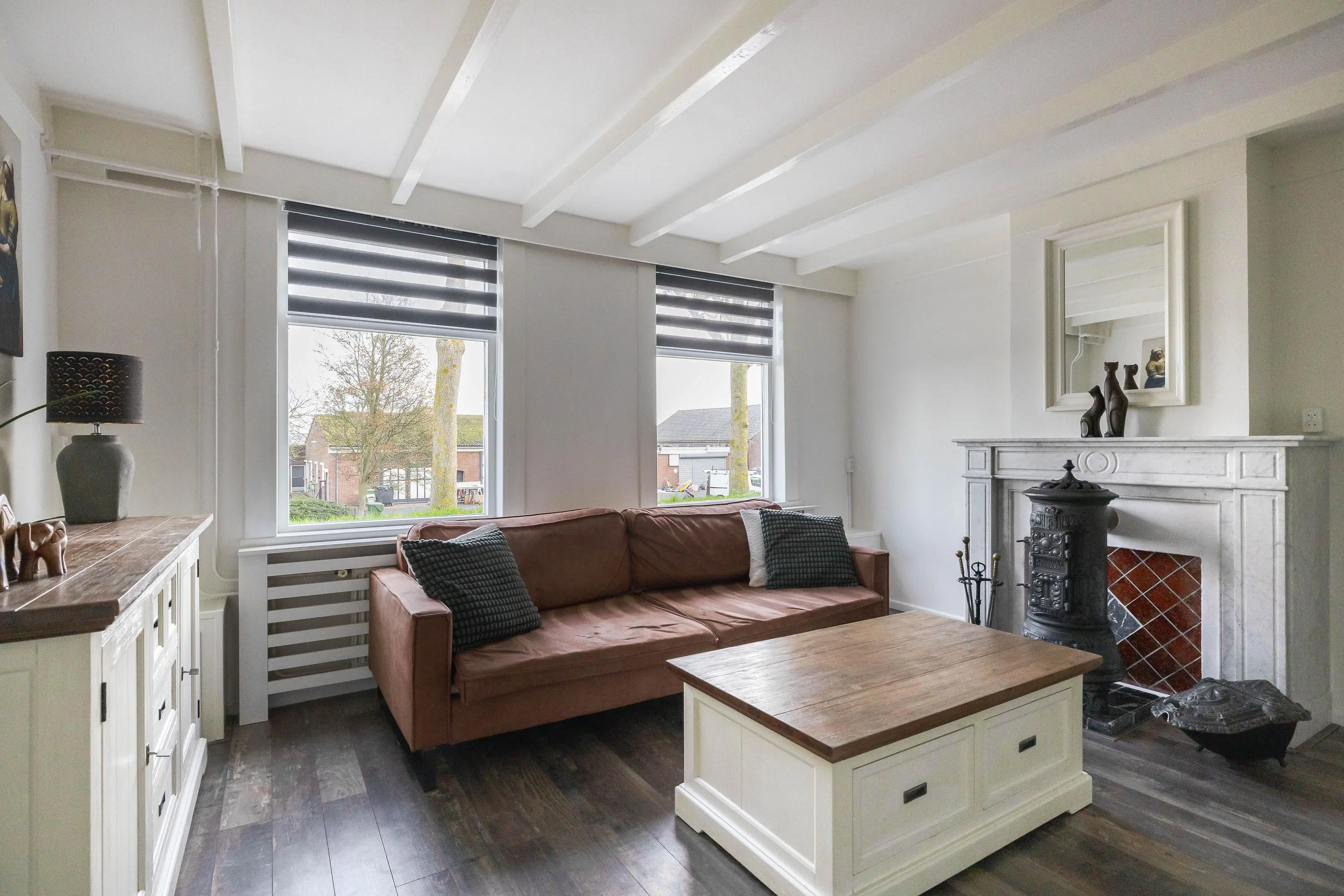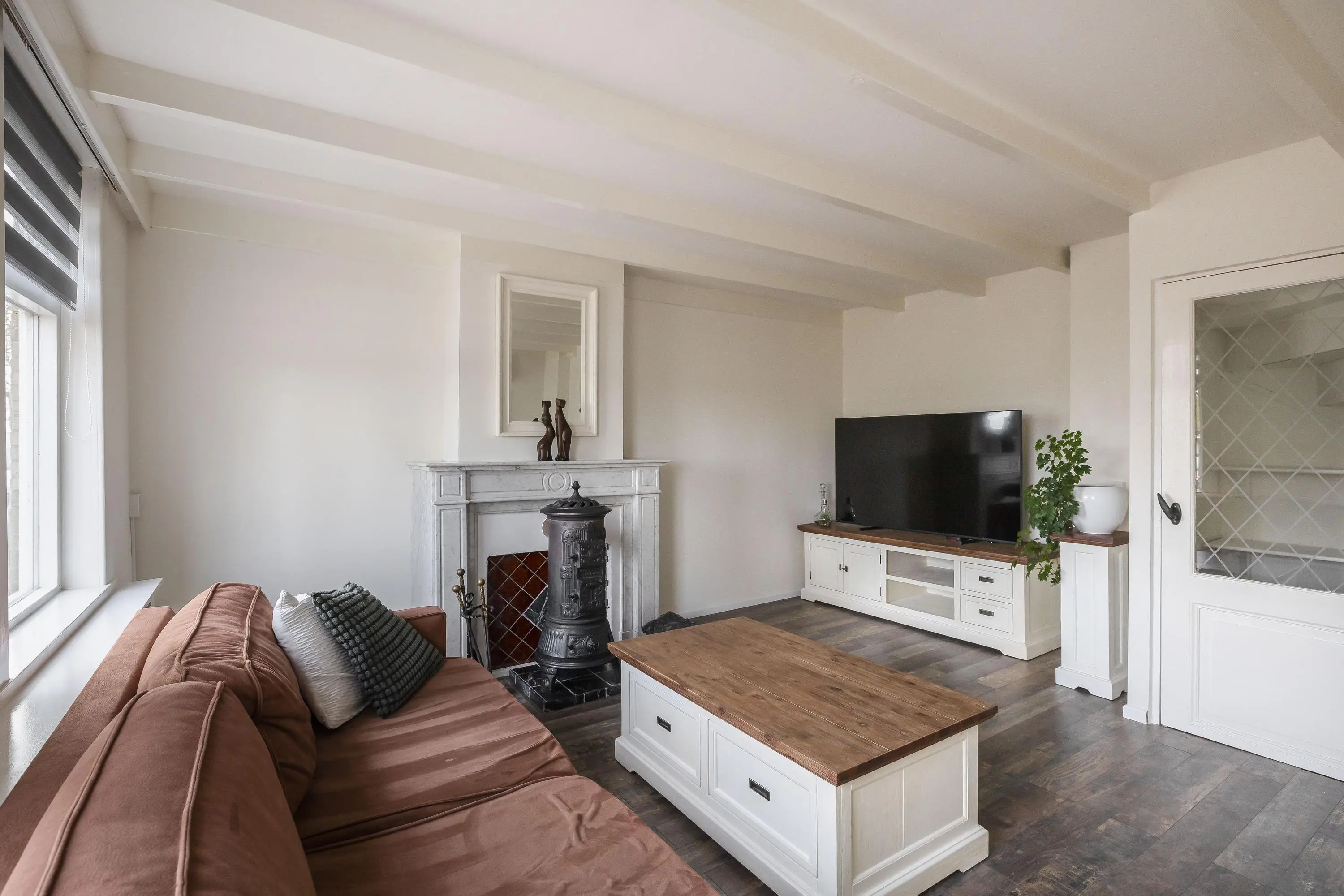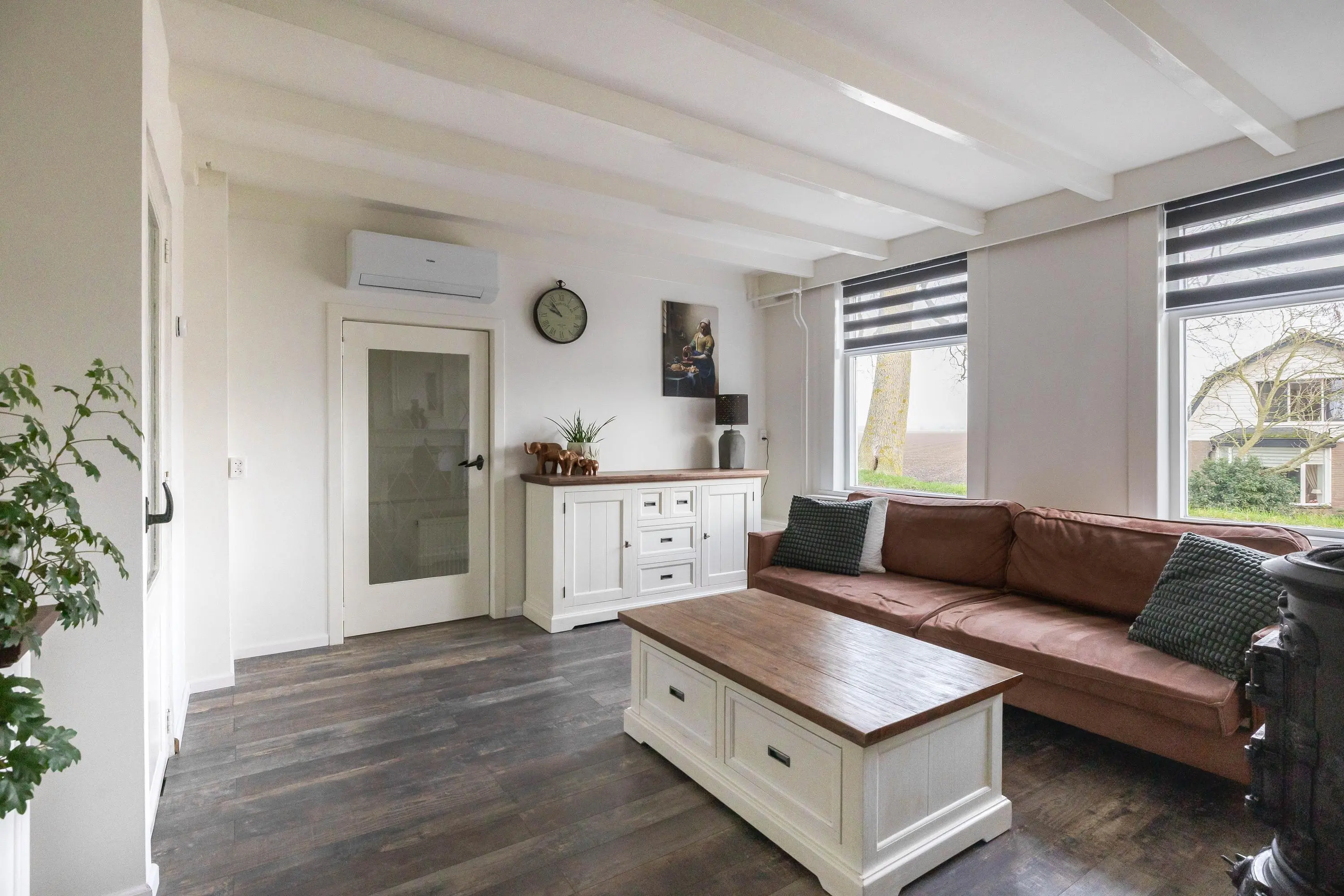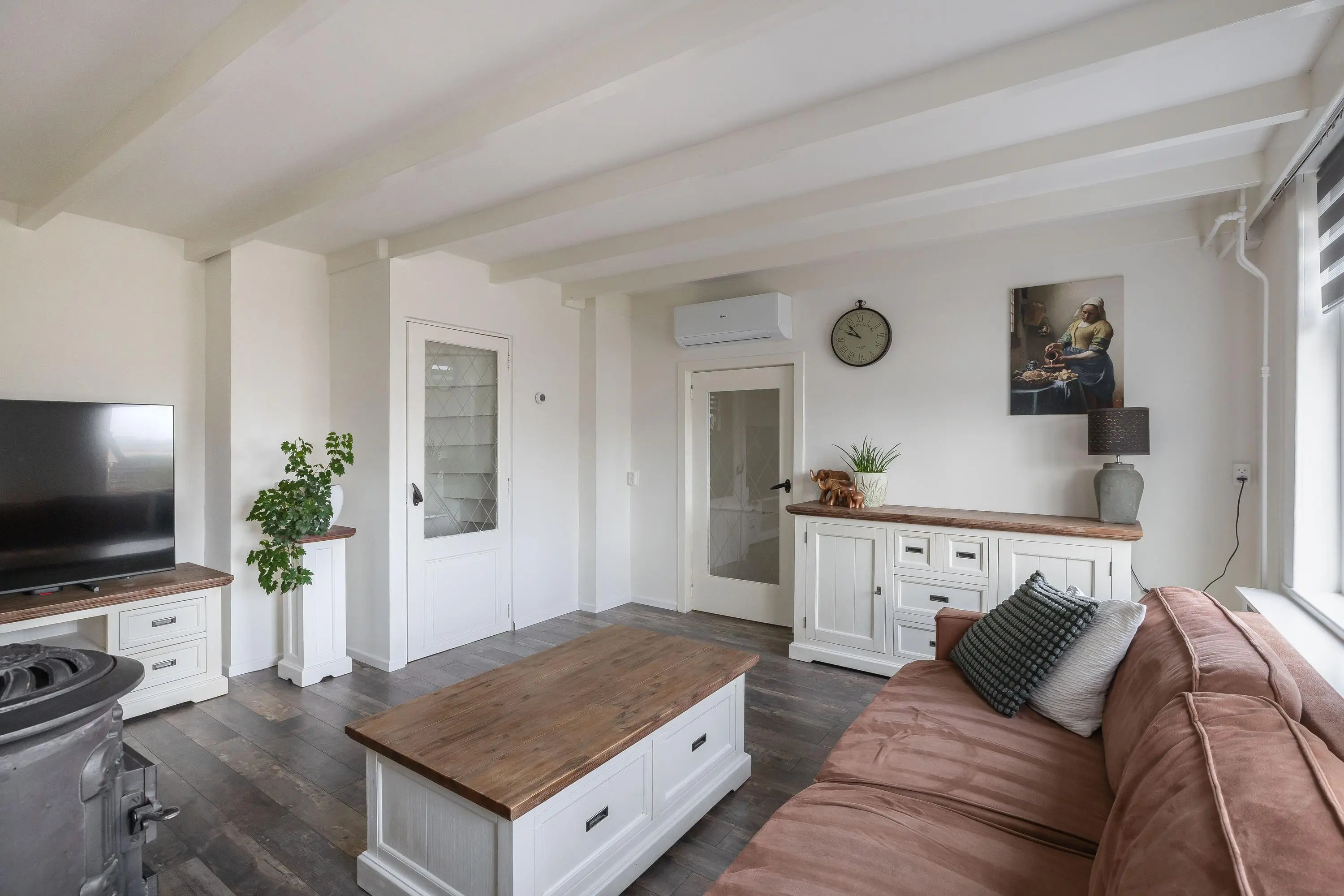 De woonkamer is afgewerkt met een nette laminaatvloer en geniet van prettig daglicht dankzij de raampartijen. De ruimte is groot genoeg voor het creëren van een gezellige zithoek en is voorzien van airconditioning en een sfeervolle houtkachel. Het balkonplafond draagt bij aan een karaktervolle uitstraling. Daarnaast bevindt zich hier een praktische trapkast.