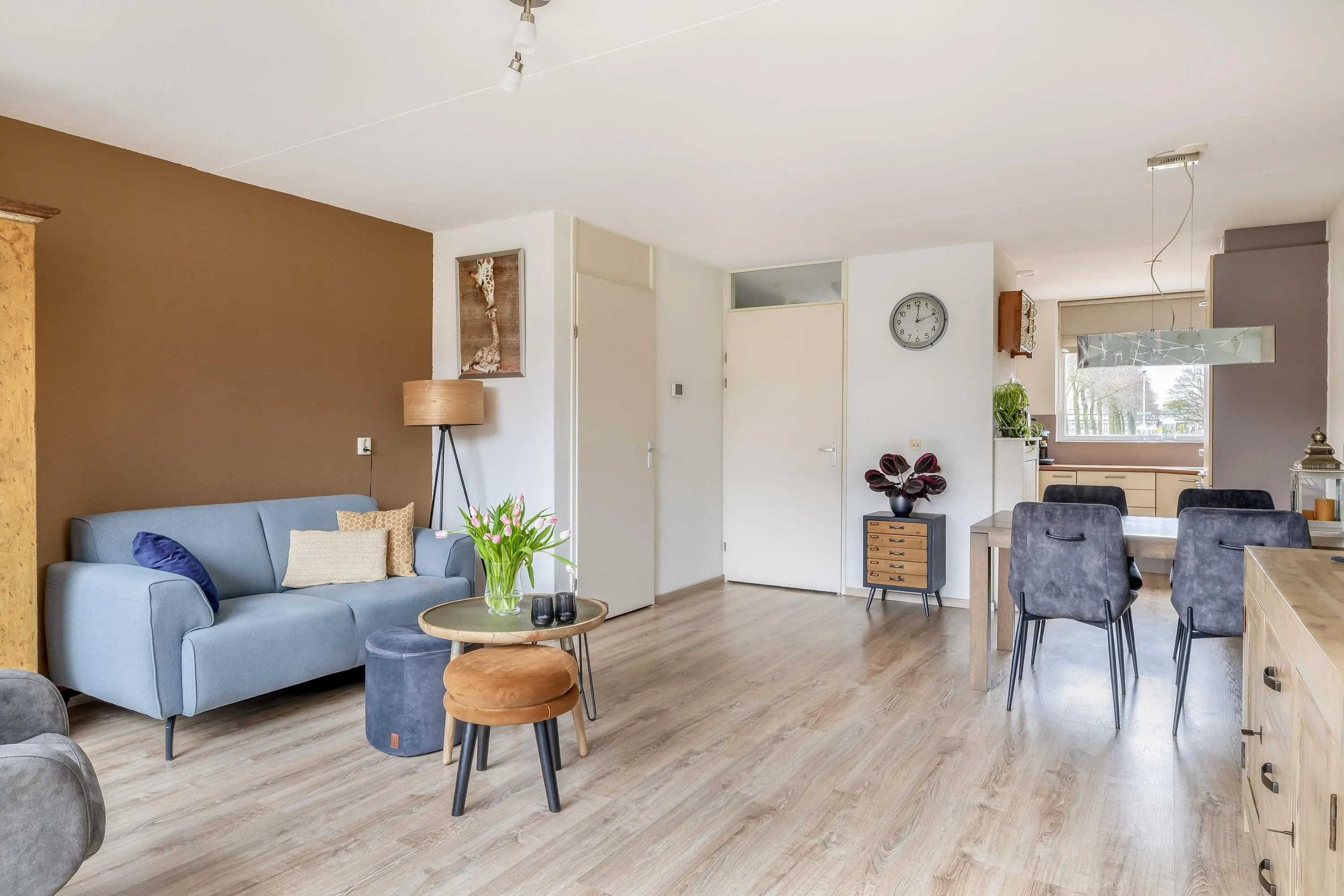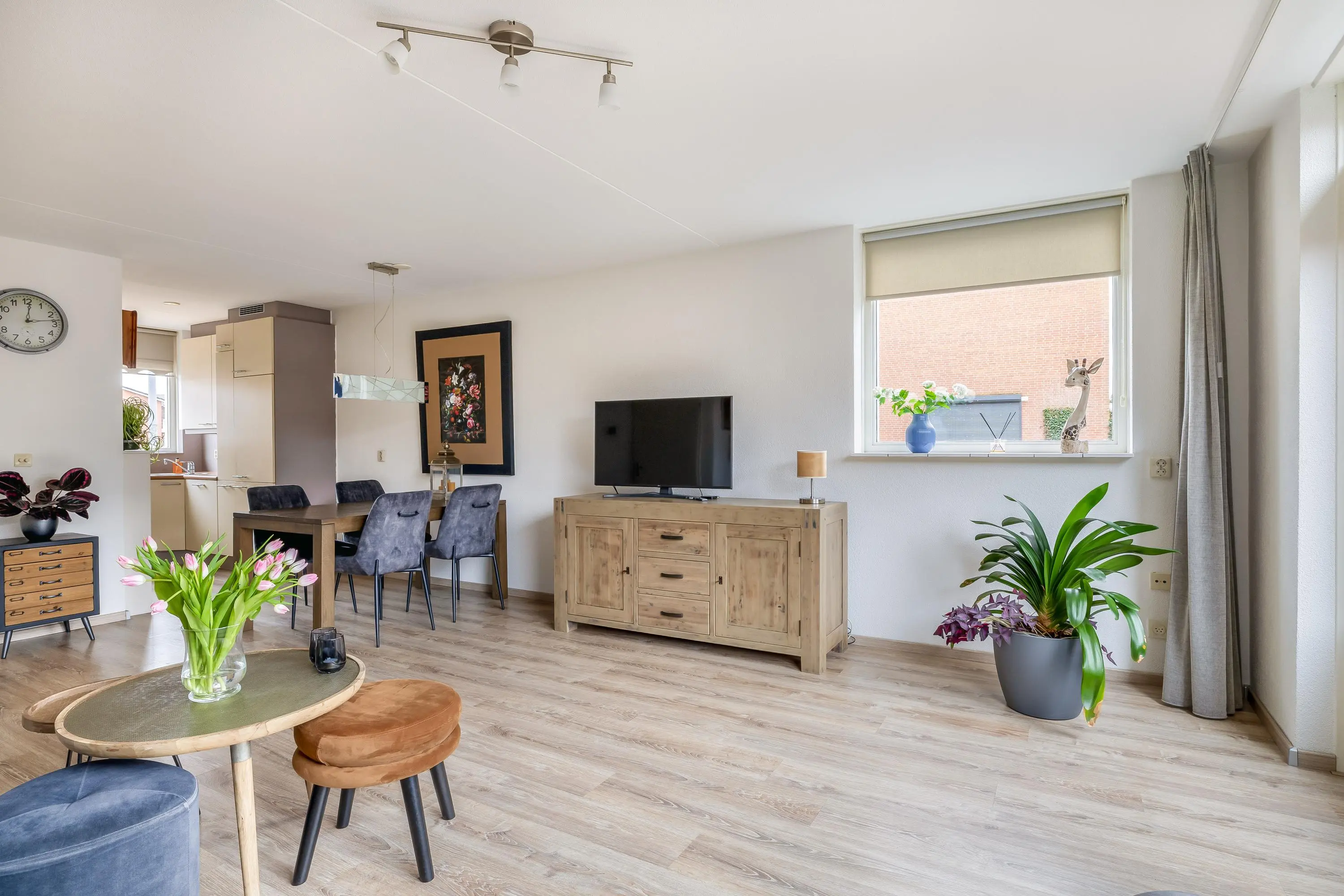 De woonkamer is ruim opgezet en heerlijk licht dankzij de grote raampartijen aan zowel de voor-, achter- als zijkant. Door de royale oppervlakte van circa 28m² kun je hier moeiteloos een gezellige zithoek creëren, terwijl er daarnaast voldoende ruimte overblijft voor gezellig eethoek.
