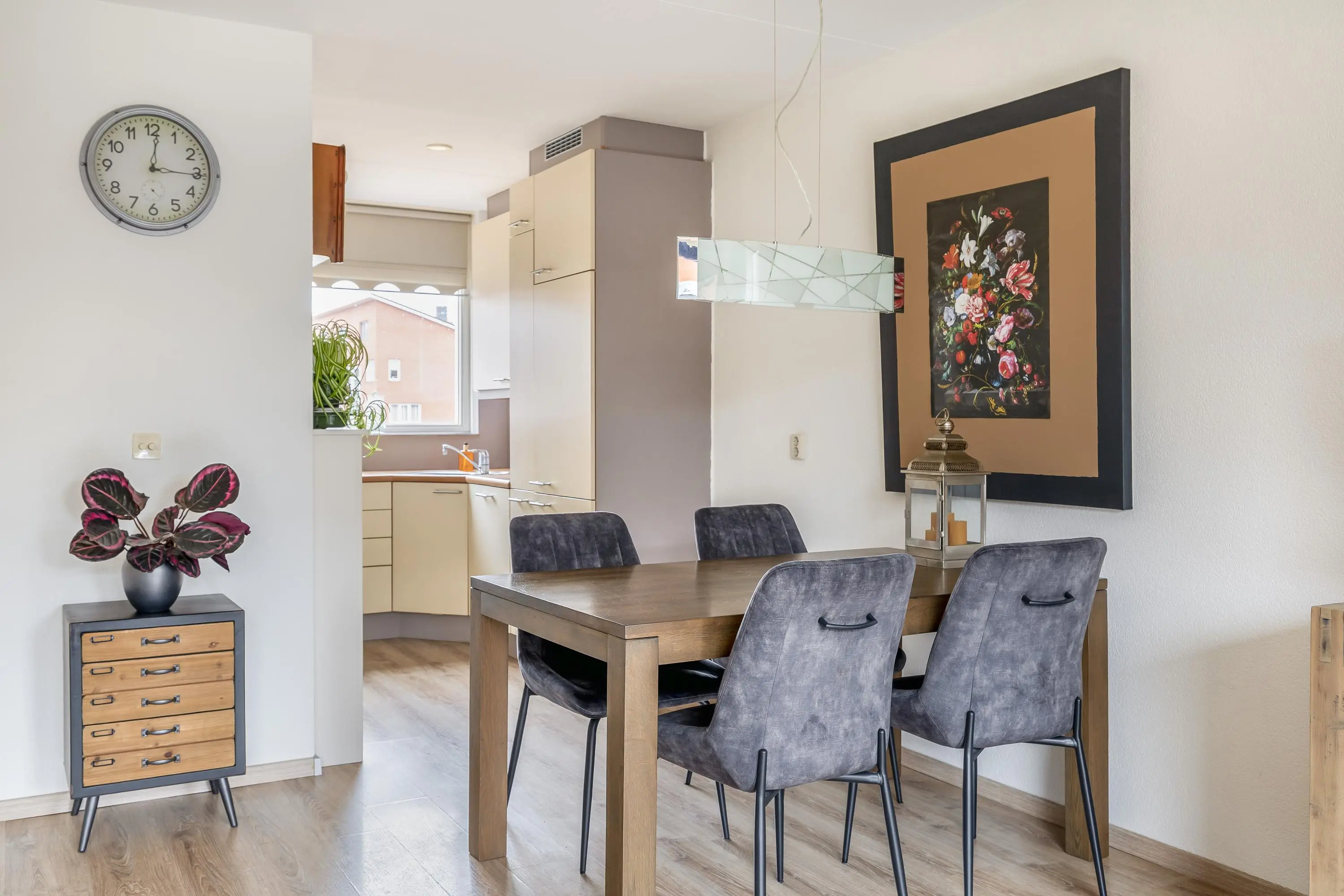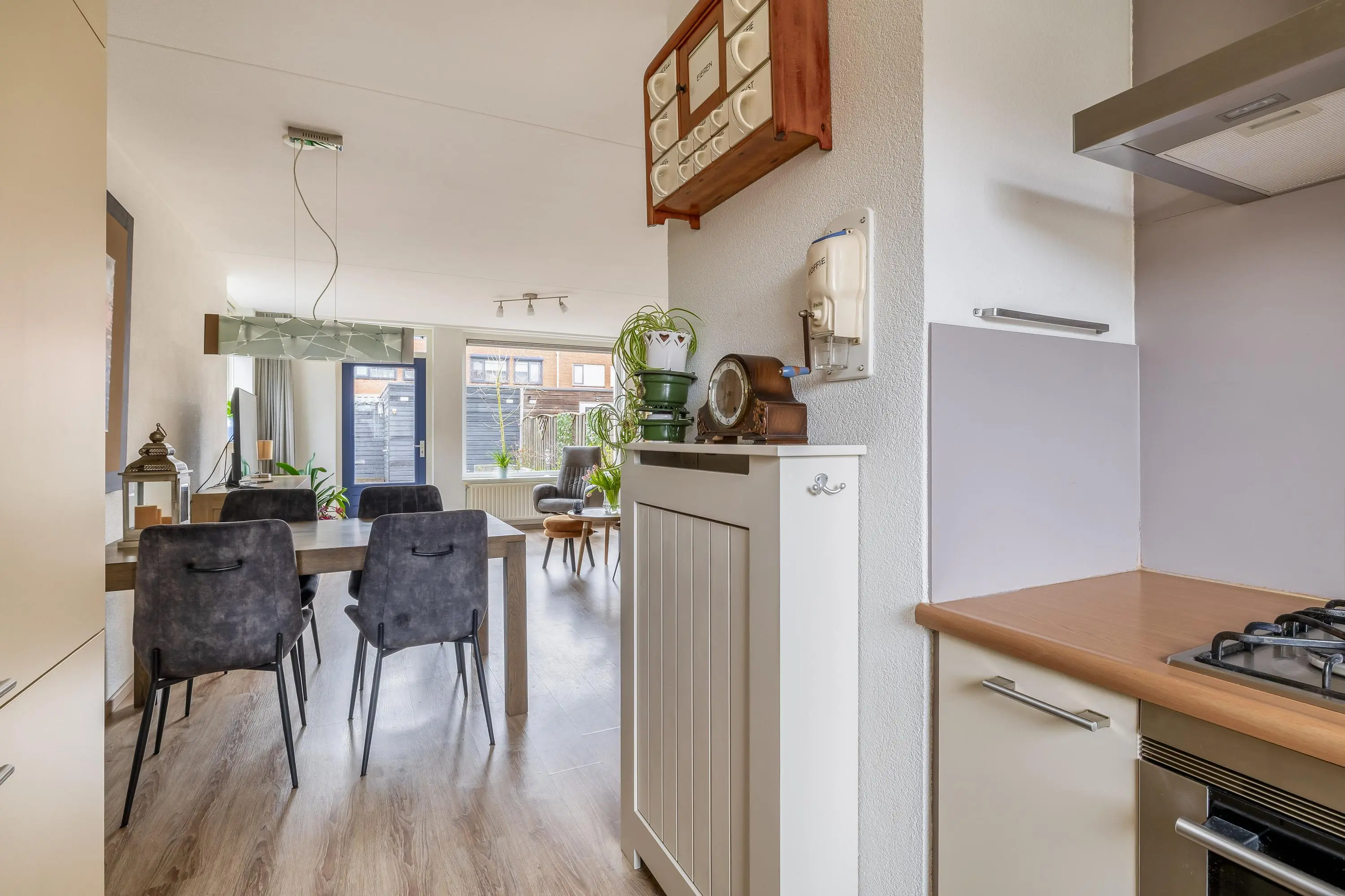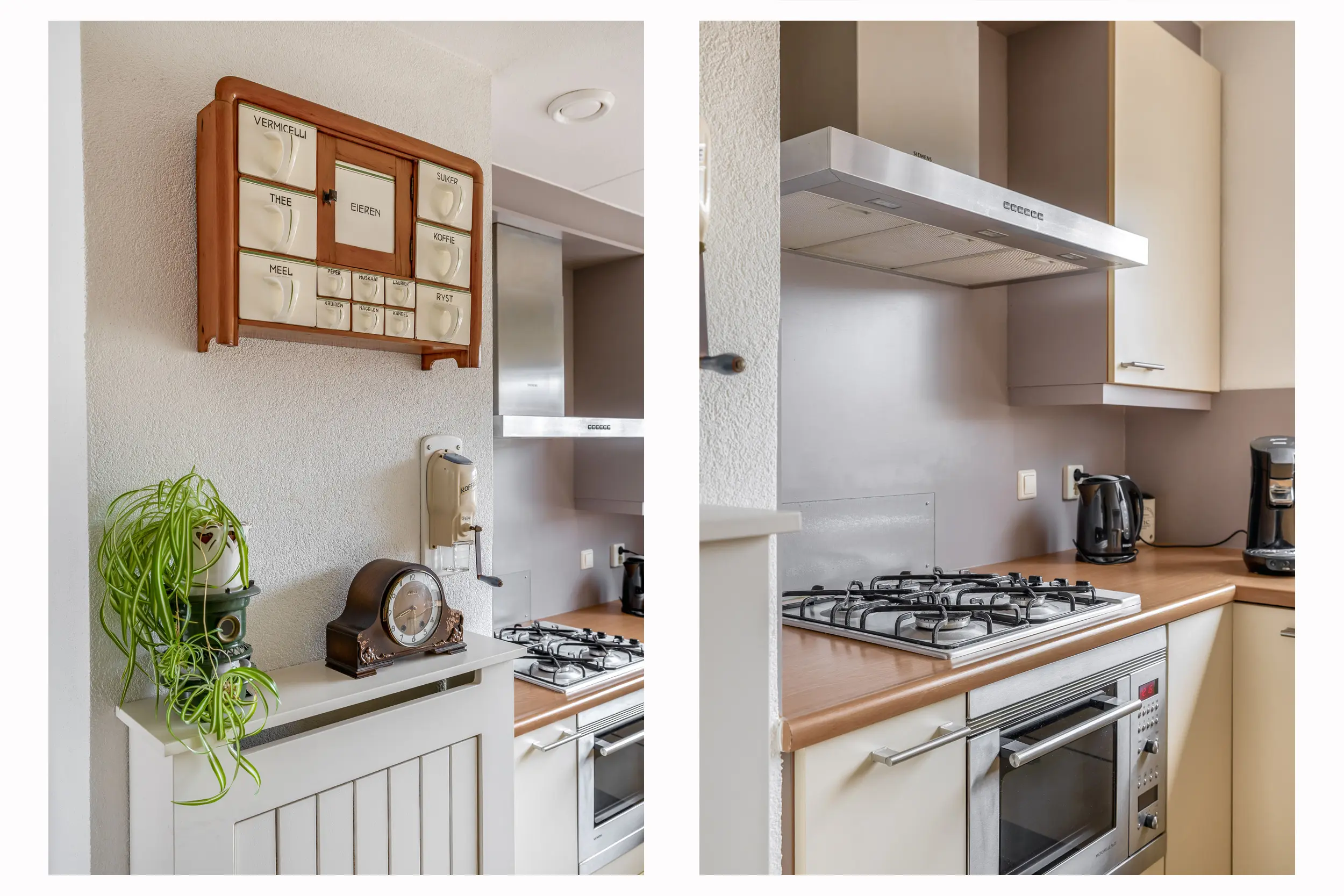 Aan de voorzijde van de woning bevindt zich de open hoekkeuken die is voorzien van diverse inbouwapparatuur waaronder een 4-pits gaskookplaat, afzuigkap, combi-oven en een koel-/vriescombinatie. Vanuit het keukenraam geniet je van een vrij uitzicht over de singel.