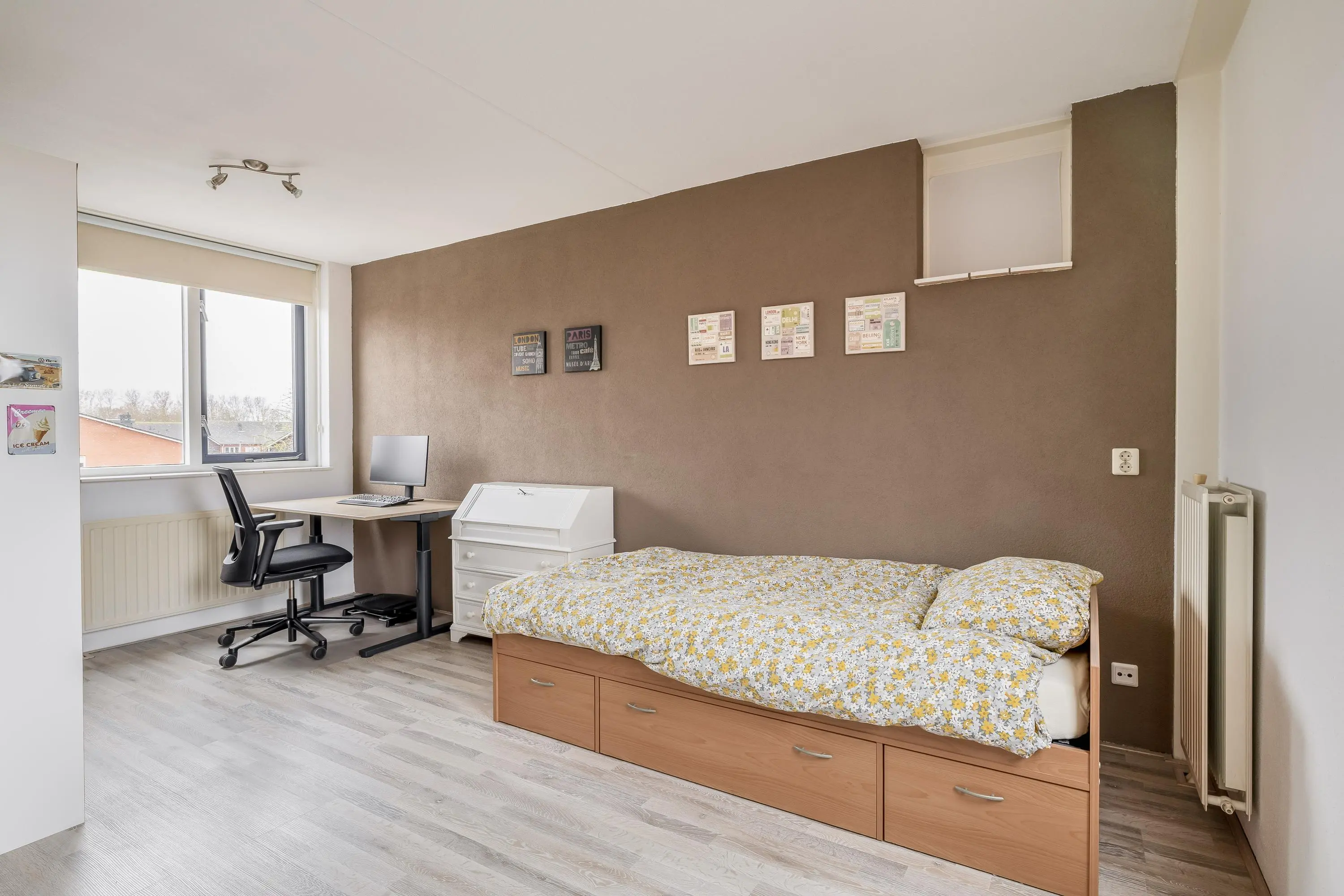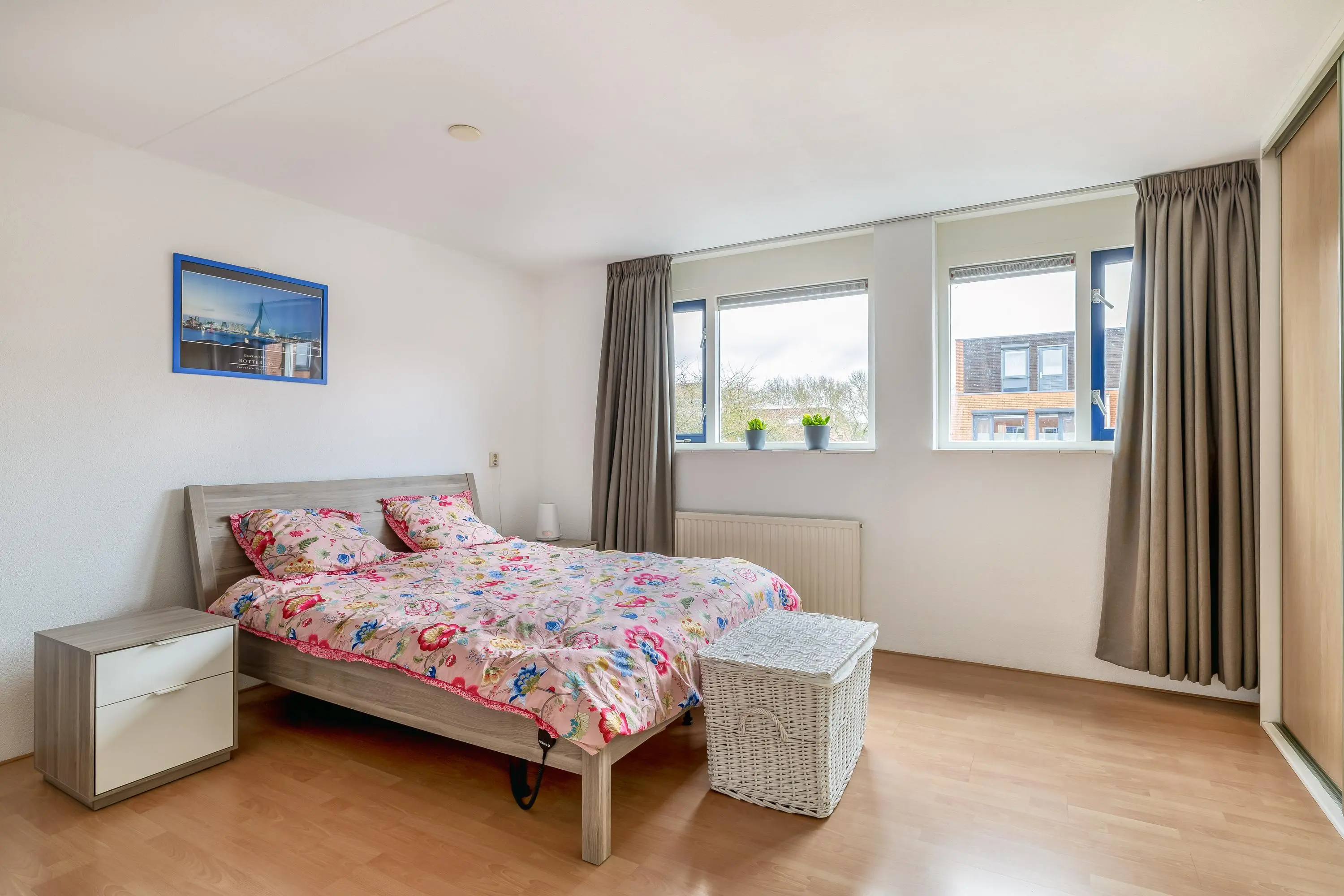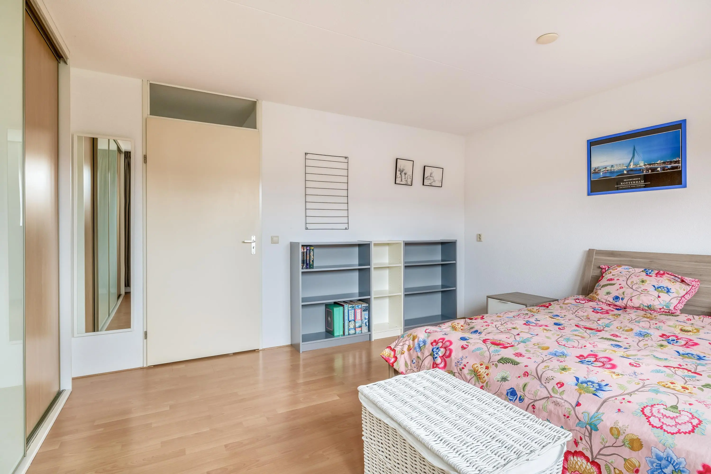 De hoofdslaapkamer is gelegen aan de achterzijde en is bijzonder ruim met een oppervlakte van circa 19,5 m². Deze slaapkamer beschikt over een praktische inbouwkast met schuifdeuren.