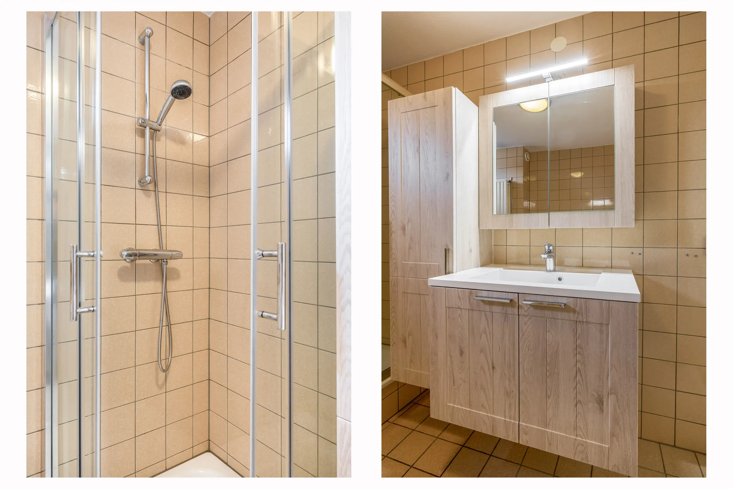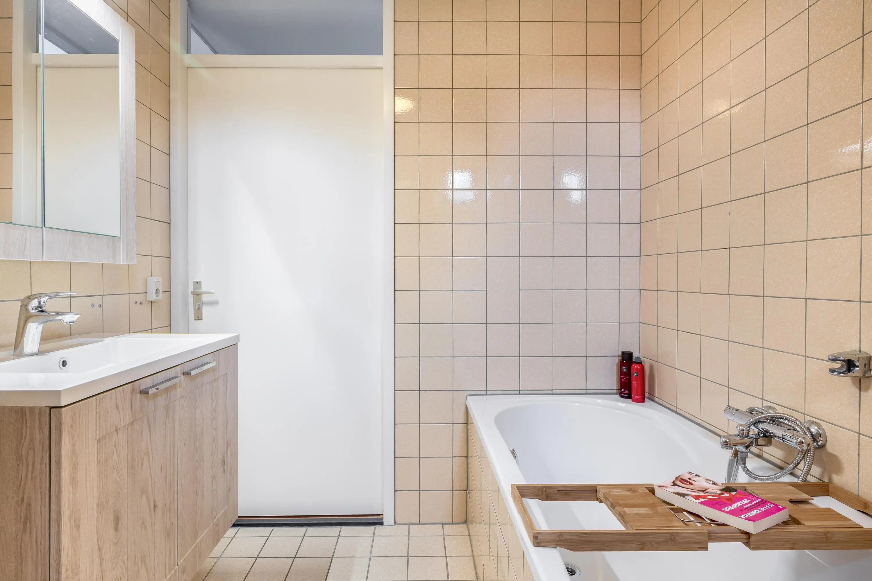 De badkamer is volledig betegeld en voorzien van een douche, ligbad, toilet en wastafelmeubel. Het aanwezige raam zorgt voor natuurlijke ventilatie naast de mechanische ventilatie.