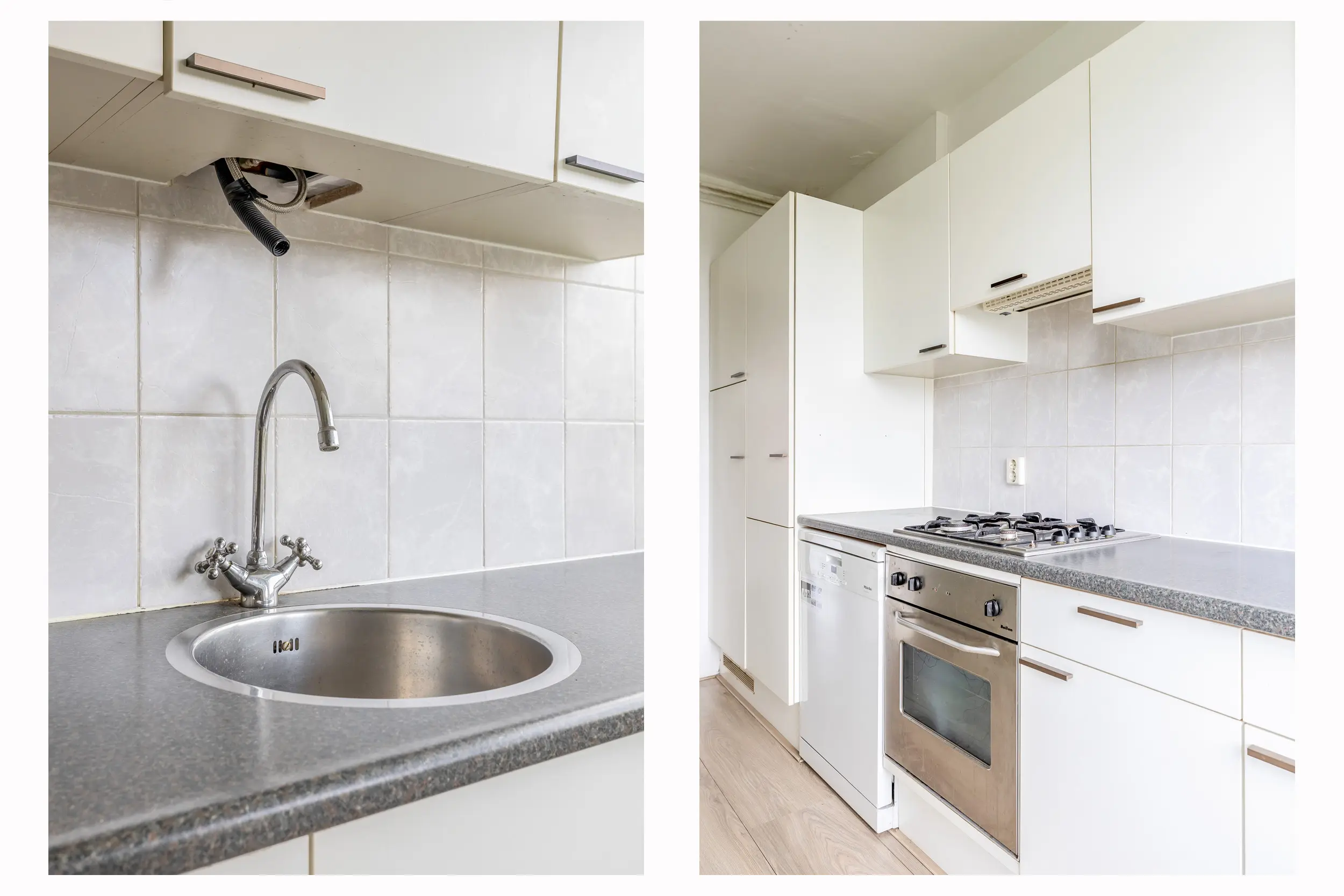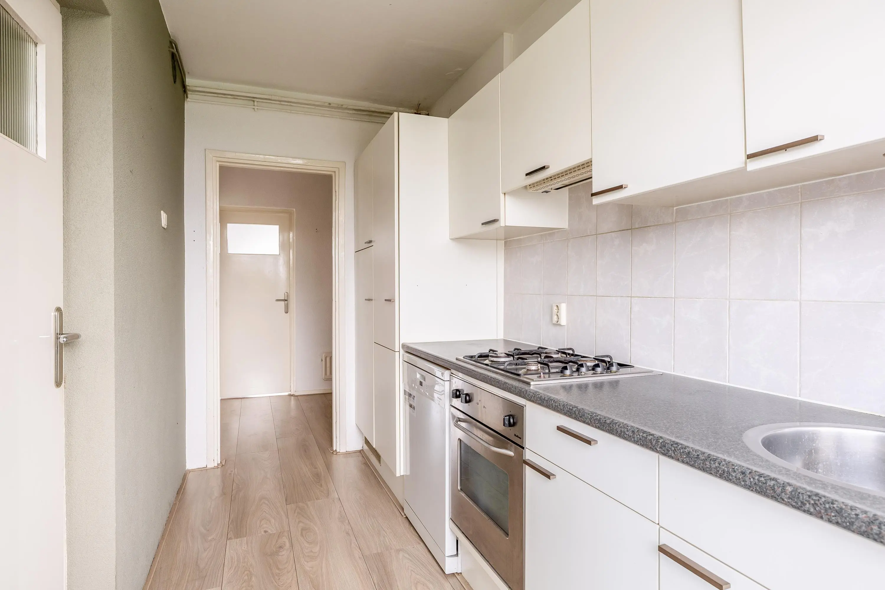 Vanuit de hal is er ook toegang tot de nette keuken. Deze is uitgevoerd in een wandopstelling en bestaat onder andere uit een gaskookplaat, afzuigkap, oven, koelkast en een losse vaatwasmachine. De keuken biedt eveneens toegang tot het balkon en vanuit de keuken is er toegang tot de badkamer.