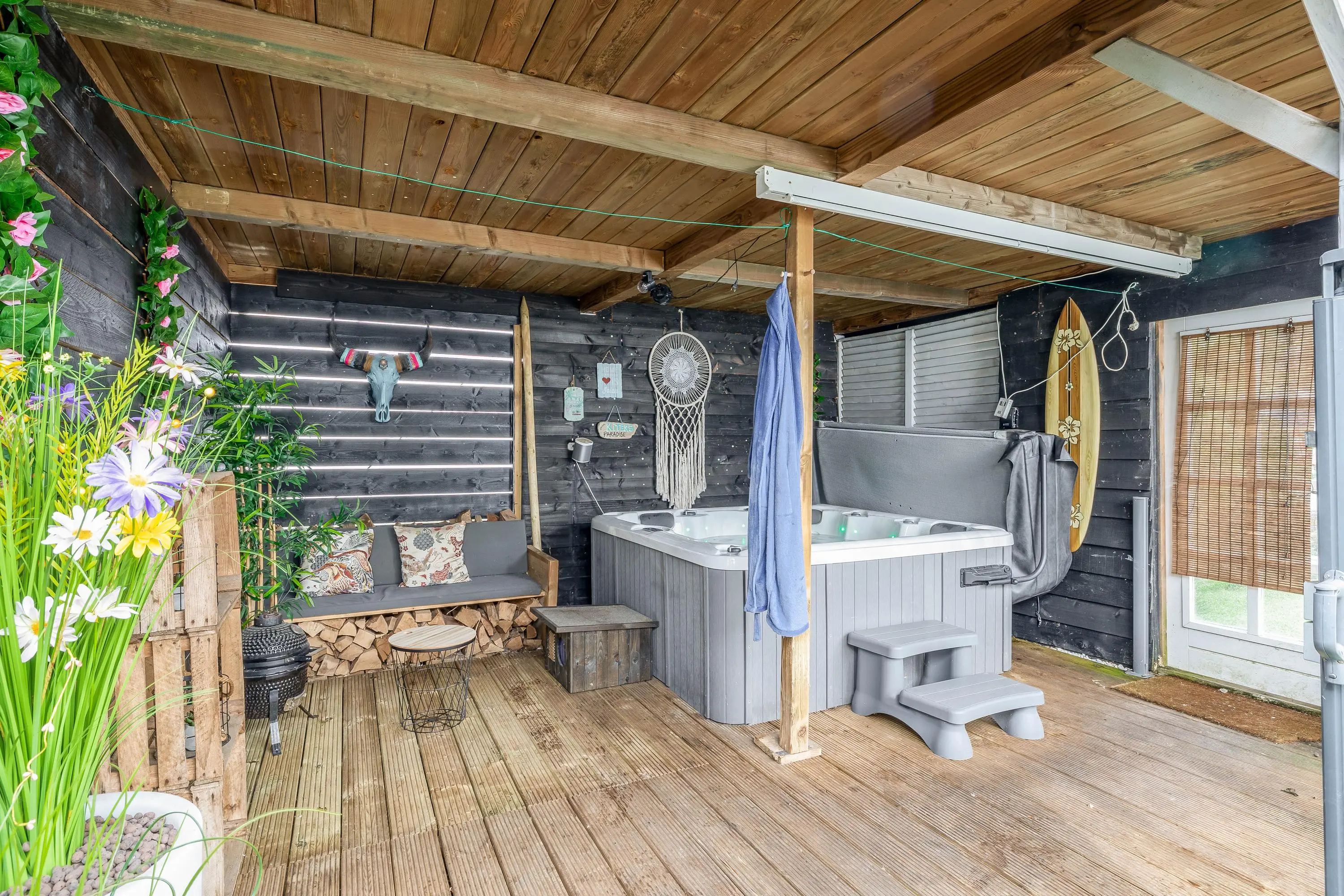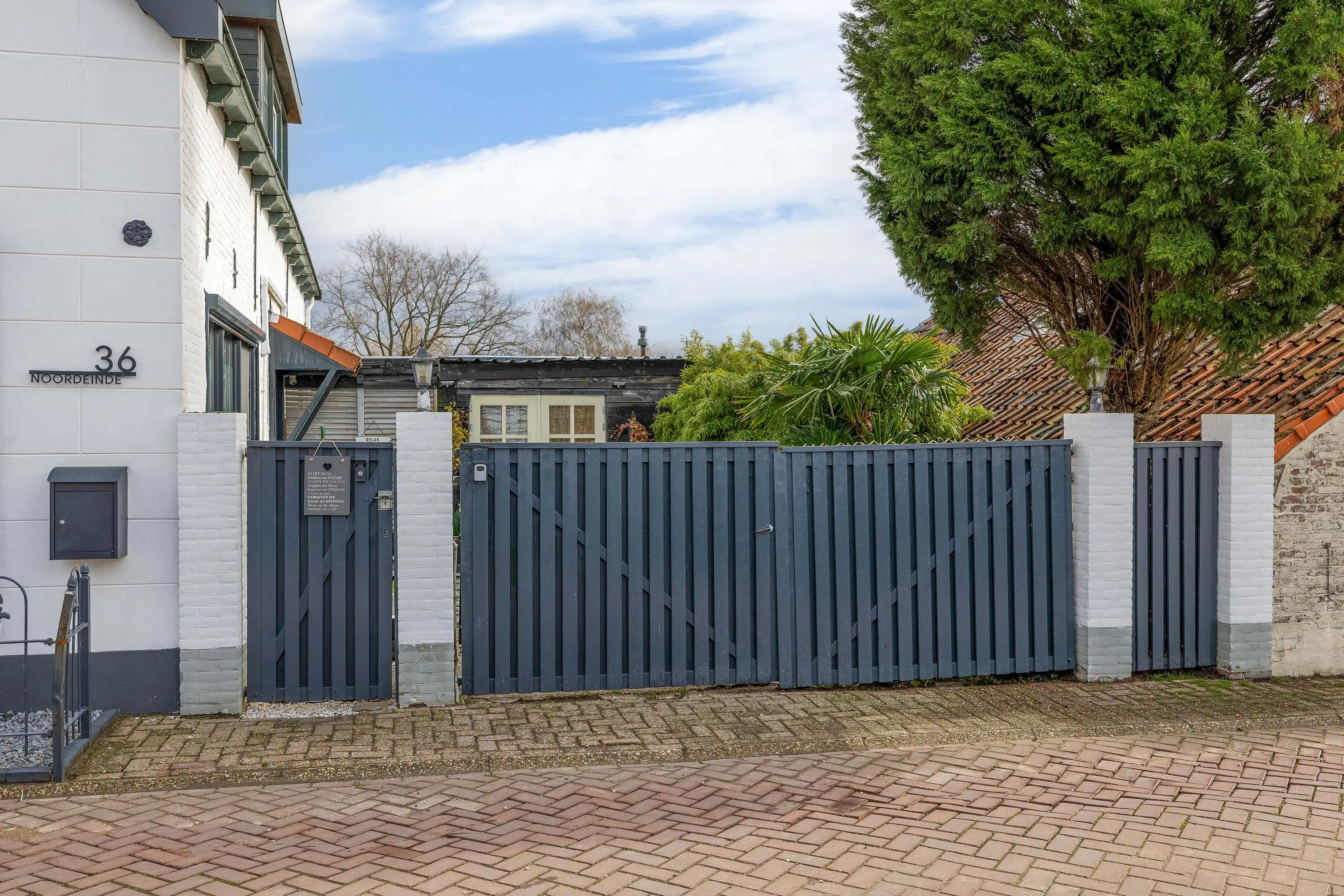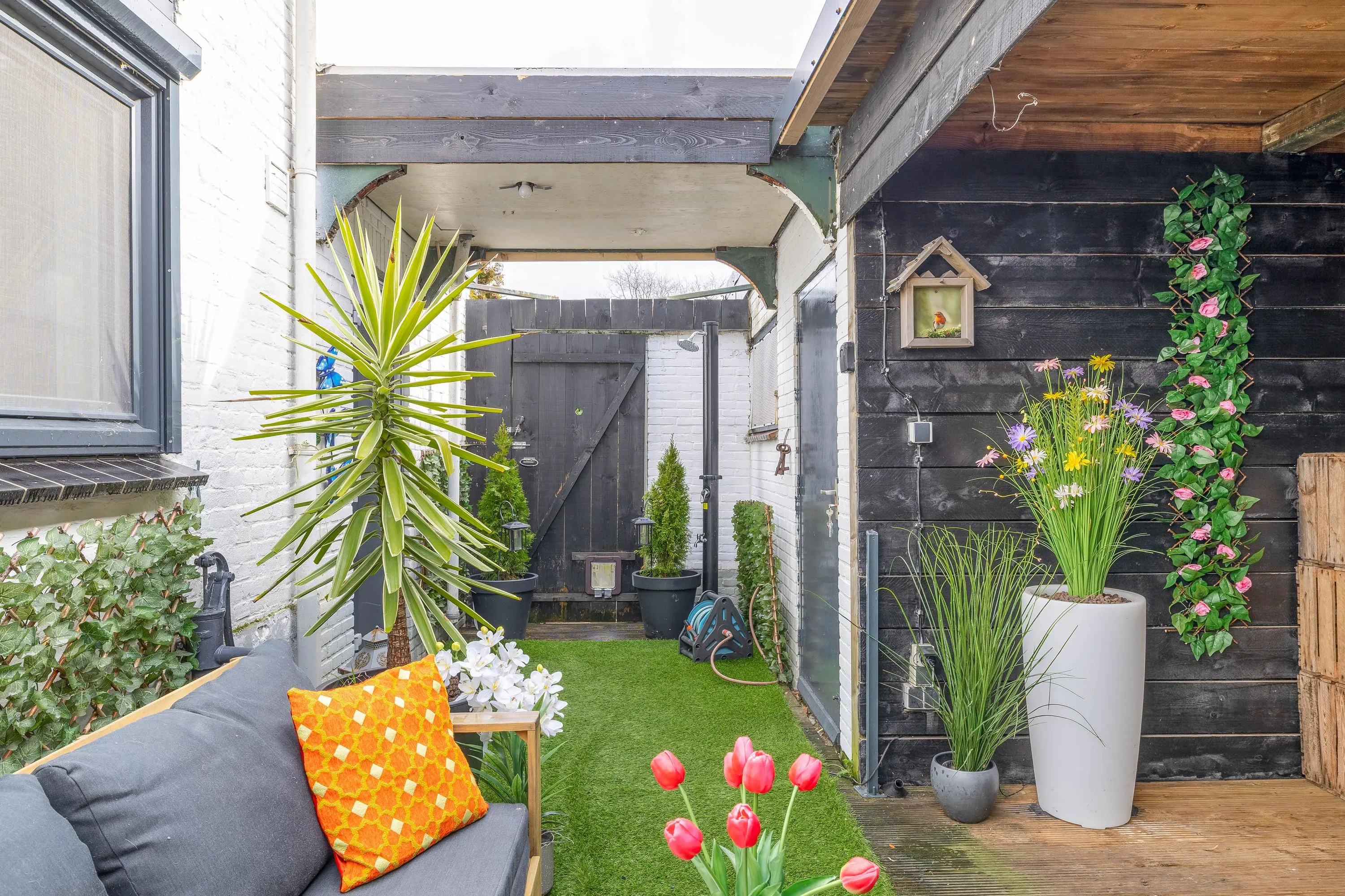 De zijtuin is een sfeervolle en veelzijdige buitenruimte, ingericht met kunstgras en een klein gedeelte met steenvloer. Langs de zijkanten zijn borders voor beplanting, wat de tuin een groene uitstraling geeft. Indien gewenst heeft u de mogelijkheid om hier een oprit te maken zodat er geparkeerd kan worden op eigen terrein. De tuin is gescheiden door een wand met openslaande deuren; achter deze wand bevindt zich het tweede gedeelte van de tuin, waar een royale overkapping van circa 22m² is gesitueerd om beschut van het buitenleven te genieten. Aansluitend ligt een stenen berging van circa 29m². Zowel de overkapping als de berging zijn voorzien van elektra en er is een praktische buitendouche aanwezig. Via een hek is toegang tot de twee overige bergingen. Vanuit de tuin is bovendien een charmante doorkijk richting de kerk.