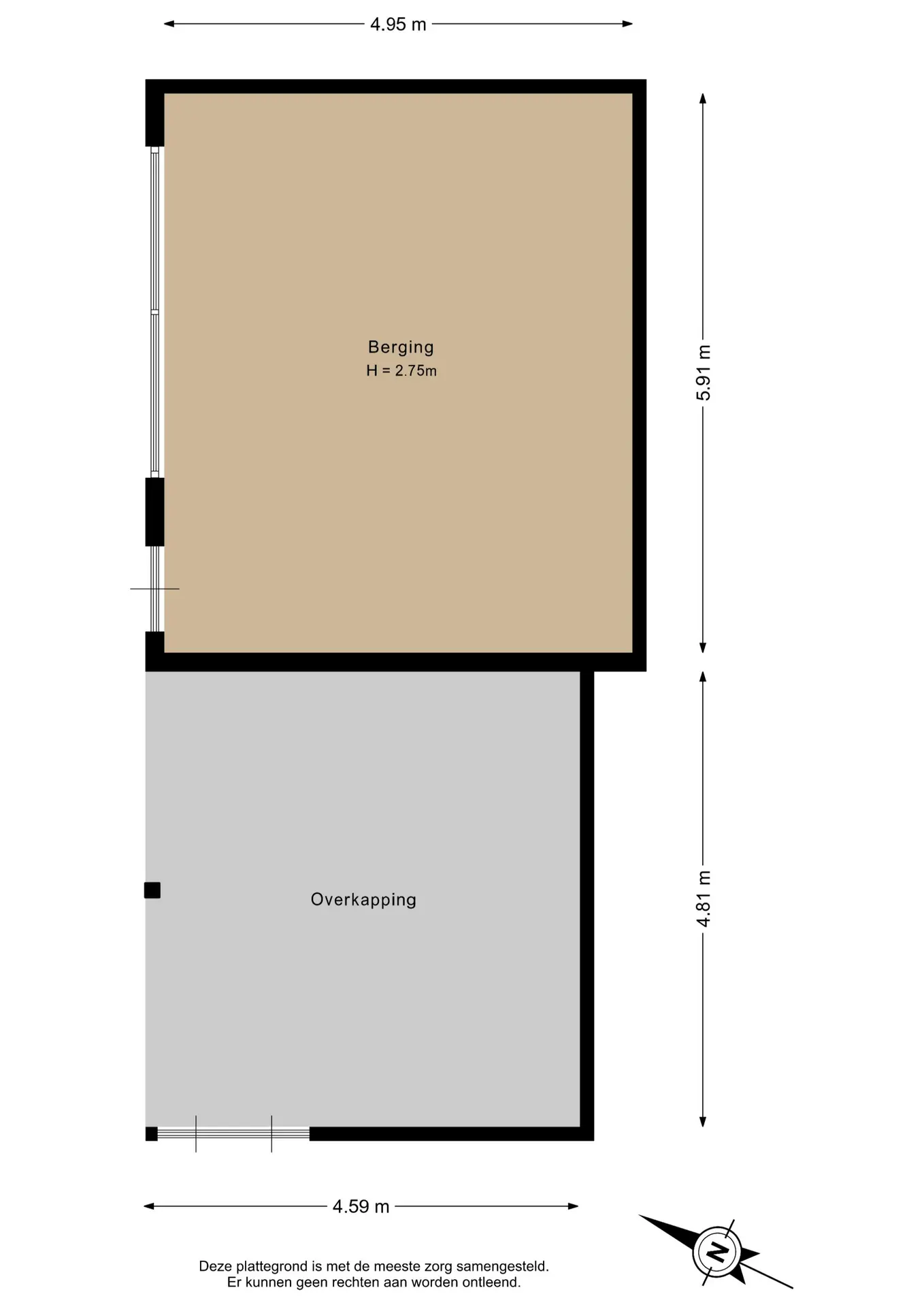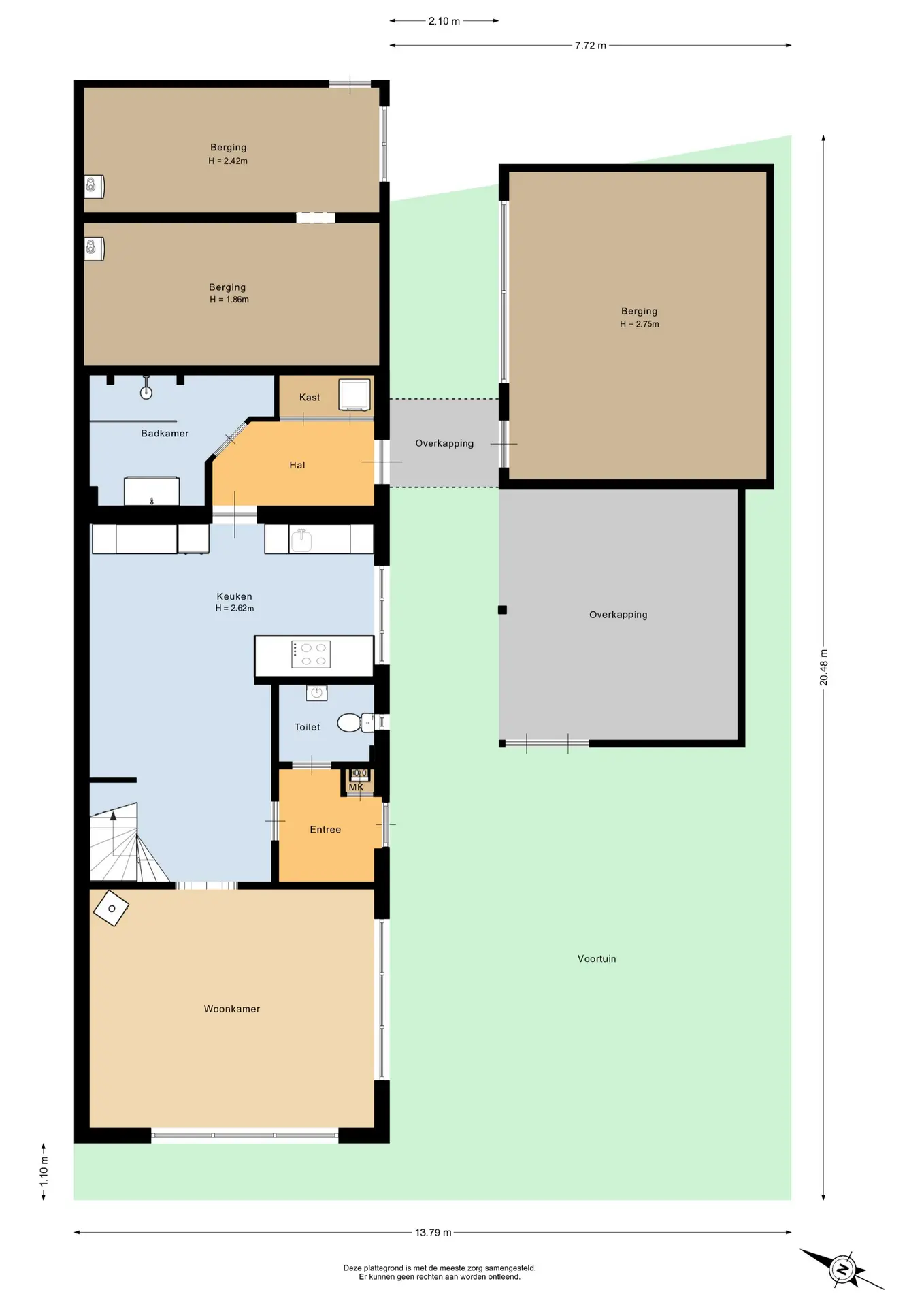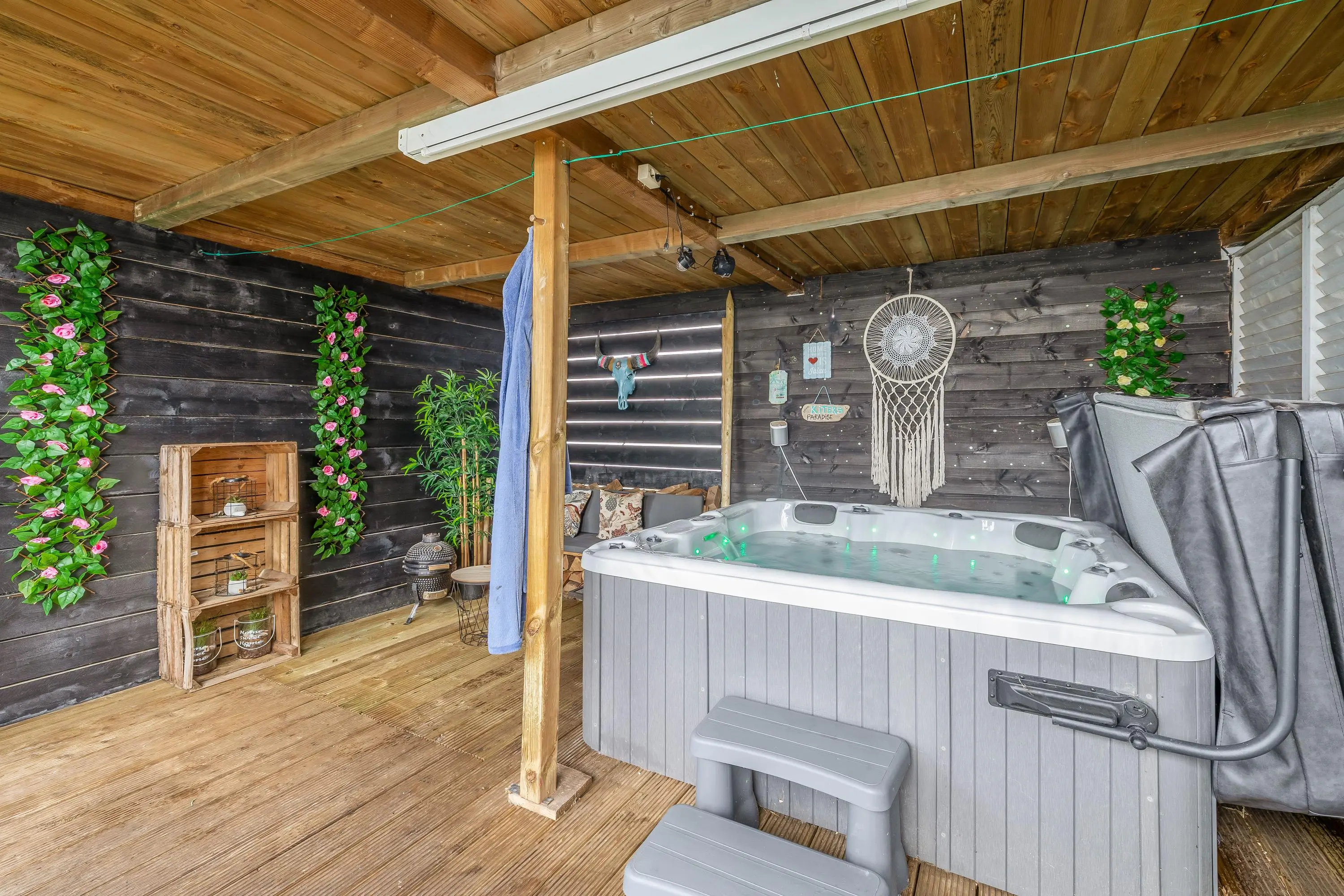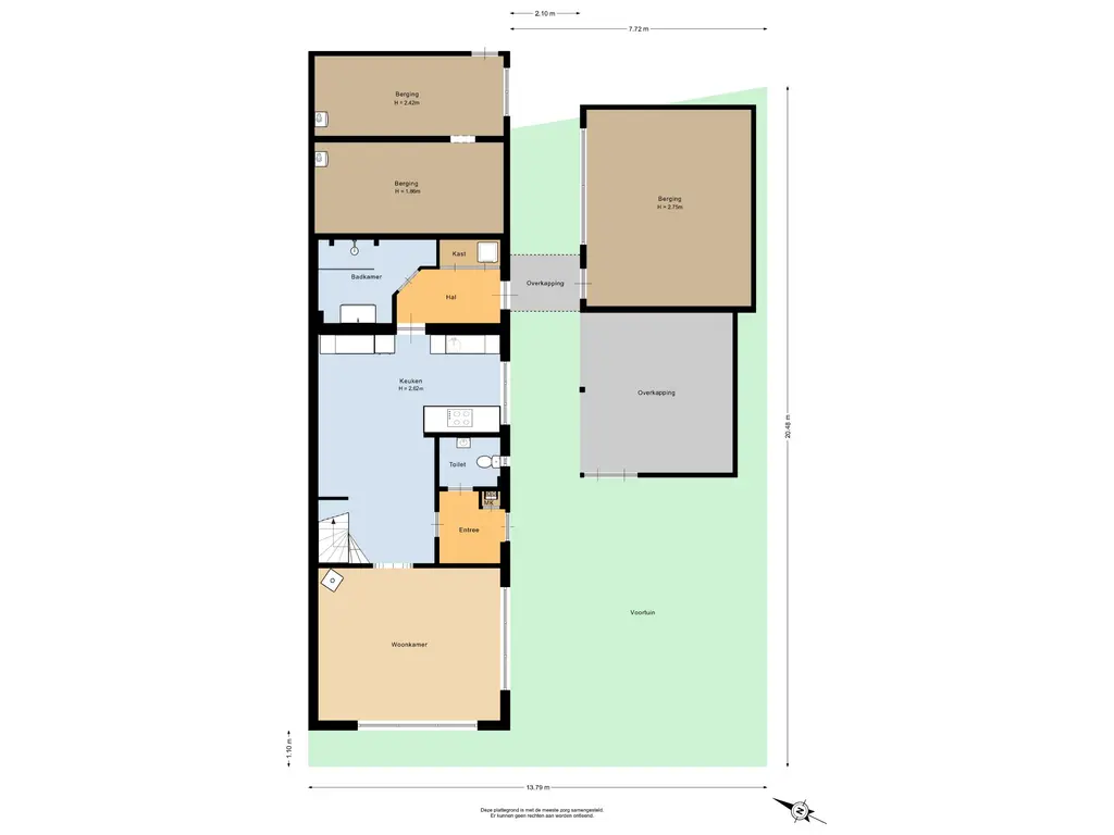 De zijtuin is een sfeervolle en veelzijdige buitenruimte, ingericht met kunstgras en een klein gedeelte met steenvloer. Langs de zijkanten zijn borders voor beplanting, wat de tuin een groene uitstraling geeft. Indien gewenst heeft u de mogelijkheid om hier een oprit te maken zodat er geparkeerd kan worden op eigen terrein. De tuin is gescheiden door een wand met openslaande deuren; achter deze wand bevindt zich het tweede gedeelte van de tuin, waar een royale overkapping van circa 22m² is gesitueerd om beschut van het buitenleven te genieten. Aansluitend ligt een stenen berging van circa 29m². Zowel de overkapping als de berging zijn voorzien van elektra en er is een praktische buitendouche aanwezig. Via een hek is toegang tot de twee overige bergingen. Vanuit de tuin is bovendien een charmante doorkijk richting de kerk.