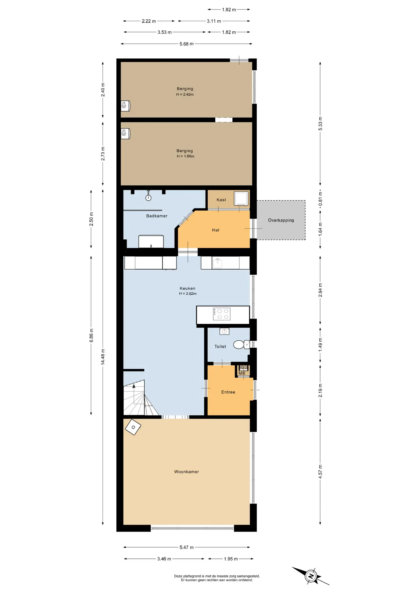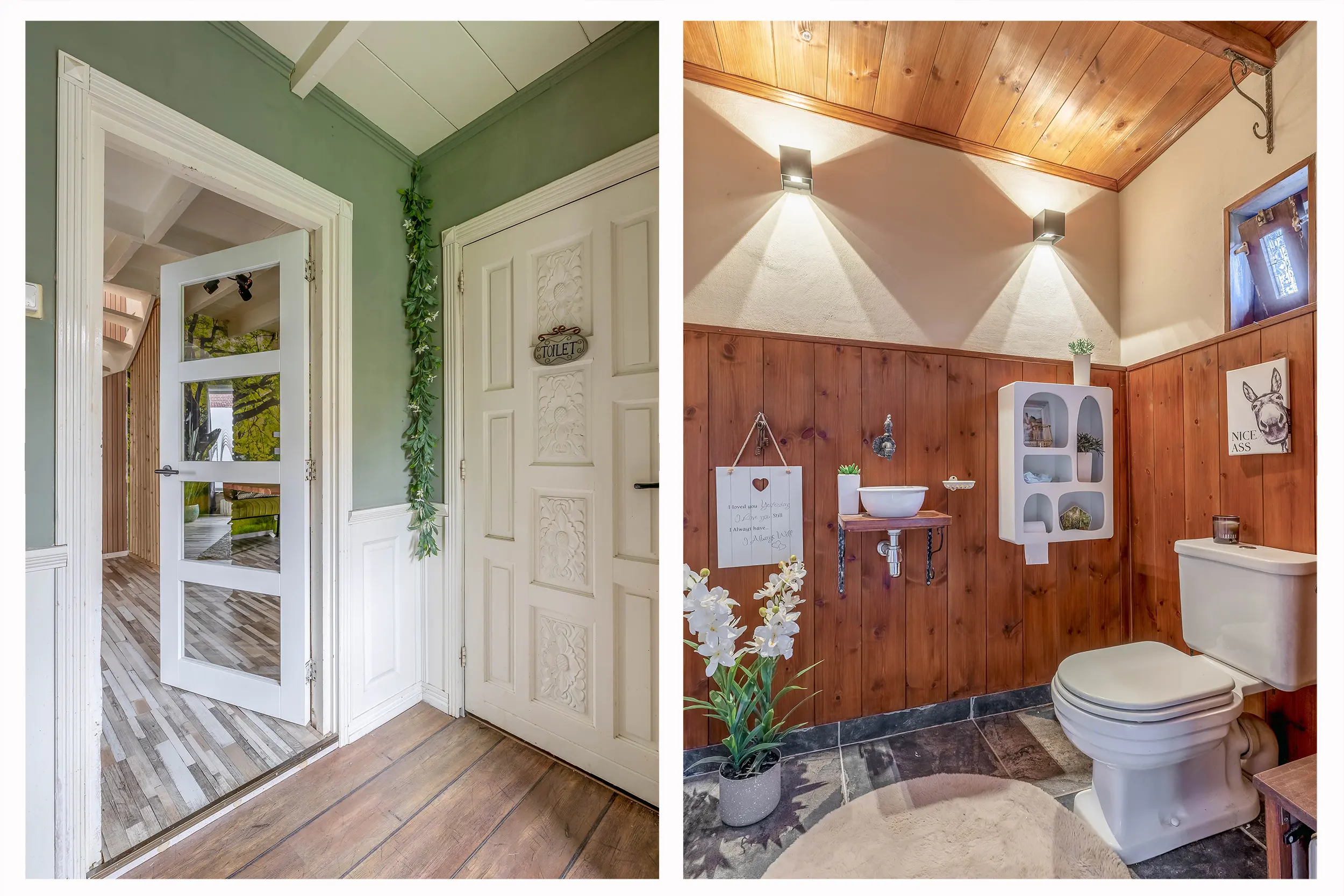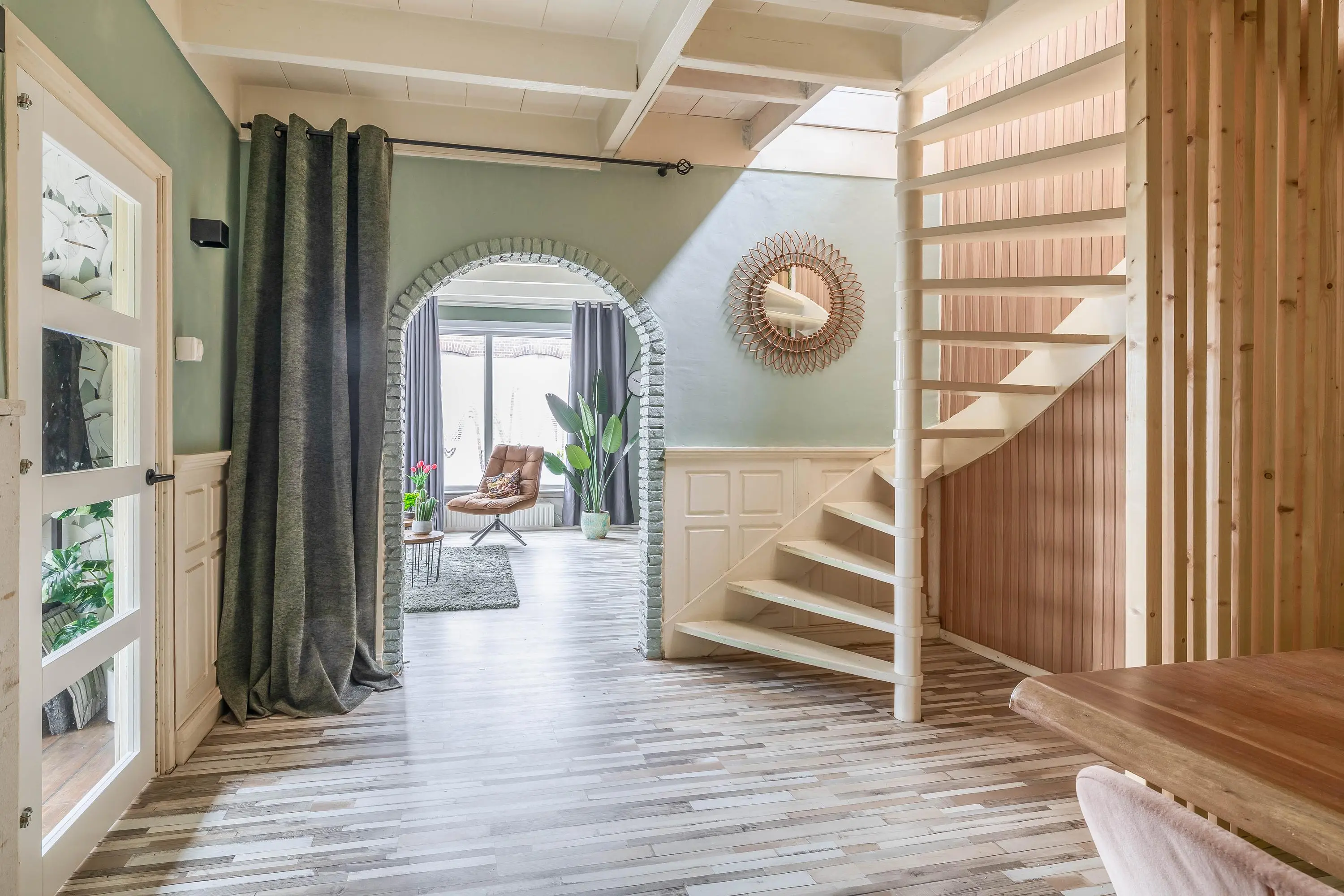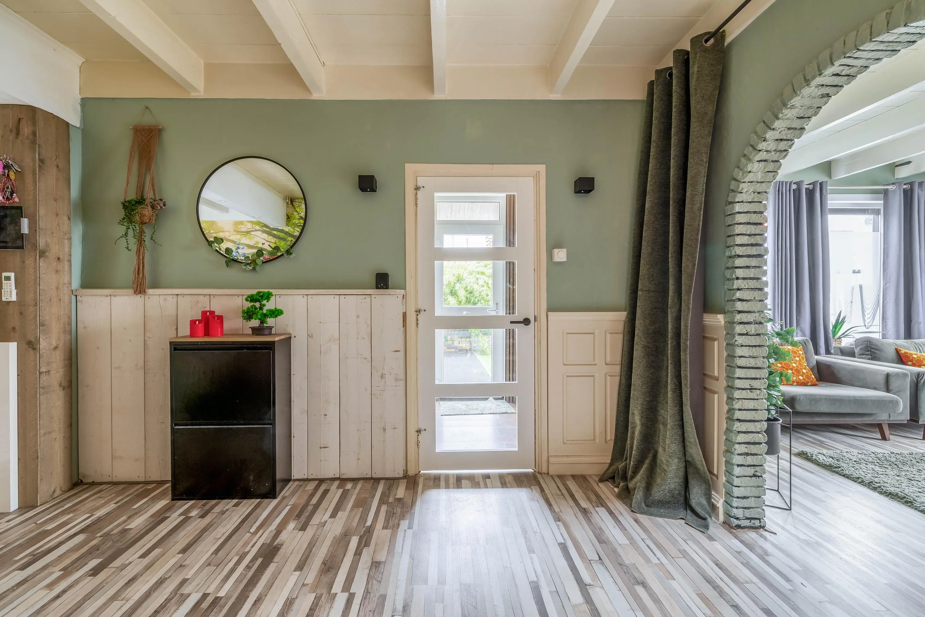Via de entree toegang tot de hal, die direct een verzorgde indruk maakt. In de hal bevindt zich de meterkast en is er toegang tot het separate toilet met fonteintje. De begane grond is praktisch ingedeeld en afgewerkt met laminaatvloeren en strakke stucwanden, terwijl de zichtbare balkenplafonds extra sfeer en karakter aan de woning geven.
