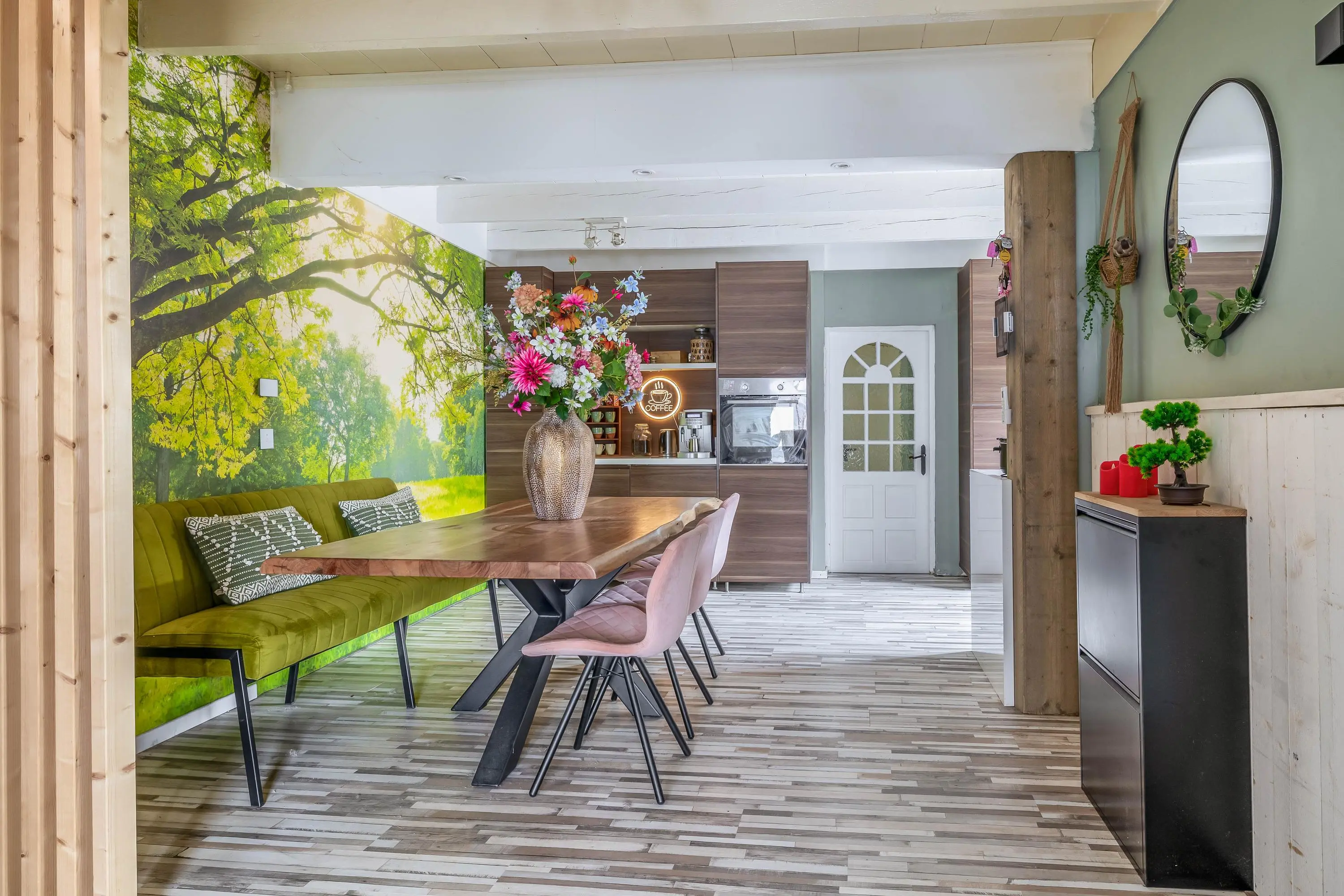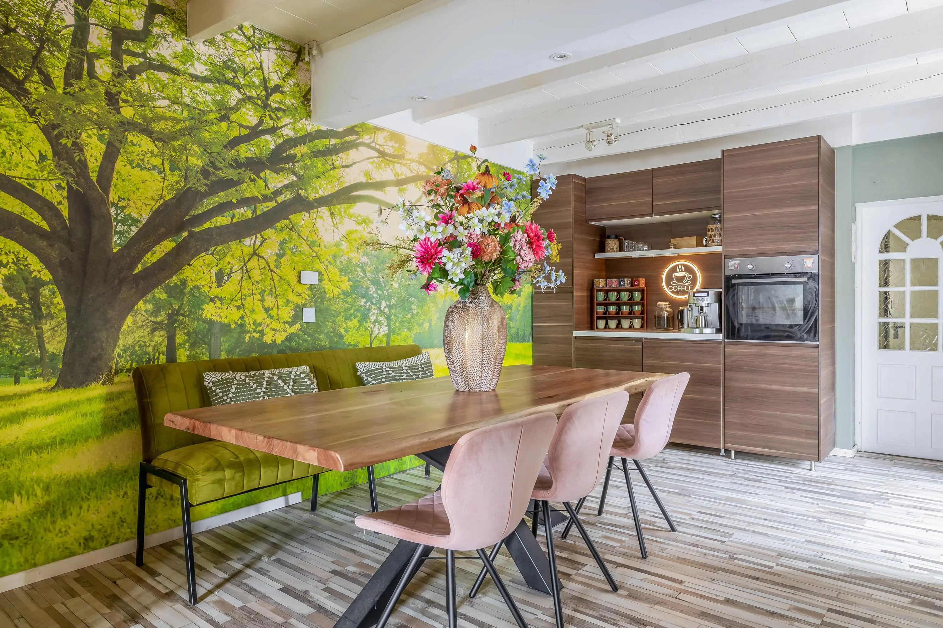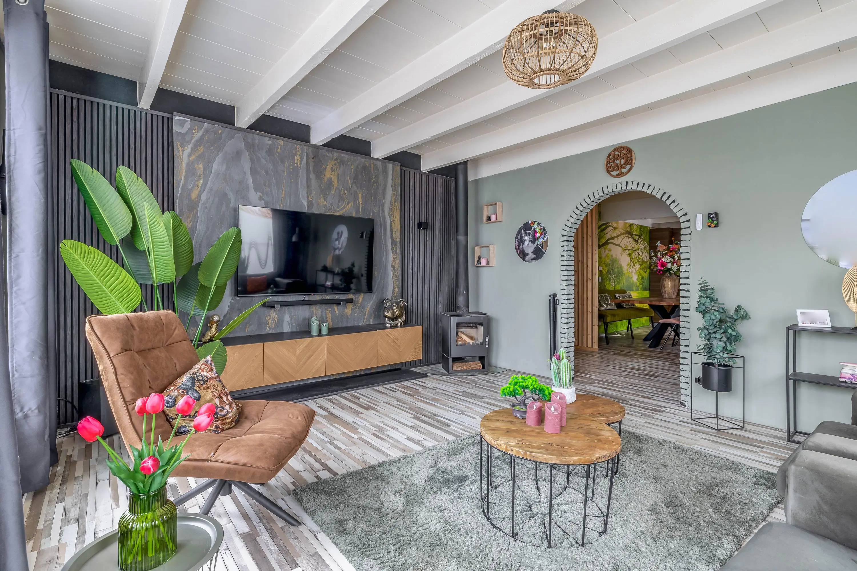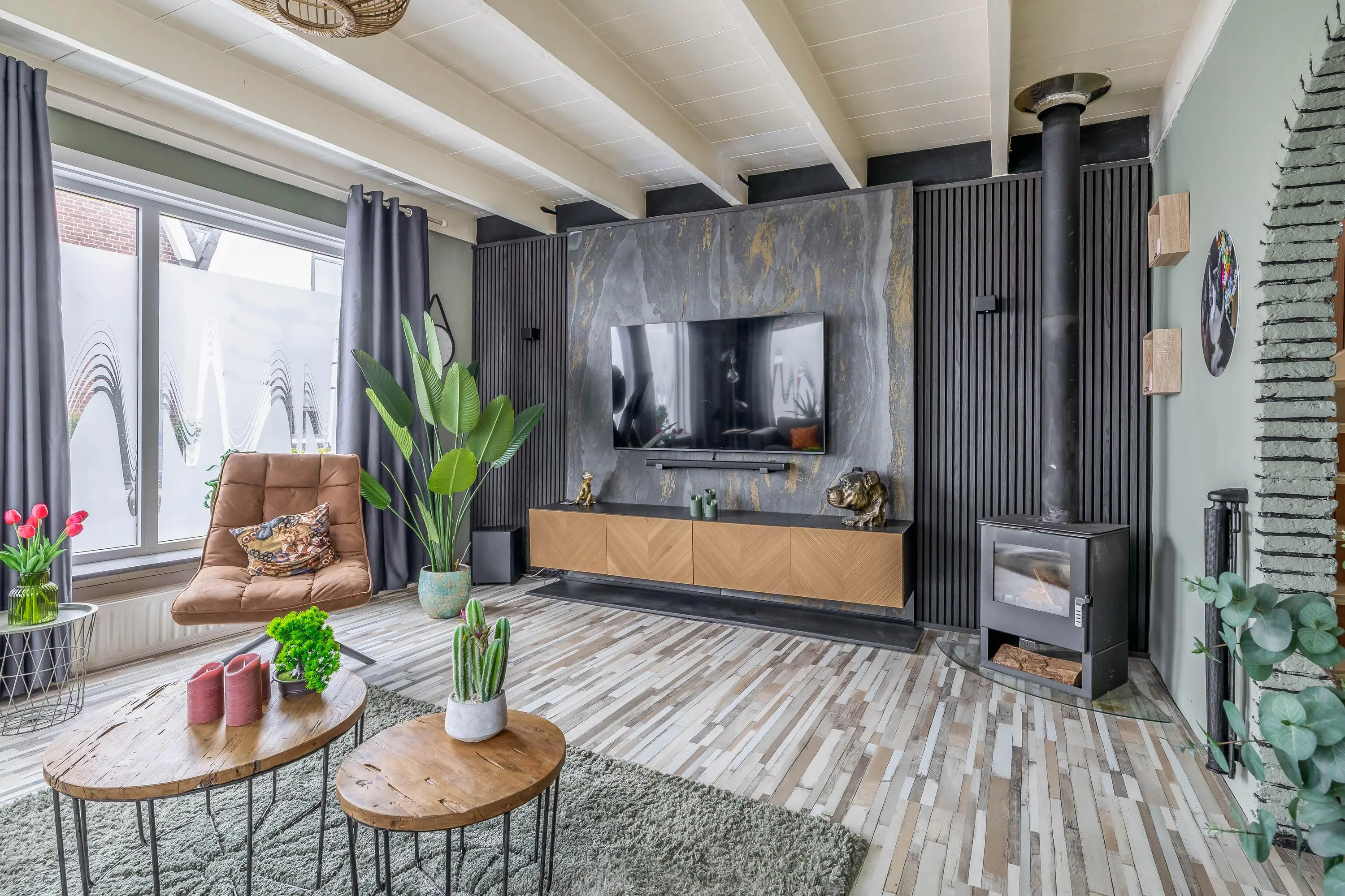 De living is licht en prettig ingedeeld. De combinatie van robuuste en moderne elementen zorgt voor een fijne leefruimte. De wand met houten latten en marmerlook panelen vormt een echte blikvanger, waarbij de houtkachel voor extra sfeer zorgt. De grote ramen zijn voorzien van screens, waardoor u de lichtinval eenvoudig kunt reguleren. Daarnaast is airconditioning aanwezig voor een aangenaam binnenklimaat. De toog vormt een sfeervolle overgang naar de keuken.