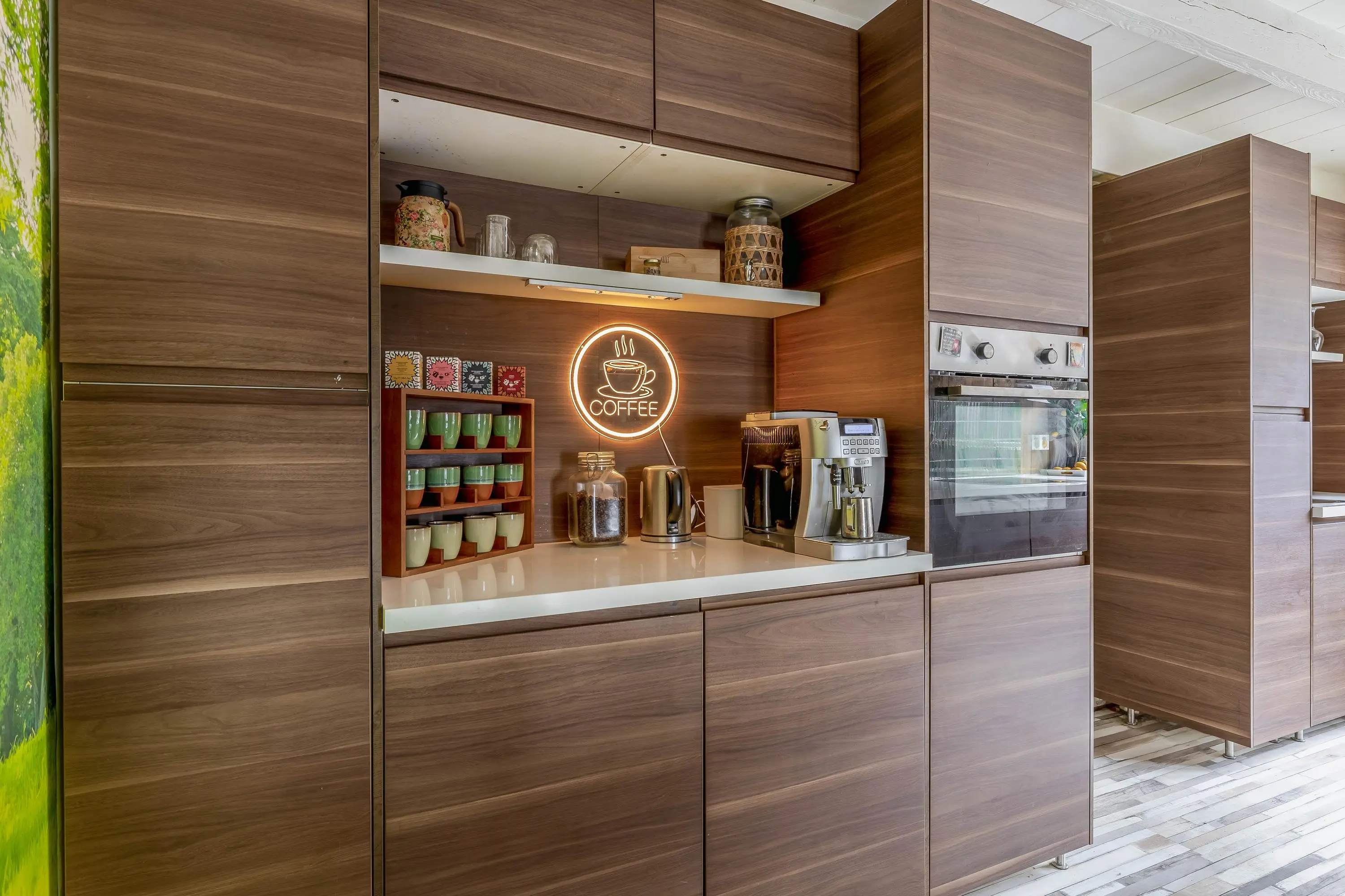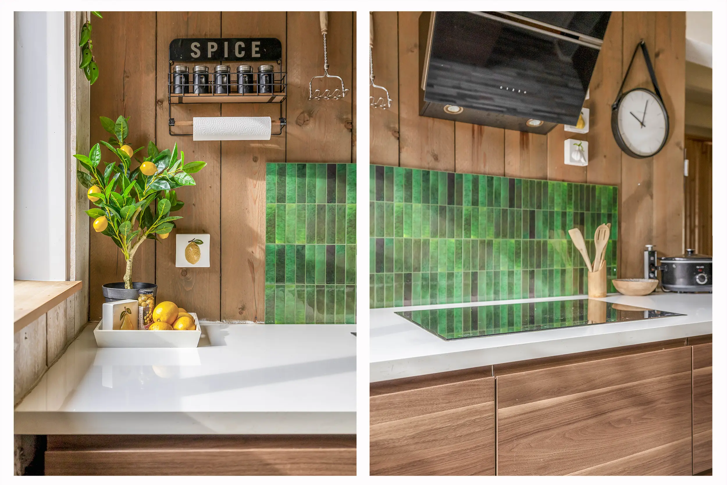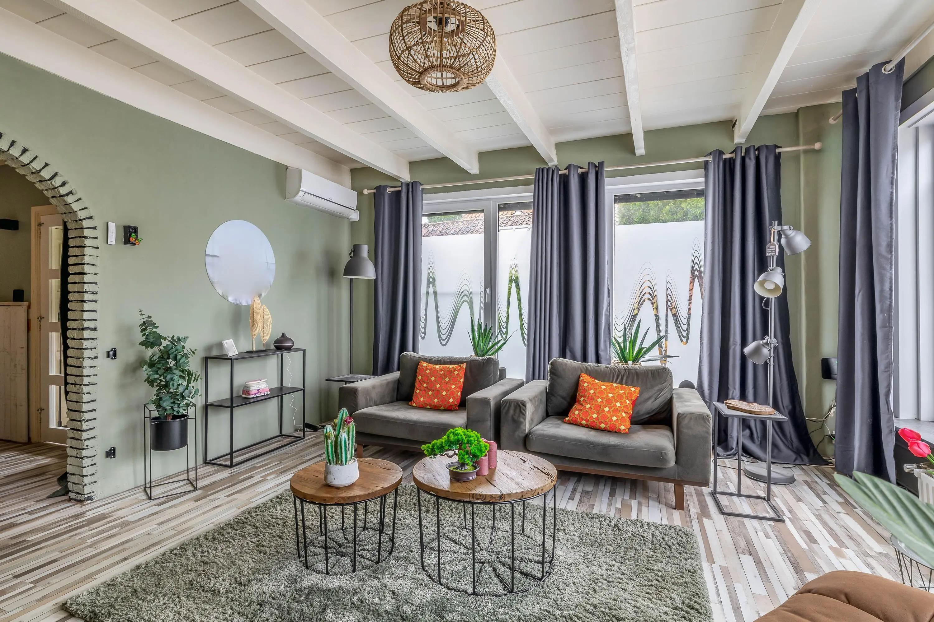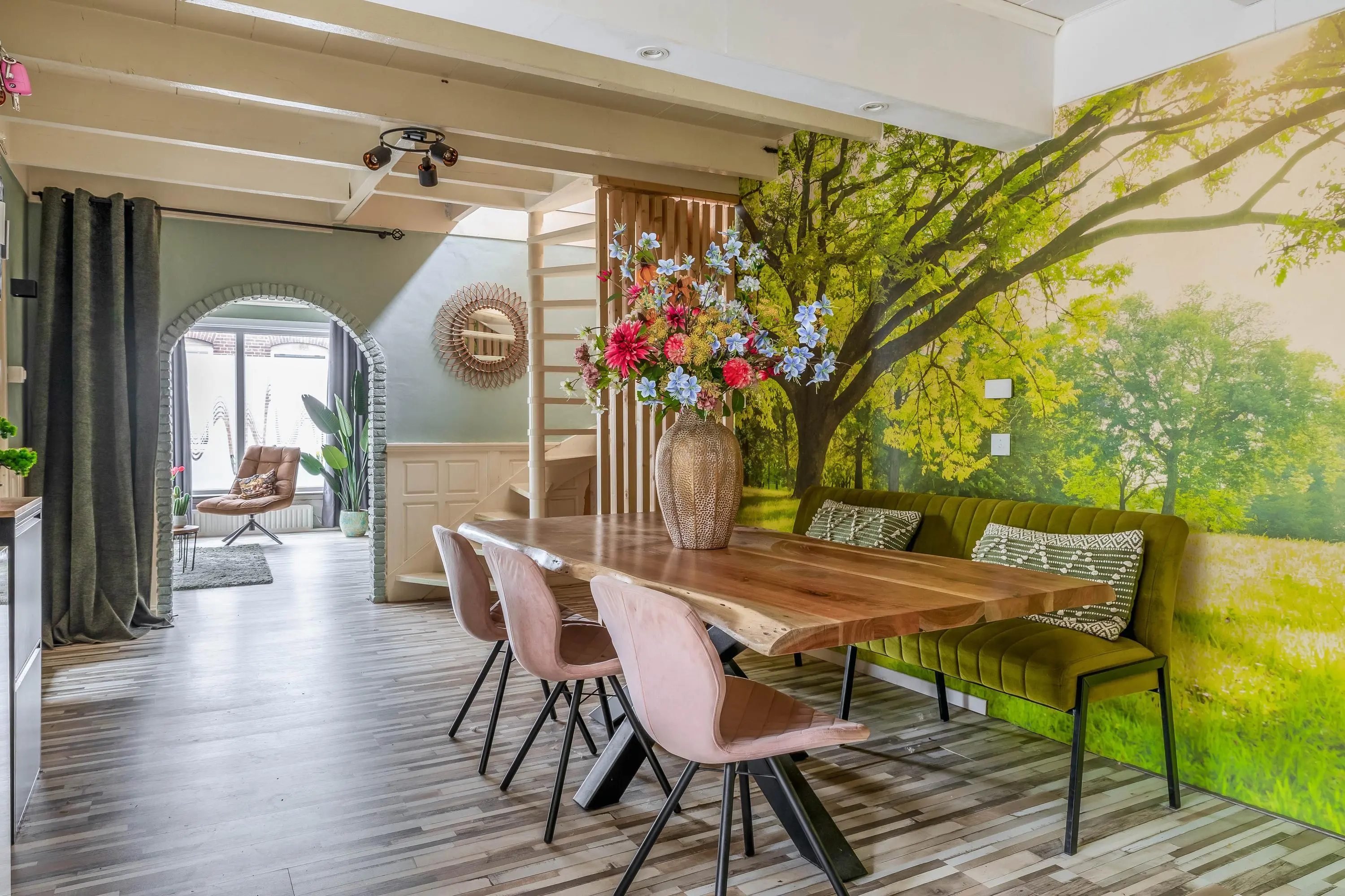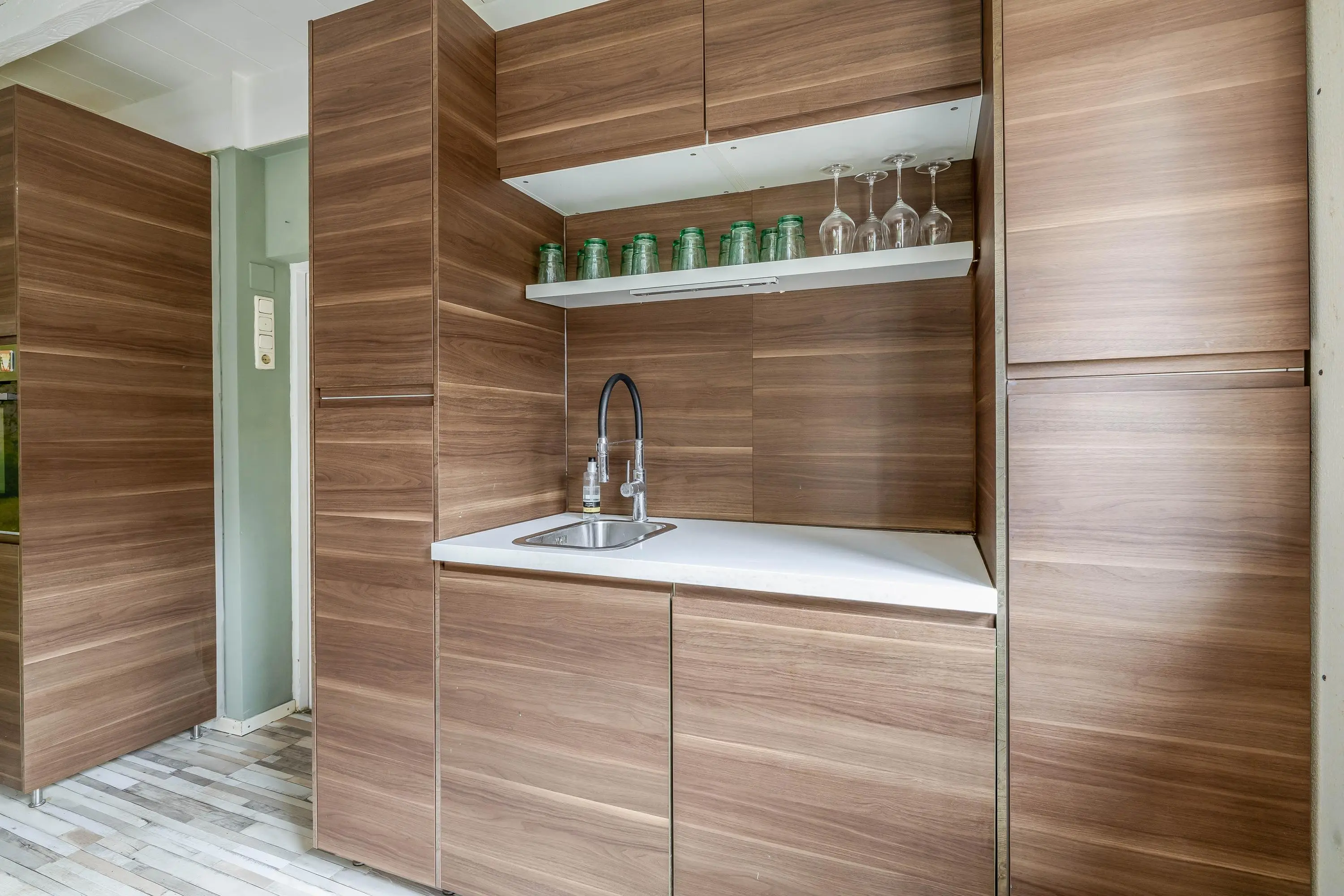 De living is licht en prettig ingedeeld. De combinatie van robuuste en moderne elementen zorgt voor een fijne leefruimte. De wand met houten latten en marmerlook panelen vormt een echte blikvanger, waarbij de houtkachel voor extra sfeer zorgt. De grote ramen zijn voorzien van screens, waardoor u de lichtinval eenvoudig kunt reguleren. Daarnaast is airconditioning aanwezig voor een aangenaam binnenklimaat. De toog vormt een sfeervolle overgang naar de keuken.