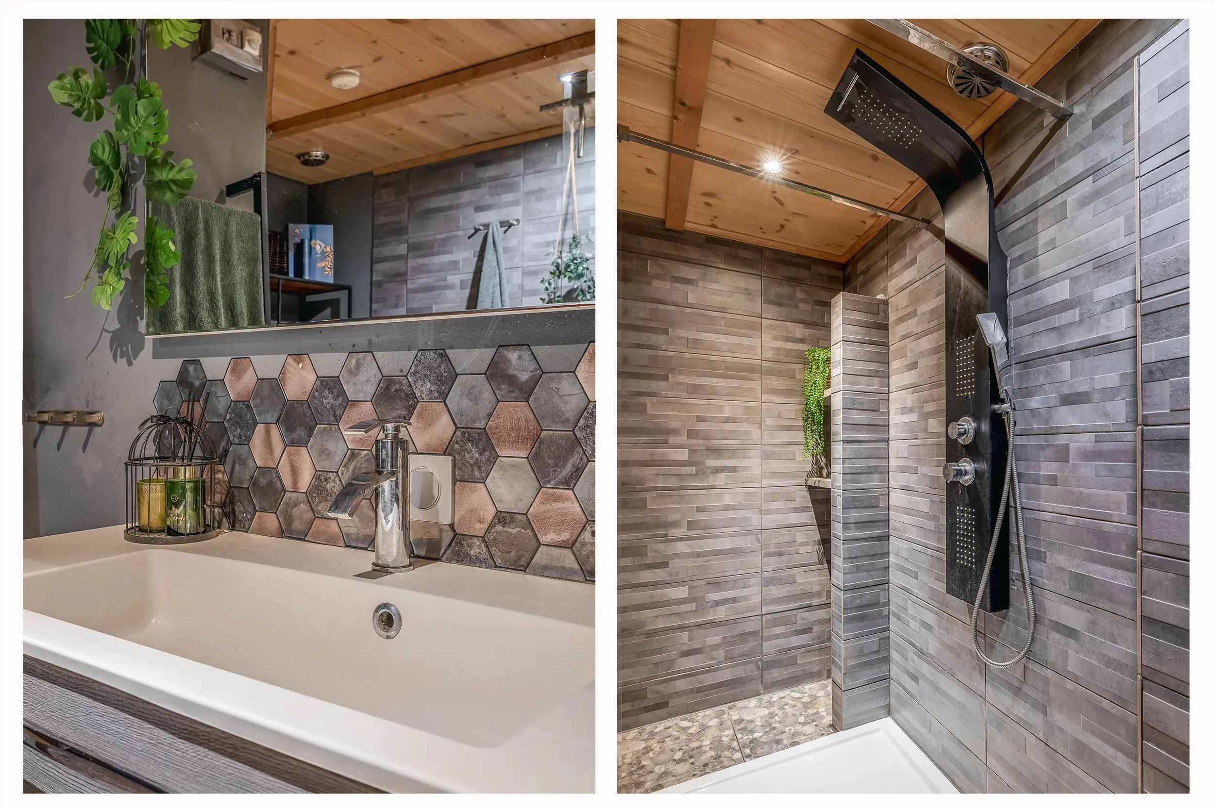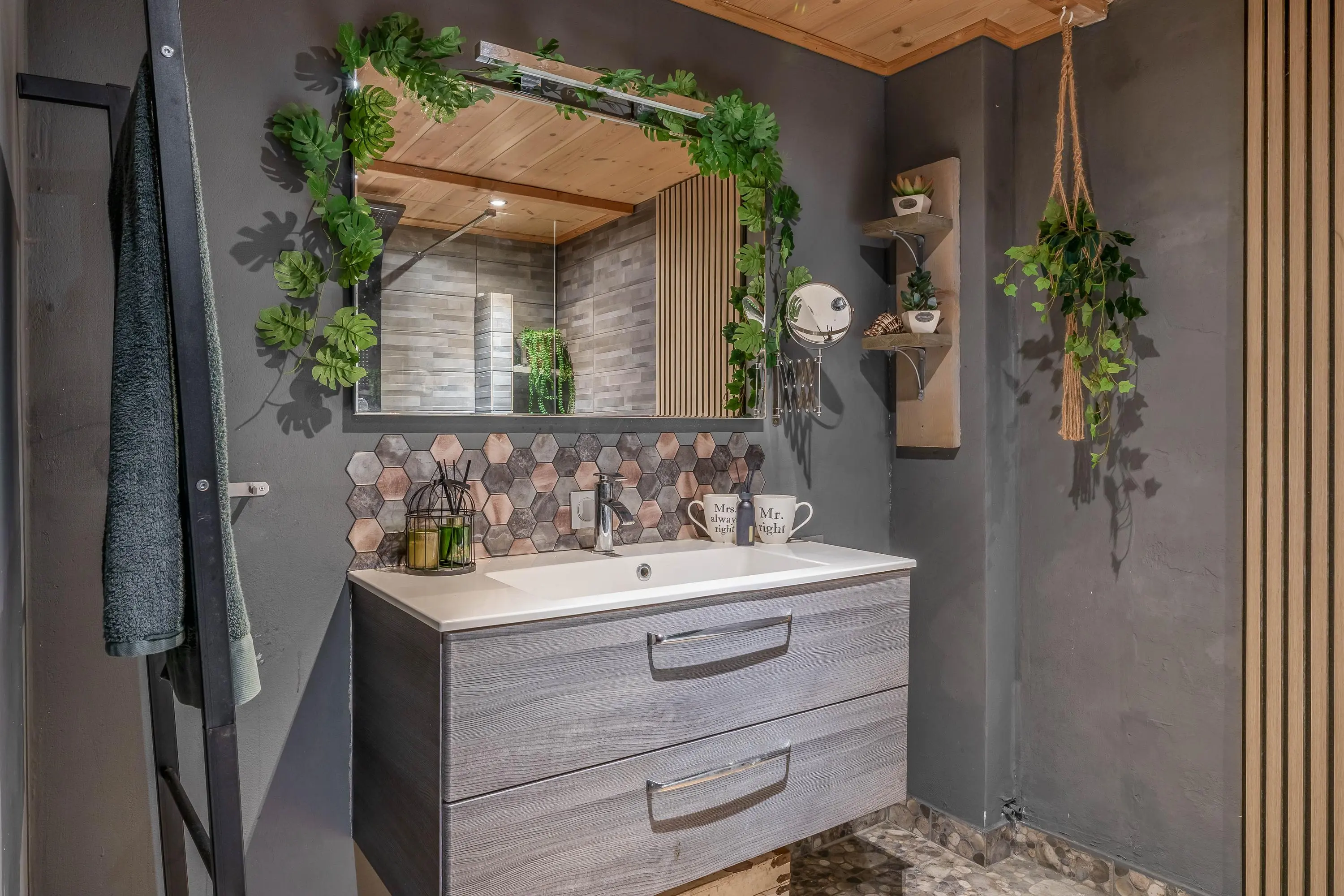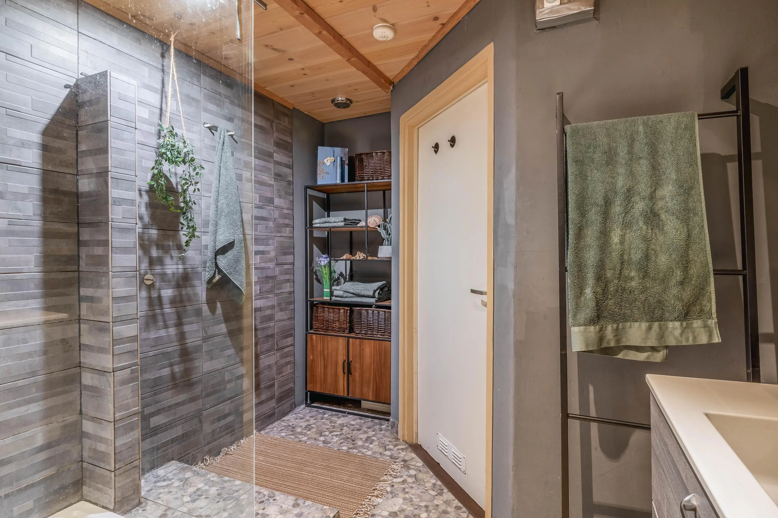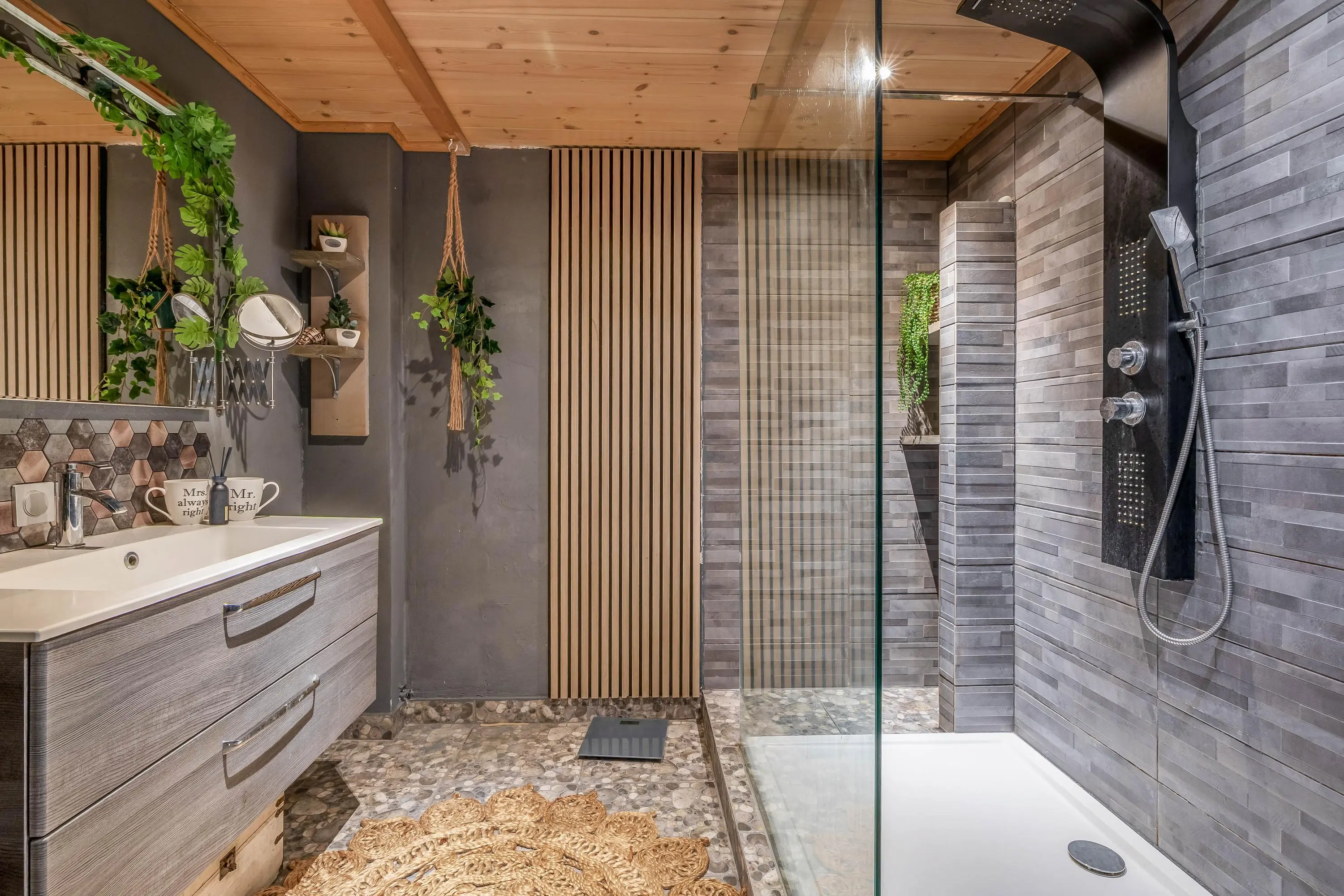 De badkamer is in 2019 vernieuwd en modern afgewerkt, met een ruime inloopdouche en een stijlvol wastafelmeubel.