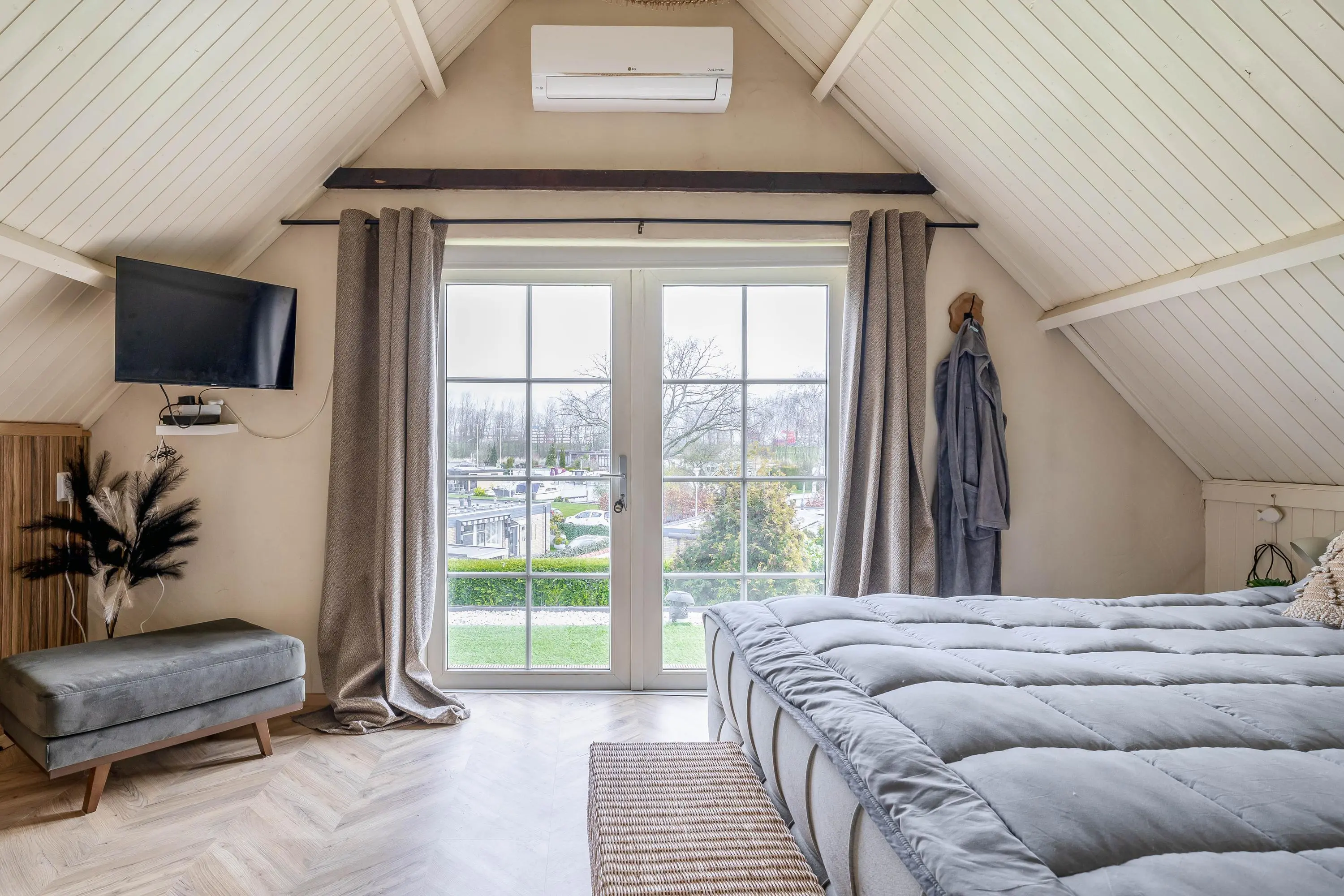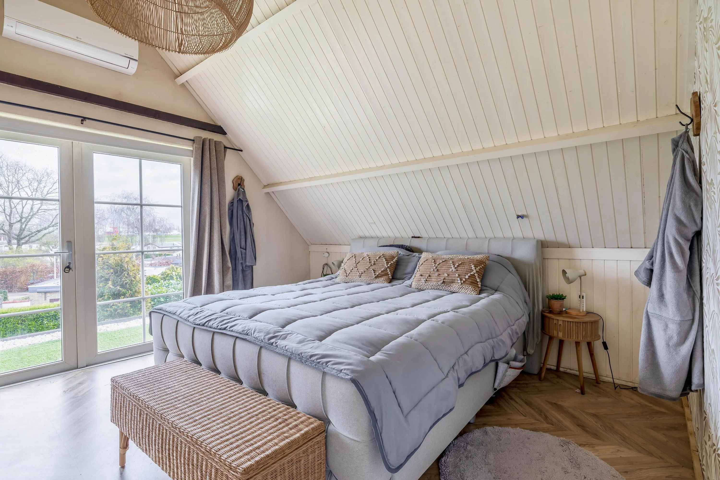 De hoofdslaapkamer van circa 19m² is gelegen aan de achterzijde en is verzorgd afgewerkt met strak gestucte wanden. De houten afwerking van de dak delen geeft de ruimte extra karakter. Via openslaande deuren (voorzien van een rolluik) is er toegang tot het dak vanwaar u een prachtig uitzicht over de haven heeft.