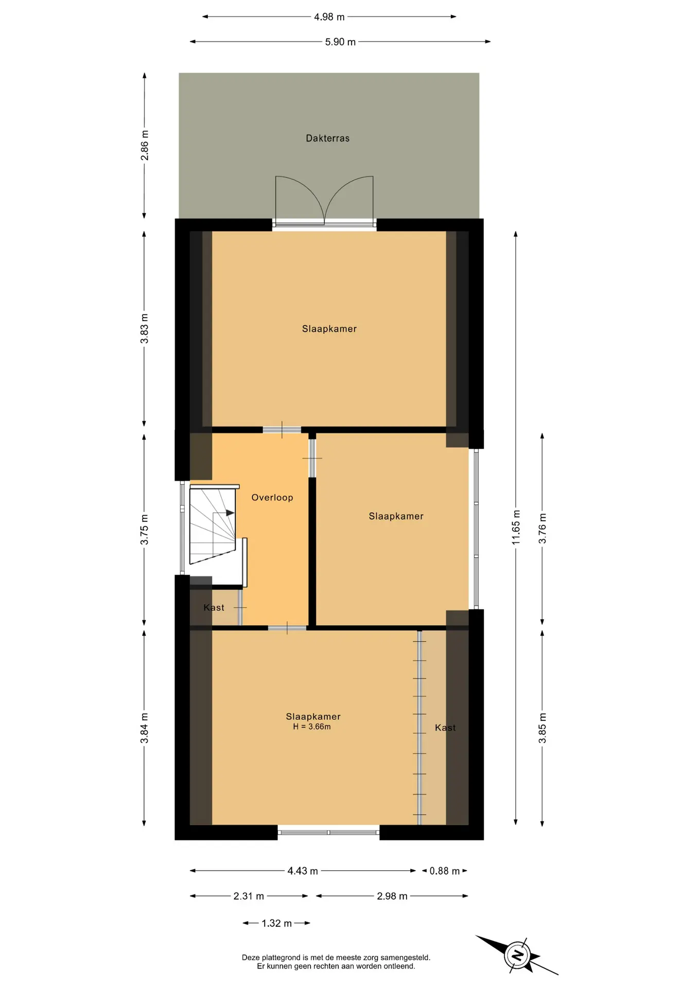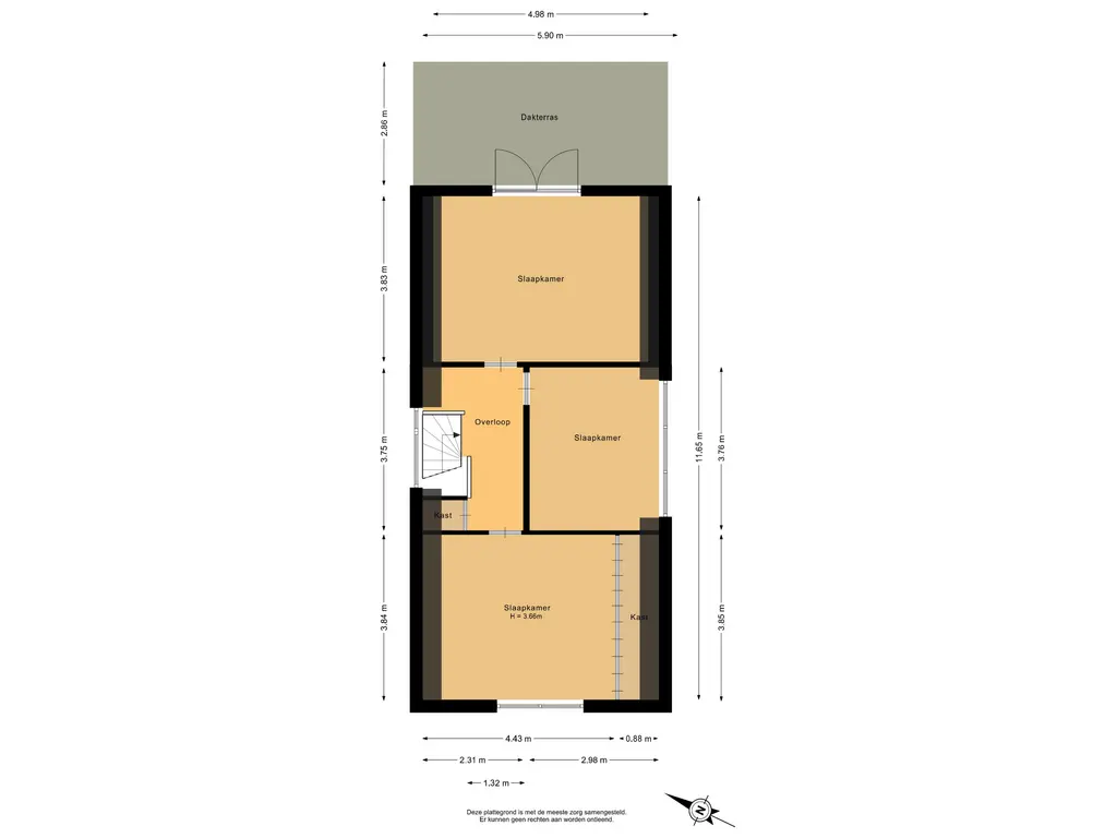 De tweede en derde slaapkamer zijn respectievelijk circa 17m² en 11m² groot. De kamer aan de voorzijde (circa 17m²) is voorzien van vloerbedekking en beschikt over een praktische inbouwkast. De derde slaapkamer is vergroot middels een dakkapel.