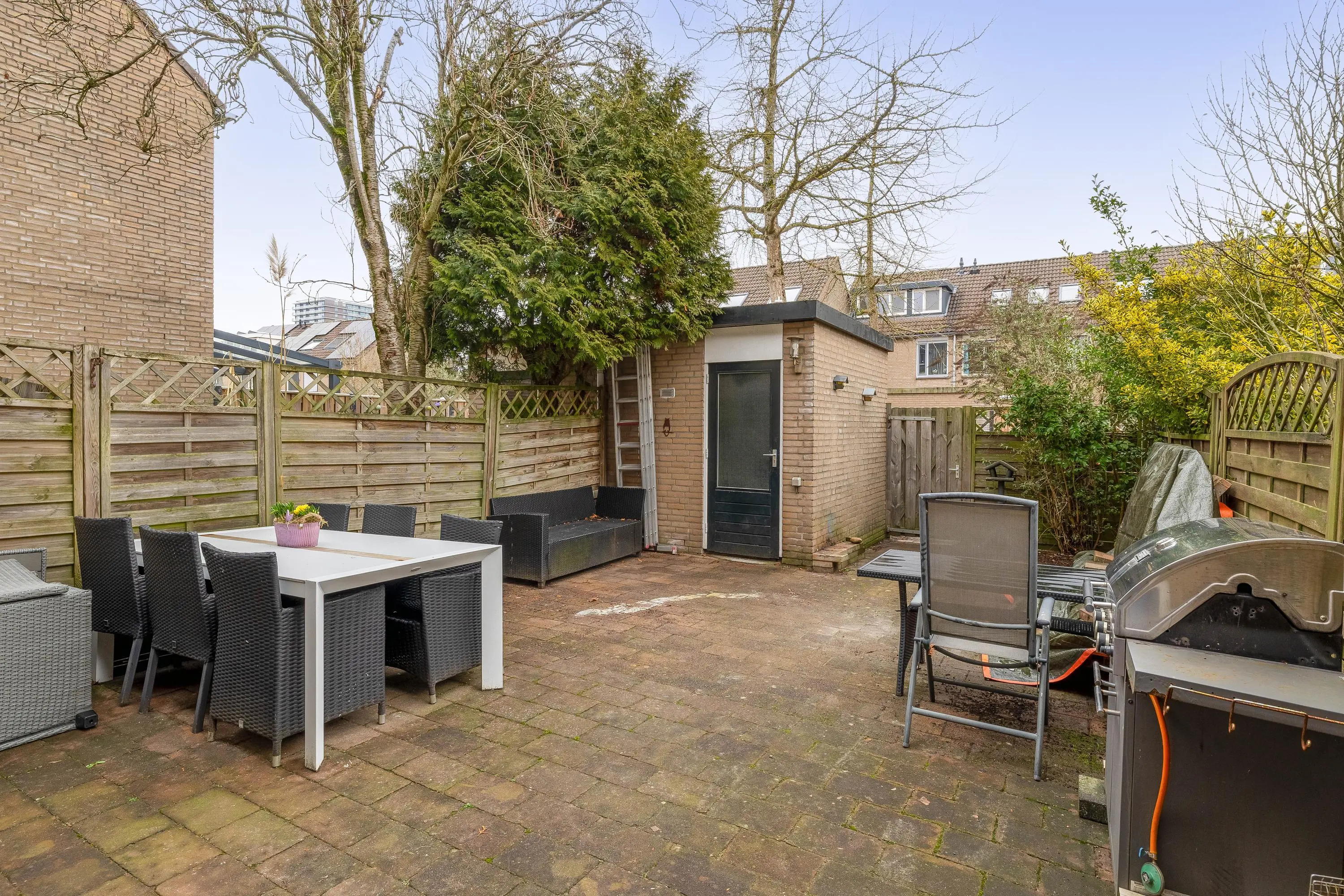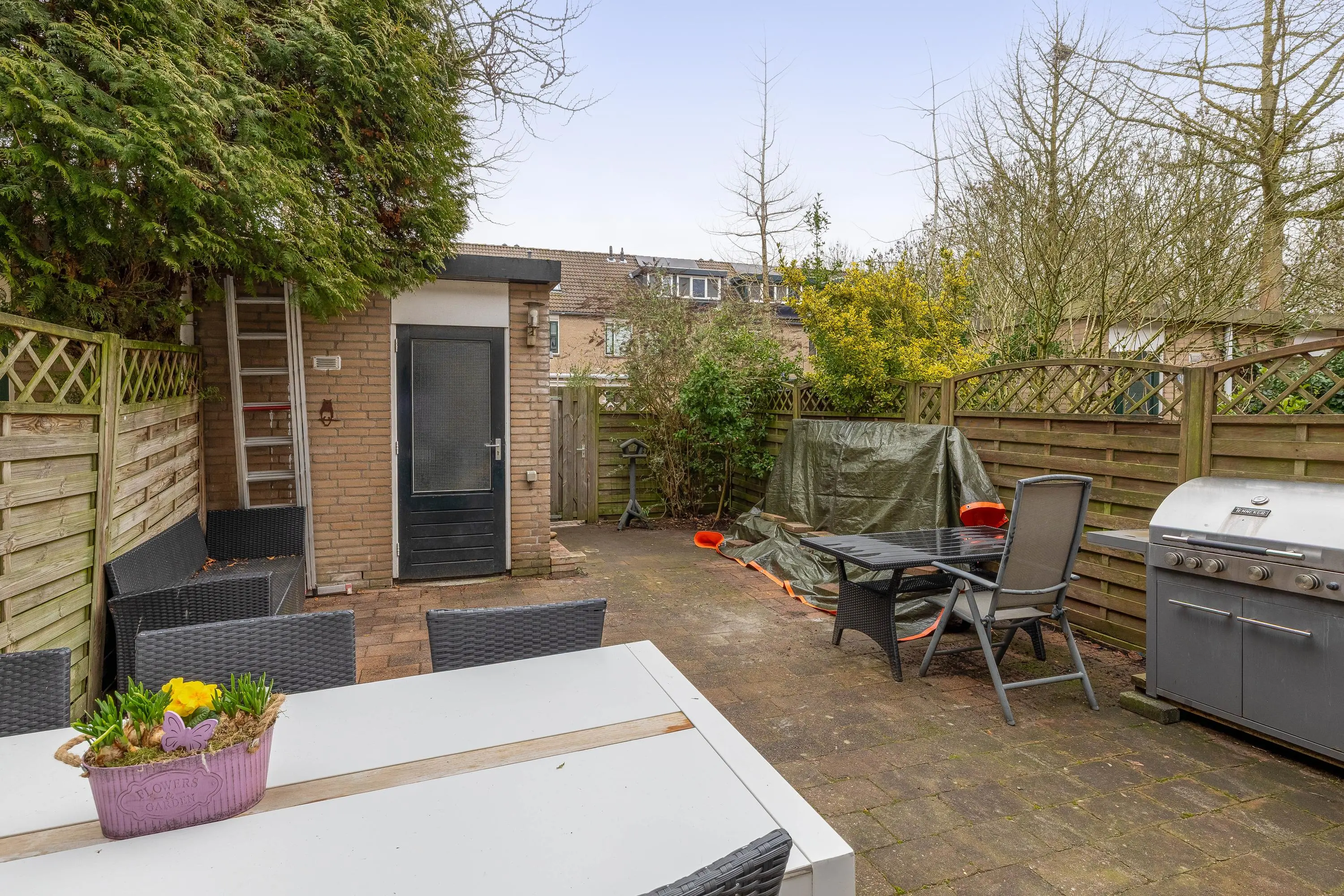 De voortuin is gelegen op het westen en geeft dus de mogelijkheid om te genieten van de avondzon. Momenteel is deze betegeld en dus goed te gebruiken als terras, hier is natuurlijk ook groen aan toe te voegen. De achtertuin is gelegen op het oosten. Hier zijn ook talloze mogelijkheden voor de liefhebber van een stukje natuur in de stad. Tevens is er een losse berging aanwezig, ook is er een achterom bij de tuin te vinden.