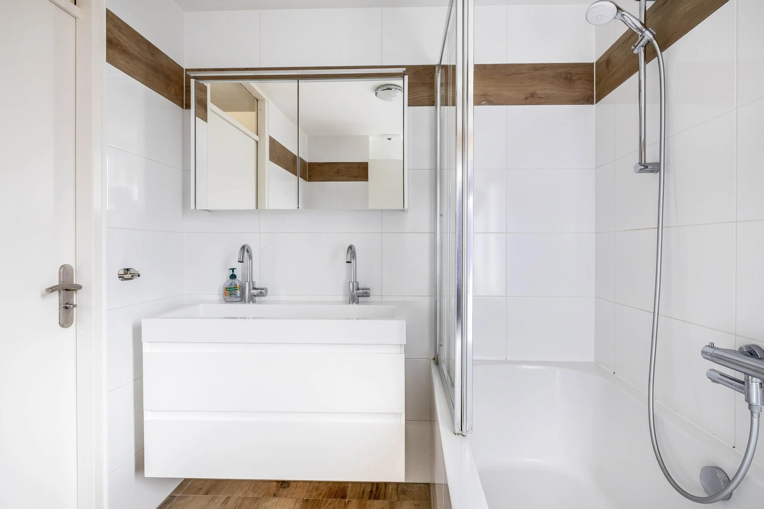 De opkomst op de eerste etage is op de overloop. Aan de achterzijde bevinden zich 2 ruime slaapkamers met beide veel natuurlijk lichtinval. De 3e kamer is aan de voorzijde gelegen, naast de badkamer. De badkamer is voorzien van een toilet, dubbele wastafel met meubel en een ligbad met douchefunctie.
