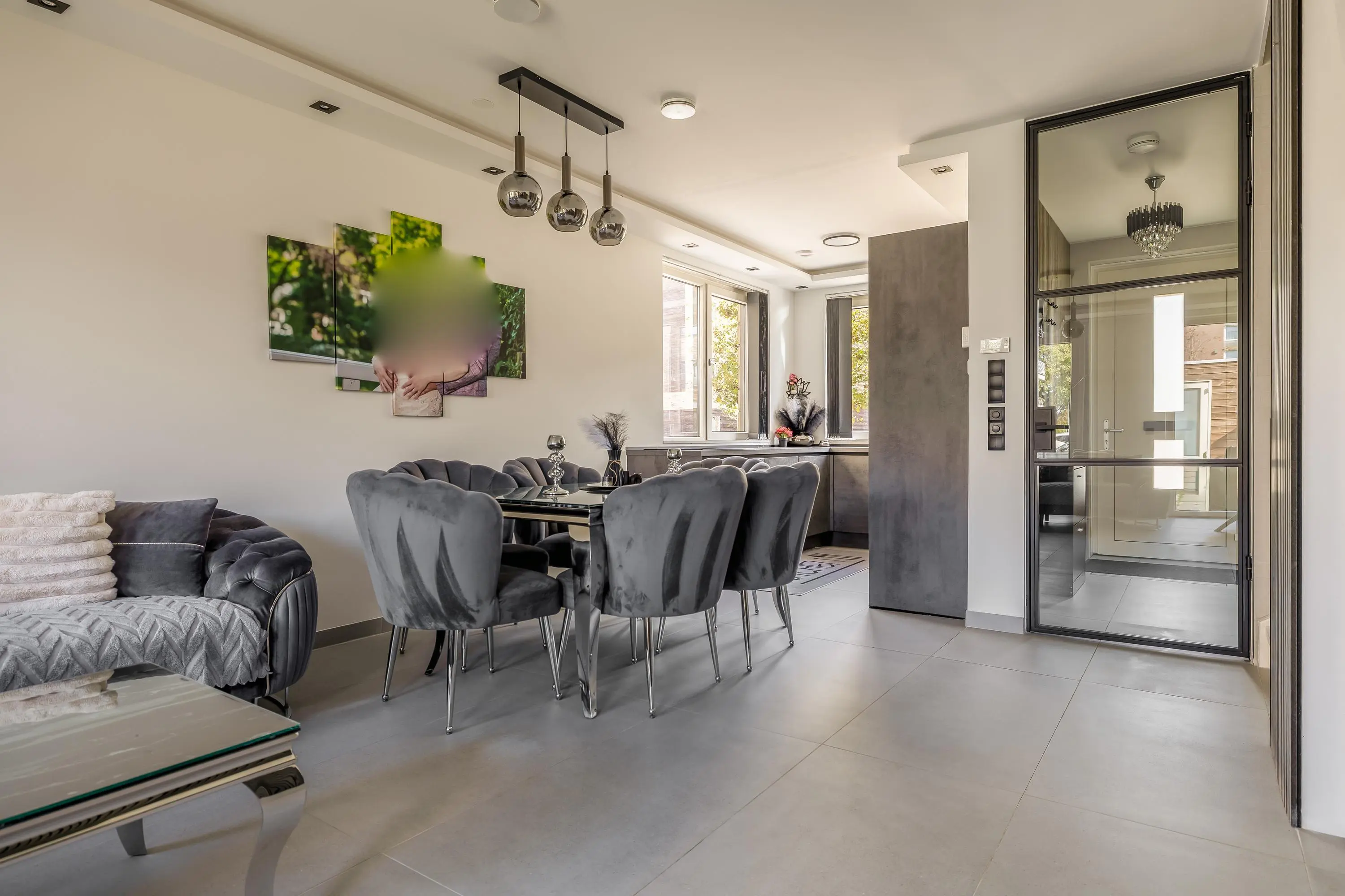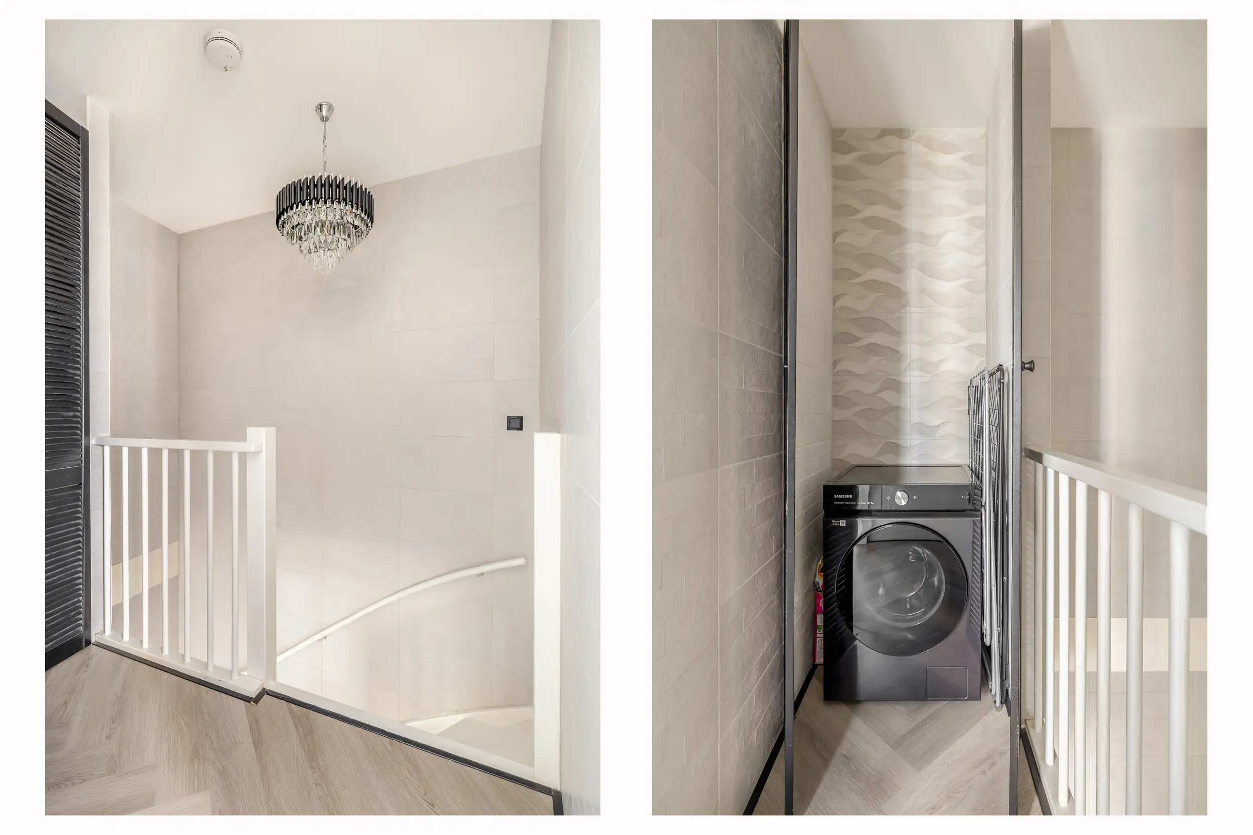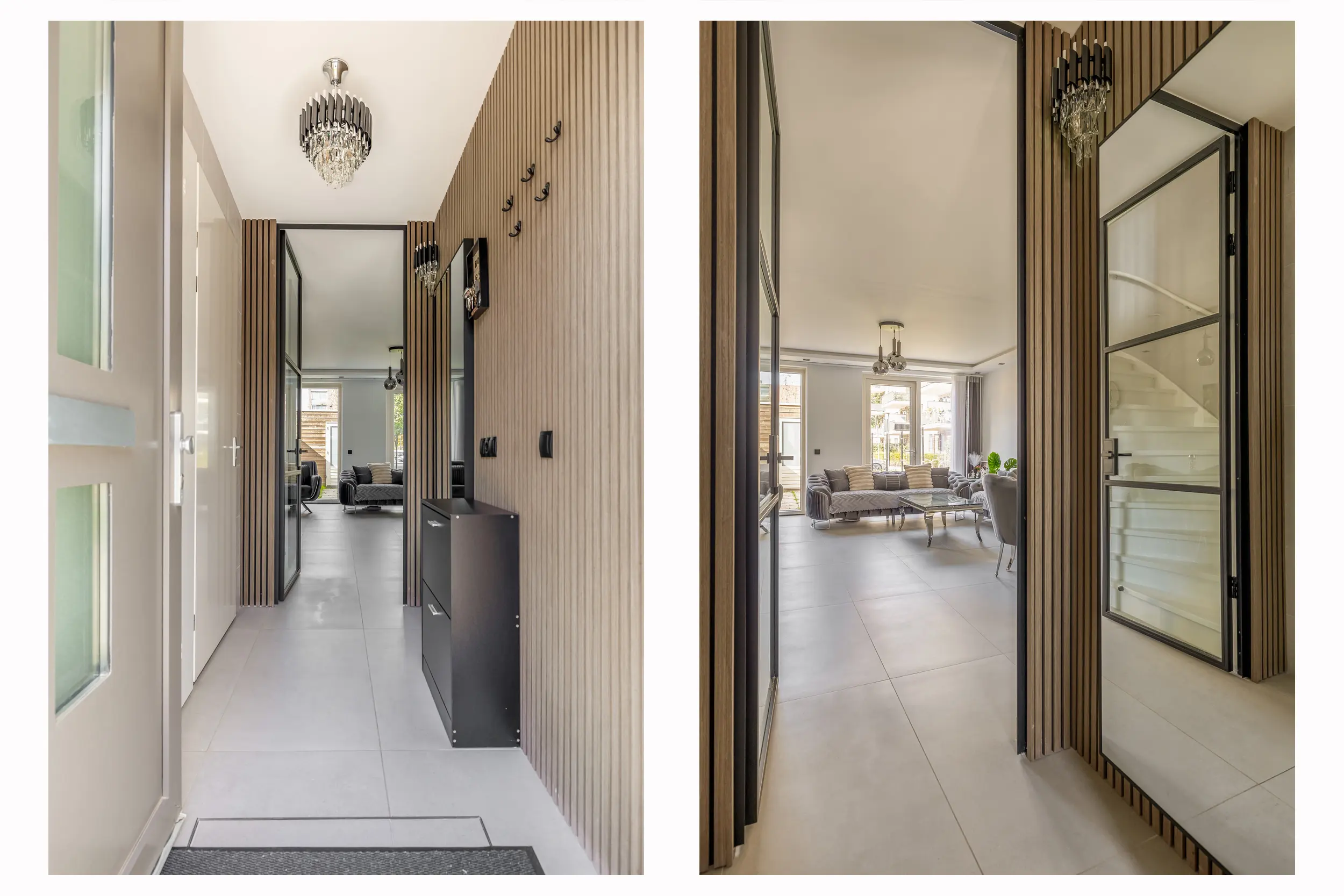 Bij binnenkomst van deze moderne woning stap in de ruime, verzorgde hal. Hier proeft u gelijk de sfeer en het moderne afwerkingsniveau van de hele woning. De hal is voorzien van het toilet met fonteintje, de meterkast en een vaste kast met de opstelling van de warmtepomp.
