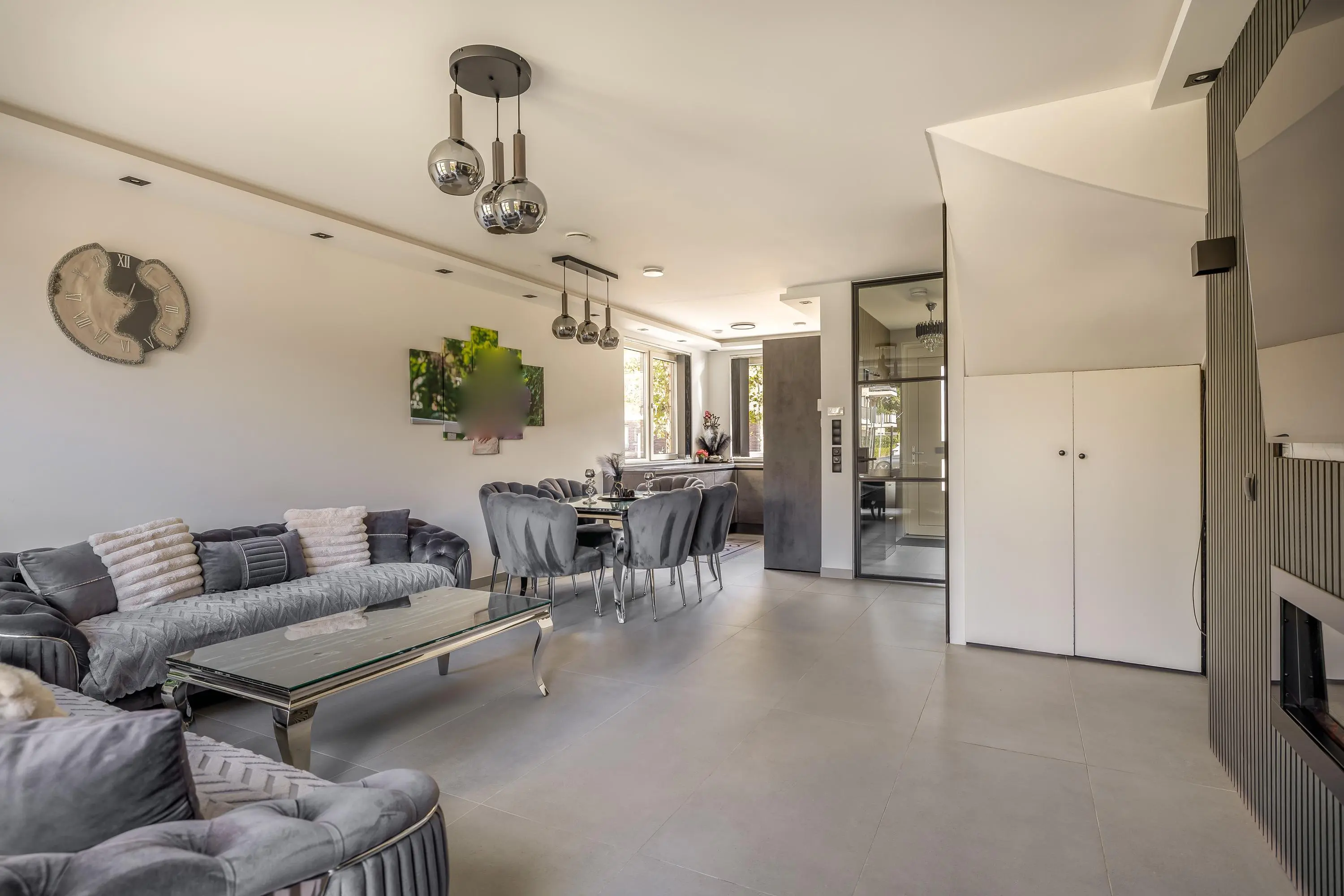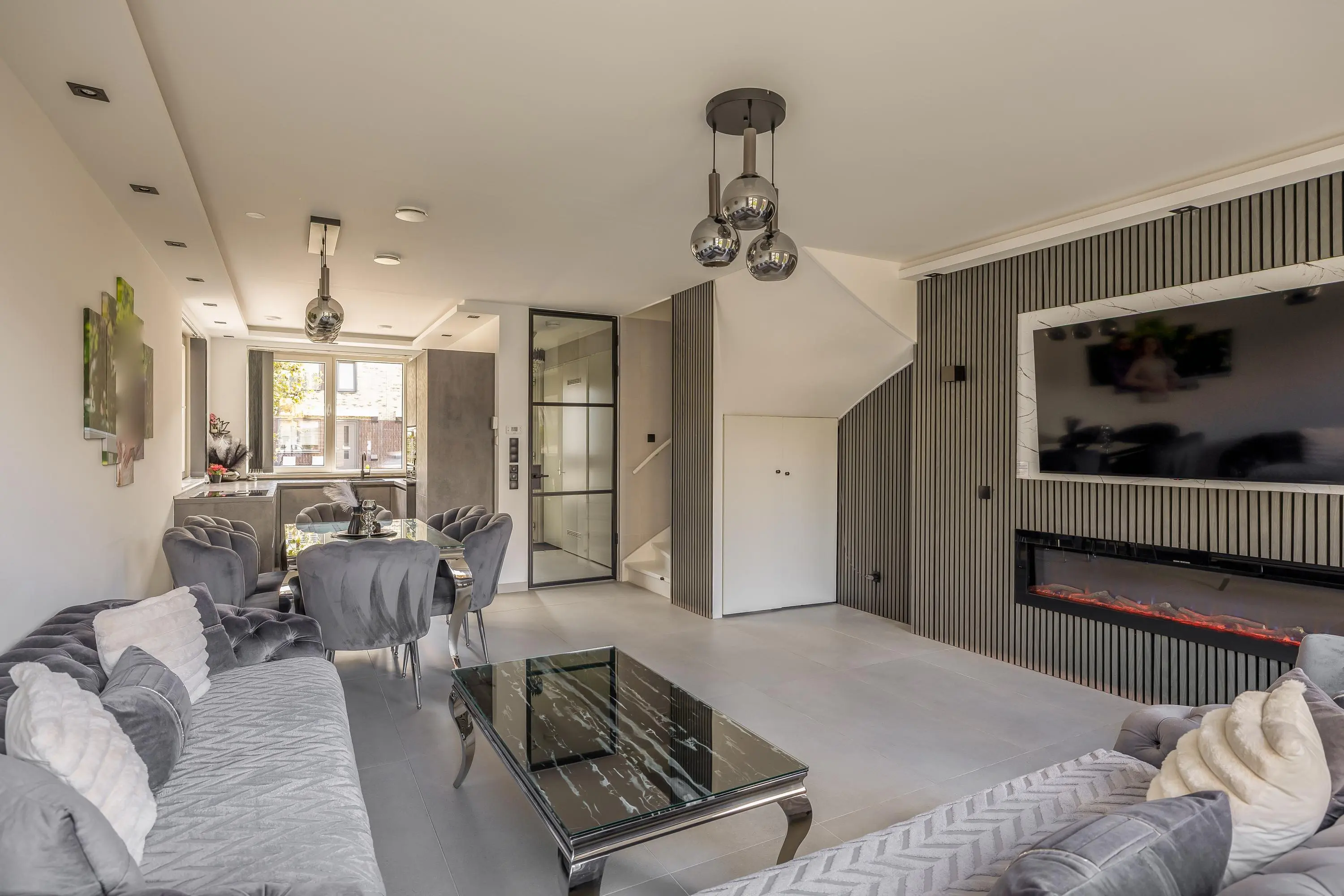 De ruime, tuingerichte woonkamer is aangenaam licht en voorzien van een strakke afwerking en beschikt over een prachtige cinewall met sfeervolle haard. Hier is ook de trapopgang en een handige trapkast aanwezig. Verder is er toegang tot de achtertuin en vindt u aan de voorzijde de fraaie open keuken.