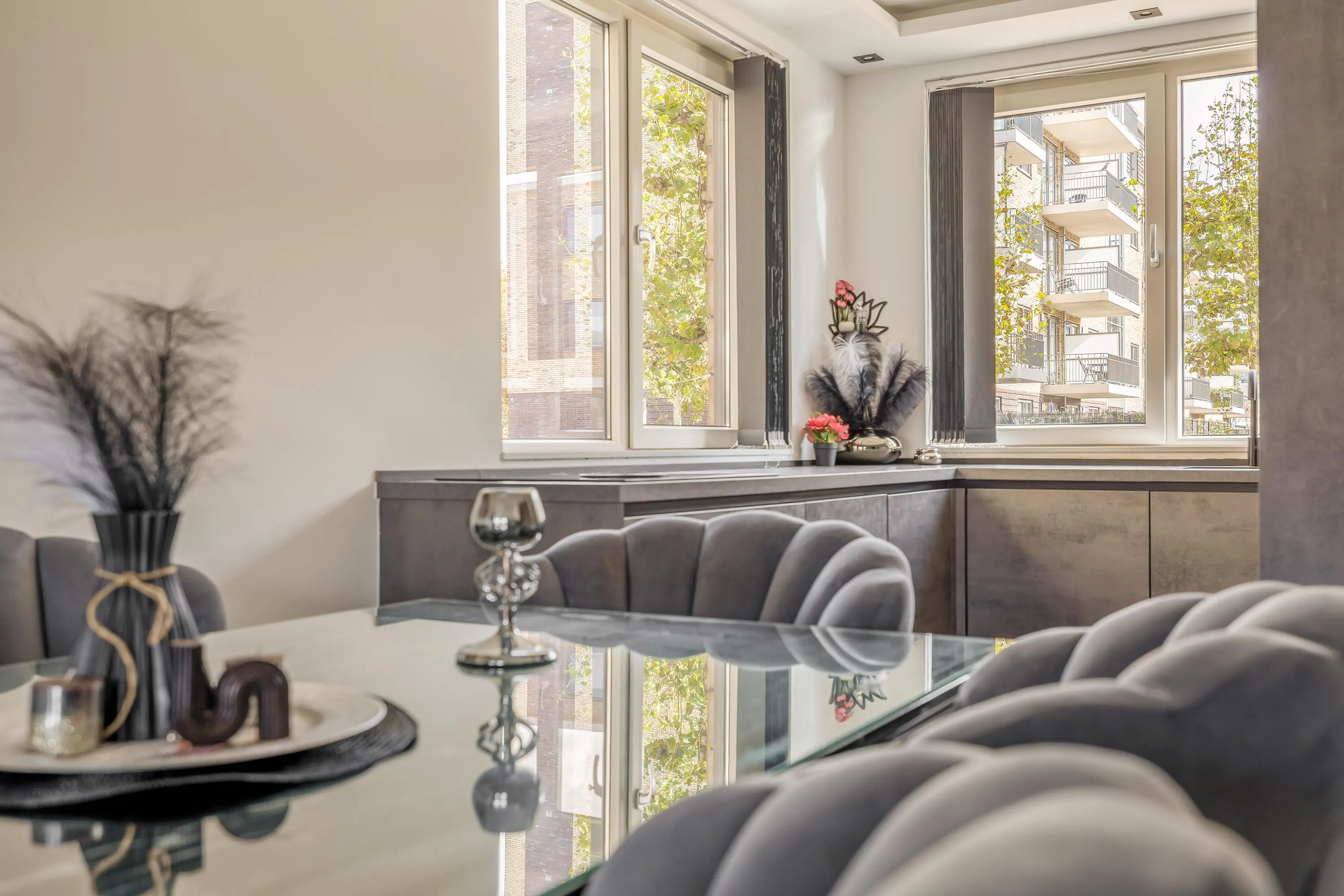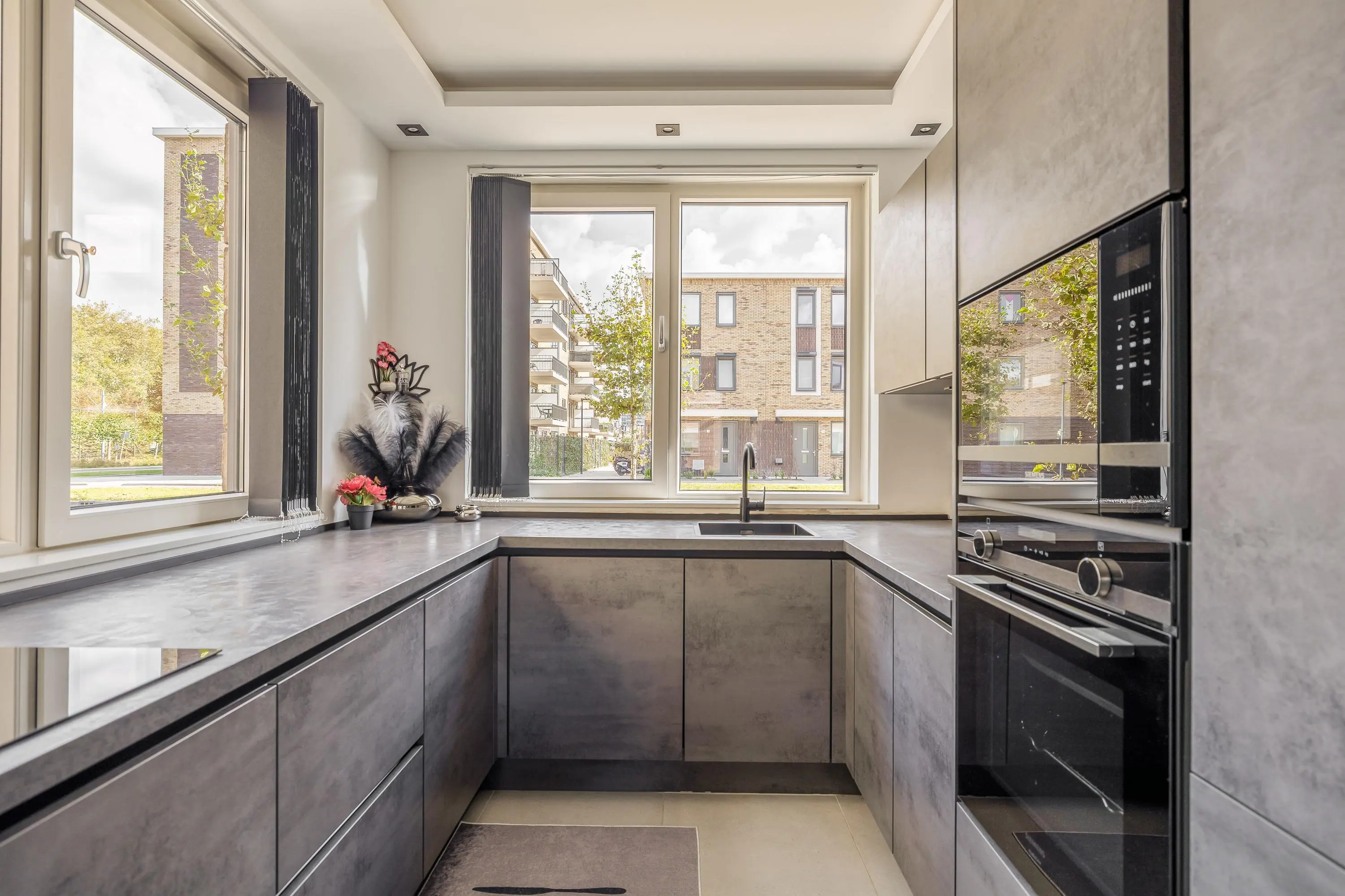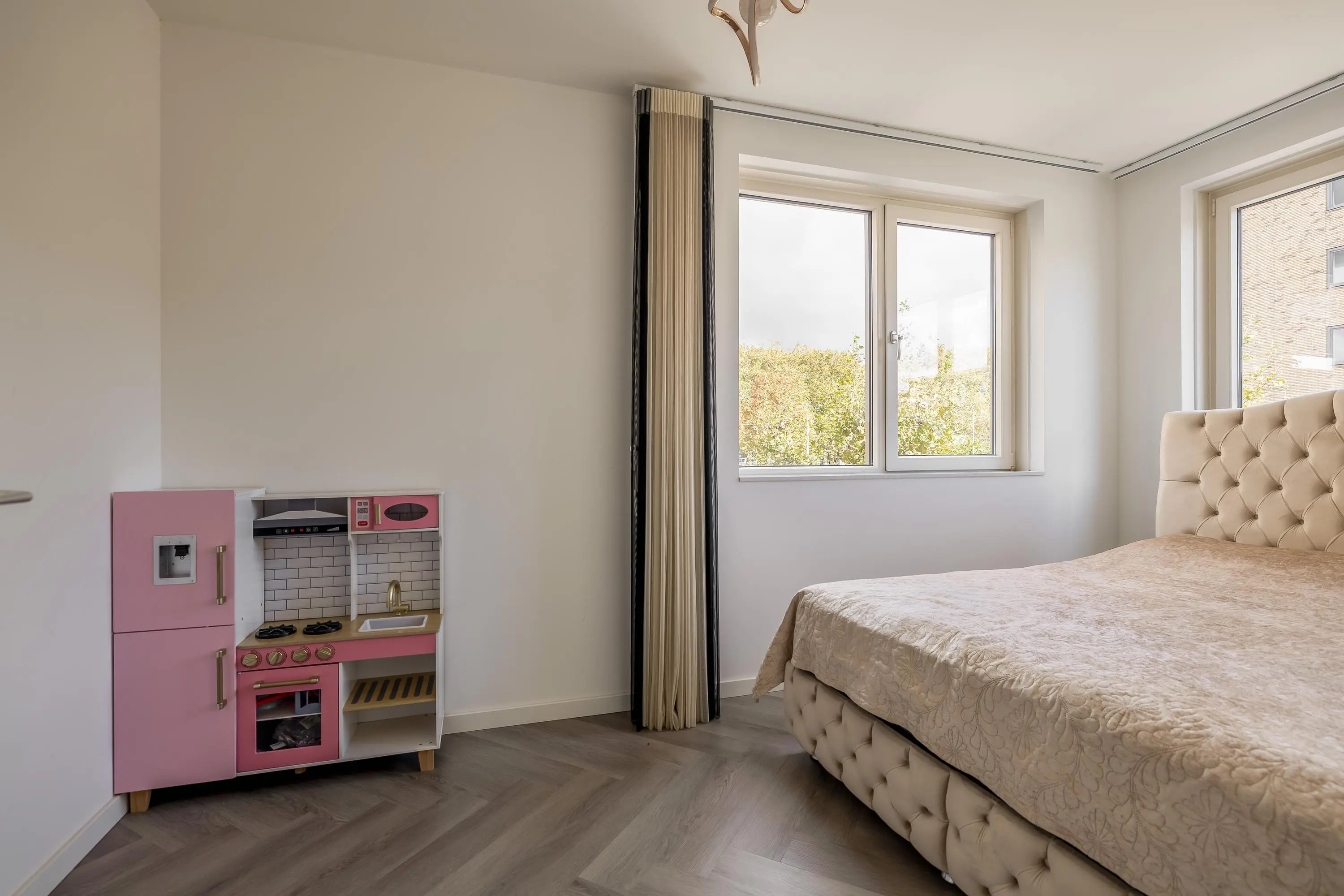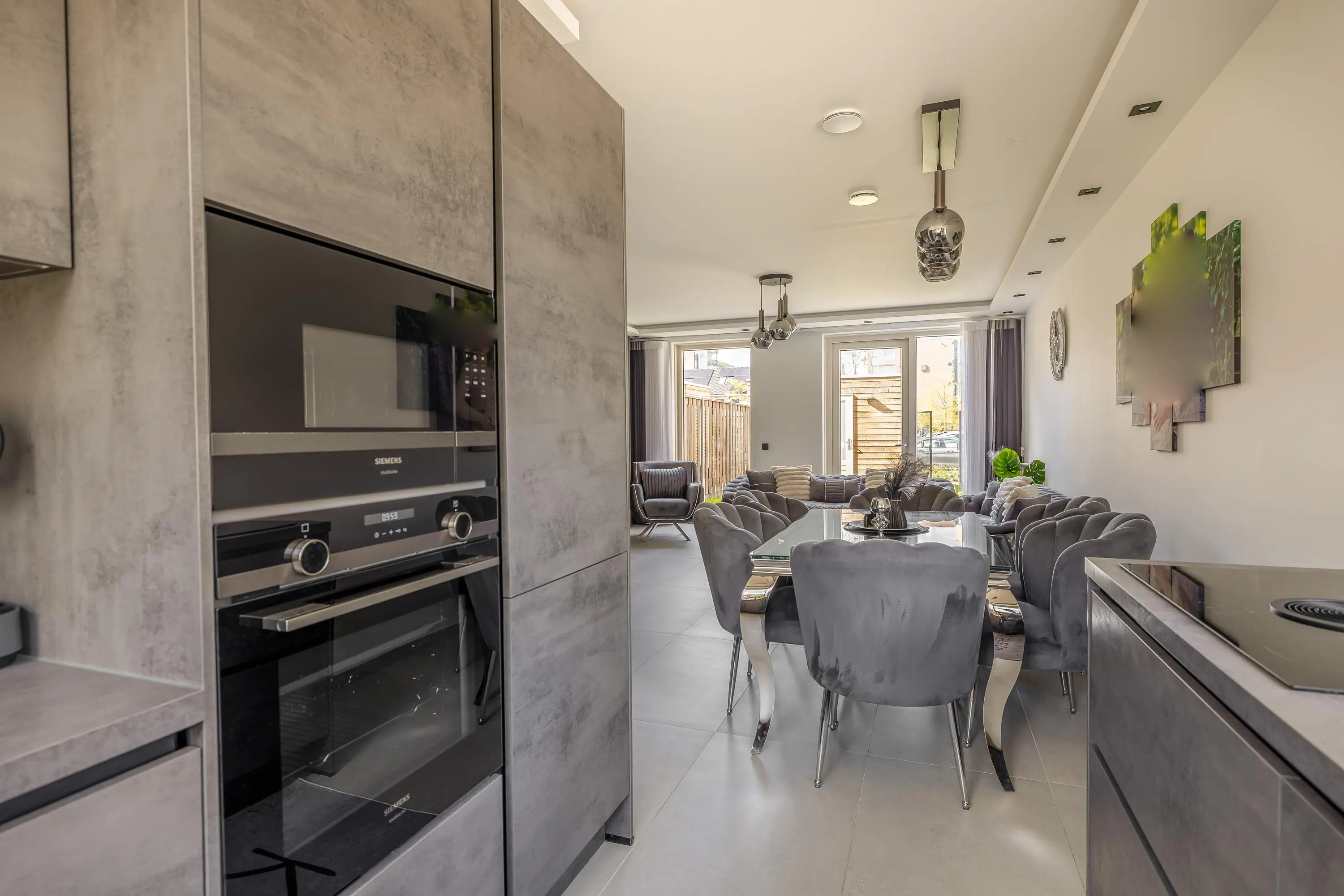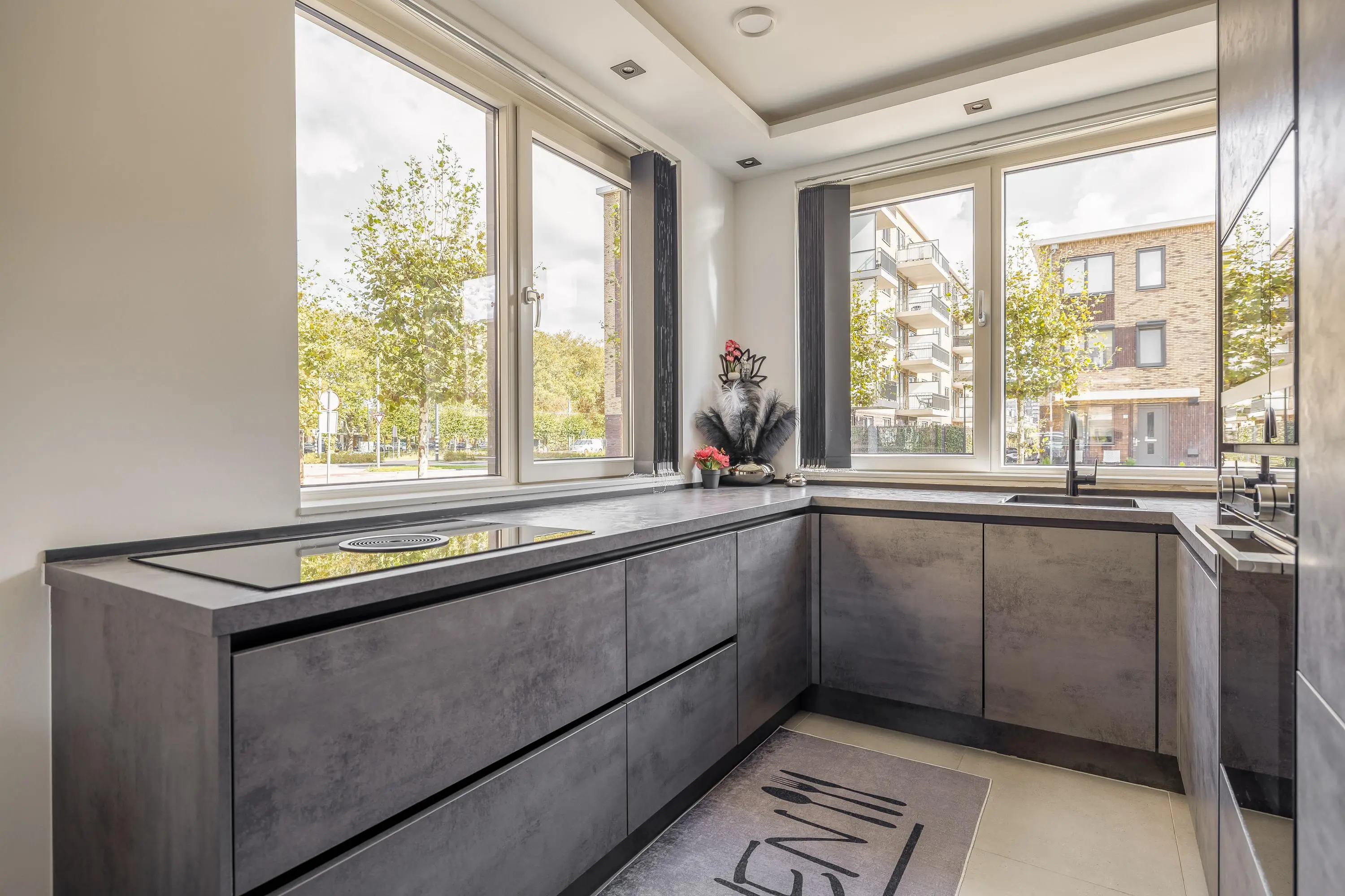 De moderne keuken aan de voorzijde van het huis beschikt over vier ramen waardoor je uitzicht op de straat heb tijdens het koken en waardoor er veel natuurlijk licht naar binnen komt. Naast voldoende werkblad en kastruimte bestaat de keuken onder andere uit een Bora inductie kookplaat met downdraftafzuiging, oven, magnetron, koel-/vriescombinatie en een vaatwasmachine.