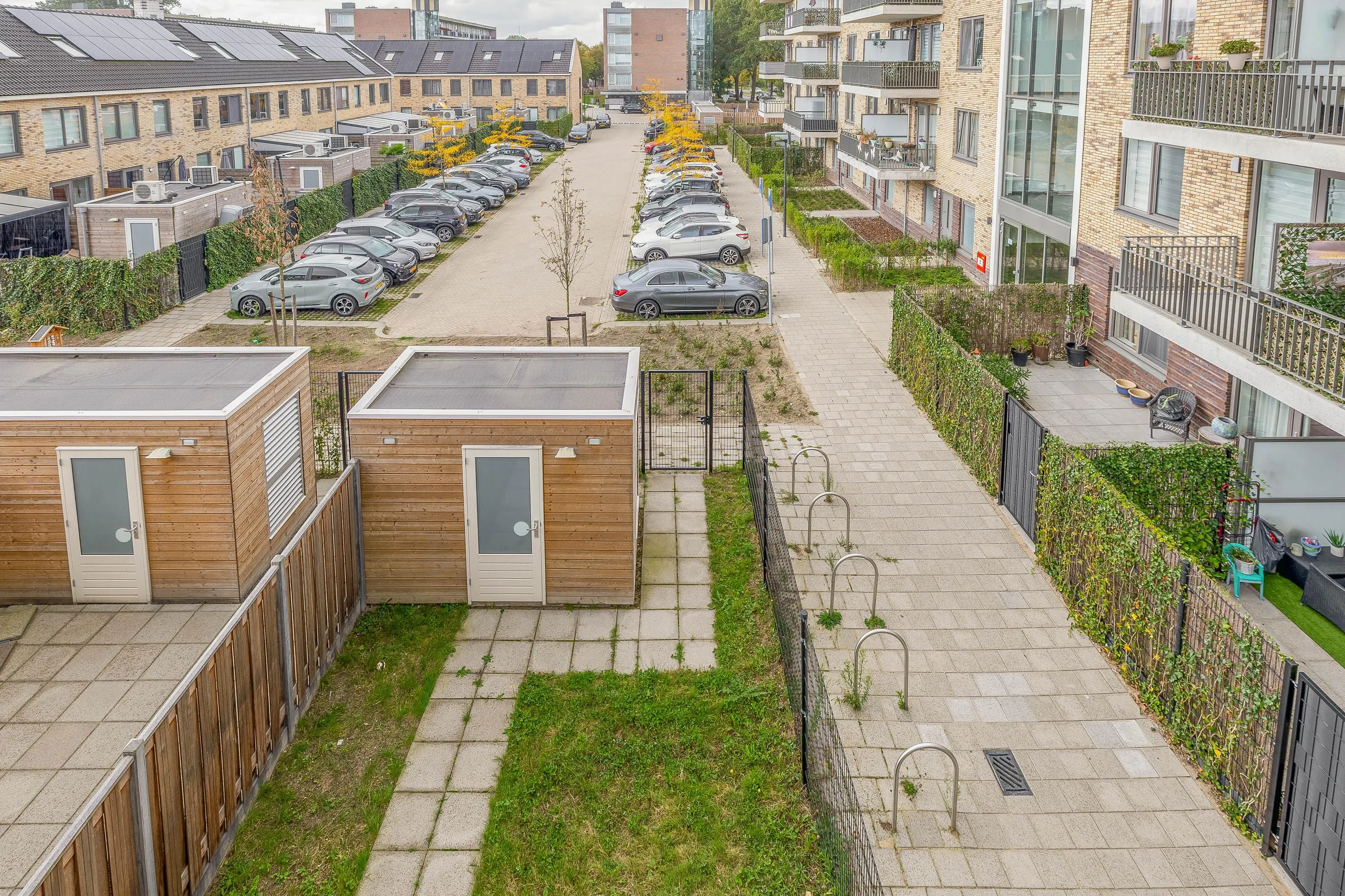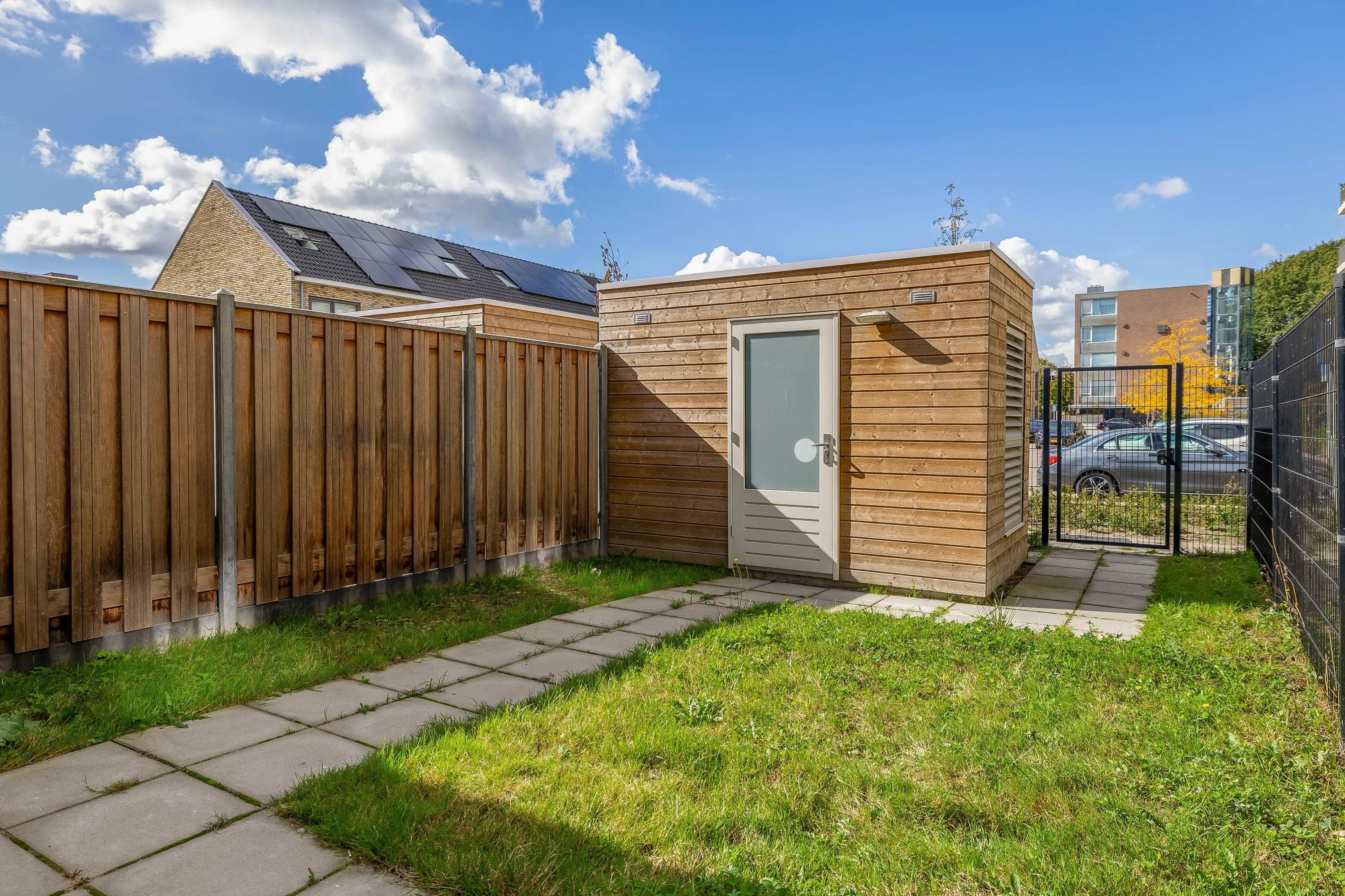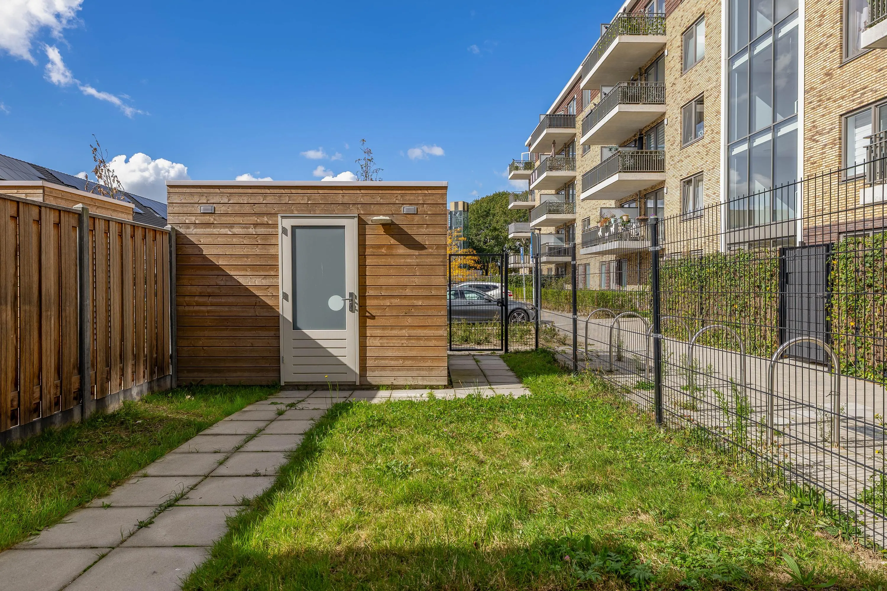 De open tuin beschikt over een praktische houten berging die is voorzien van elektriciteit — ideaal voor het stallen van (elektrische) fietsen, tuingereedschap of als extra opslagruimte. Daarnaast is er een handige achterom aanwezig, wat het mogelijk maakt om eenvoudig via de achterzijde het perceel te betreden.