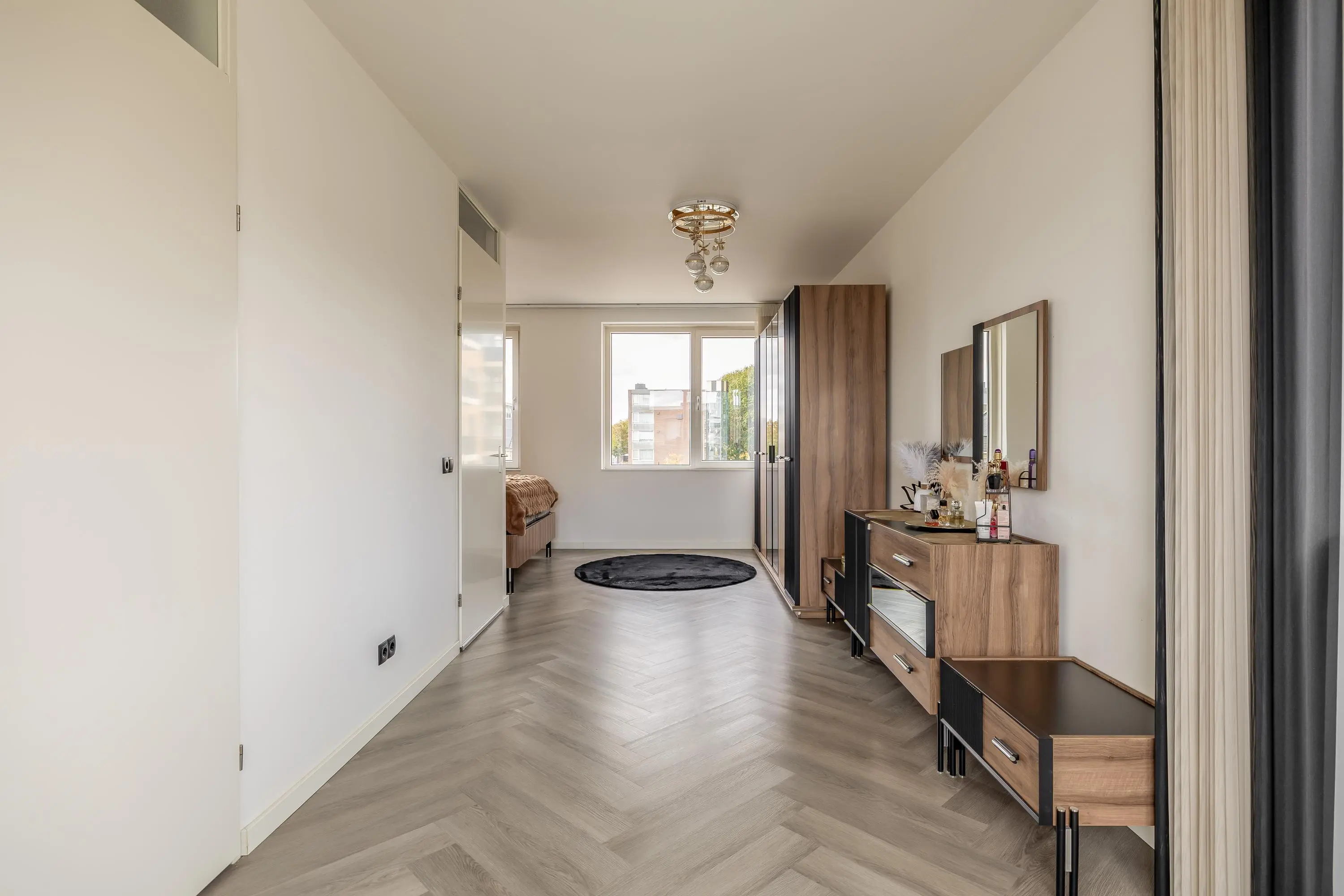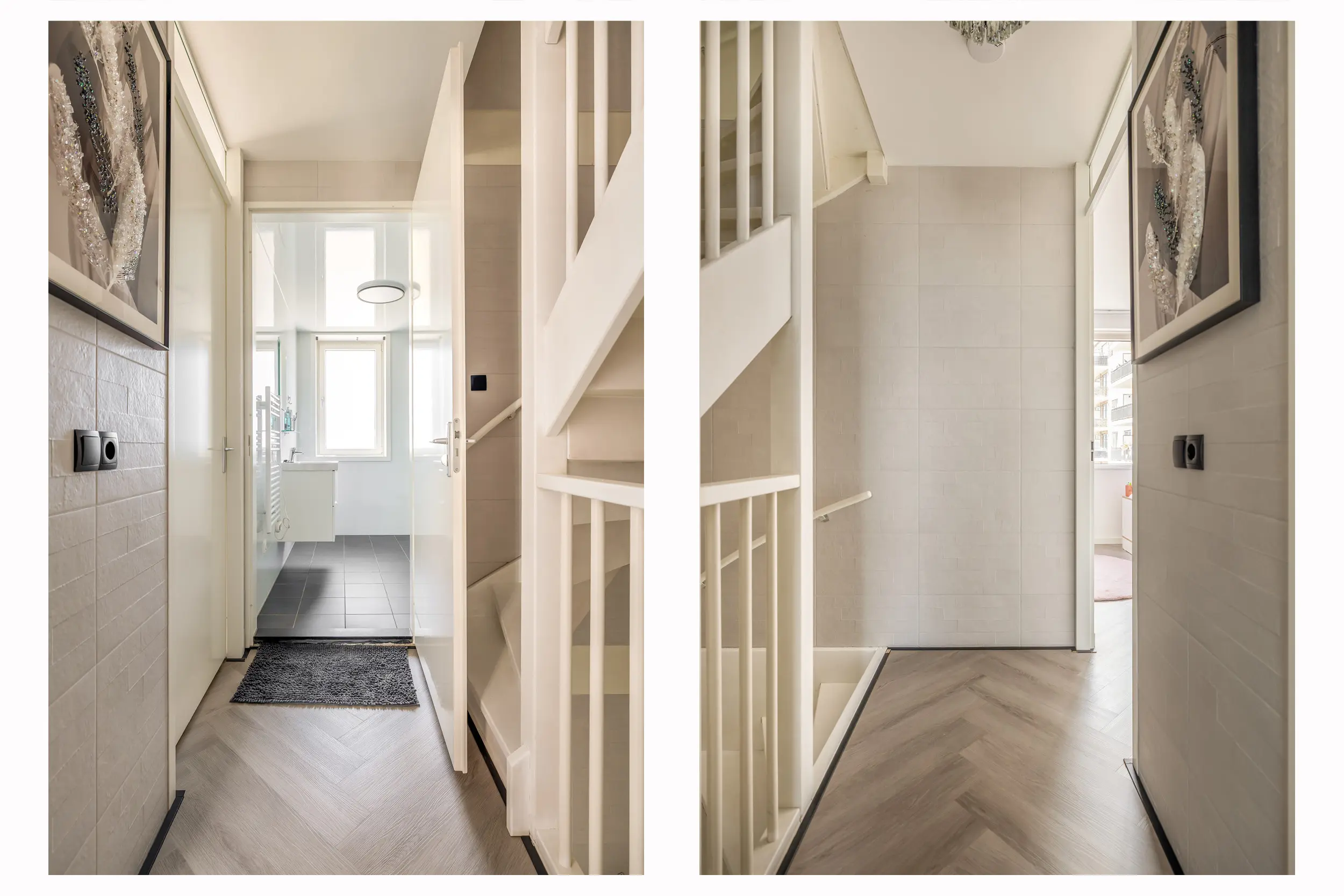 Overloop met toegang tot de vertrekken. Er ligt een fraaie pvc vloer met visgraatmotief en de vloer is voorzien van vloerverwarming.