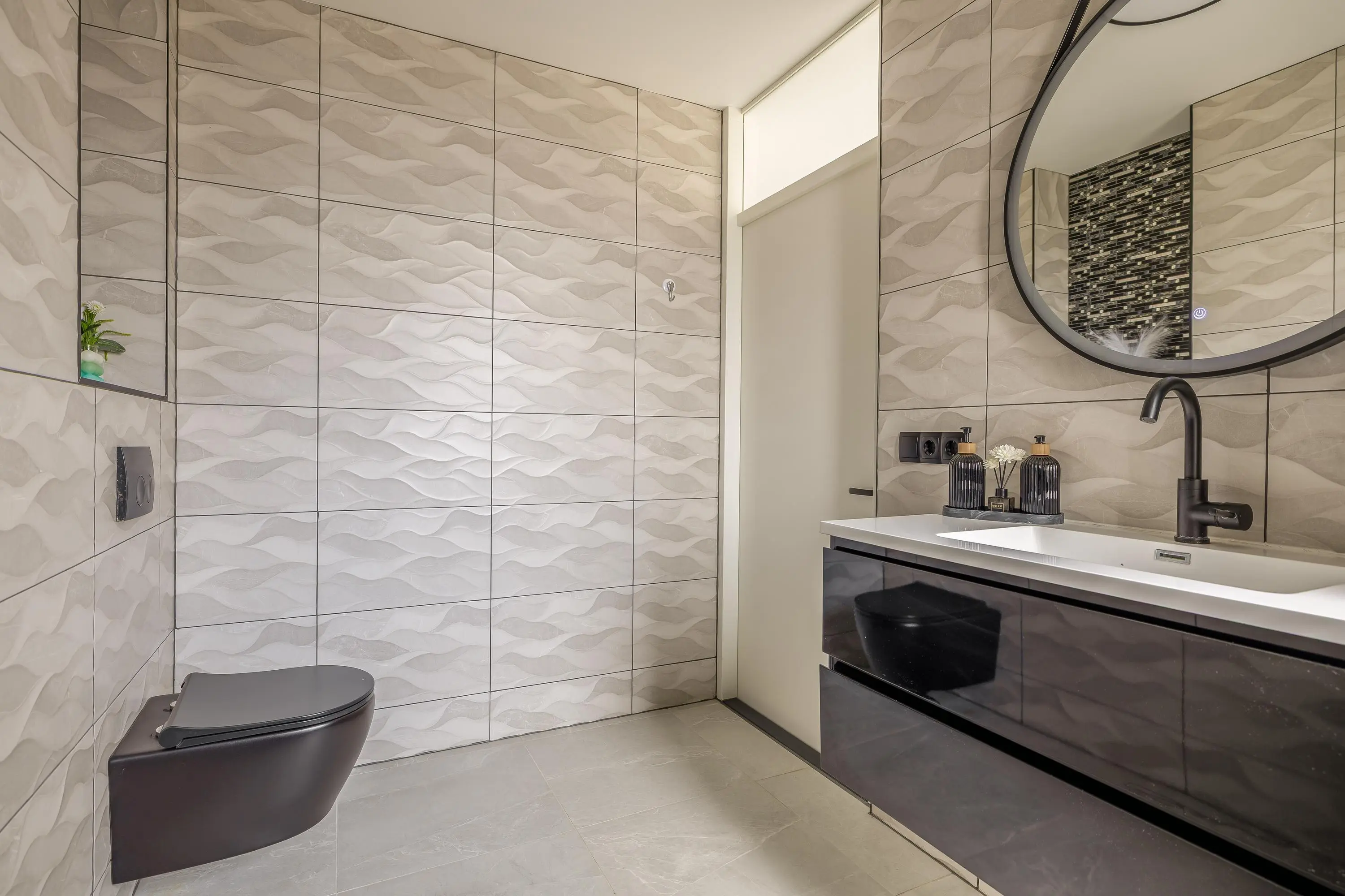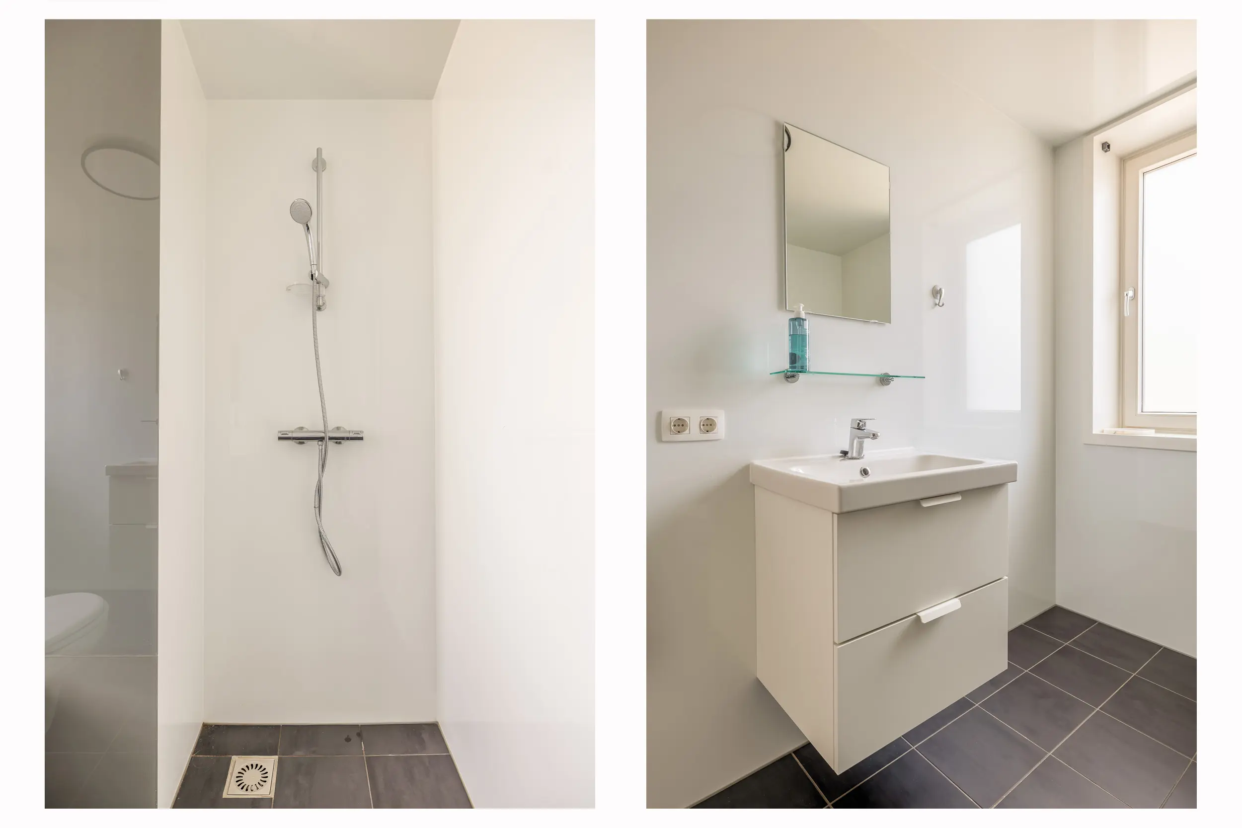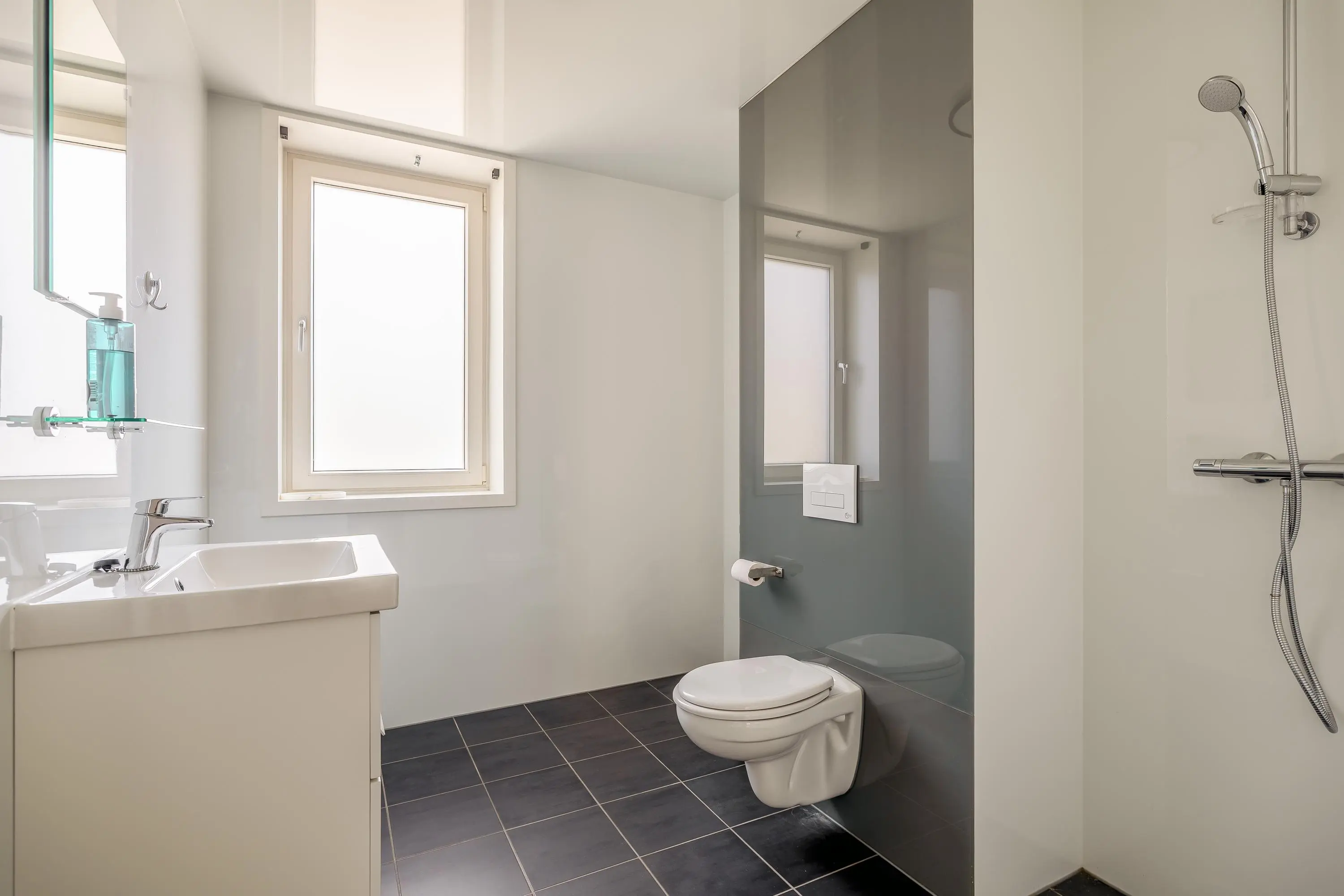 De moderne badkamer bestaat uit een inloopdouche, toilet en een wastafelmeubel.