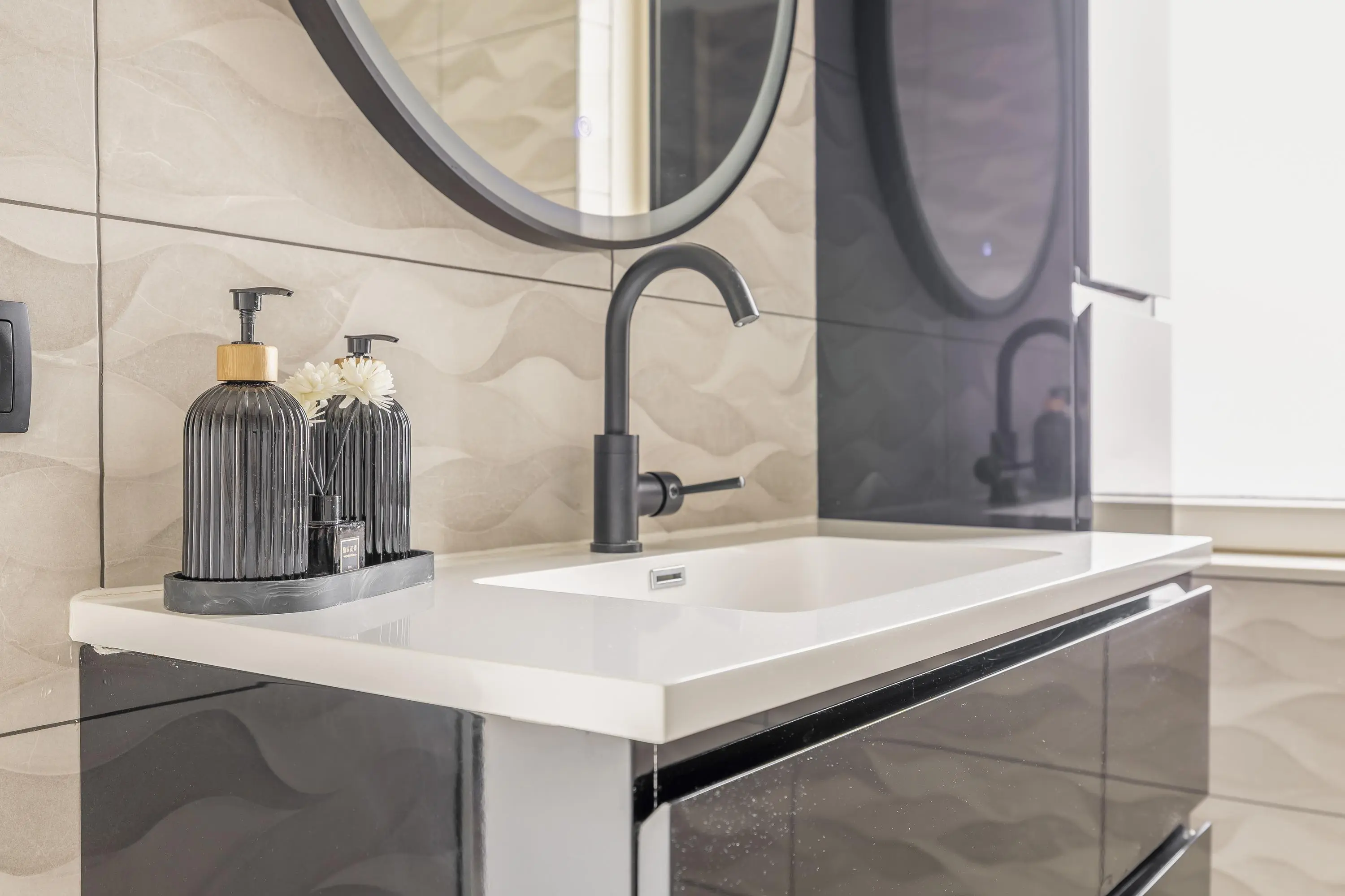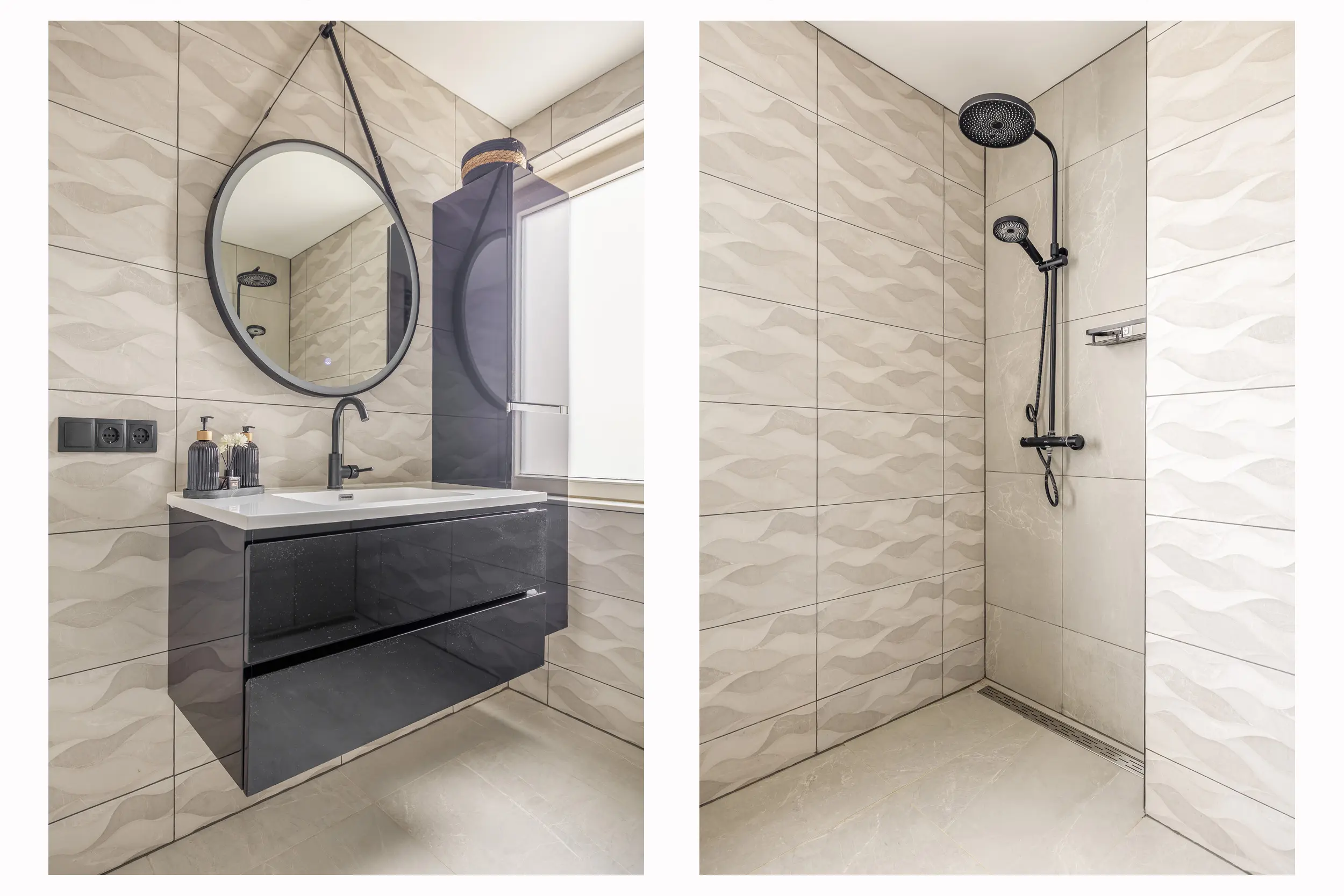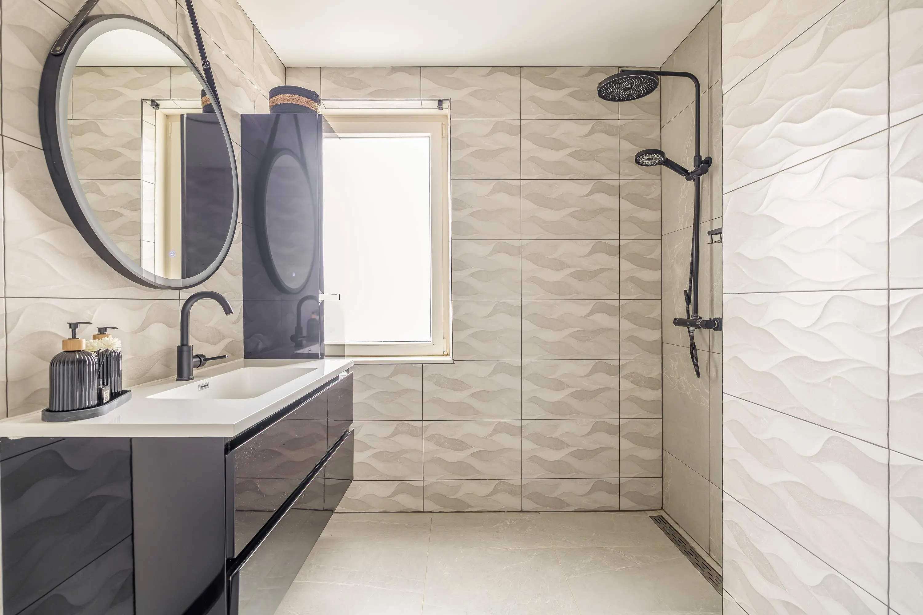 De moderne badkamer bestaat uit een inloopdouche, toilet en een wastafelmeubel.