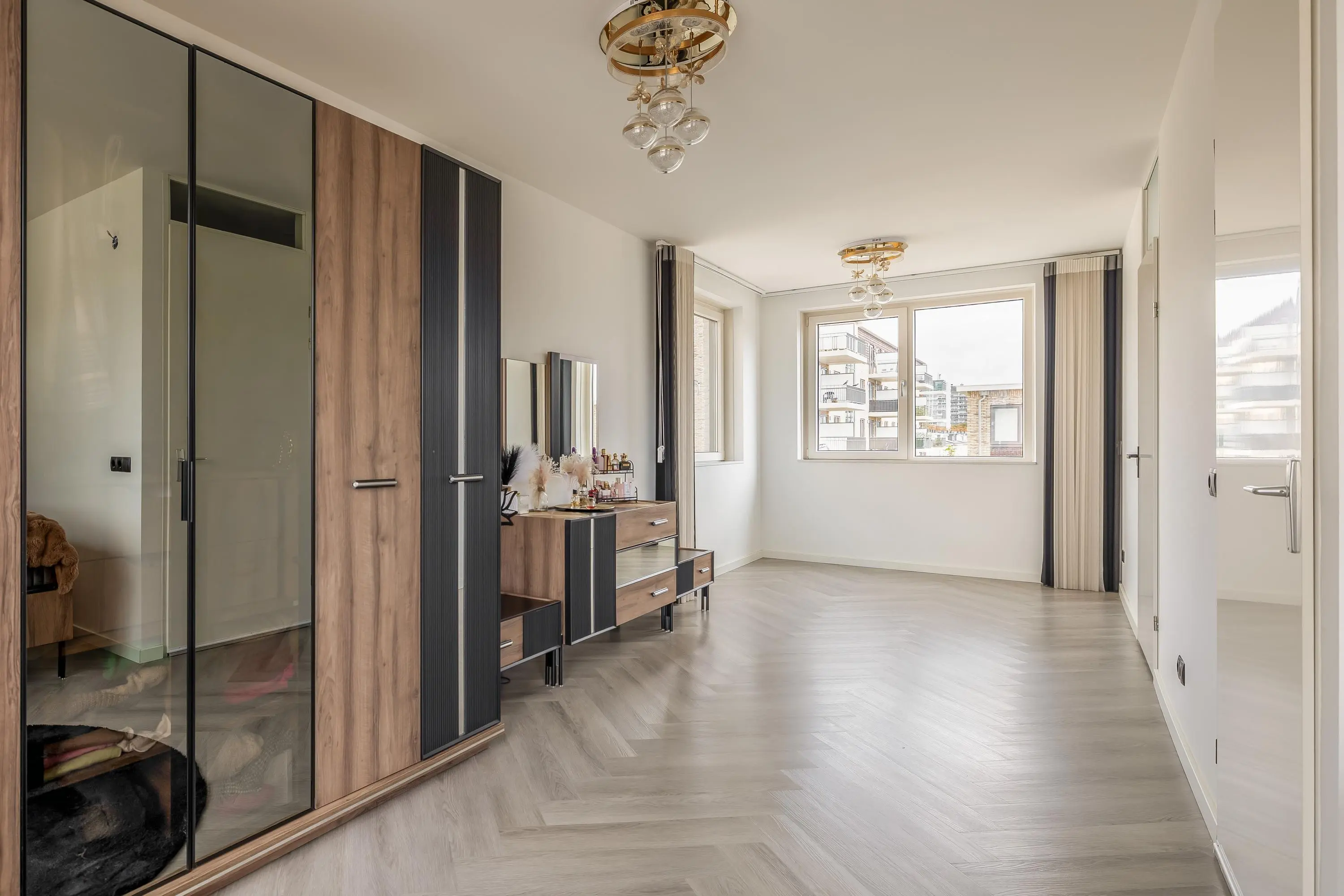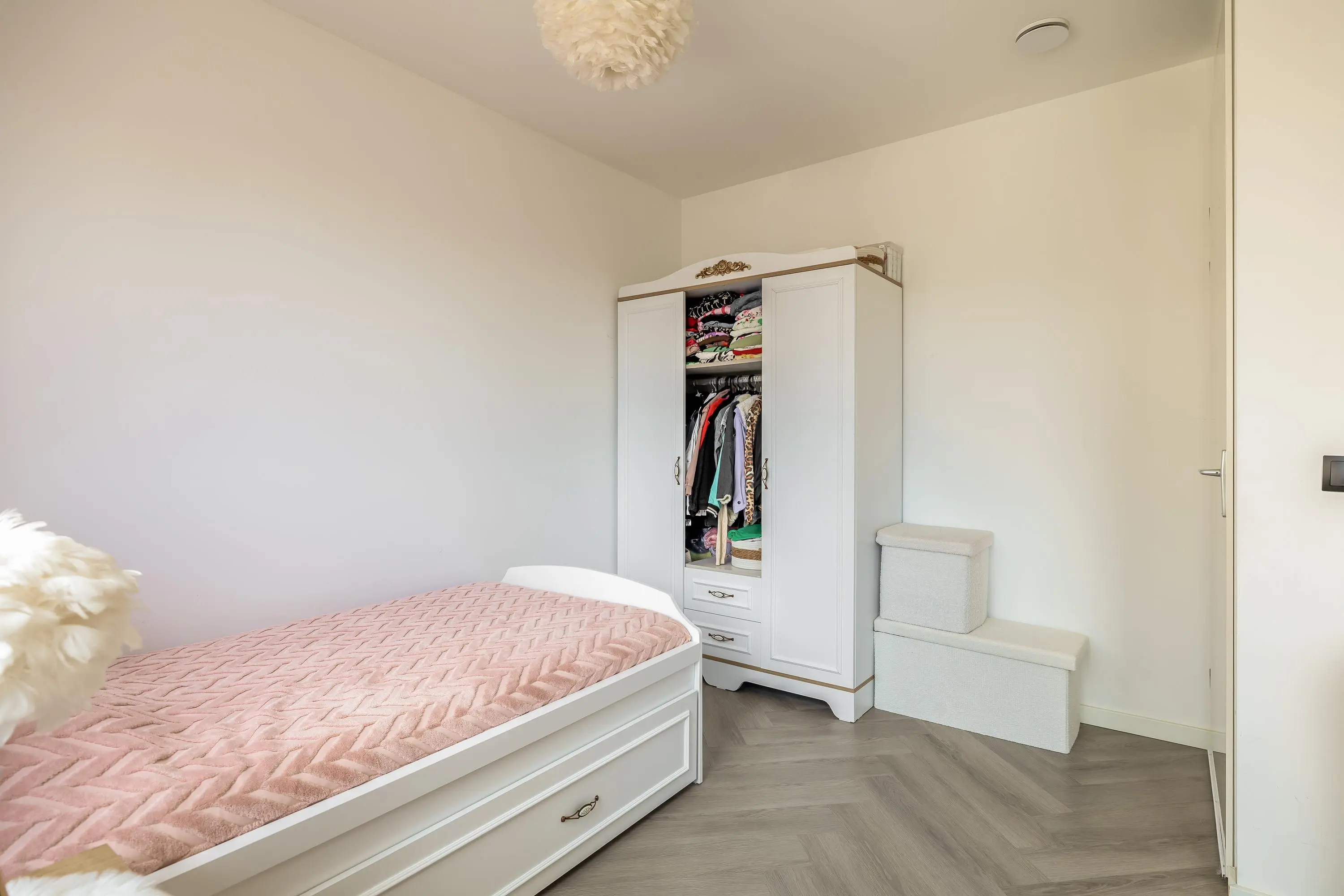 Overloop met een vaste kast met daarin de aansluiting voor de wasmachine. Op deze verdieping valt ook direct de fraaie pvc vloer met visgraatmotief op. Hierdoor is er een uniforme uitstraling ontstaan. De royale slaapkamer heeft een oppervlakte van maar liefst 27m² en indien gewenst kunt u hier een extra slaapkamer creëren. Vanuit de kamer is er toegang tot de badkamer.