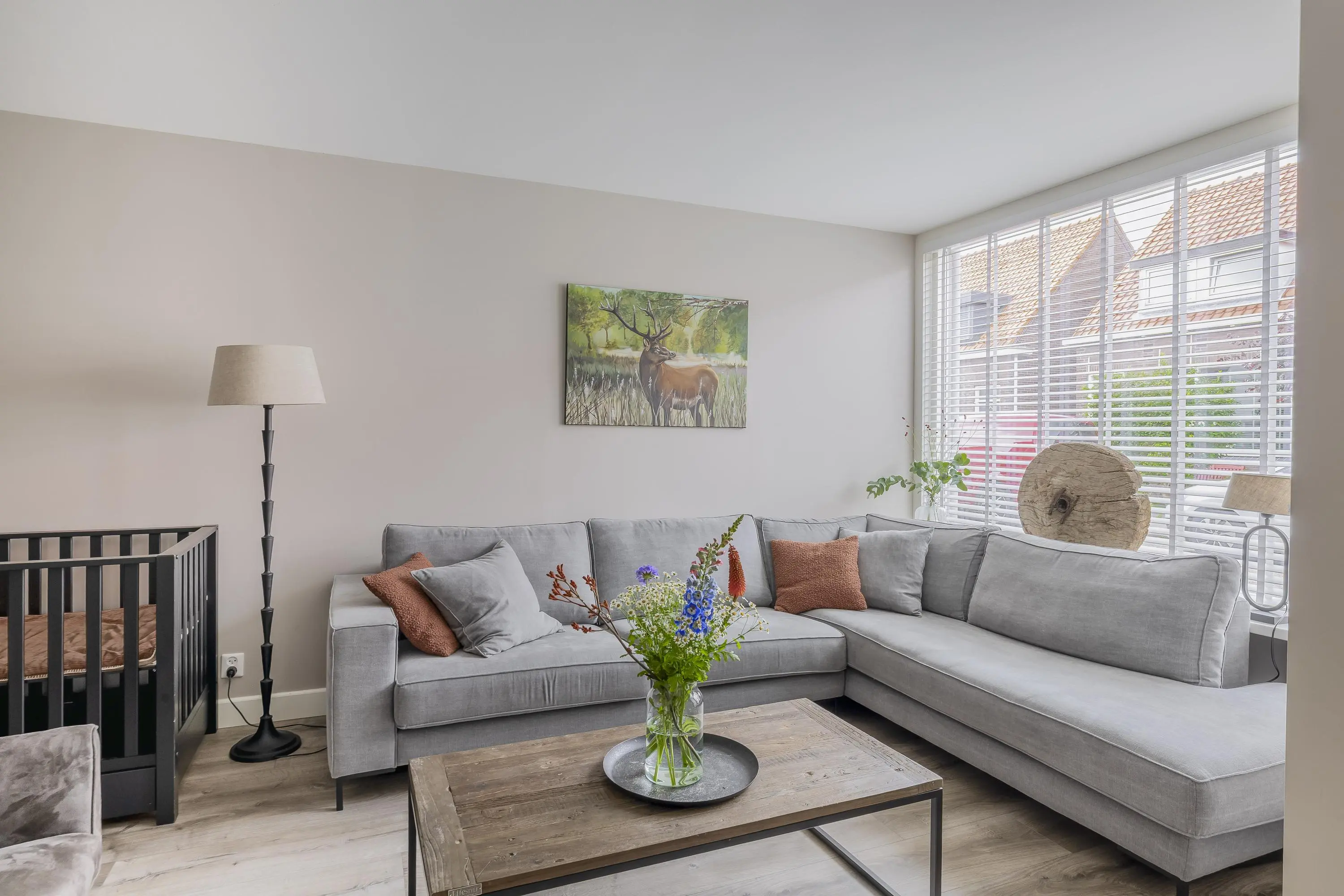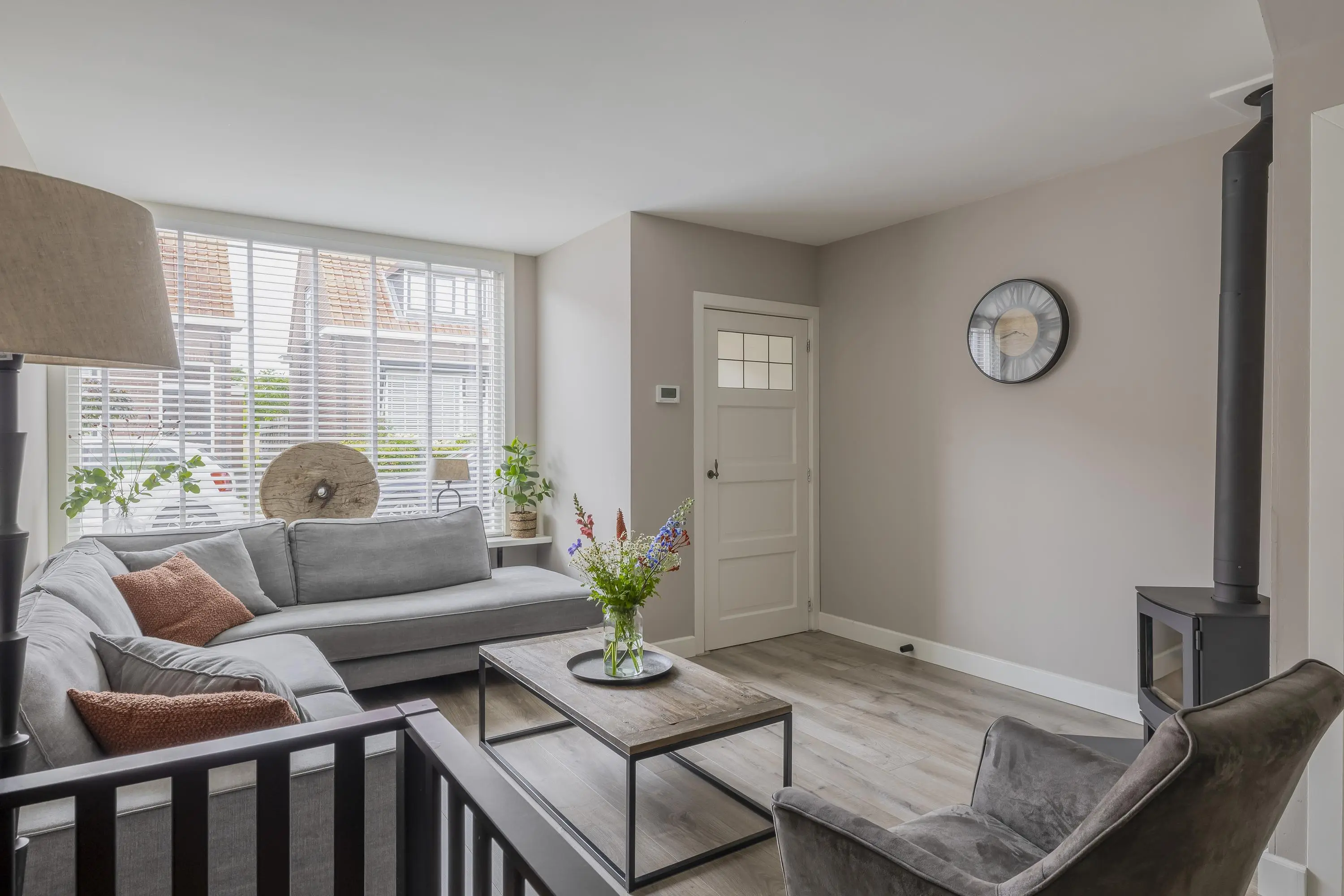 De lichte woonkamer is dankzij het grote raam aan de voorzijde erg uitnodigend en ruim van opzet. Hier is voldoende plek voor een gezellige zithoek. Onder de trap bevindt zich een praktische trapkast.