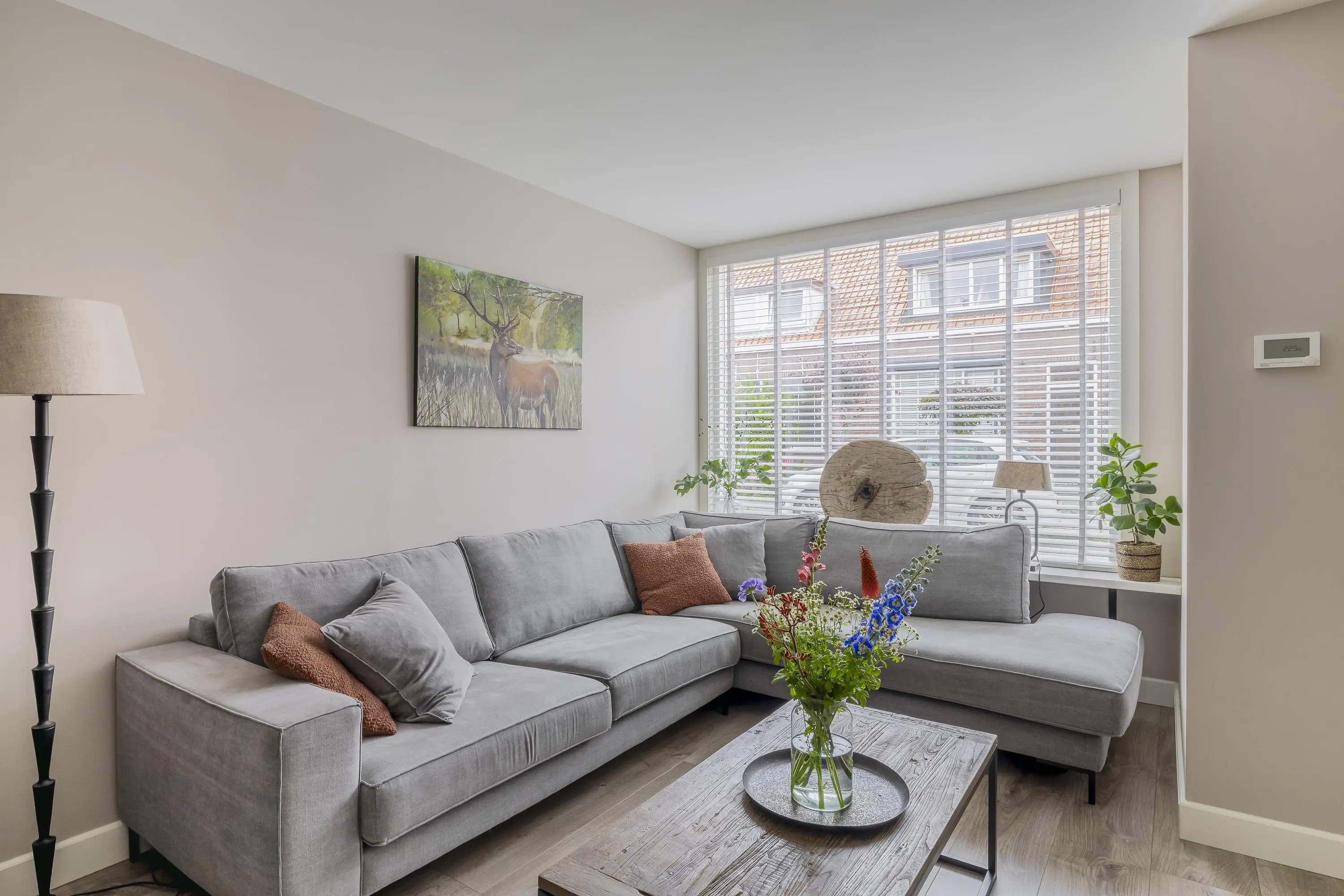 Bij binnenkomst treft u de hal met een nette laminaatvloer, voorzien van vloerverwarming. Deze vloer loopt door over de gehele begane grond, die volledig is uitgerust met vloerverwarming. In de hal bevinden zich de meterkast en een afgesloten deur naar de leefruimte.