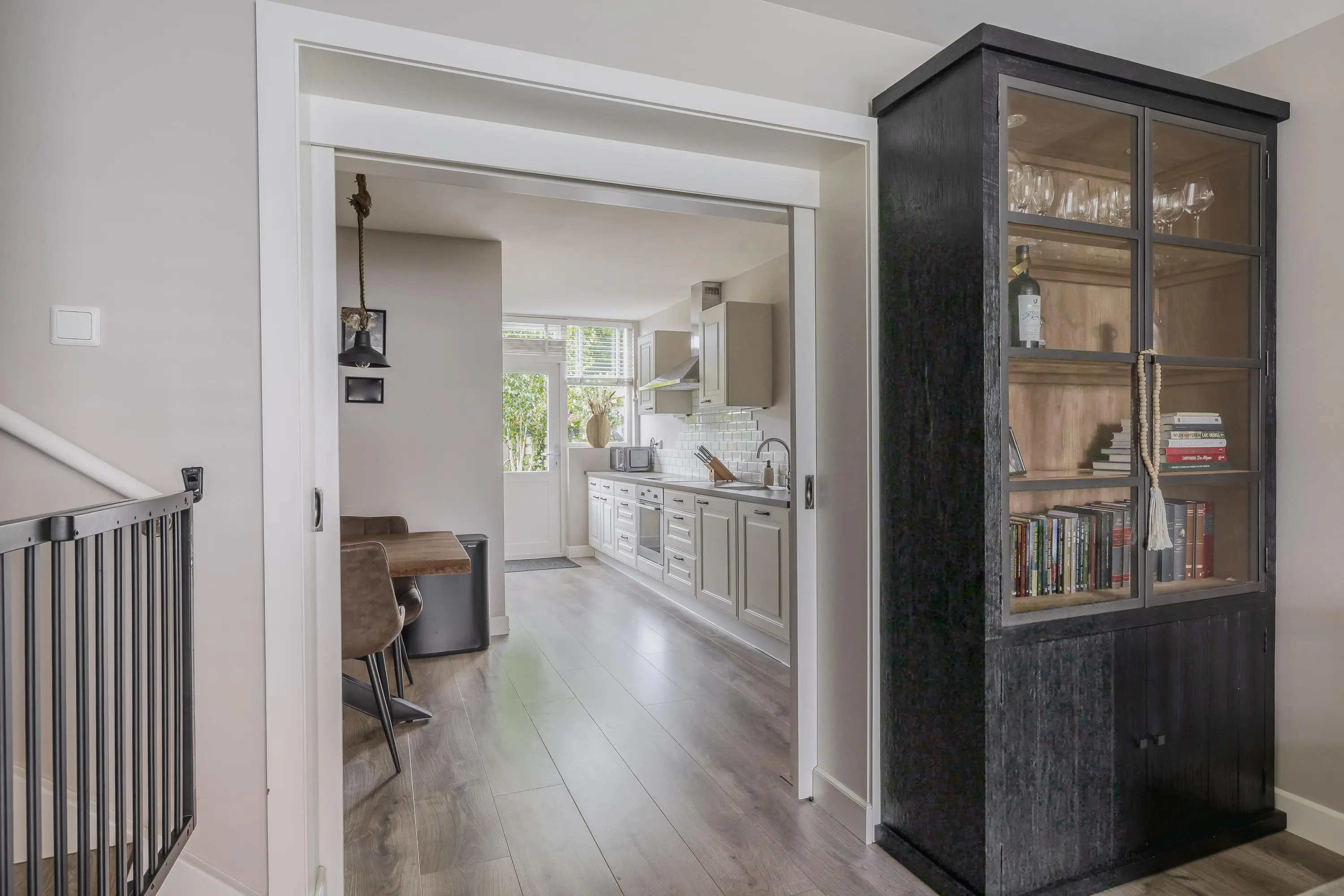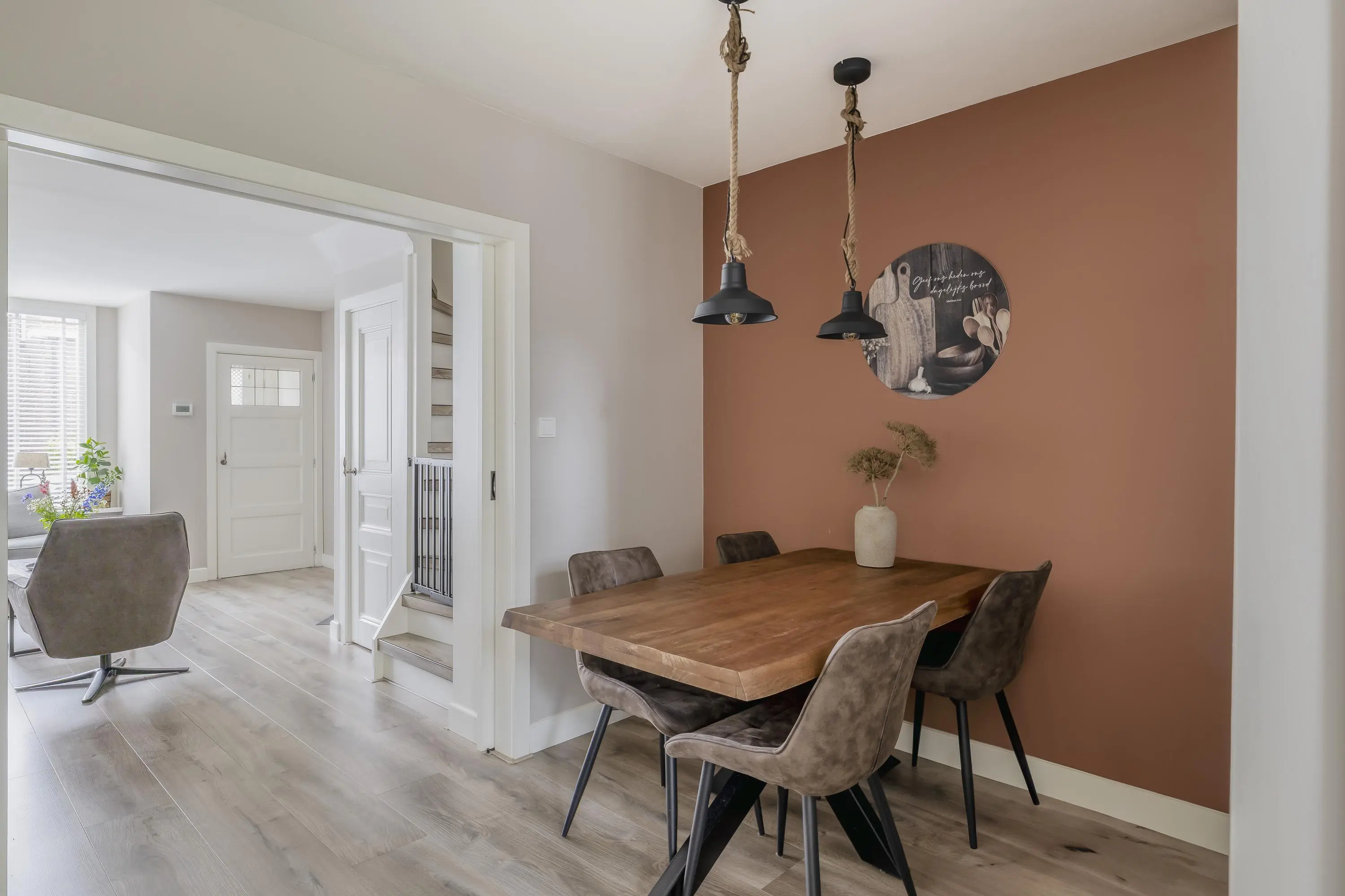 De en-suite schuifdeuren verdelen de living op een sfeervolle manier in twee aparte ruimtes, waardoor het woon- en eetgedeelte van elkaar gescheiden zijn terwijl de openheid van de ruimte behouden blijft.