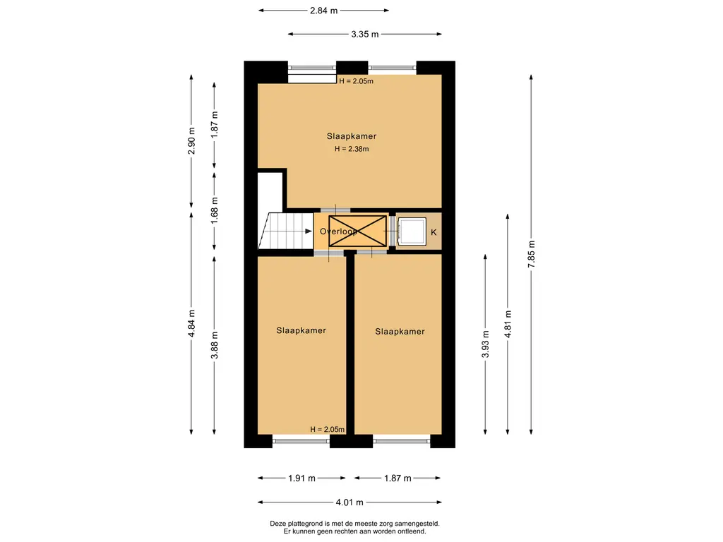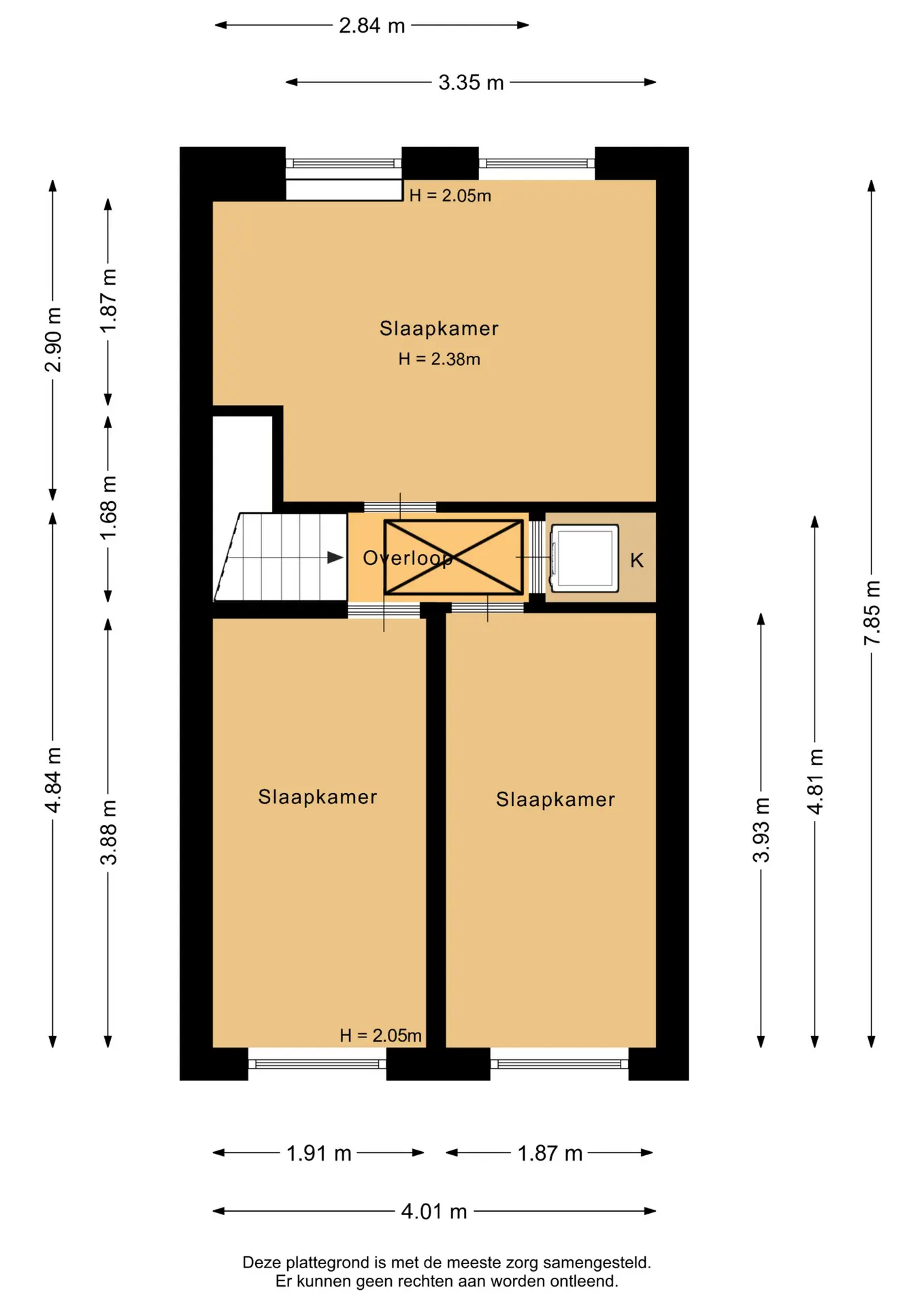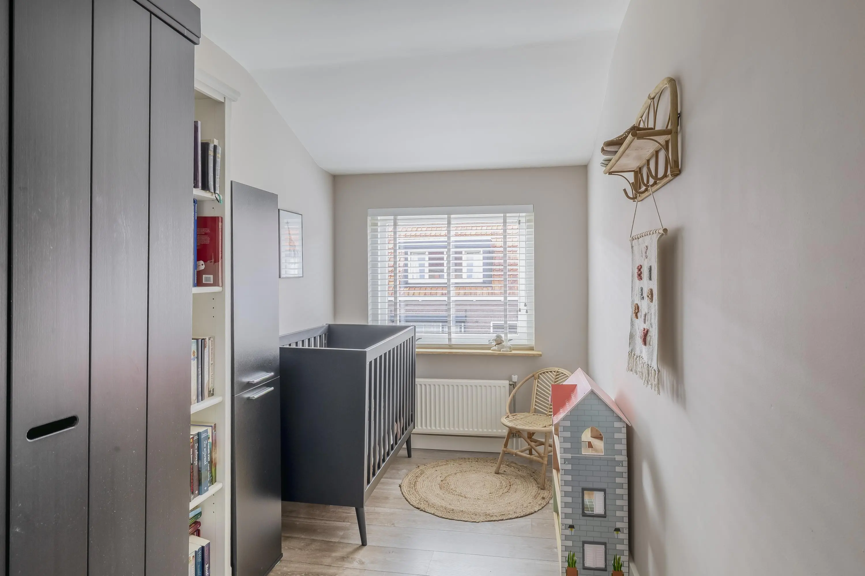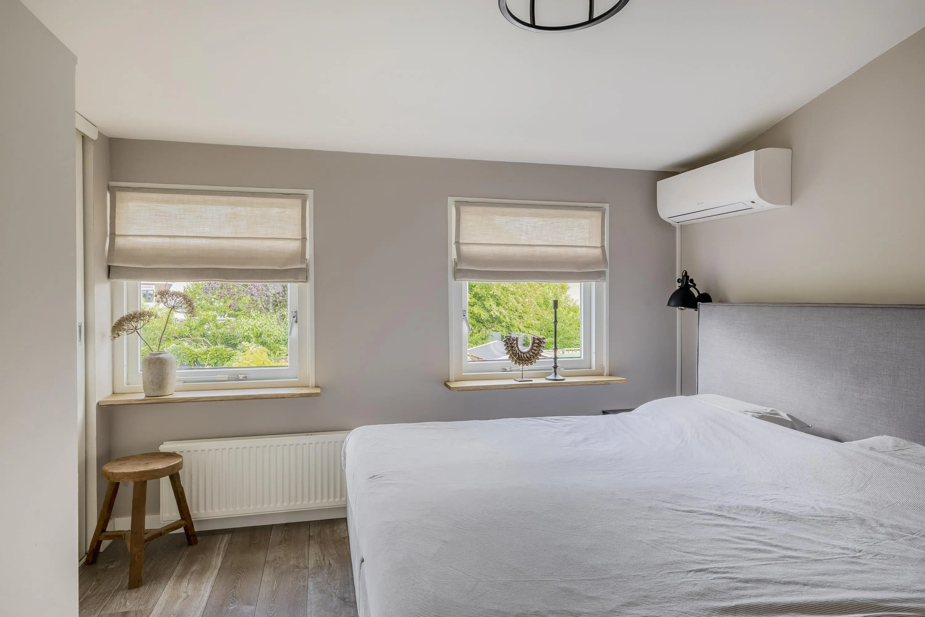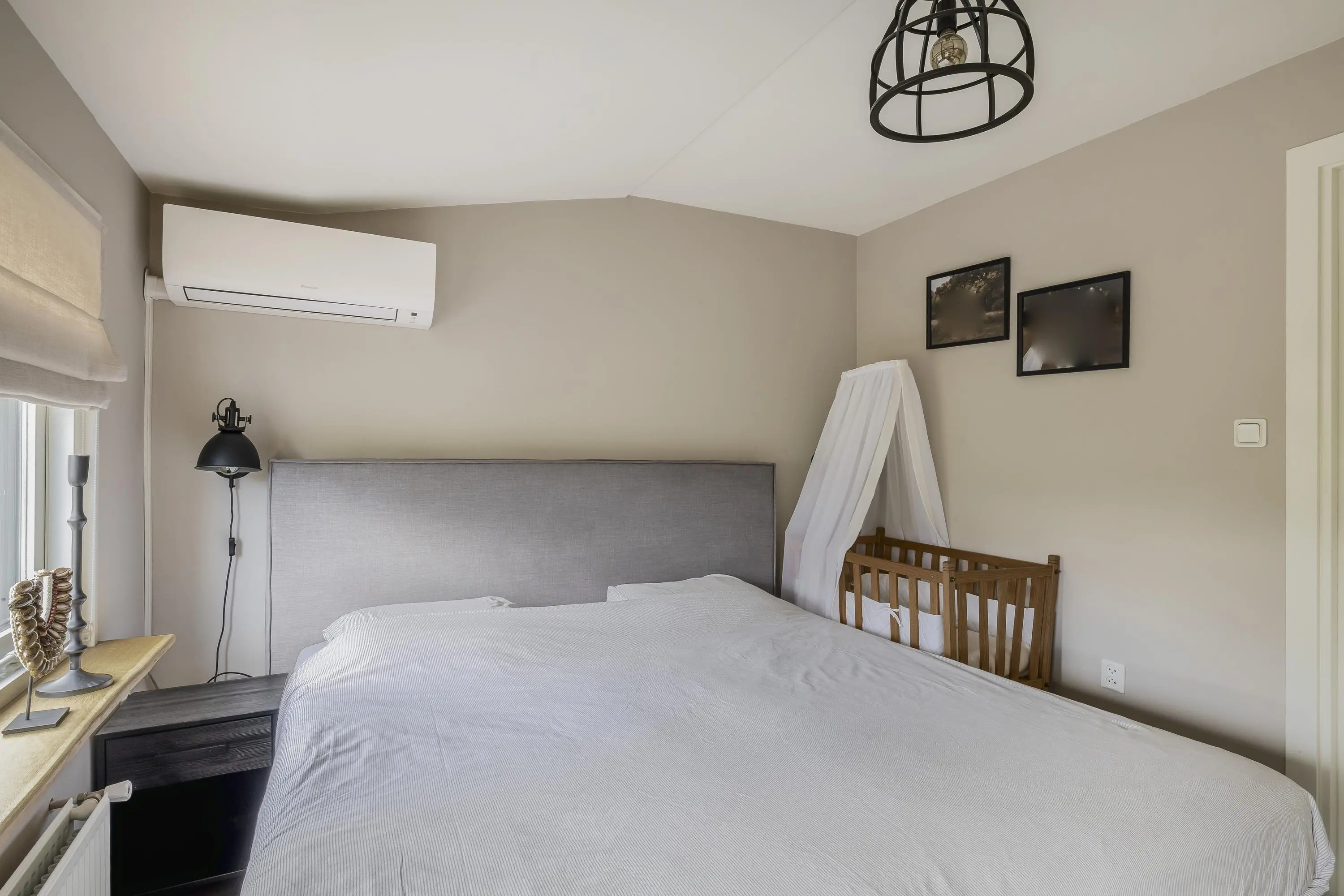 De hoofdslaapkamer is gelegen aan de achterzijde van de woning en heeft een oppervlakte van circa 11m². De kamer is uitgerust met airconditioning en beschikt over twee ramen met rolluiken, ideaal voor comfort en verduistering. De twee overige slaapkamers bevinden zich aan de voorzijde van het huis en zijn nagenoeg gelijk van formaat, met elk een oppervlakte van ongeveer 7,5m².