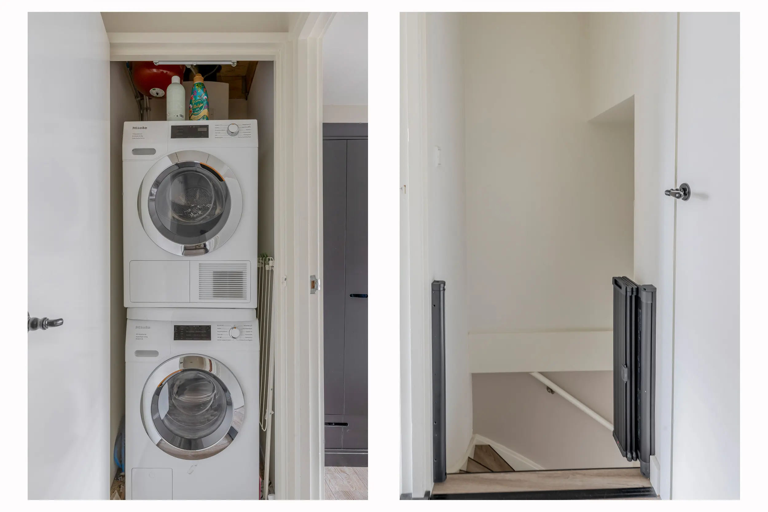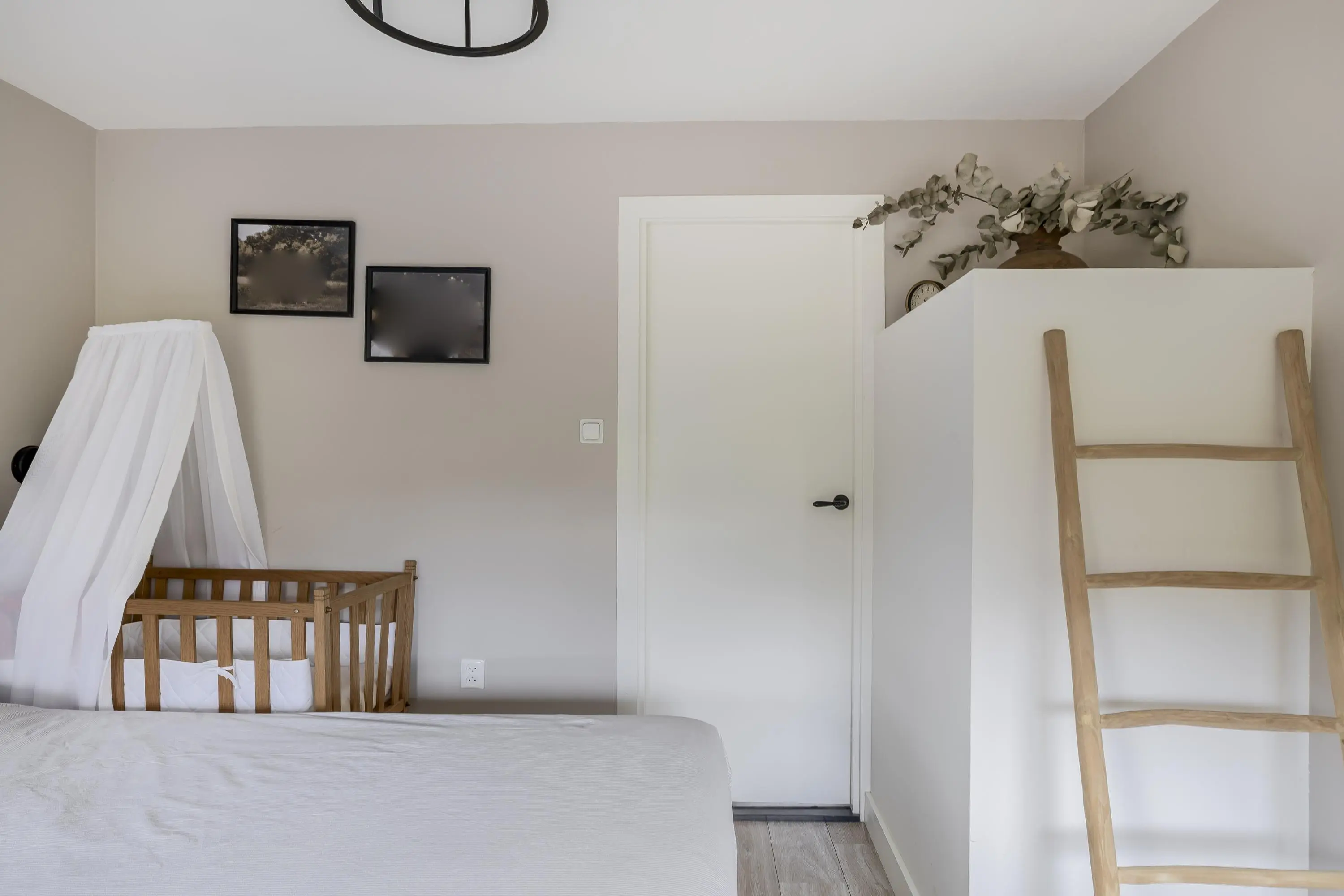 De overloop is afgewerkt met dezelfde stijlvolle laminaatvloer als op de begane grond, wat zorgt voor een rustige uitstraling. Deze vloer loopt door in de aangrenzende slaapkamers, wat het geheel eenheid geeft. Vanuit de overloop is er toegang tot drie slaapkamers, de wasruimte en de vliering.