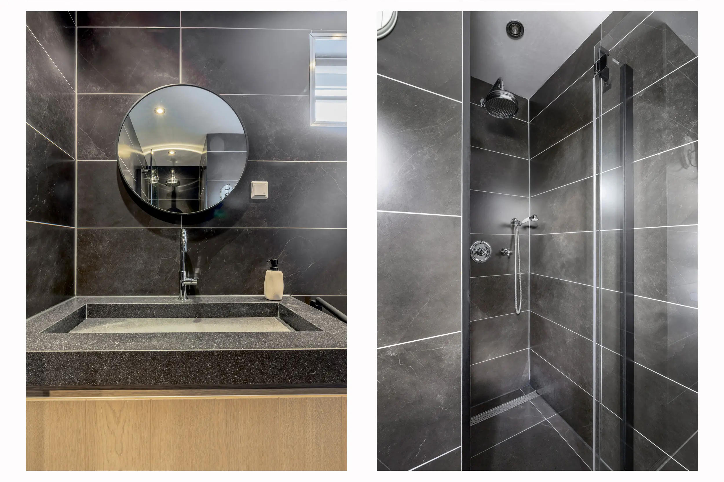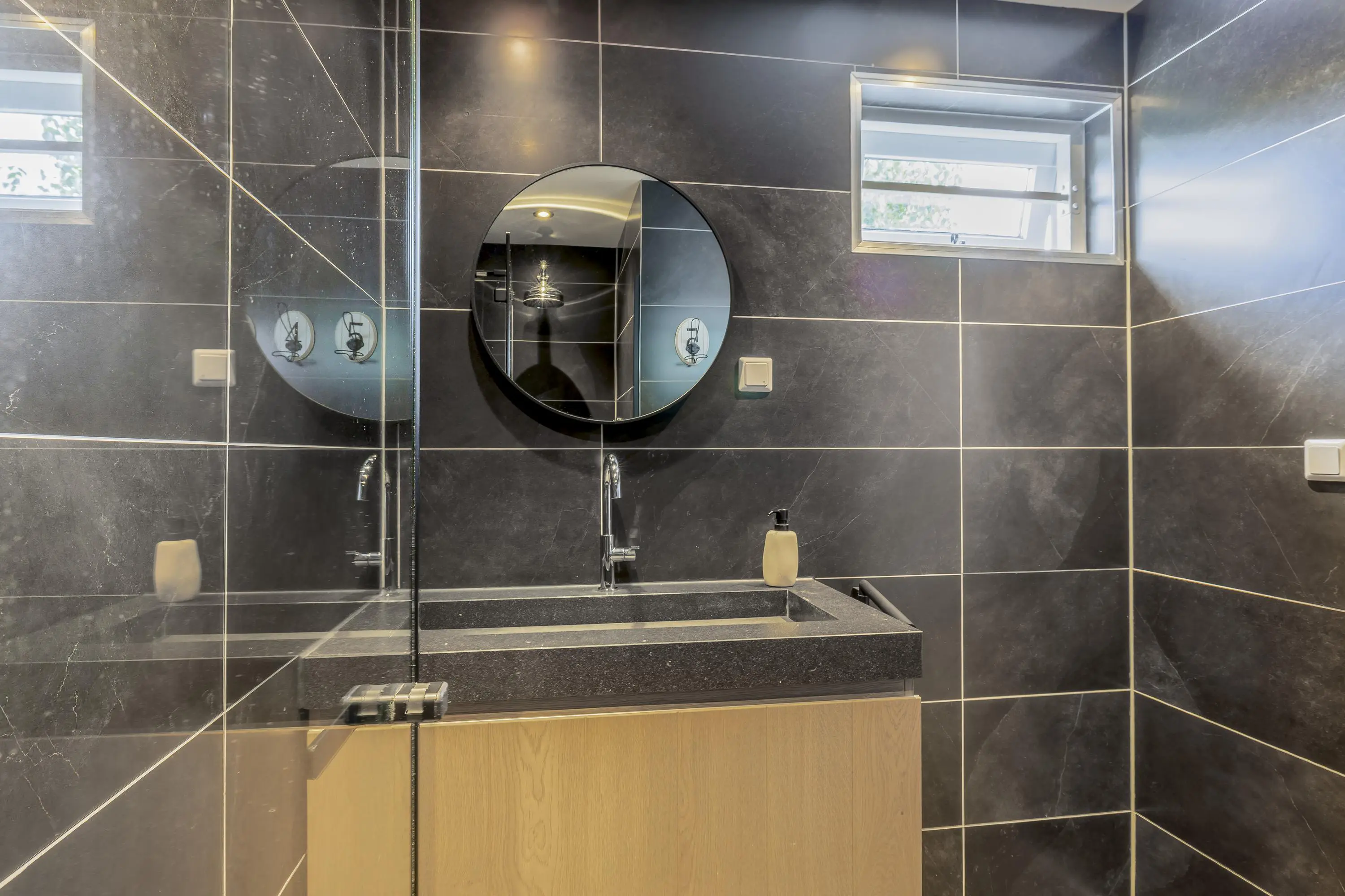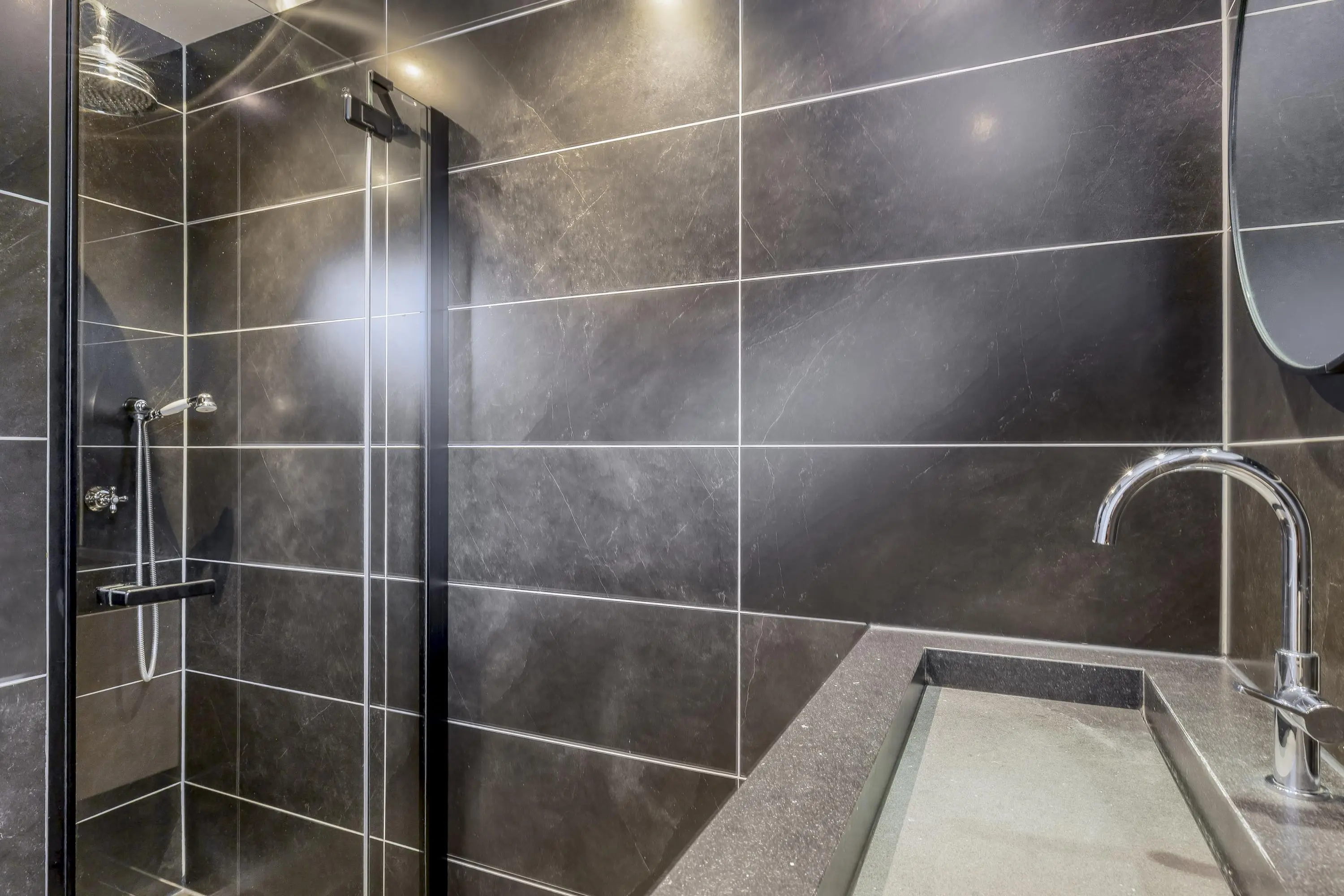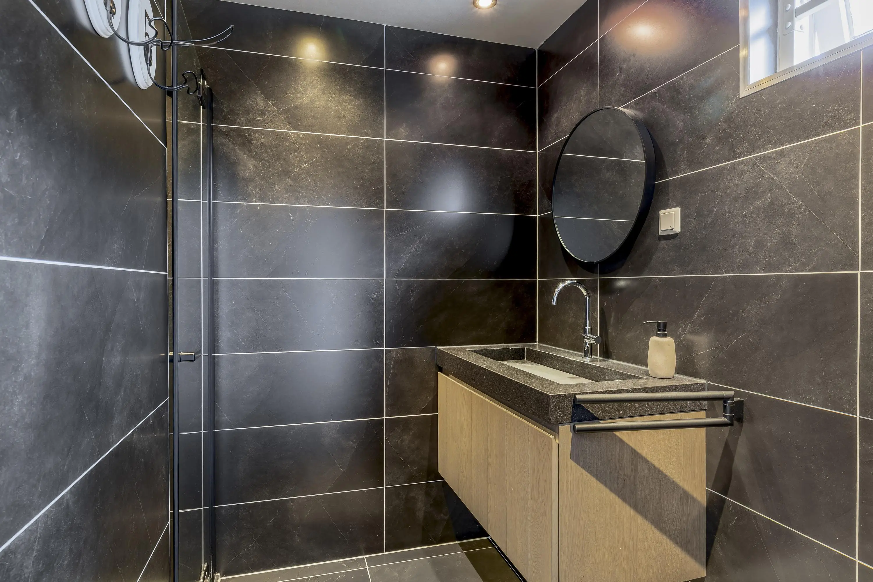 De badkamer is volledig betegeld en voorzien van een moderne inloopdouche en een wastafelmeubel. Direct naast de badkamer bevindt zich een separaat toilet.