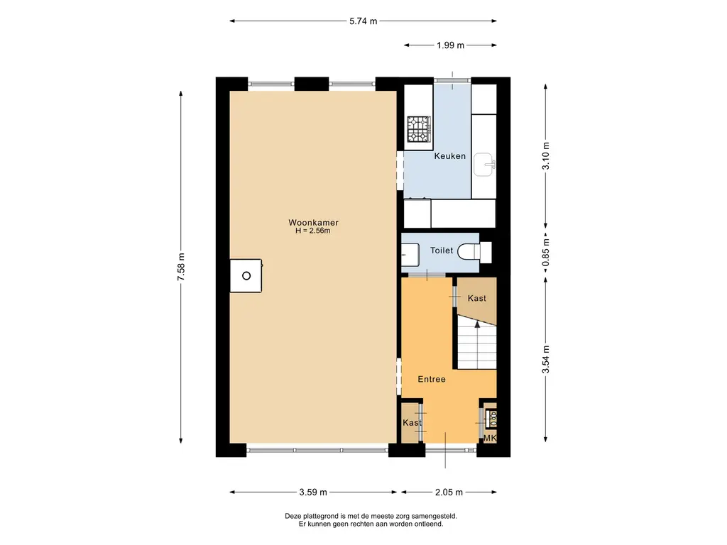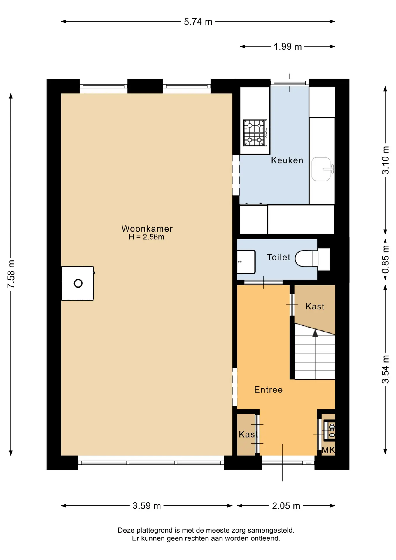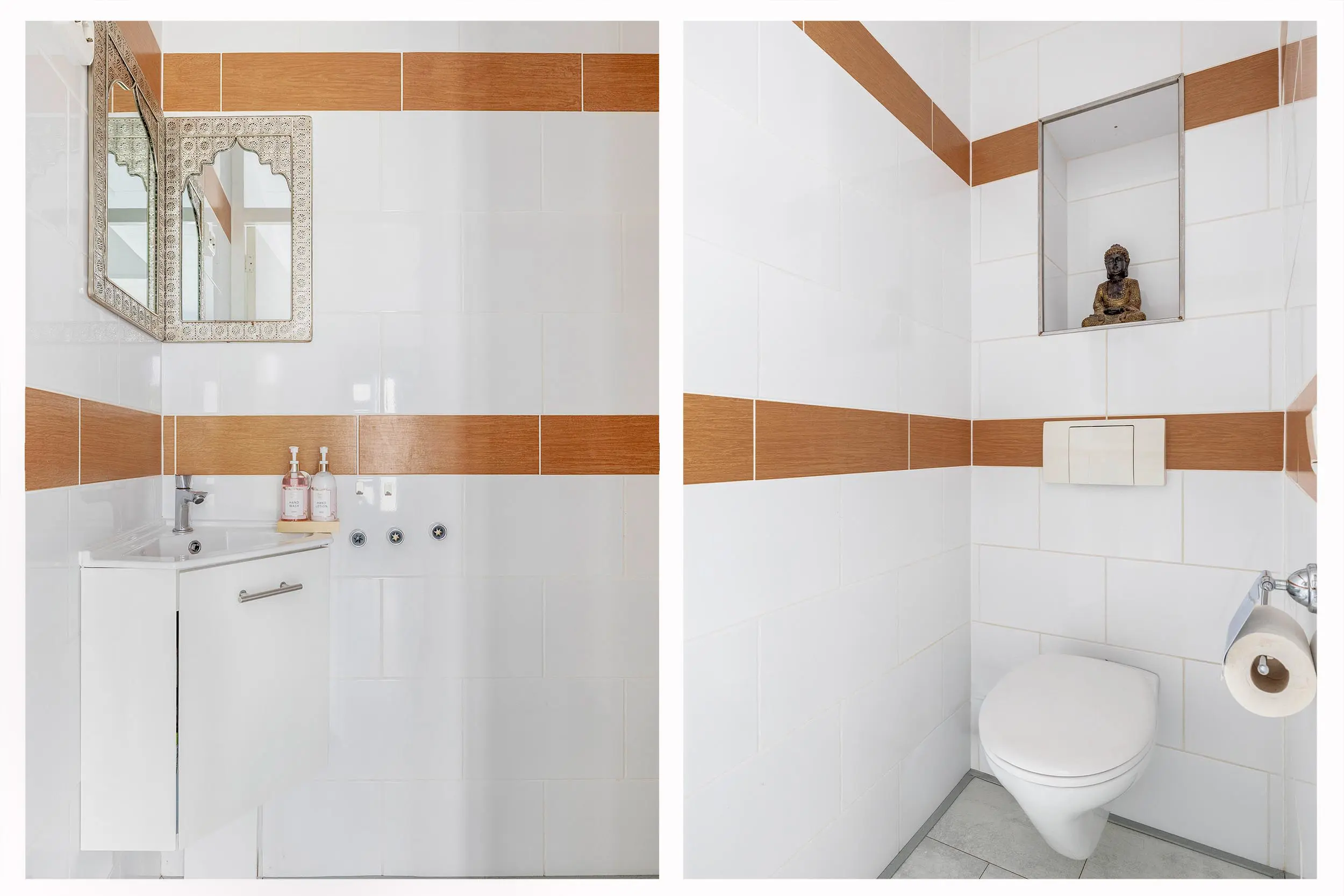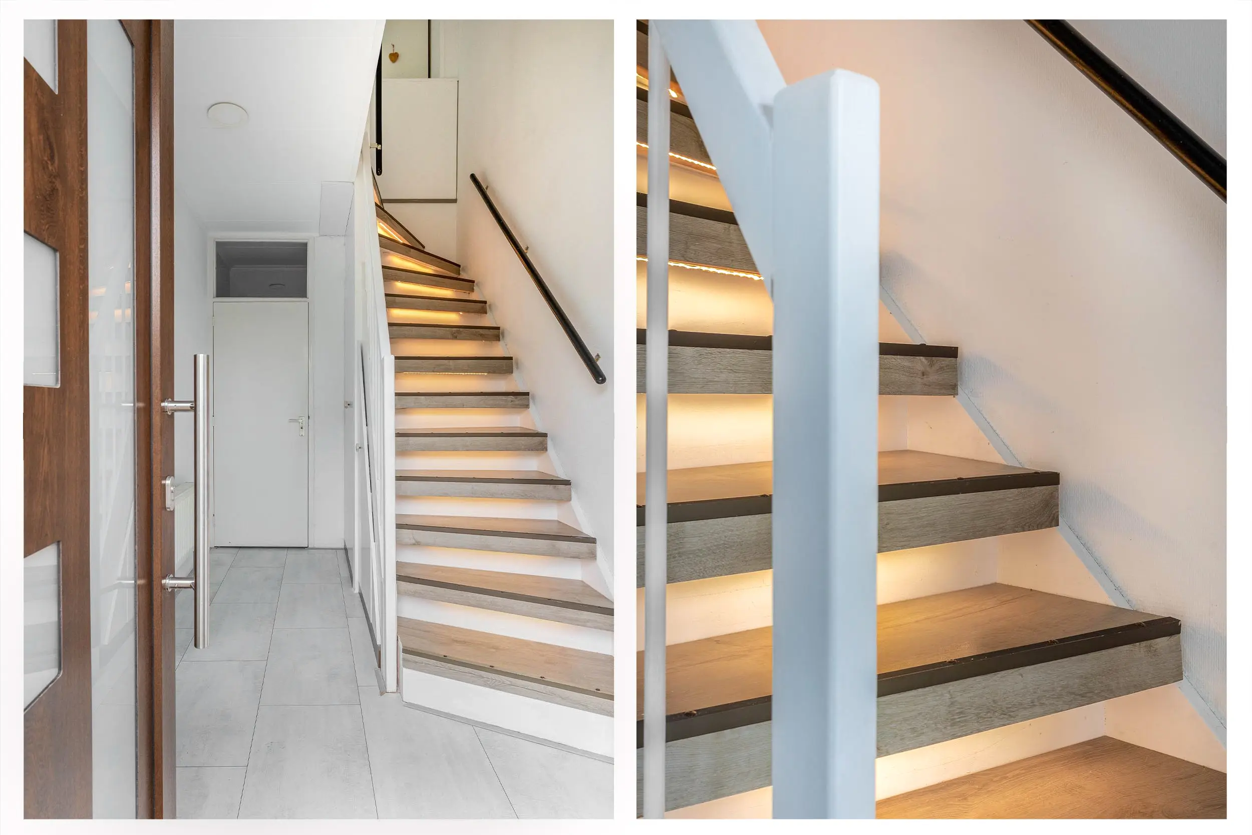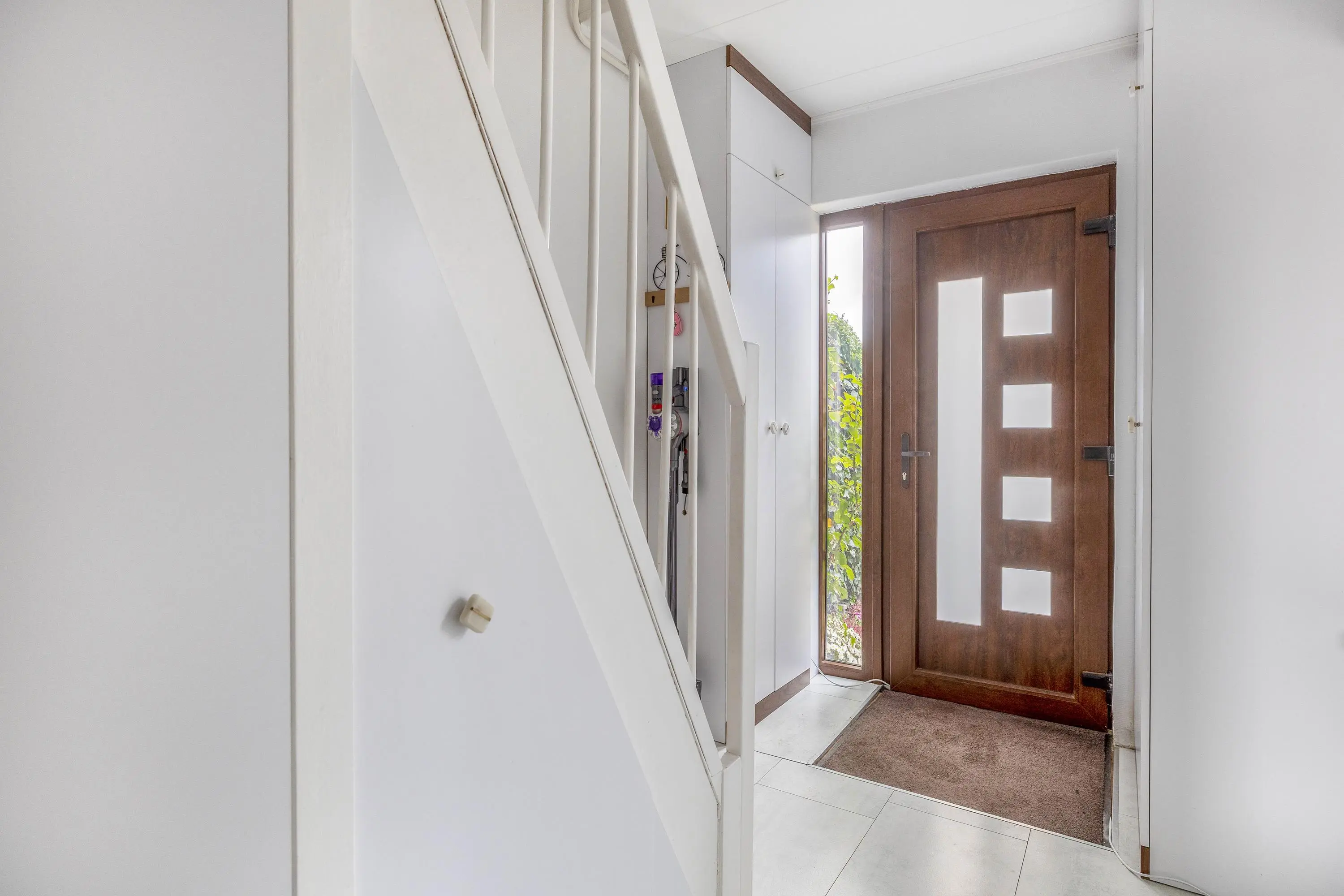 Bij binnenkomst stapt u in de hal, voorzien van een keurige laminaatvloer die doorloopt over de gehele begane grond. In de hal vindt u de meterkast, een praktische opbergkast, een volledig betegeld separaat toilet, de trapopgang naar de eerste verdieping met handige trapkast én luxe ingebouwde trapverlichting. Vanuit de hal heeft u toegang tot de sfeervolle leefruimte.