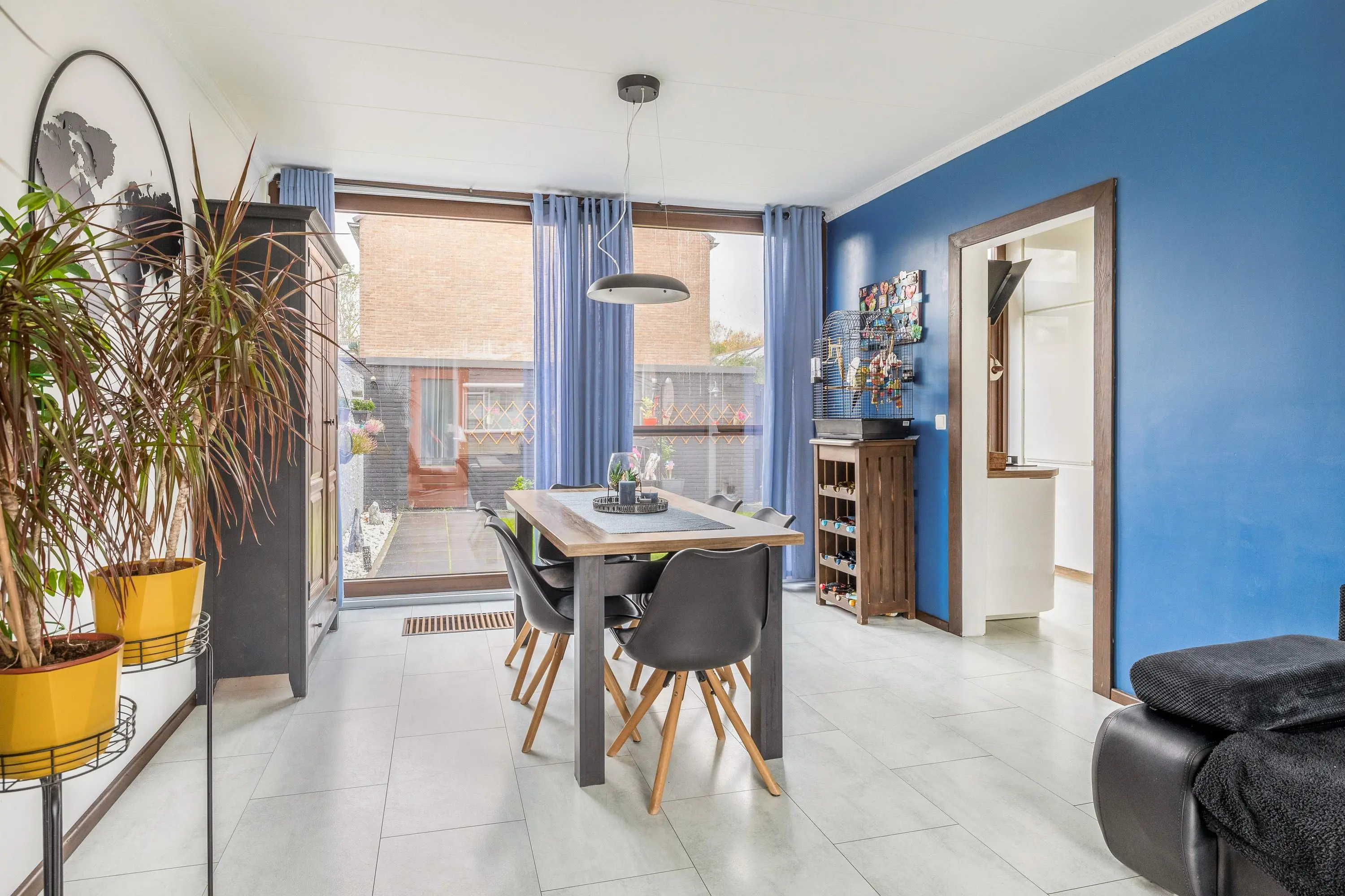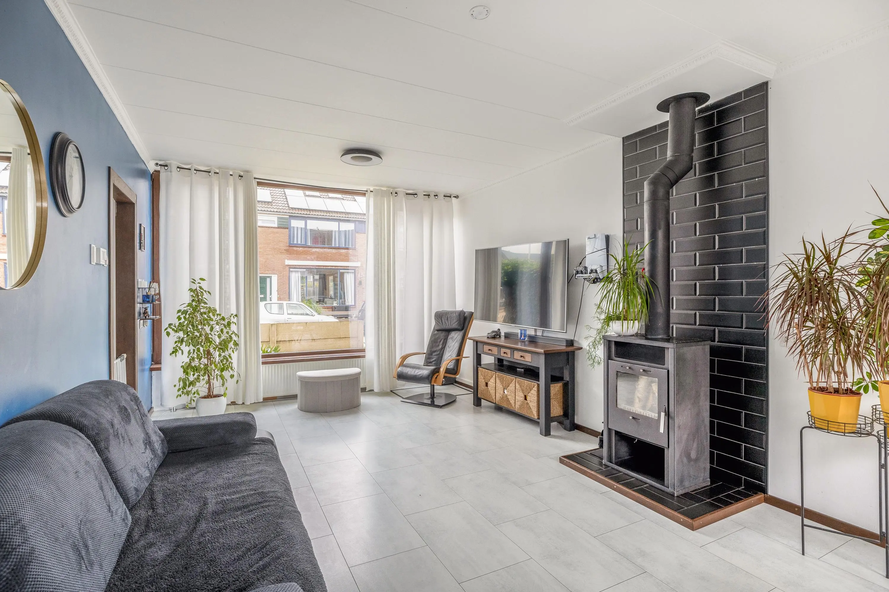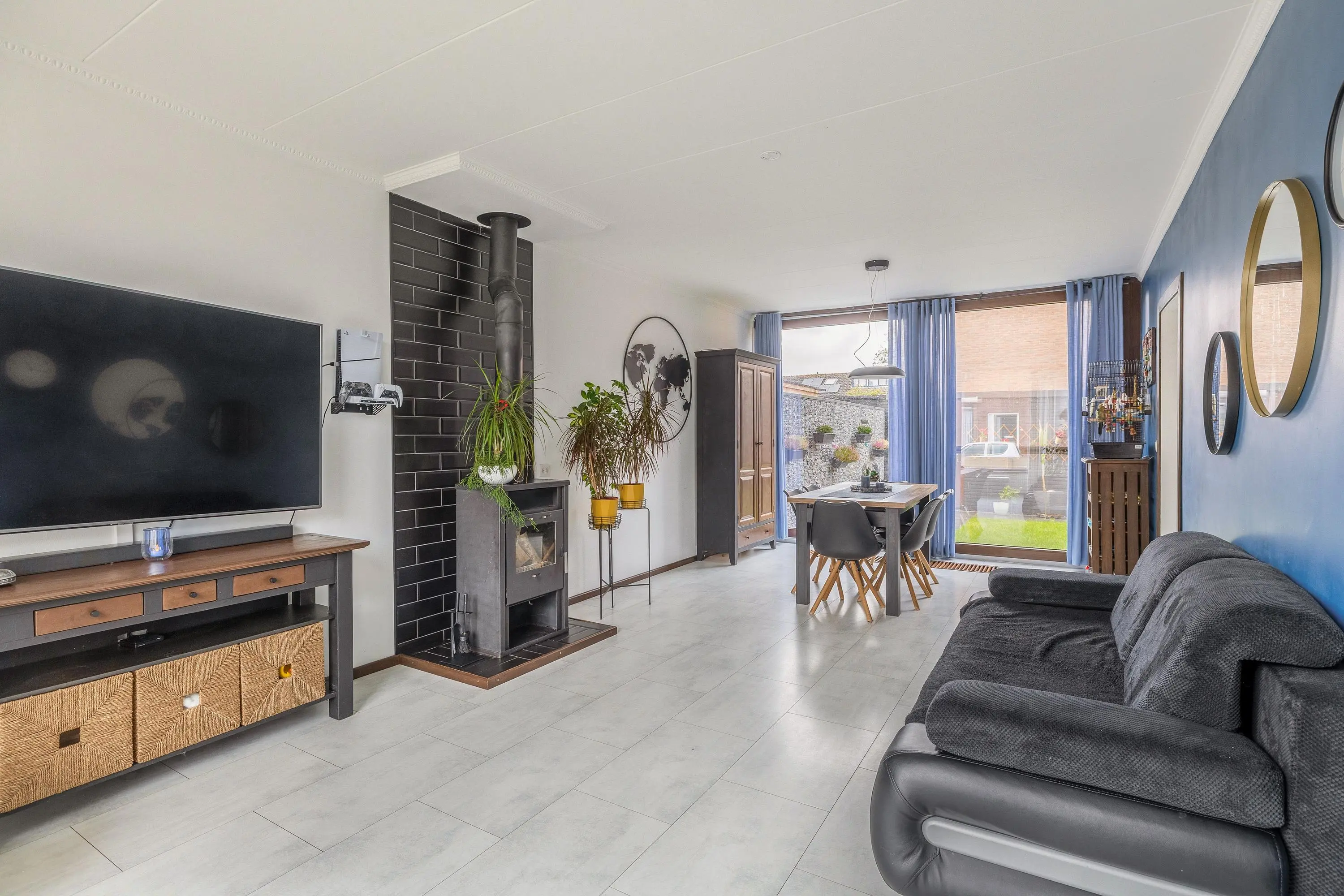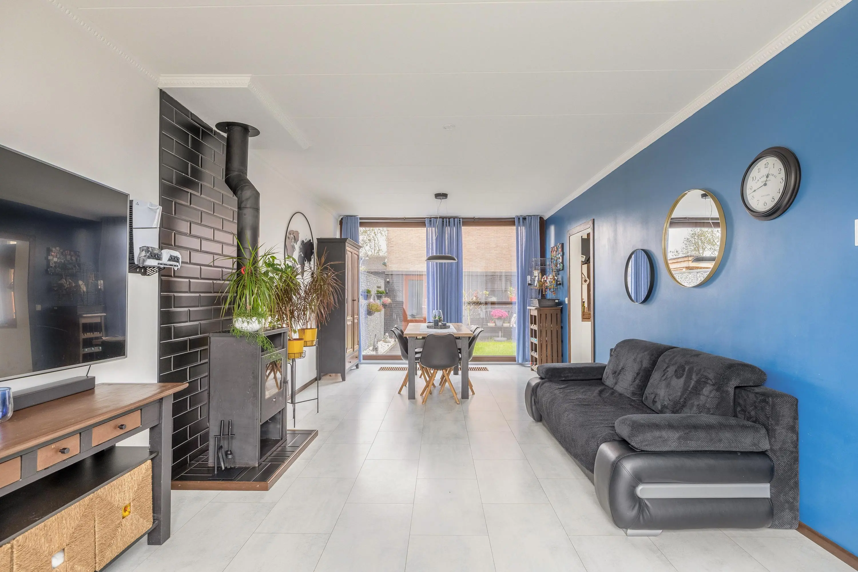De living geniet van volop daglicht dankzij het grote raam aan de voorzijde en de schuifpui aan de achterzijde. Zowel aan de voor- als achterzijde is de woonkamer voorzien van zonneschermen, waardoor u het lichtinval naar wens kunt reguleren. De woonkamer is ruim van opzet, met voldoende ruimte voor zowel een gezellige zithoek als een eethoek. De houtkachel zorgt voor extra sfeer en warmte. Via de schuifpui heeft u directe toegang tot de achtertuin, en vanuit de woonkamer loopt u door naar de halfopen keuken.