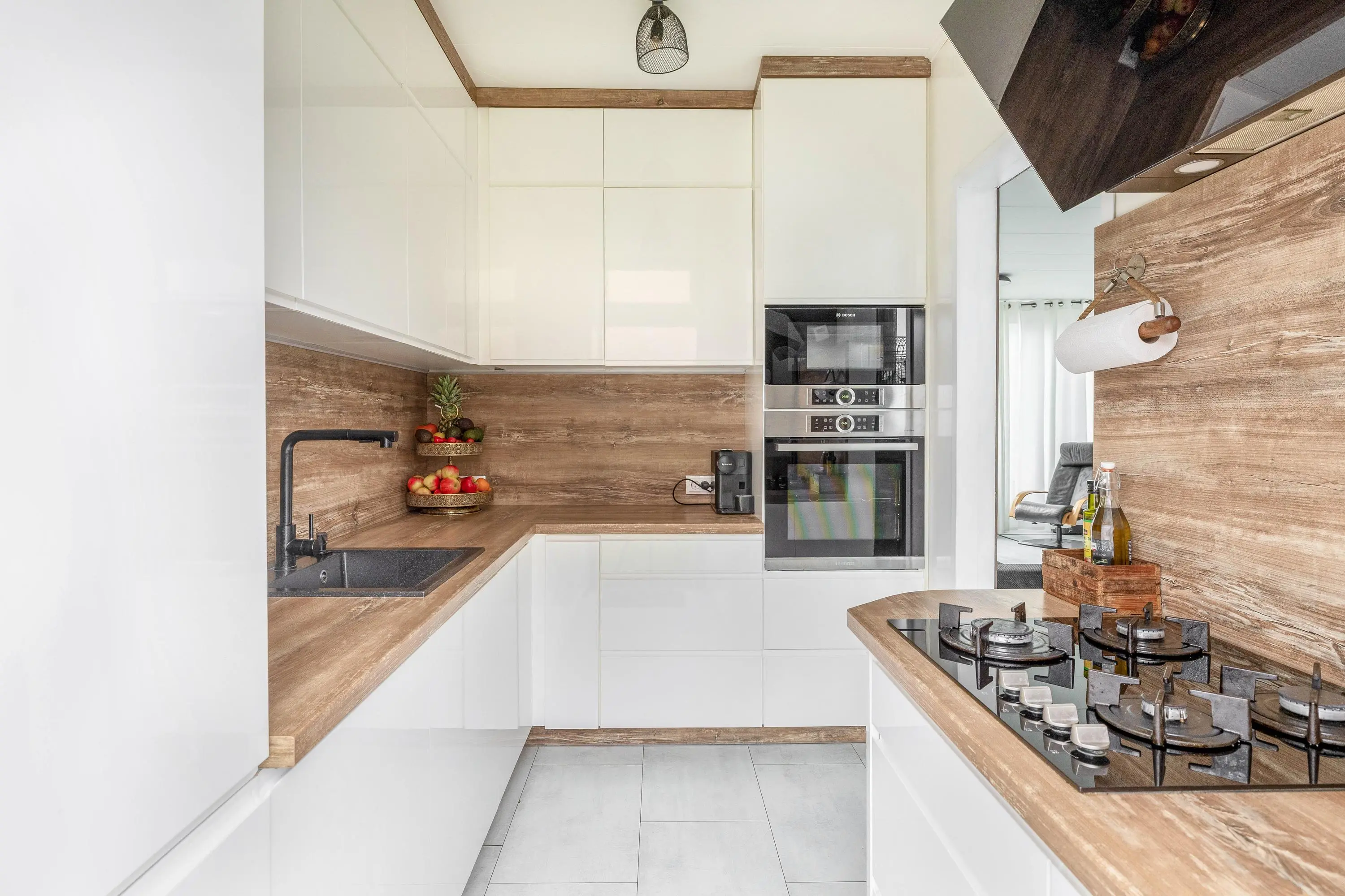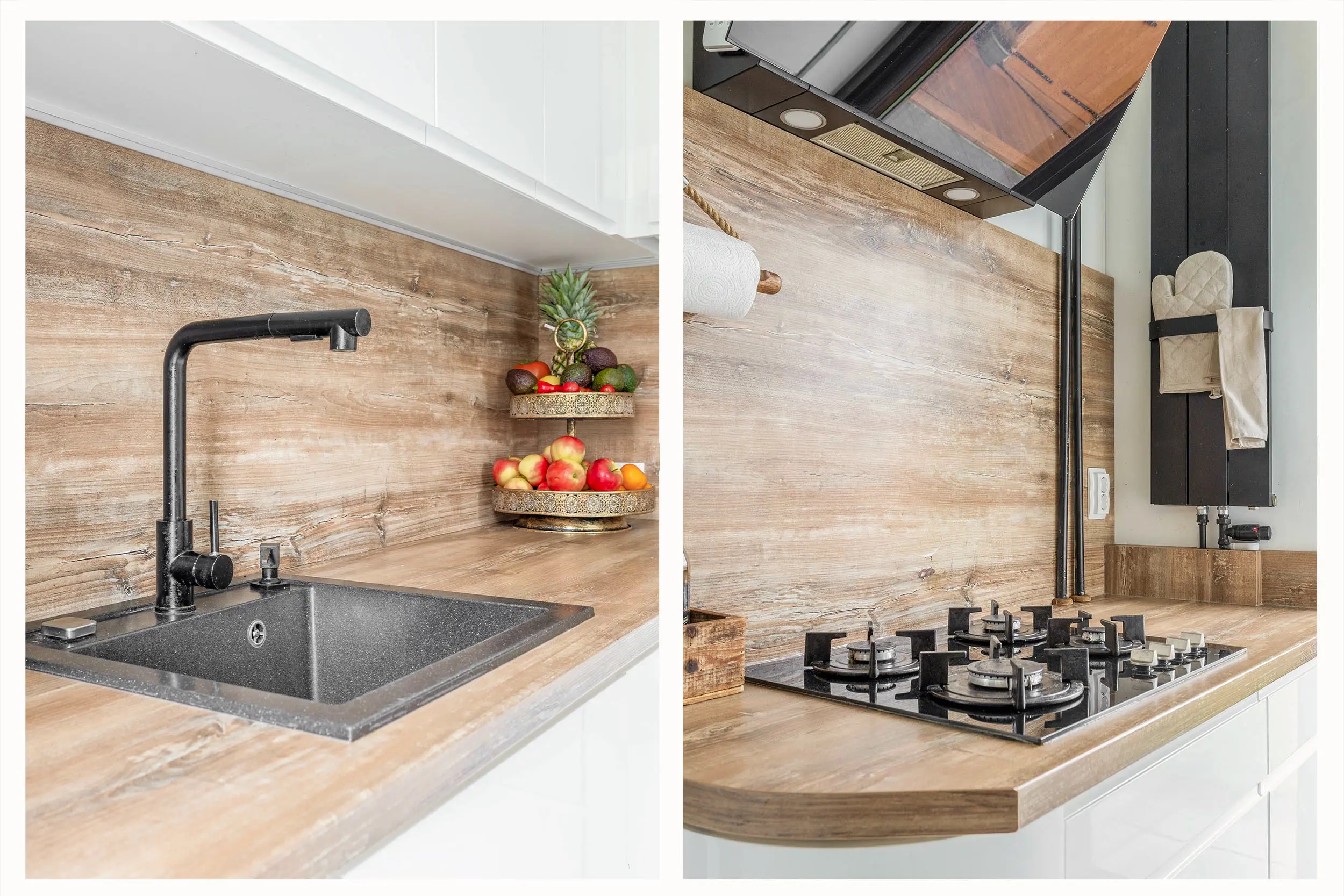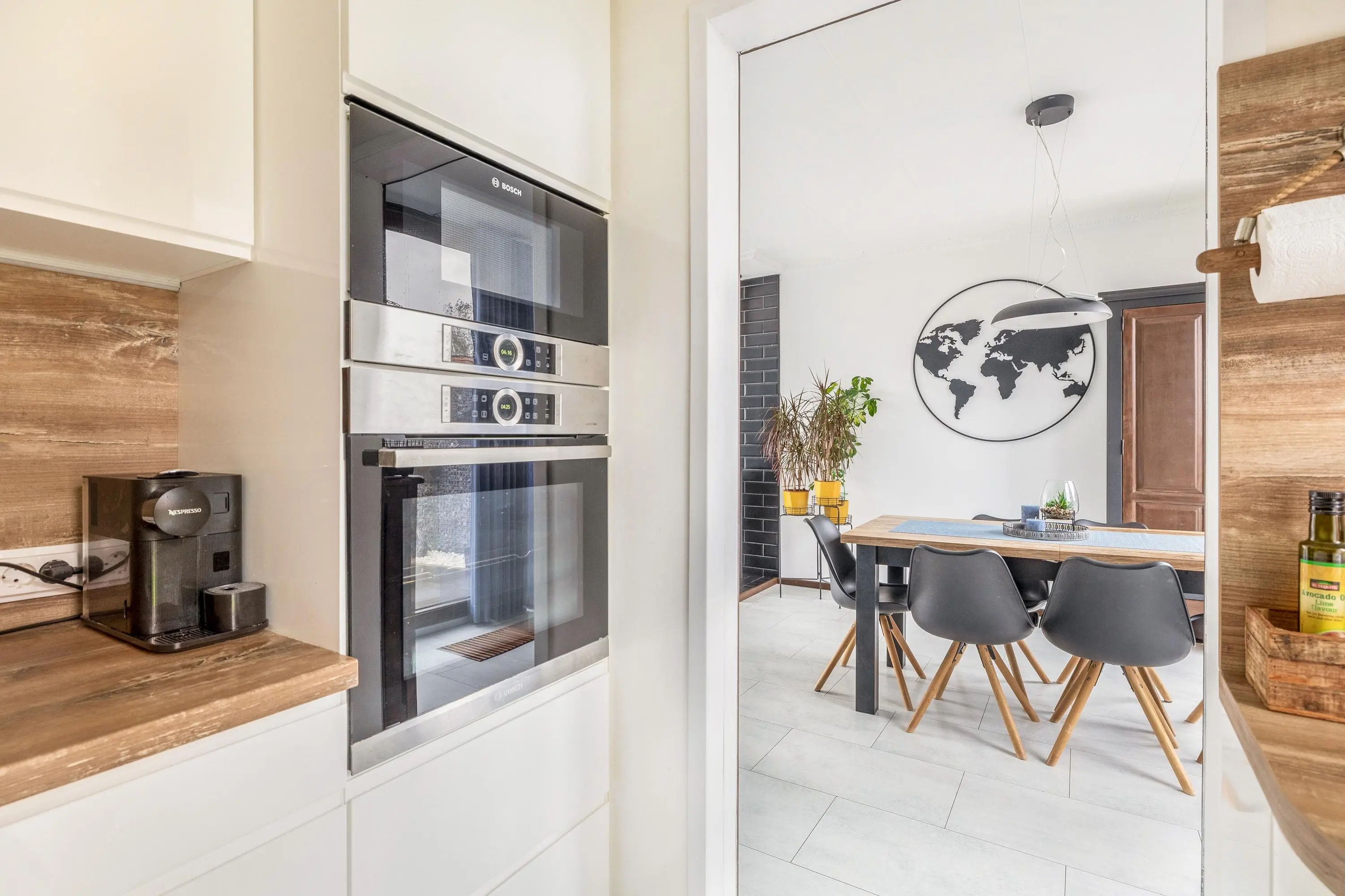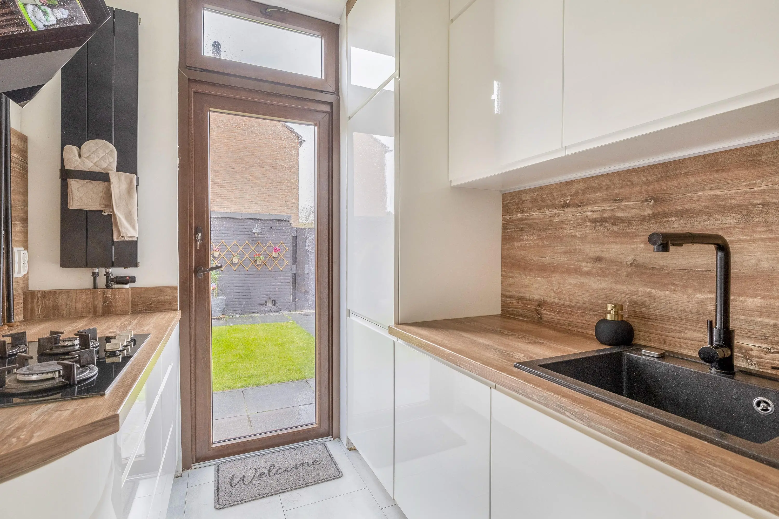 De moderne keuken, geplaatst in 2021, heeft een eigentijdse uitstraling en is voorzien van alle gemakken. Zo beschikt de keuken over een 4-pits gaskookplaat, afzuigkap, oven, magnetron, vaatwasmachine en koel-/vriescombinatie. Ook vanuit de keuken heeft u via een enkele deur toegang tot de achtertuin.