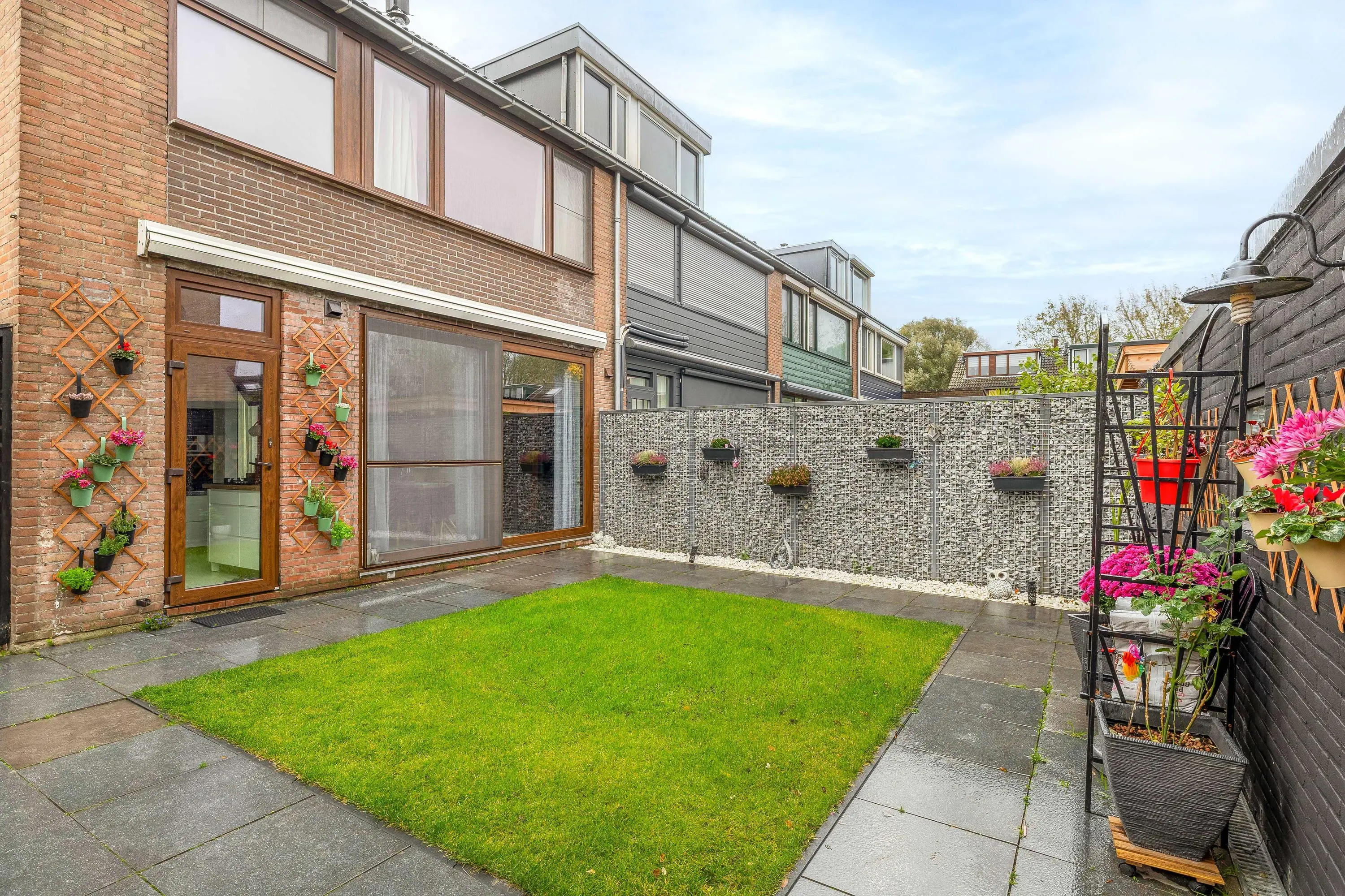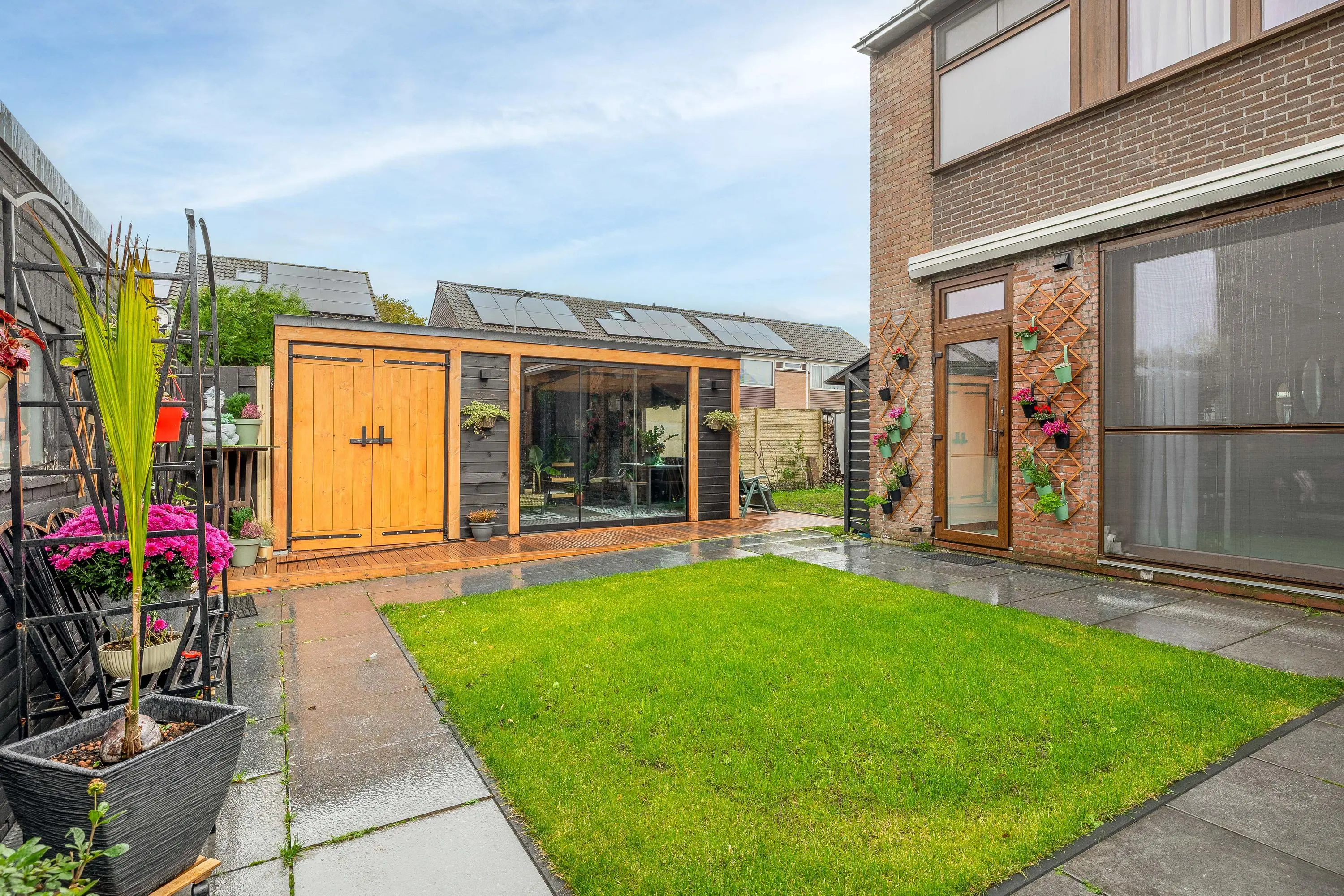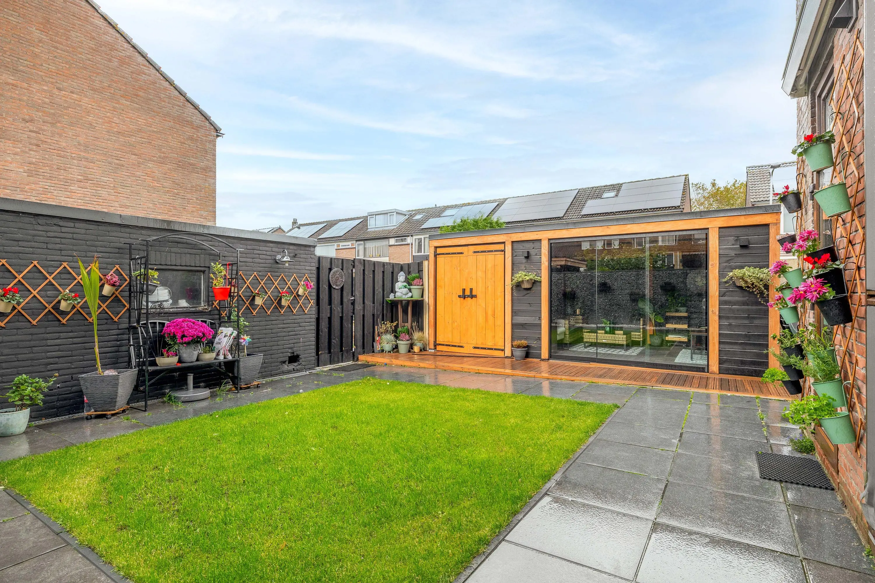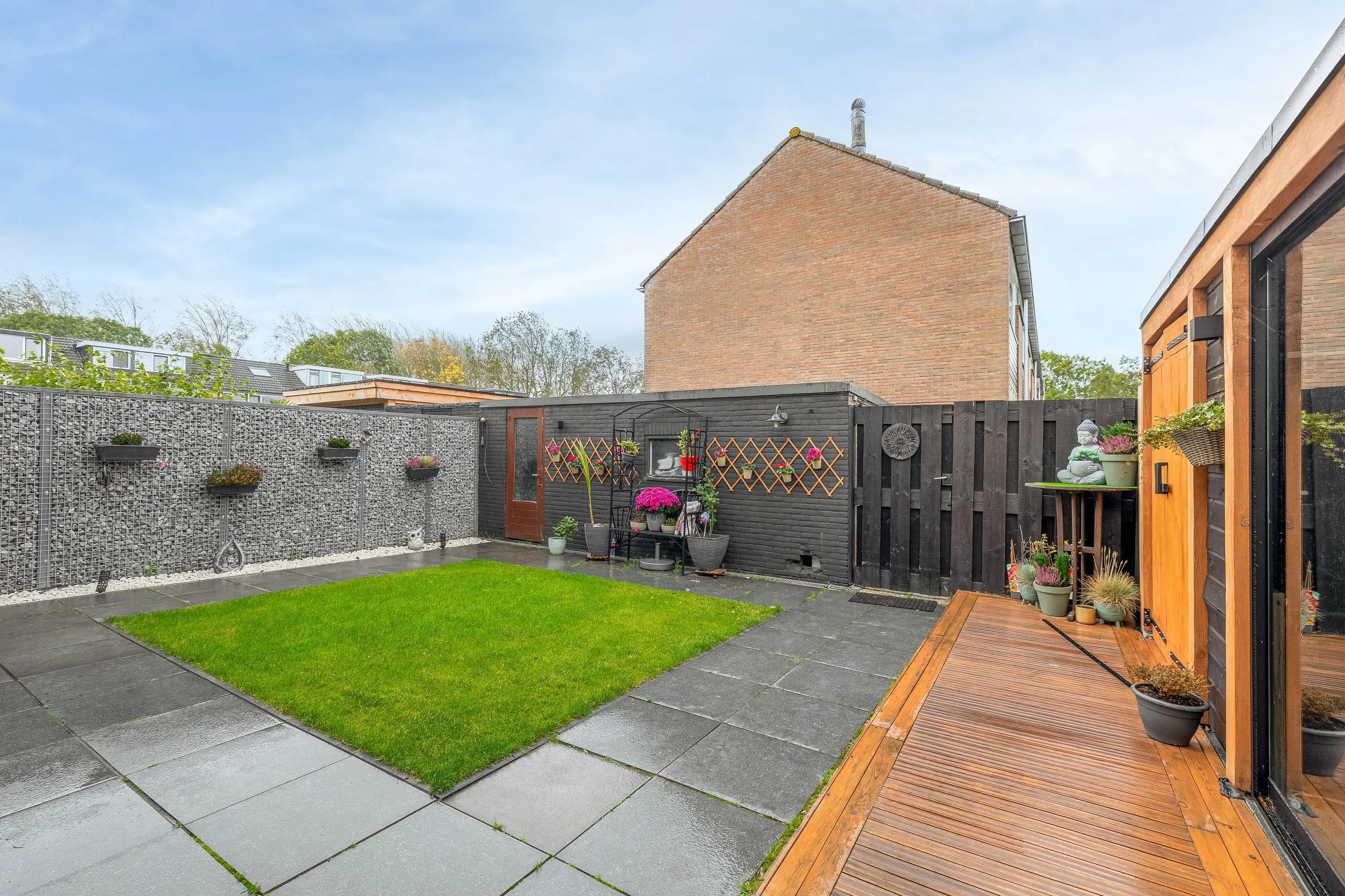 De achtertuin heeft een moderne uitstraling en is grotendeels bestraat, met in het midden een vierkant gazon. Vanuit de tuin heeft u toegang tot zowel het tuinhuis als de garage.