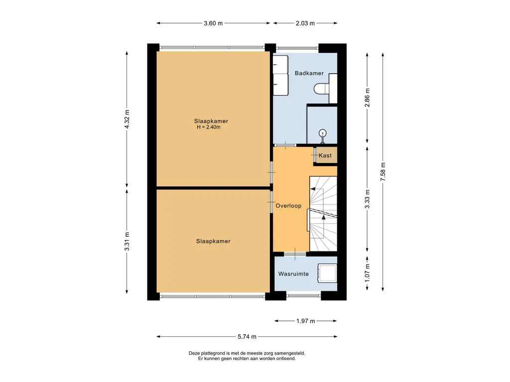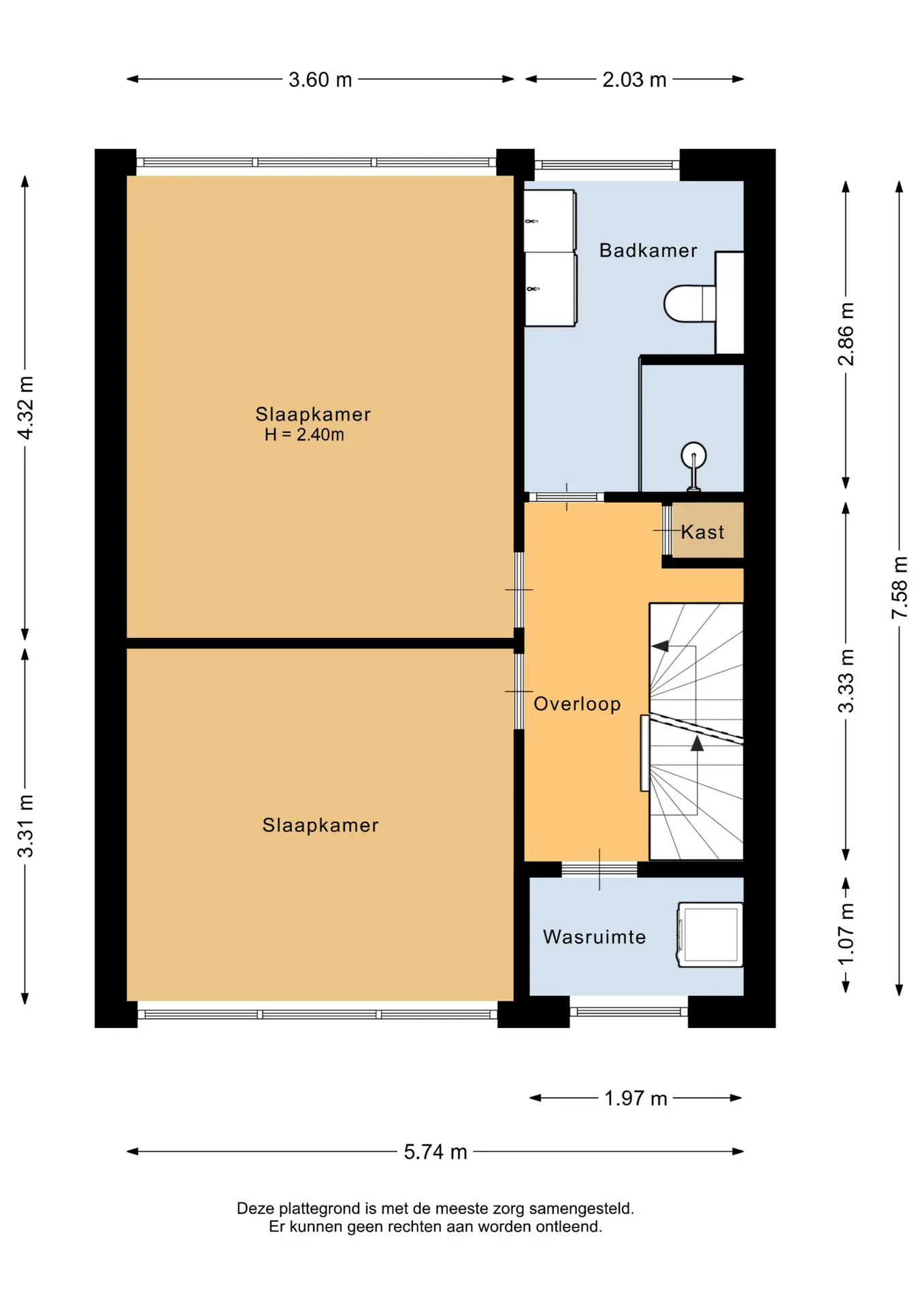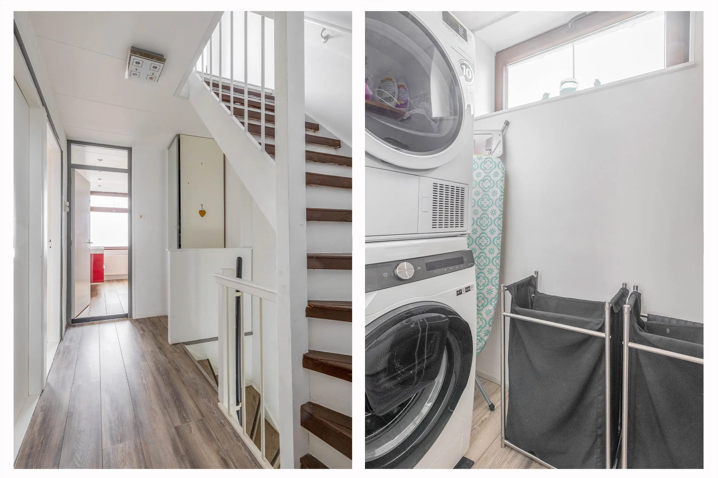 De overloop is voorzien van een nette laminaatvloer die naadloos doorloopt in beide slaapkamers. Op de overloop bevindt zich een handige opbergkast en heeft u toegang tot de twee slaapkamers, de badkamer en een separate wasruimte.