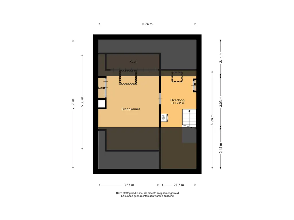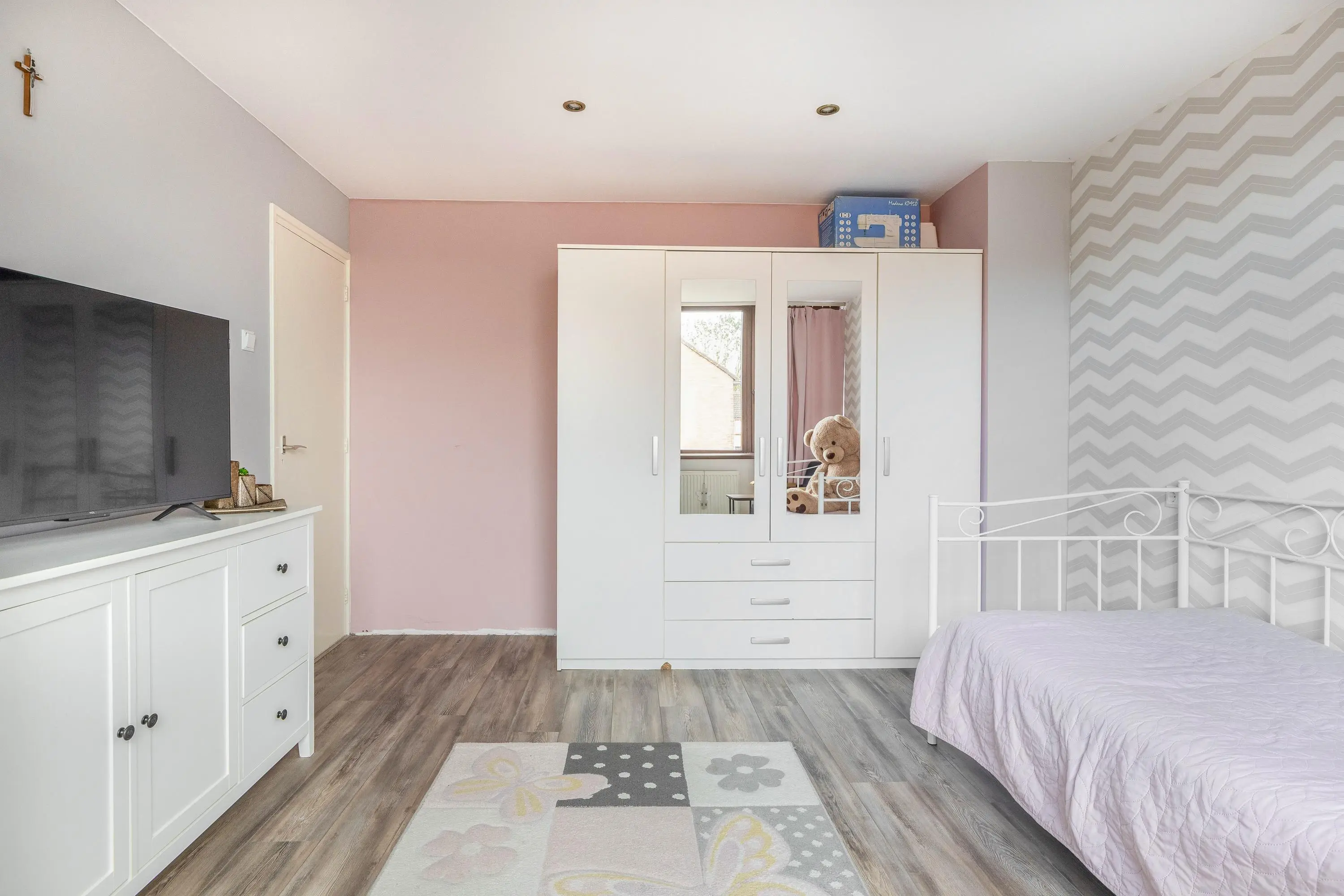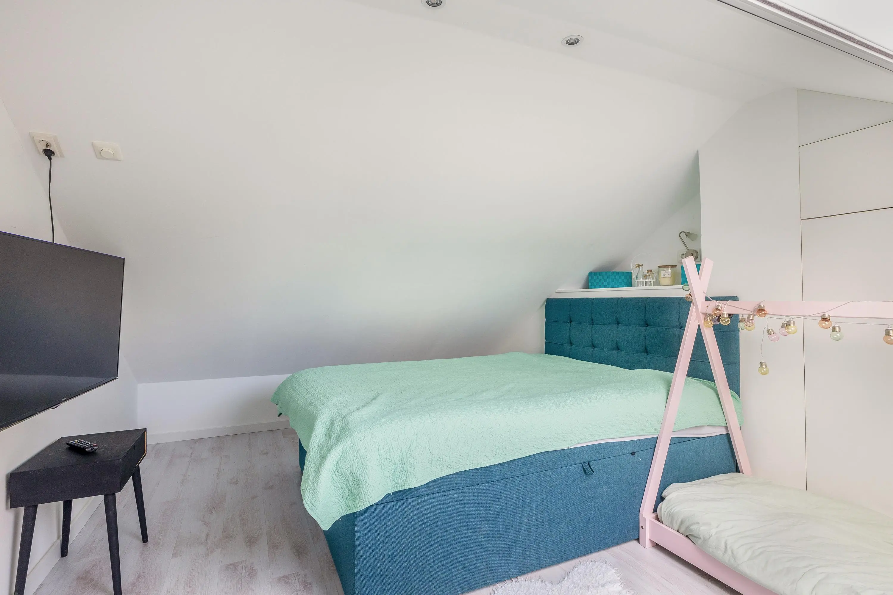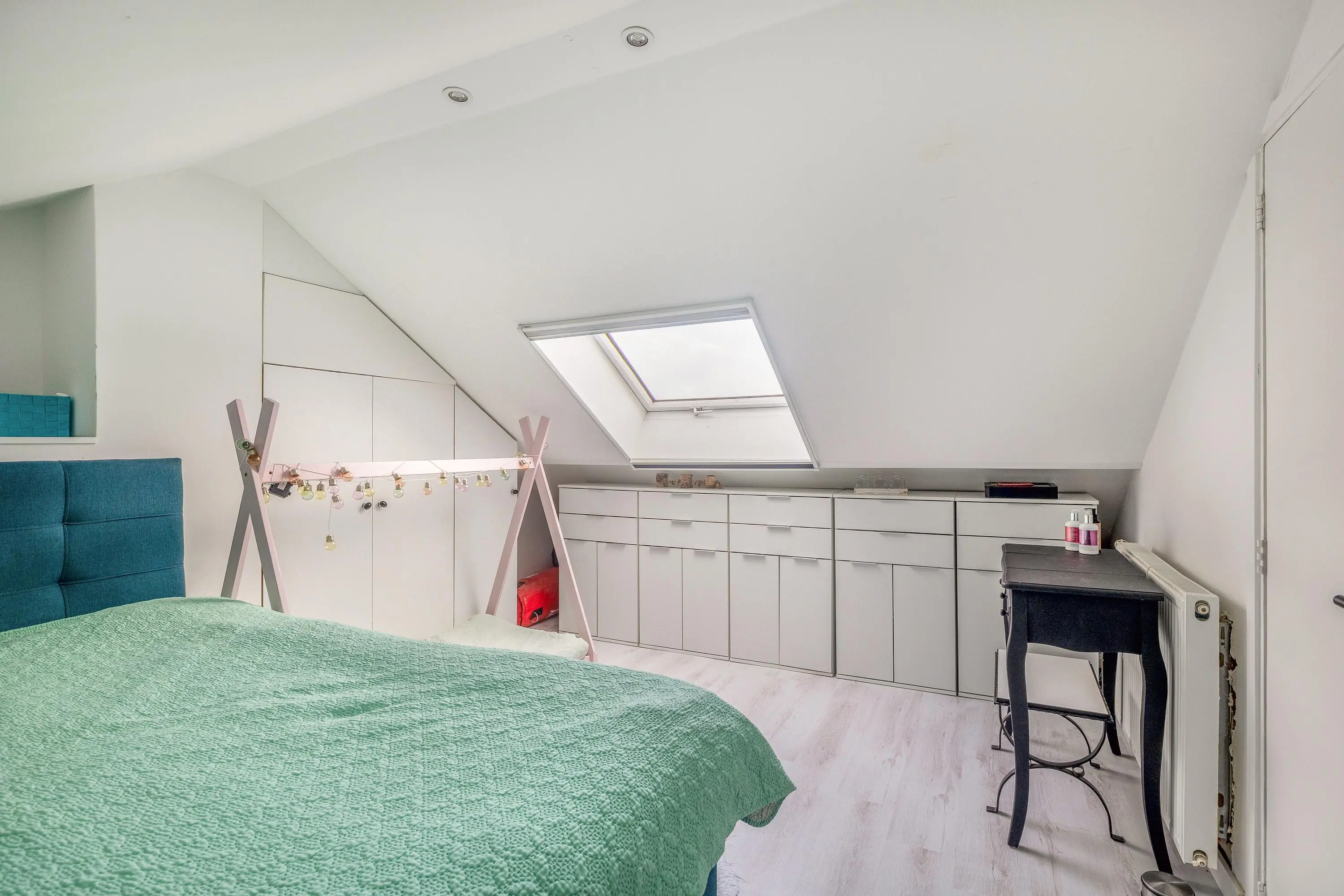 De derde slaapkamer is ruim van opzet en beschikt over een praktische inbouwkast. Ook hier zorgt een dakraam voor prettig daglicht. Het plafond is bovendien voorzien van ingebouwde spotverlichting.
