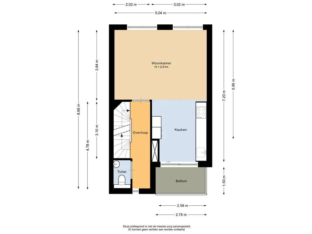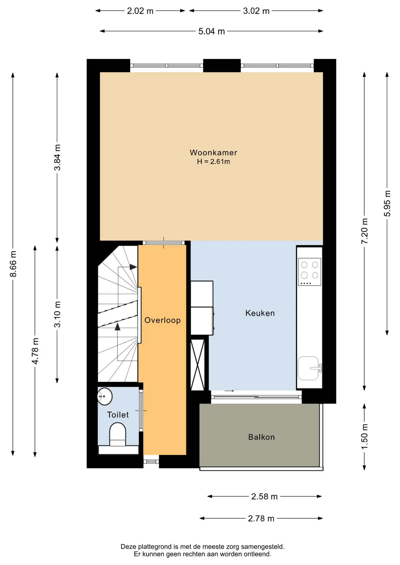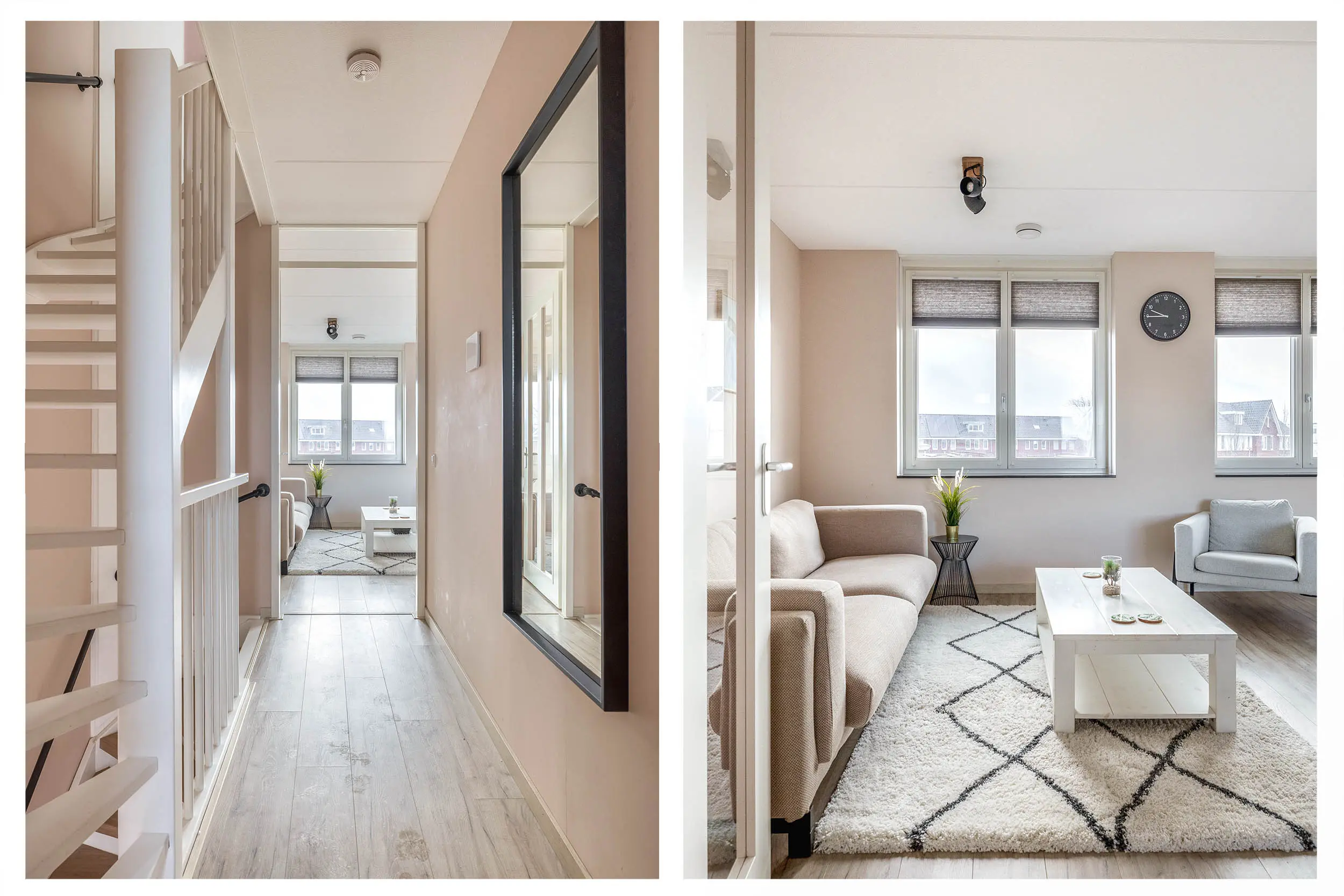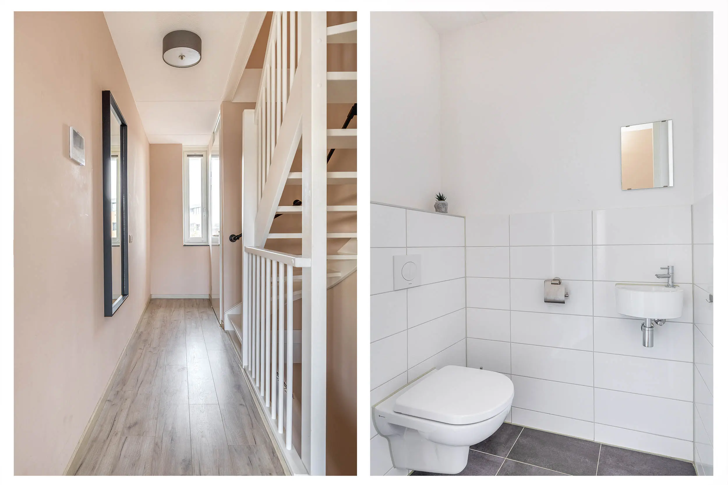 Vanaf de overloop heeft u toegang tot het separate toilet met fonteintje, de trapopgang naar de tweede verdieping en de leefruimte.