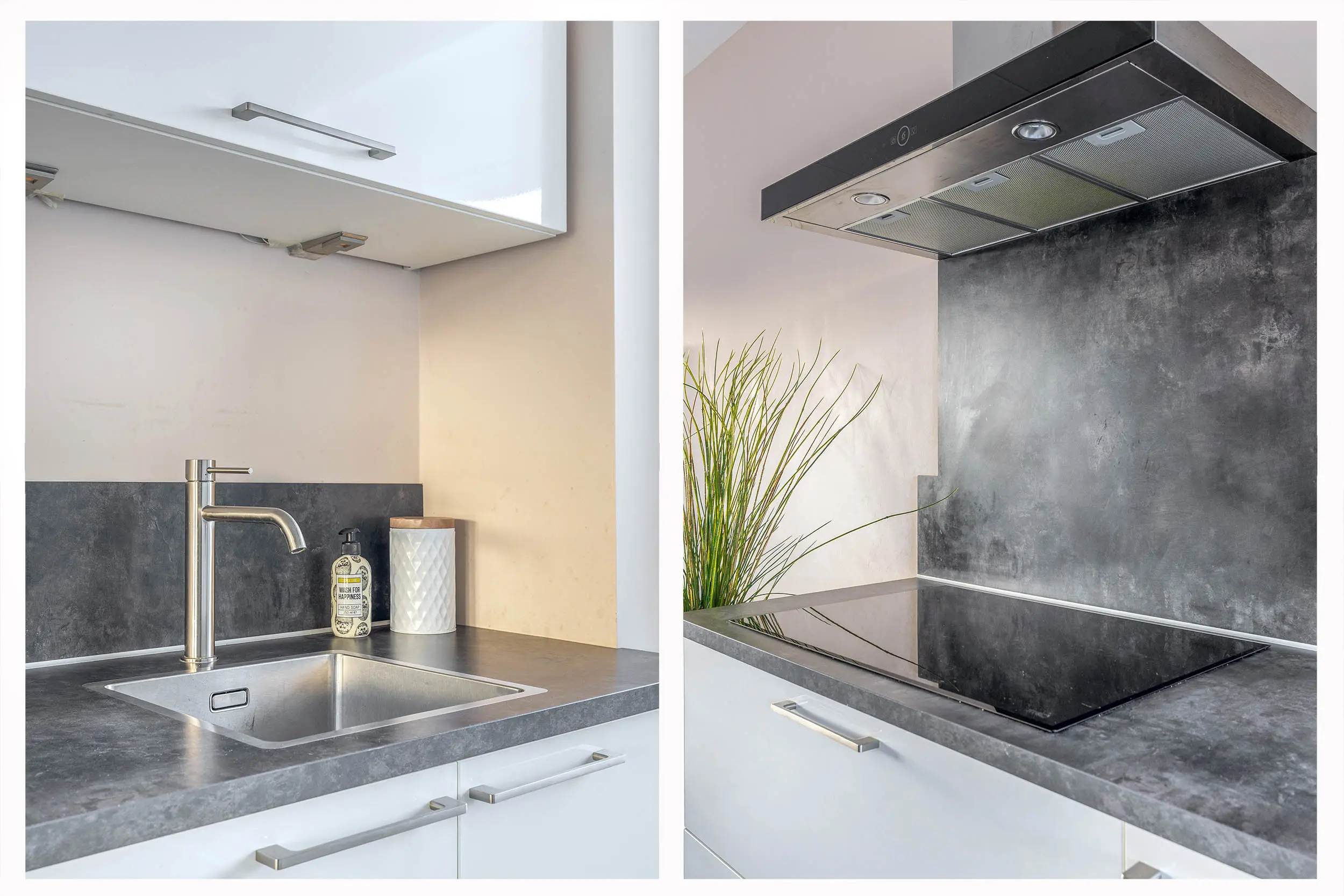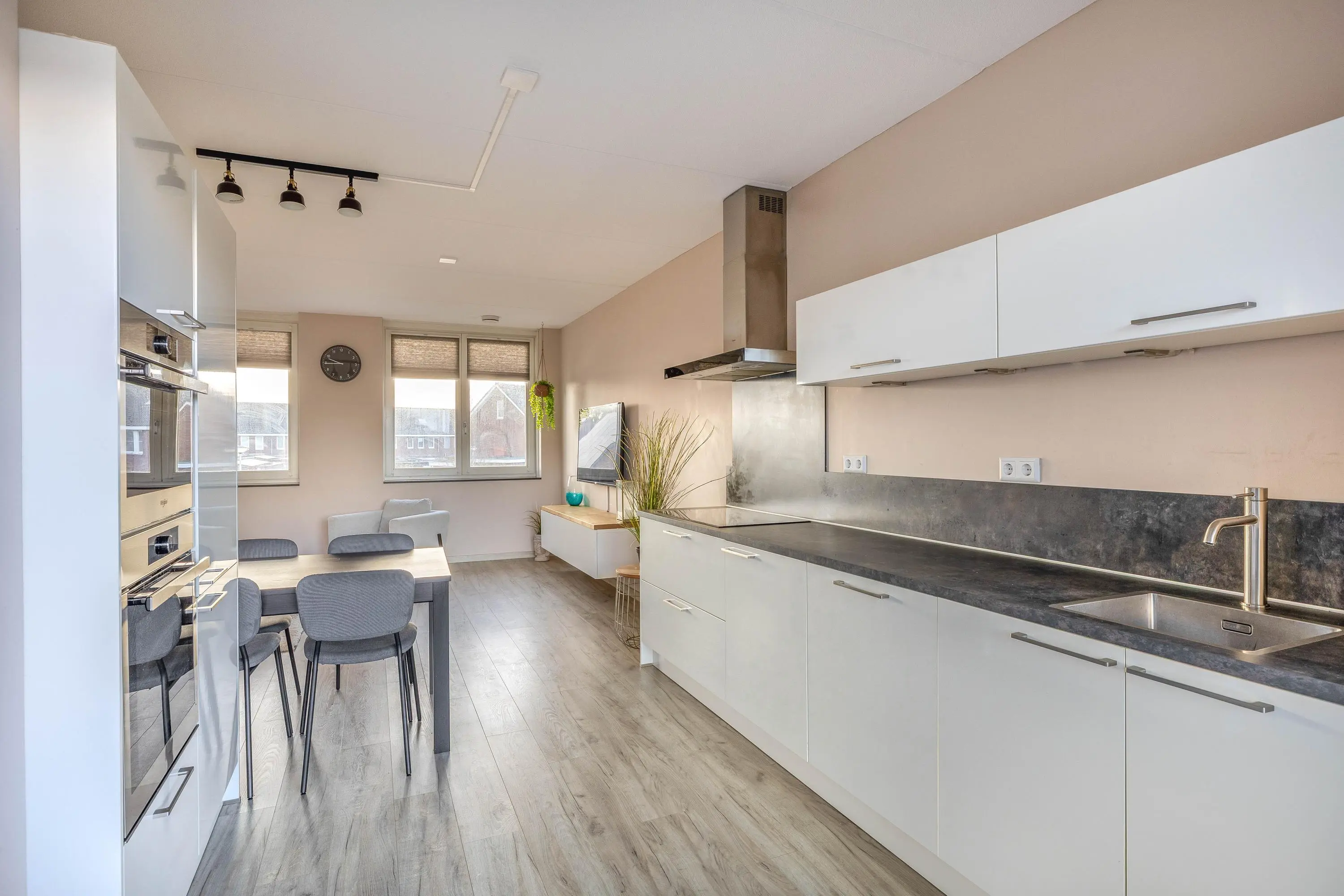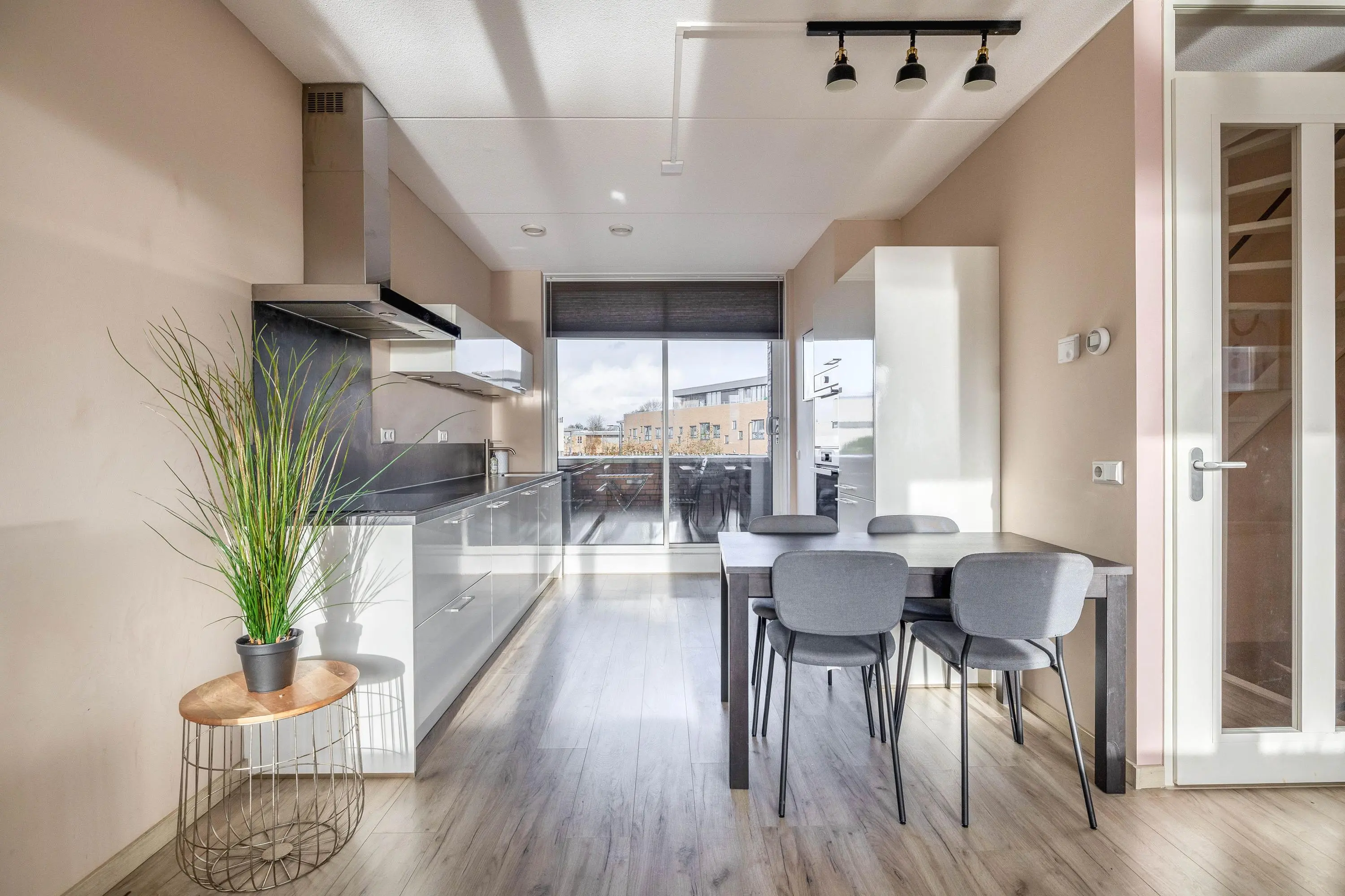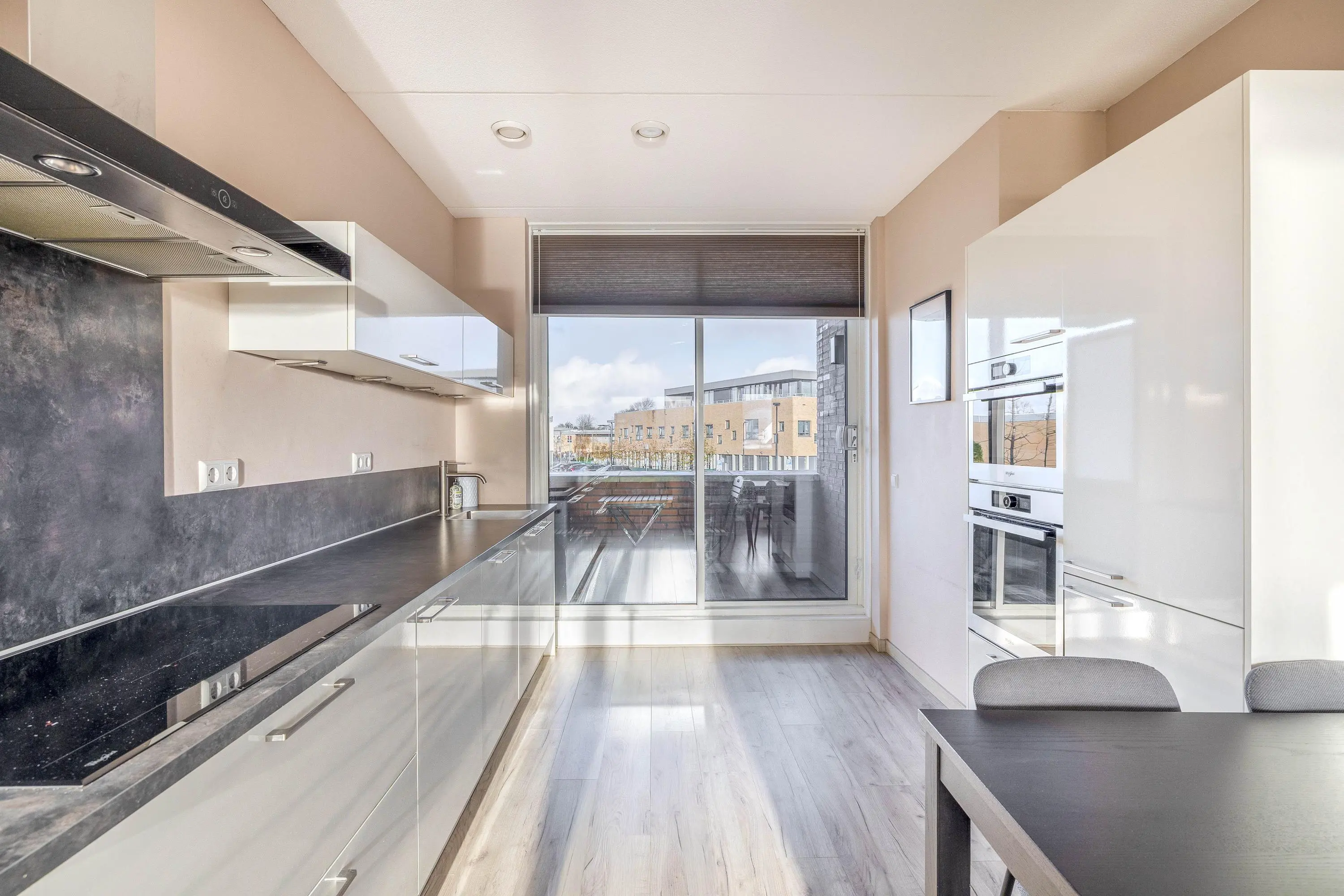 De moderne keuken is compleet uitgerust met een inductiekookplaat, afzuigkap, magnetron, oven, vaatwasser en een koel-/vriescombinatie. Aan de voorzijde vindt u de schuifpui die toegang geeft tot het balkon, waar u fijn van het buitenleven kunt genieten.