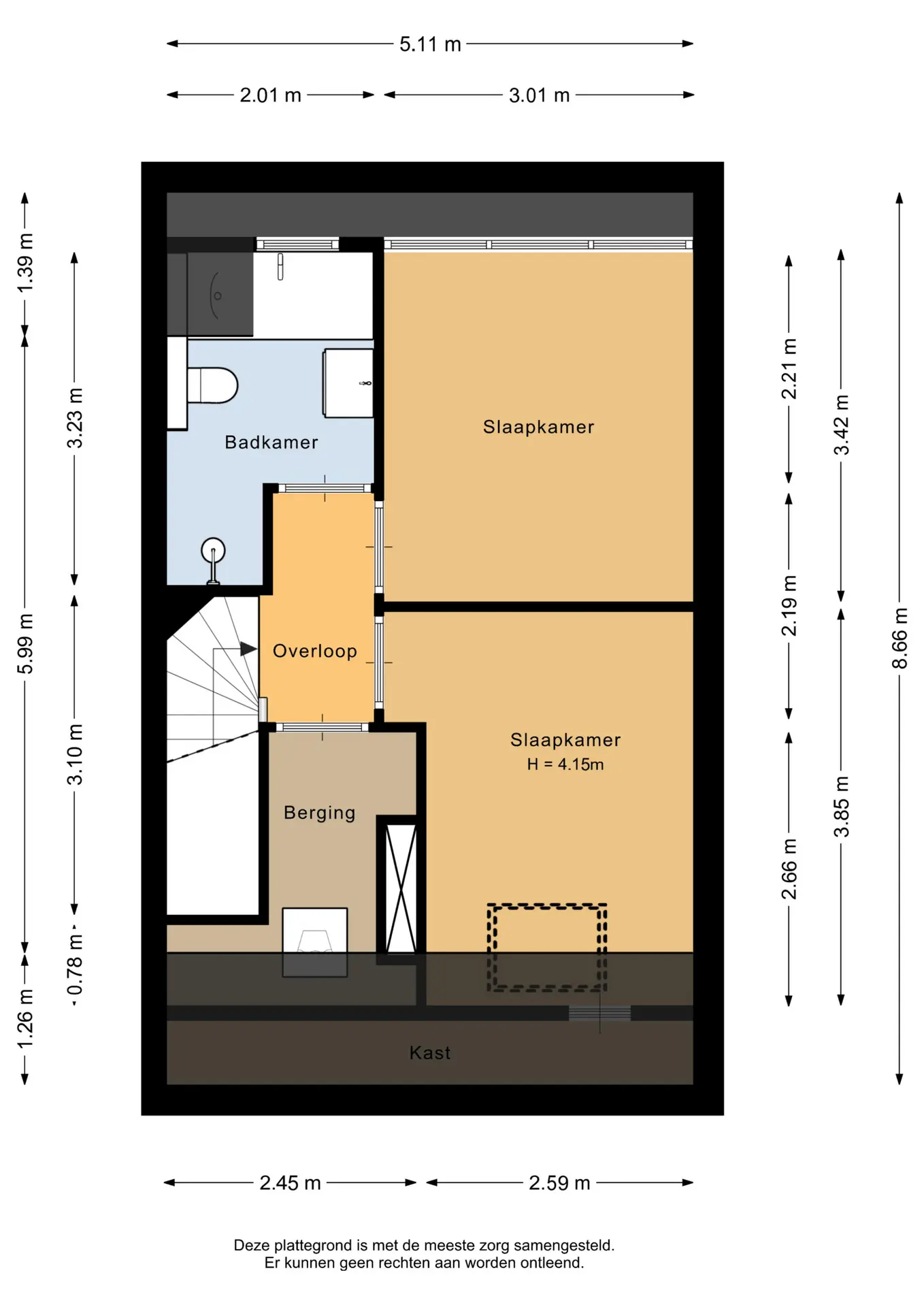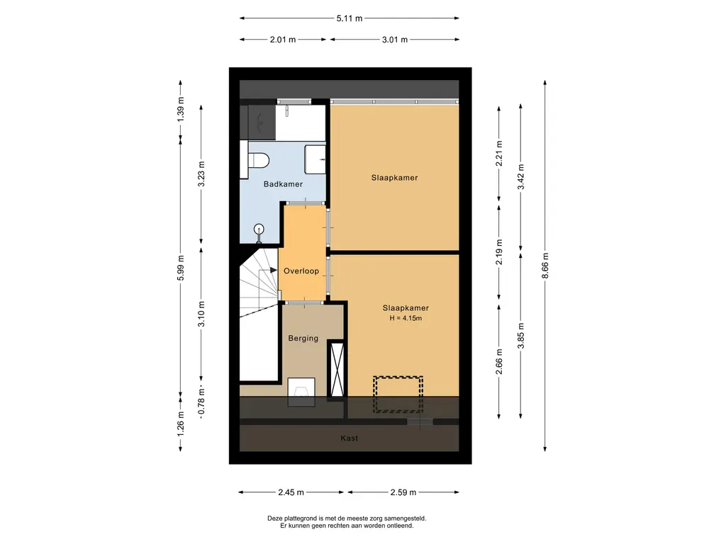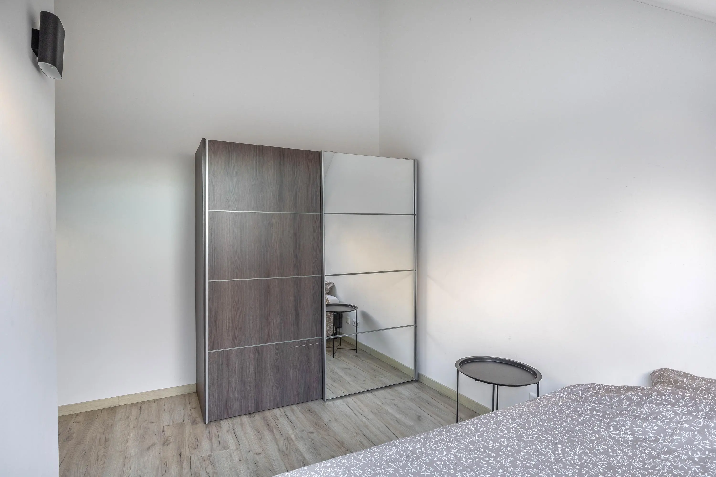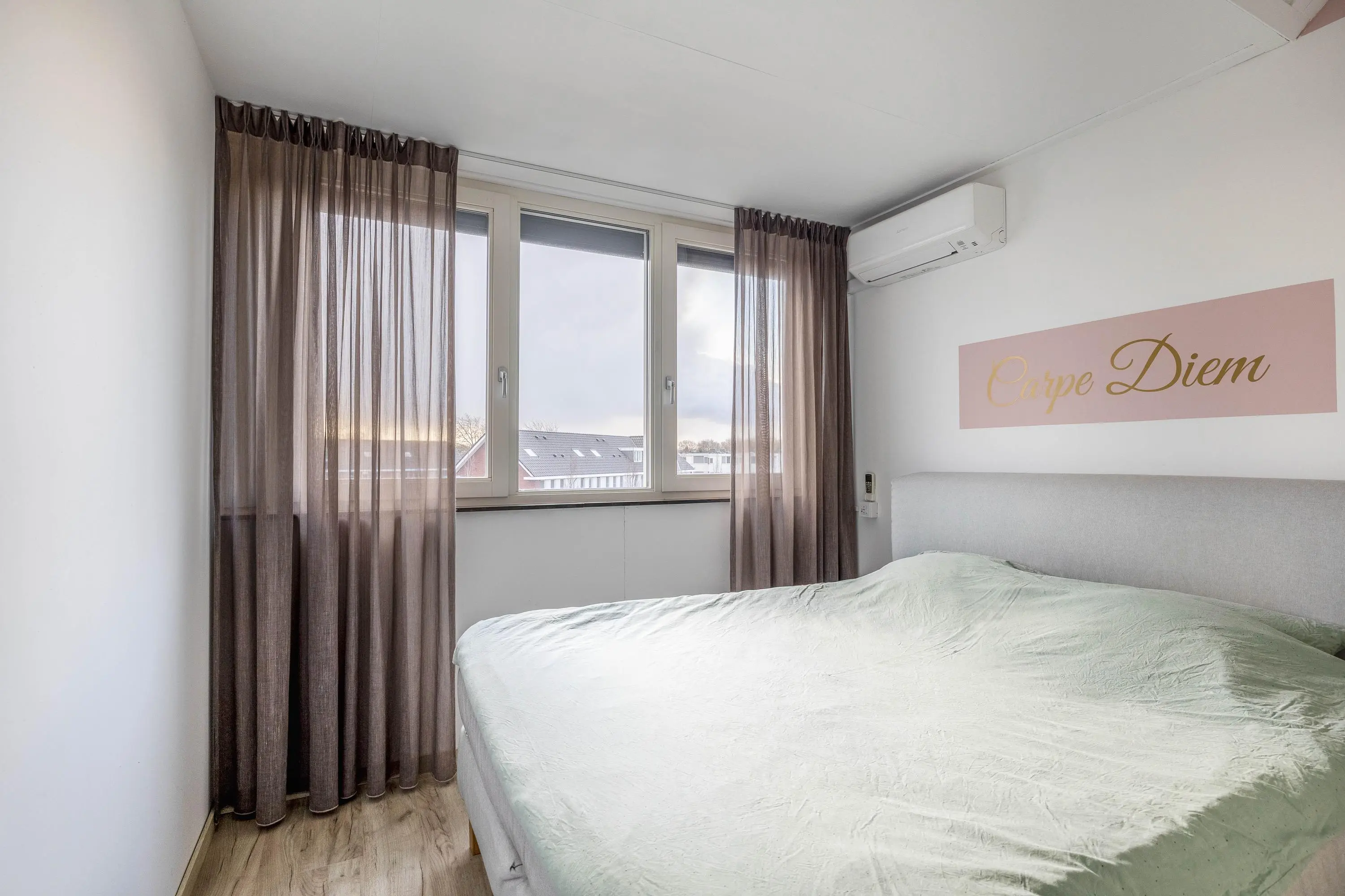 De hoofdslaapkamer ligt aan de achterzijde en heeft een oppervlakte van circa 10m². Deze kamer is daarnaast voorzien van airconditioning voor extra comfort. De tweede slaapkamer ligt aan de voorzijde, meet eveneens ongeveer 10m² en is uitgerust met een dakraam en bergruimte achter het knieschot.