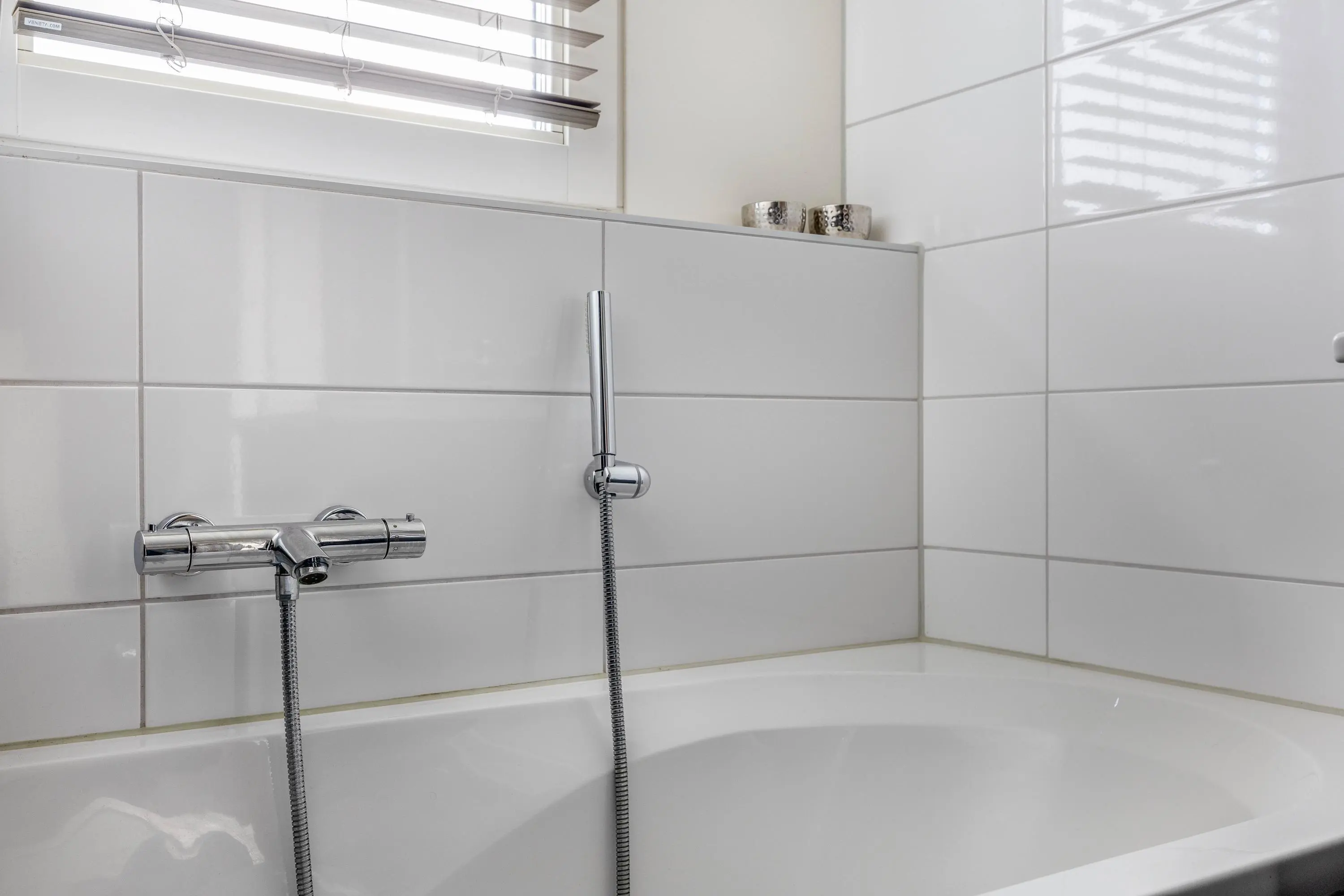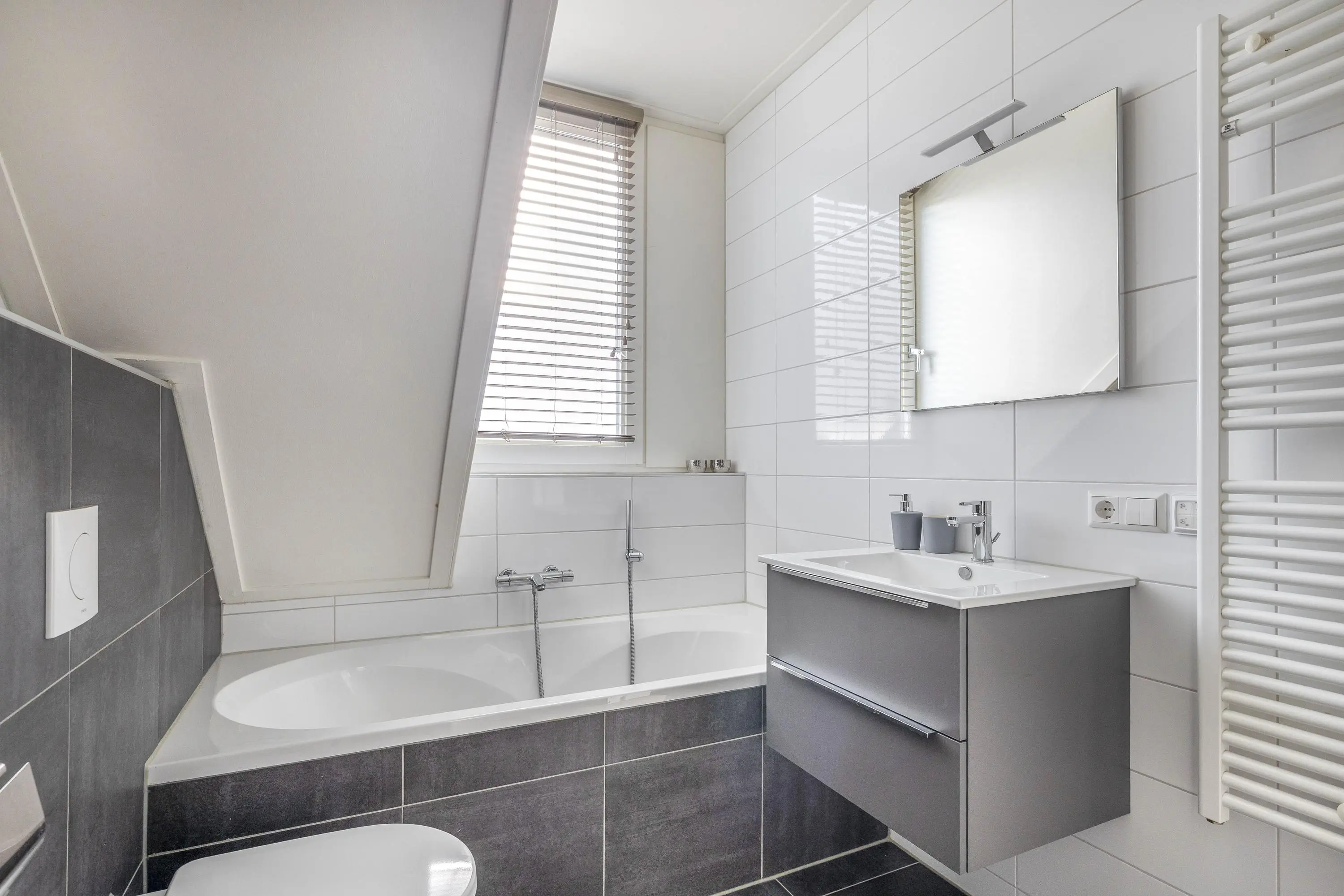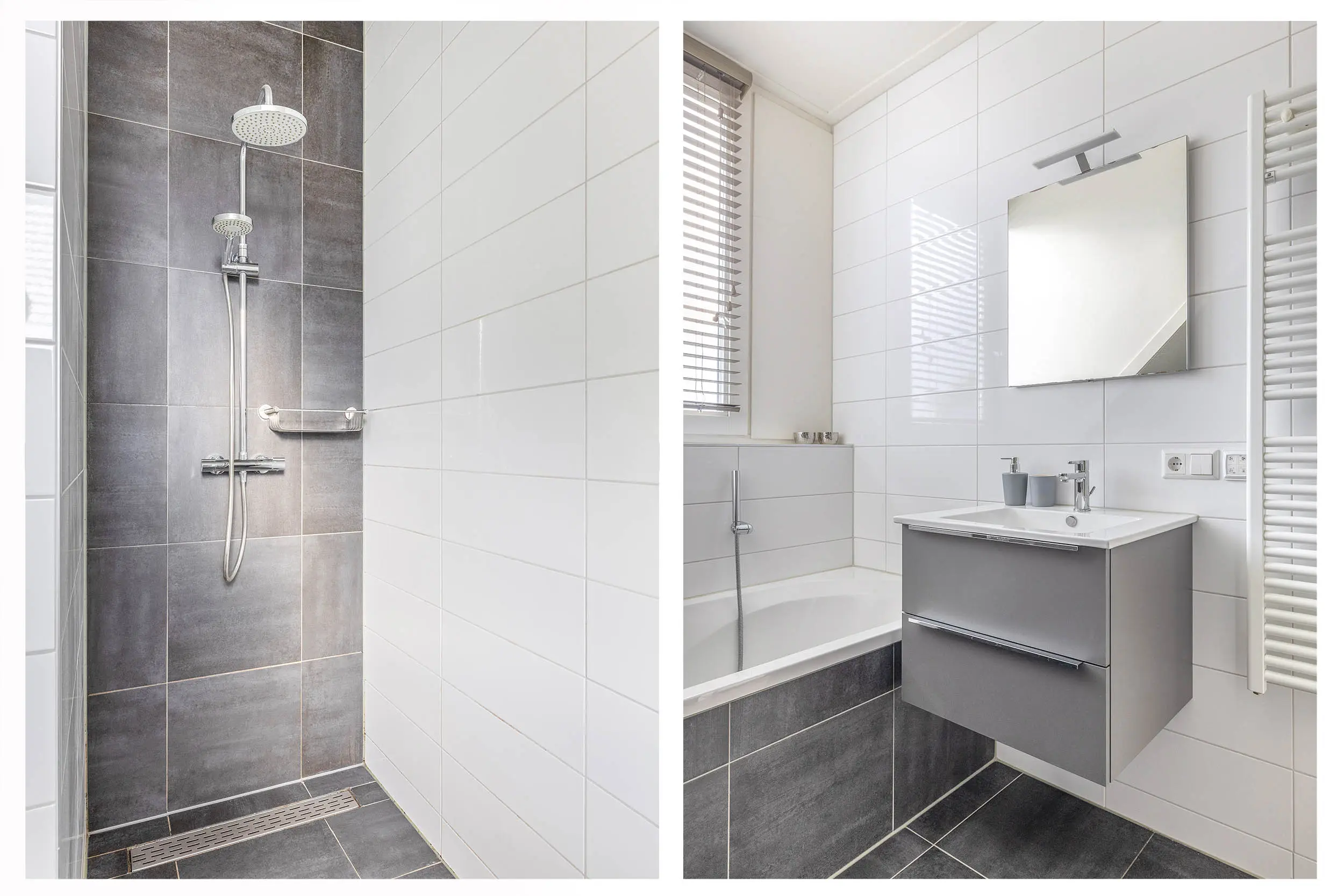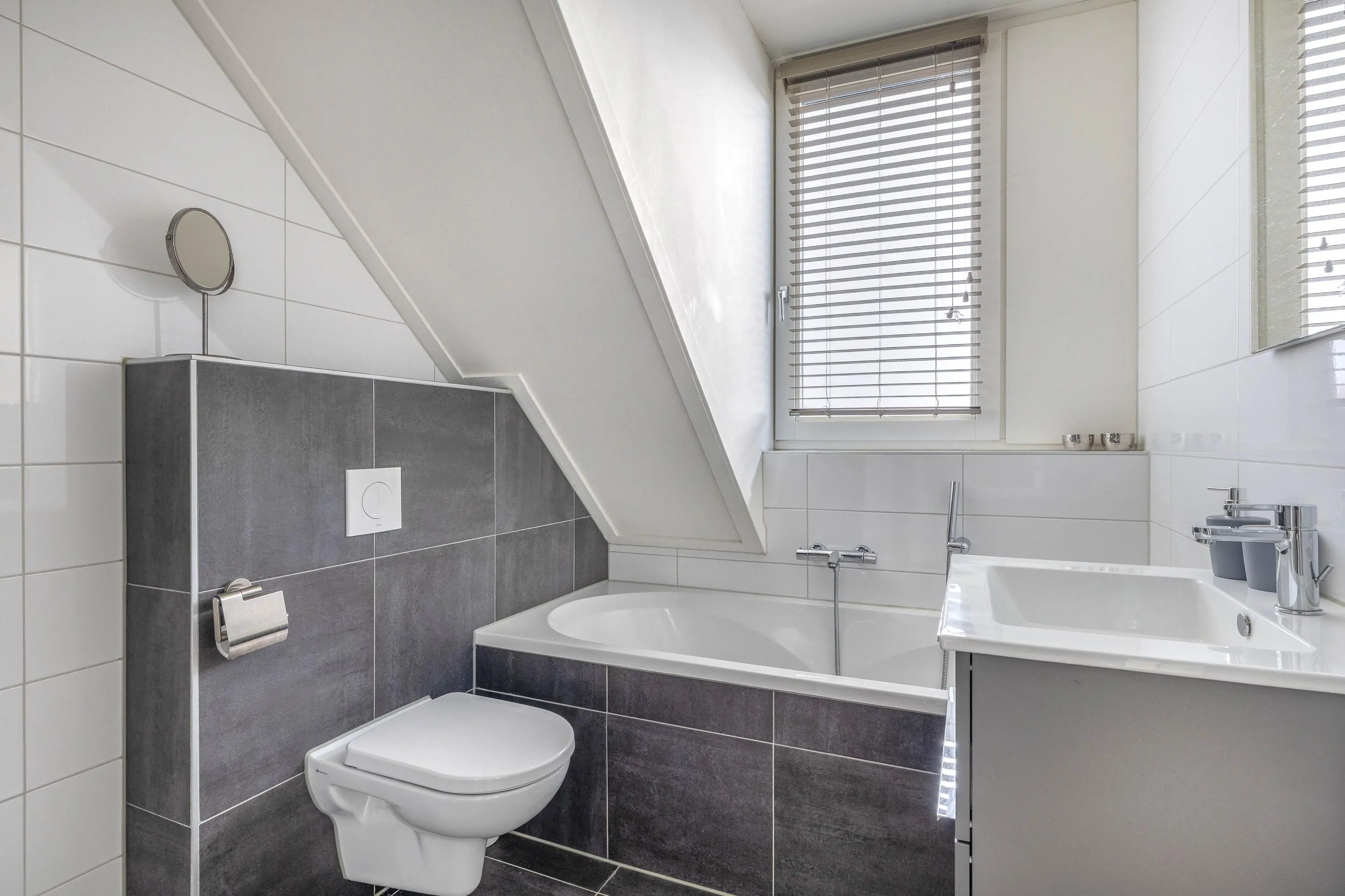De badkamer is netjes afgewerkt en beschikt over een inloopdouche, ligbad, toilet en een modern wastafelmeubel.