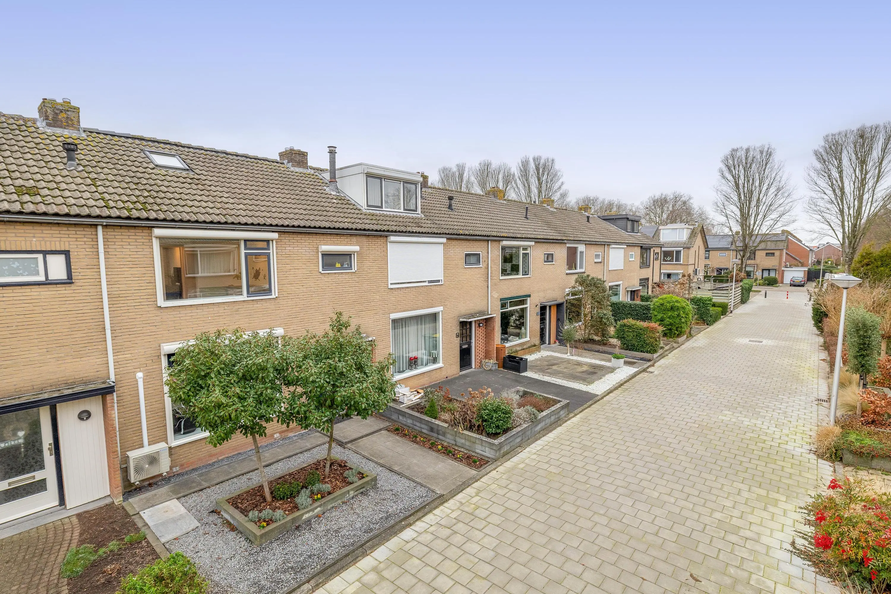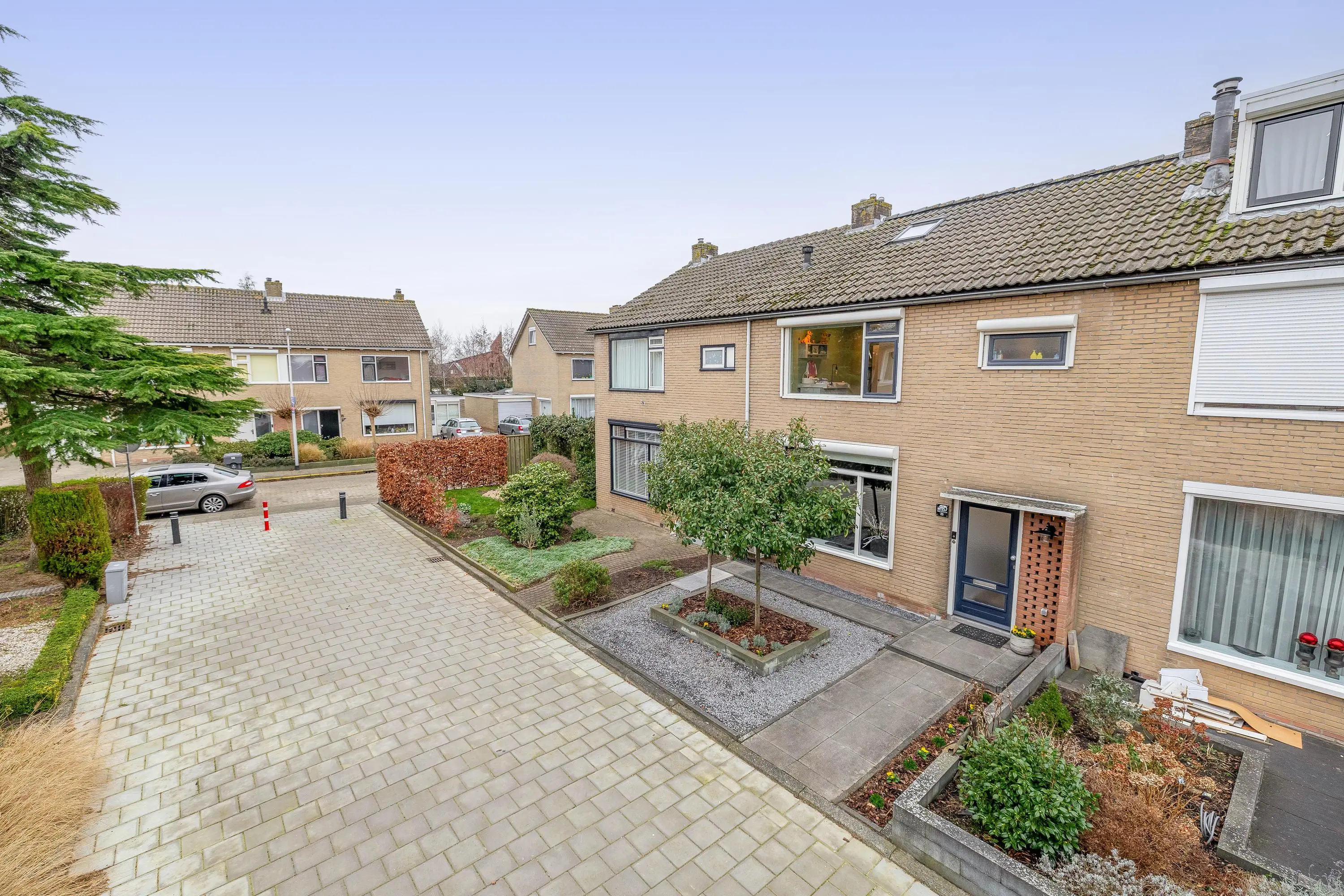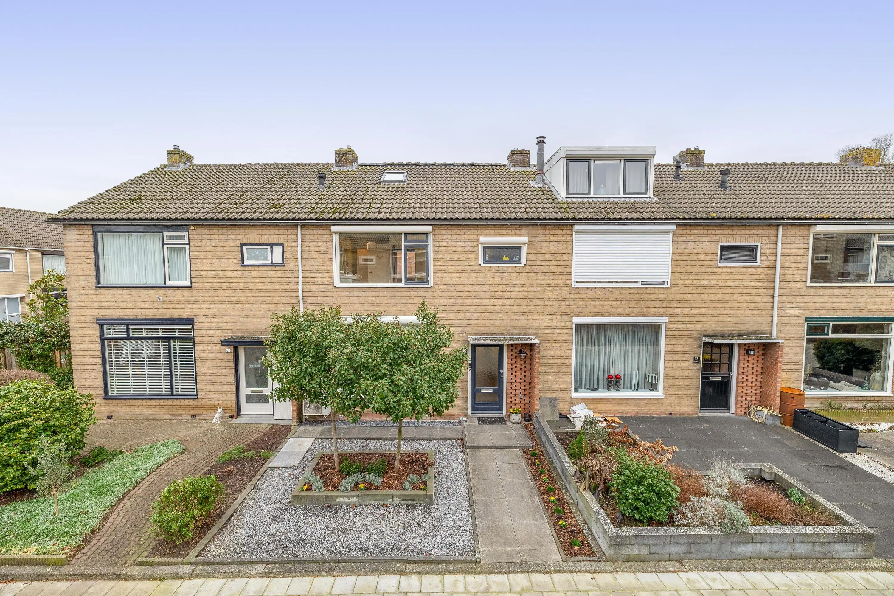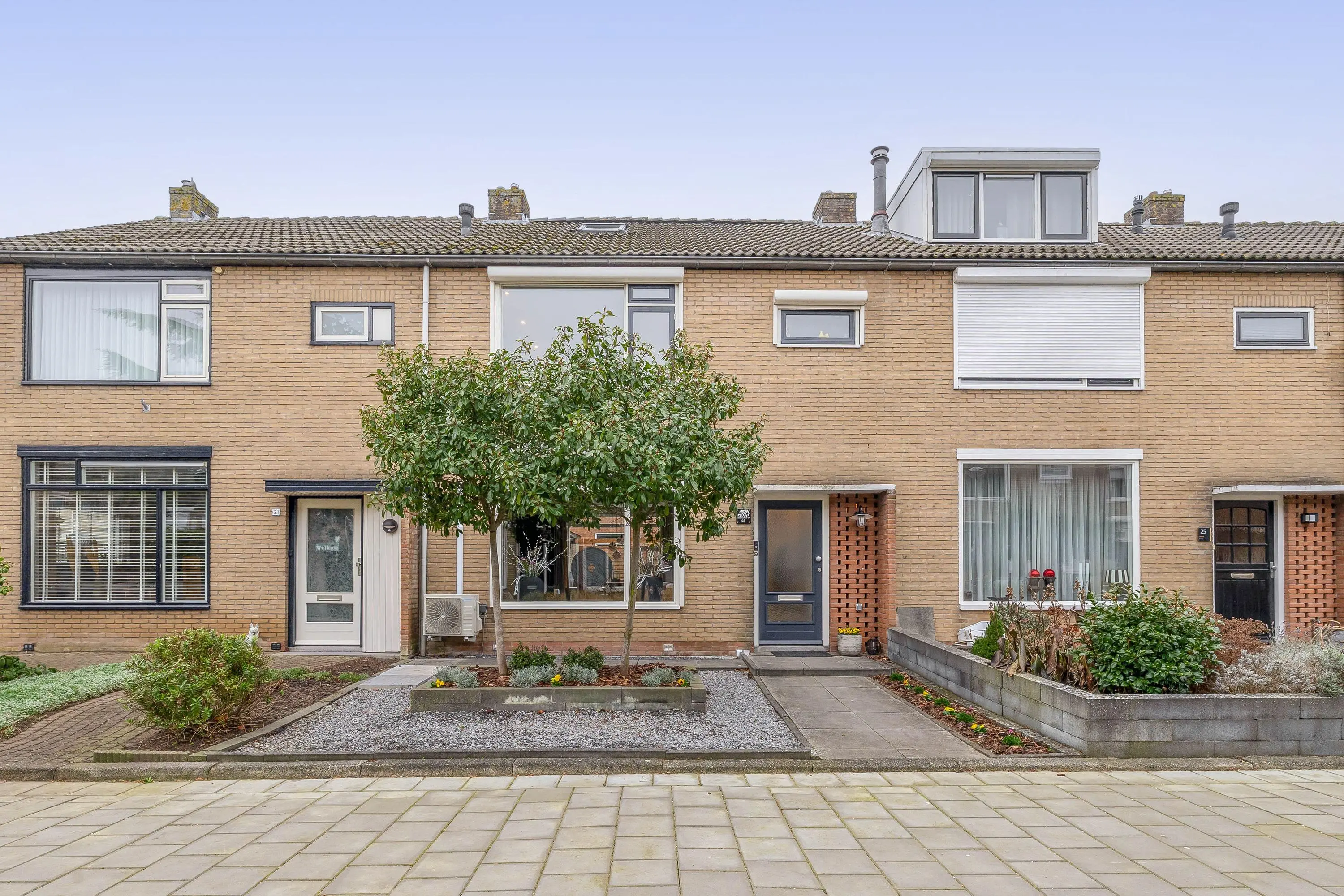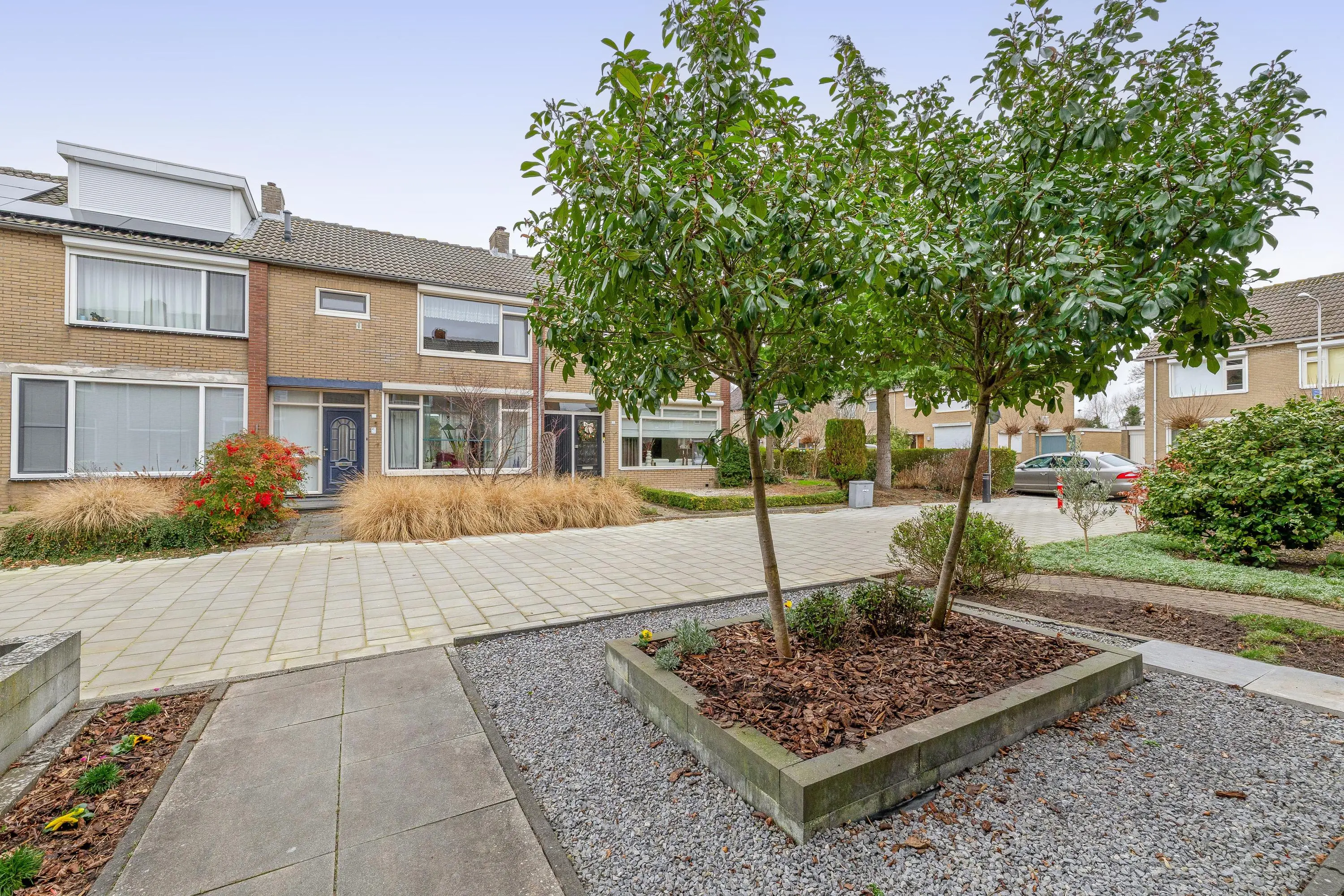 De voortuin is fraai aangelegd met sierbestrating, grind en groene beplanting.