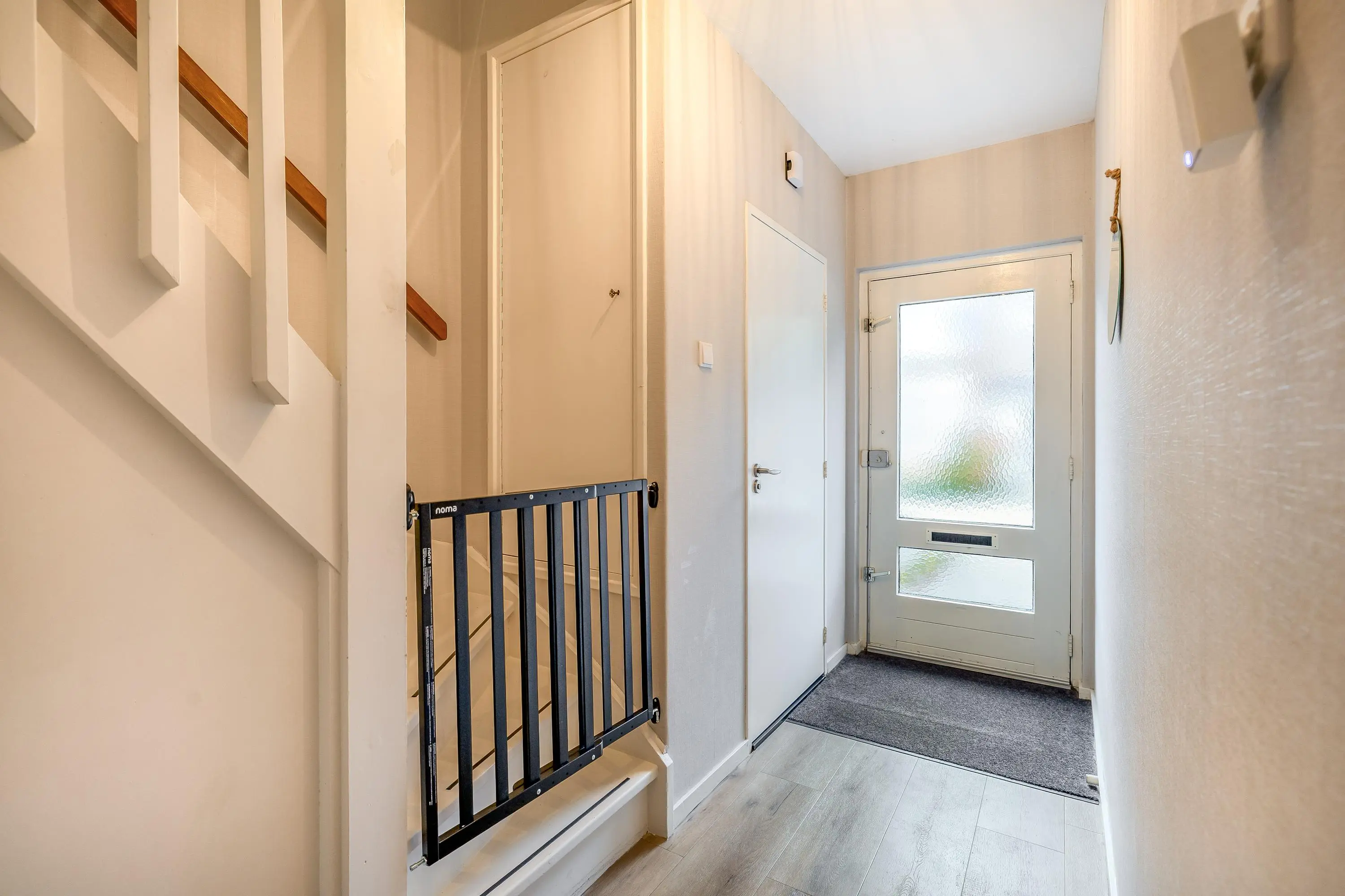 De entree/hal is voorzien van een nette PVC-vloer die doorloopt over de gehele begane grond en is uitgerust met comfortabele vloerverwarming. In de hal bevinden zich het separate toilet met fonteintje, de meterkast en de trapopgang naar de eerste verdieping met een praktische trapkast.