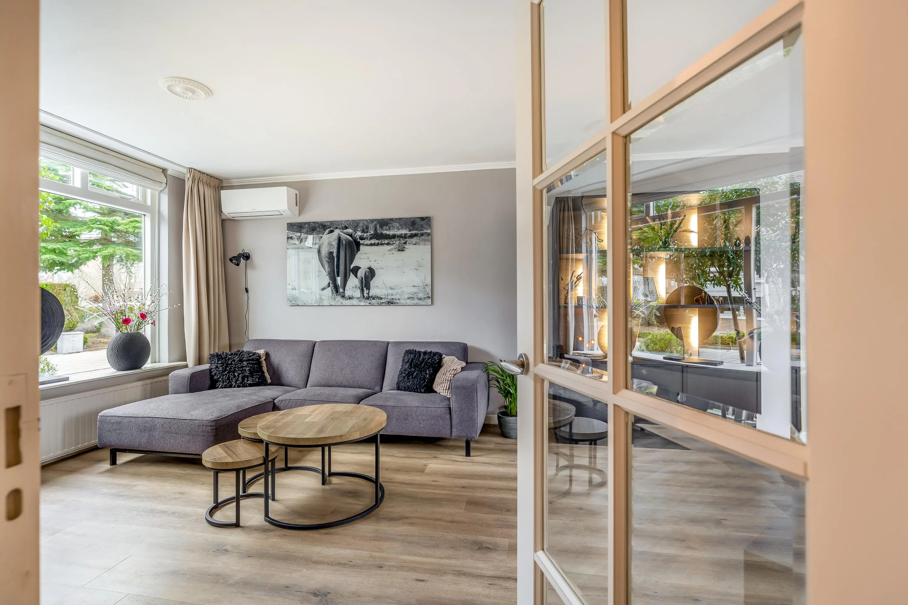 De leefruimte is ruim en licht opgezet dankzij de raampartijen aan weerszijden van de woning. Beide ramen zijn voorzien van rolluiken, waardoor lichtinval eenvoudig te reguleren is. De woonkamer biedt voldoende ruimte voor een comfortabele zithoek en is daarnaast uitgerust met airconditioning. Tevens is er volop plek voor een gezellige eethoek.